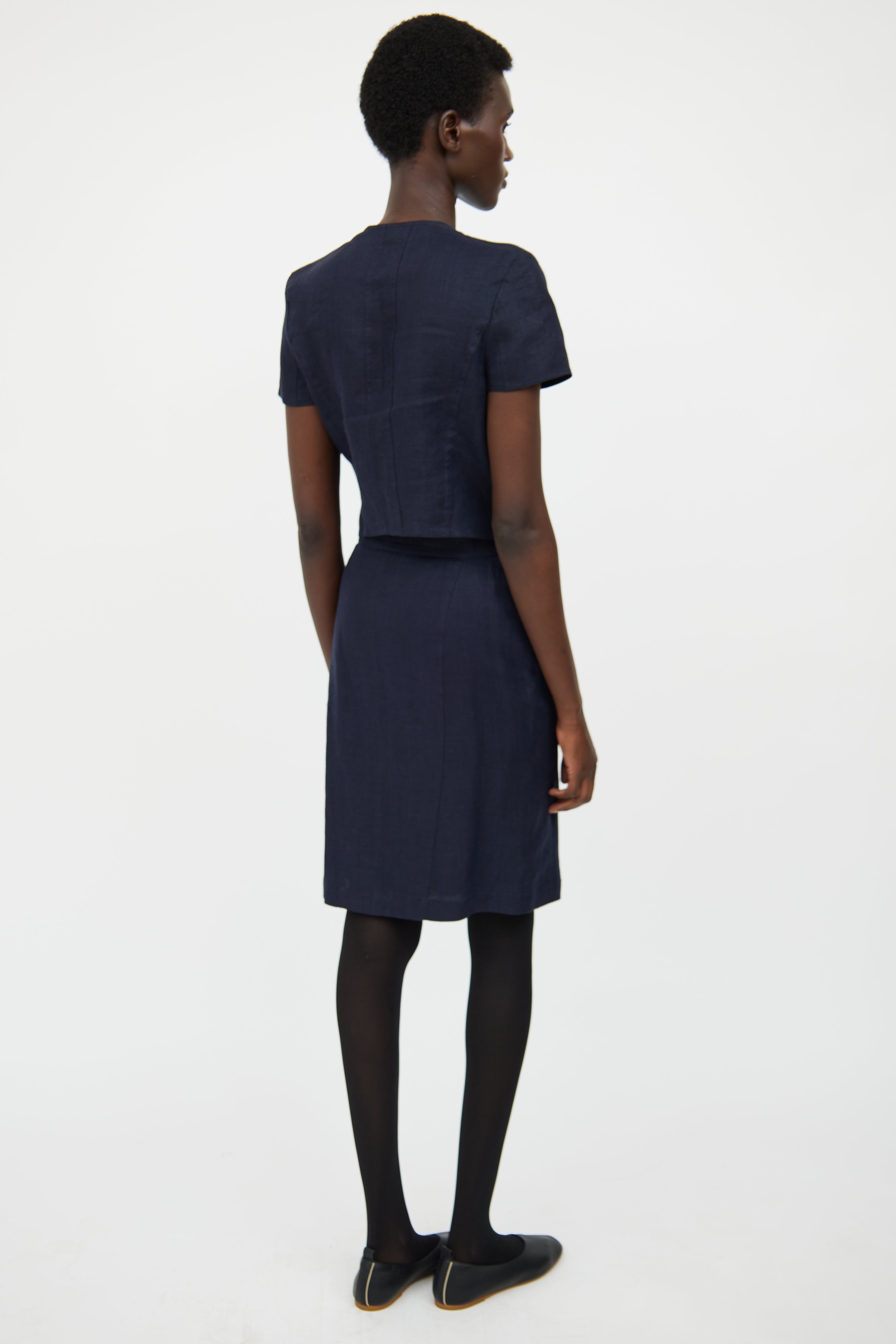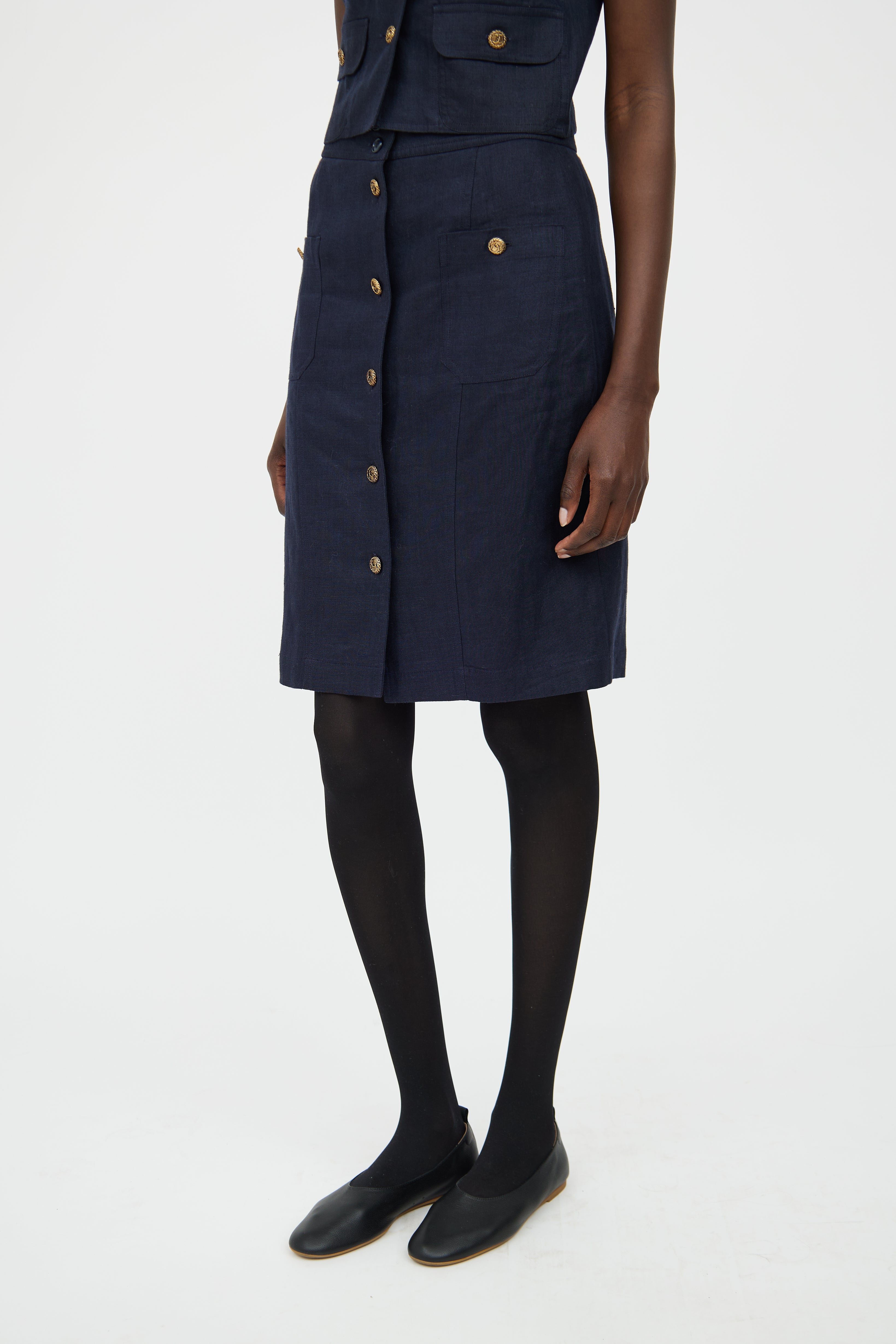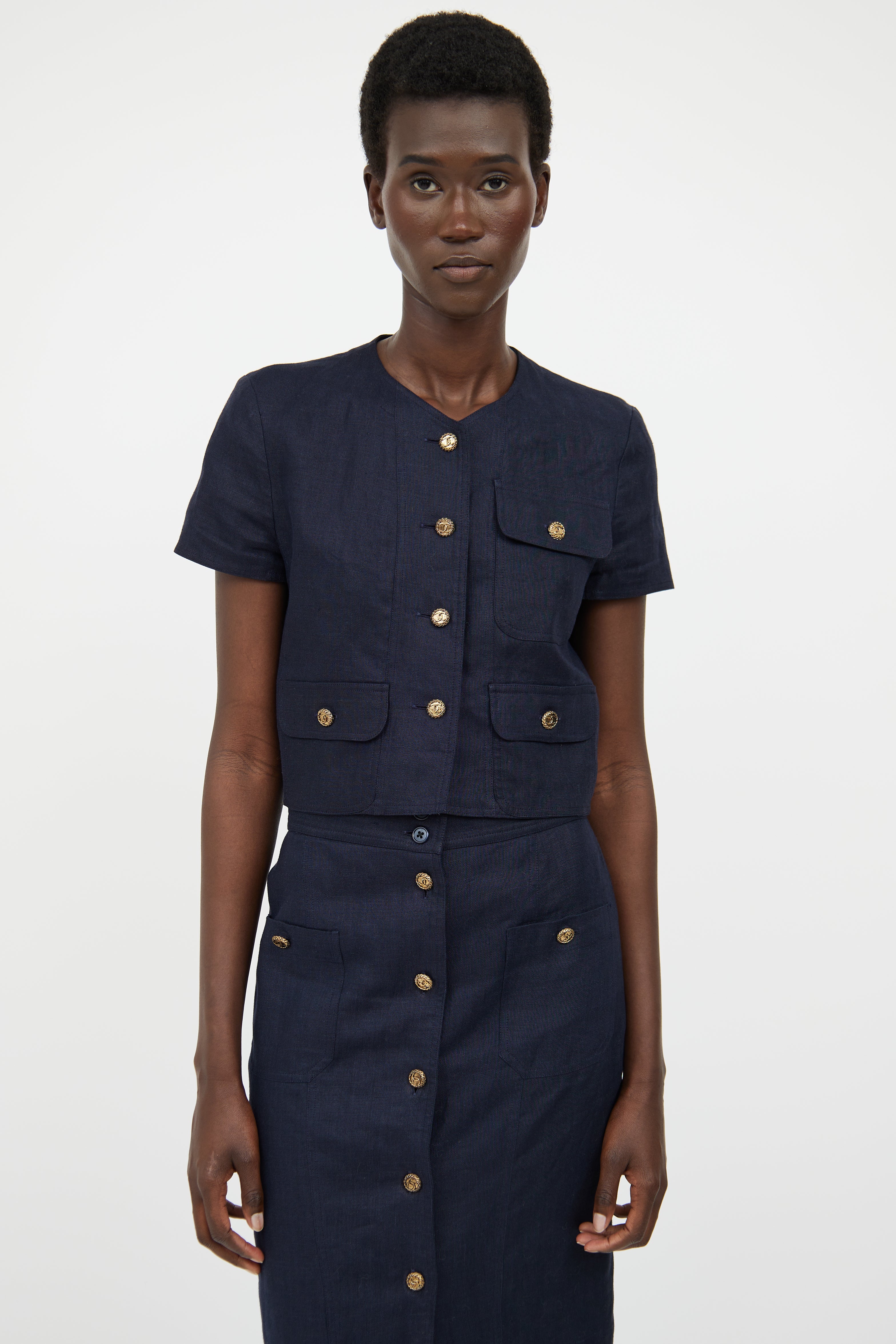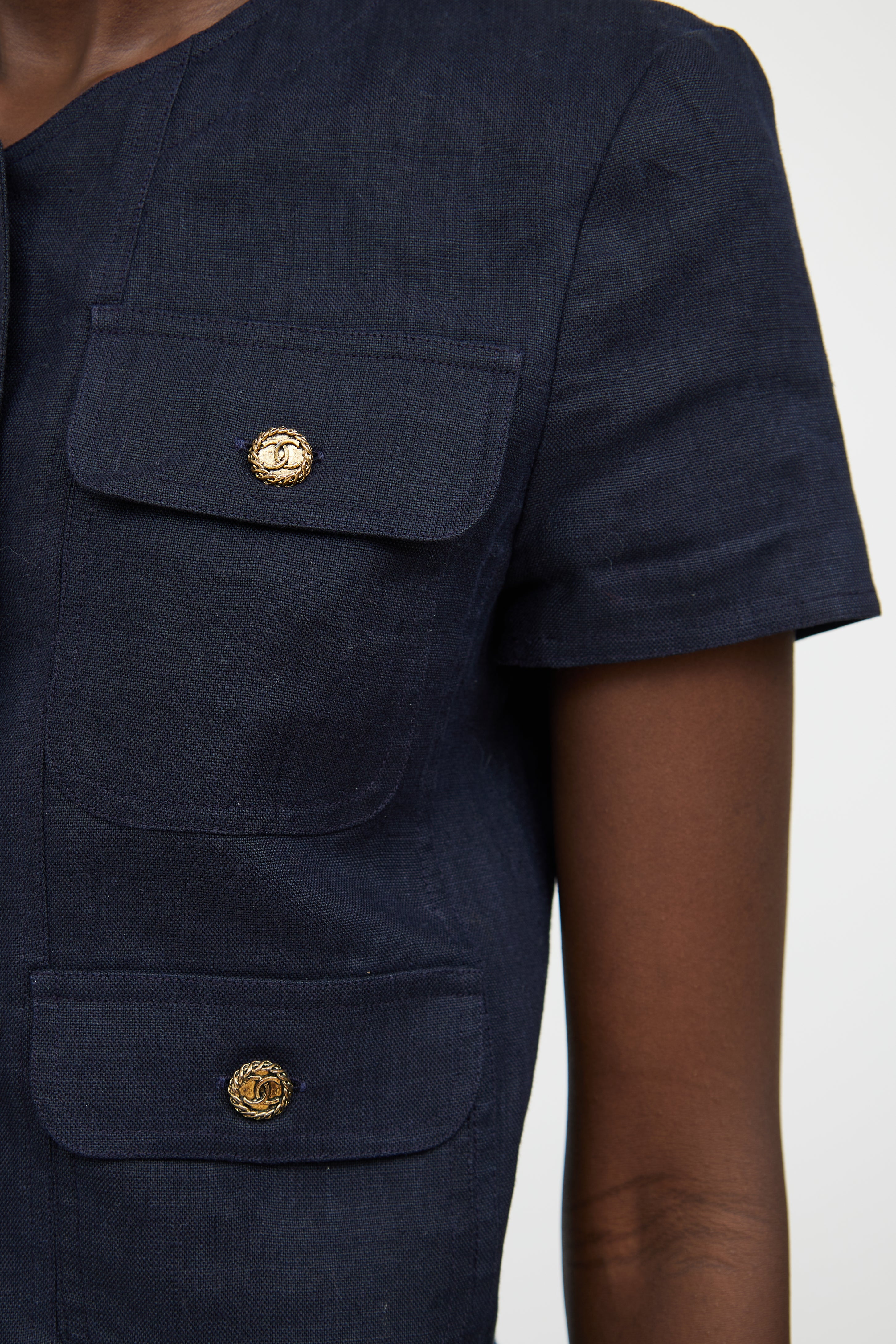 Pre-owned Chanel navy short sleeve top featuring round neckline, gold tone CC stamped button up, single flap pocket with button closure on left chest, and dual flap pockets with button closure on waist. Pencil skirt featuring waist band with navy button detail, gold tone CC stamped button up front, and dual slip pockets with button closure on front. Fully lined skirt.