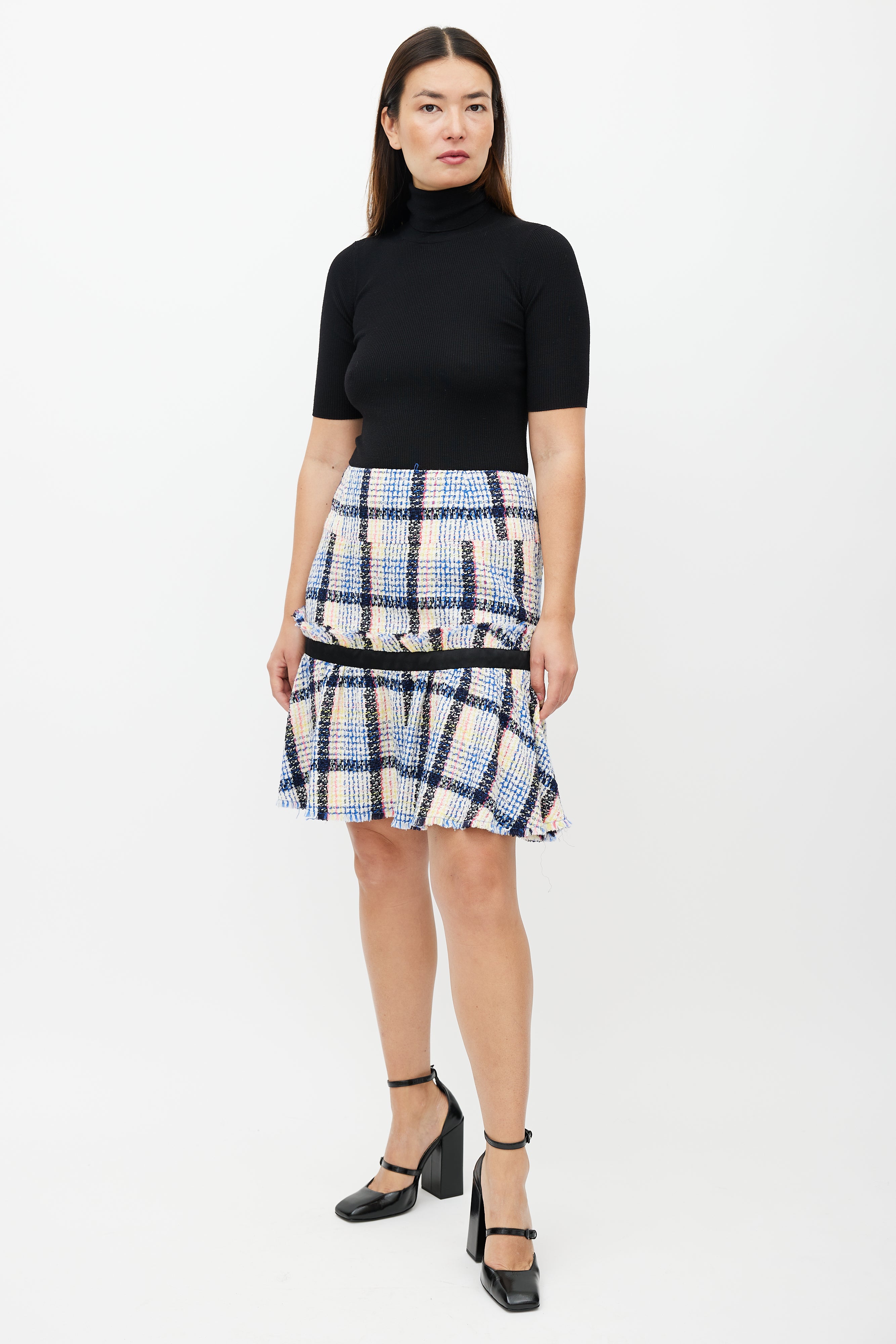 Pre-owned Chanel white wool tweed skirt featuring a multicolour plaid pattern throughout, ruffled hem, and zip at side with hook and eye closure. Lined. Clipped to fit model.