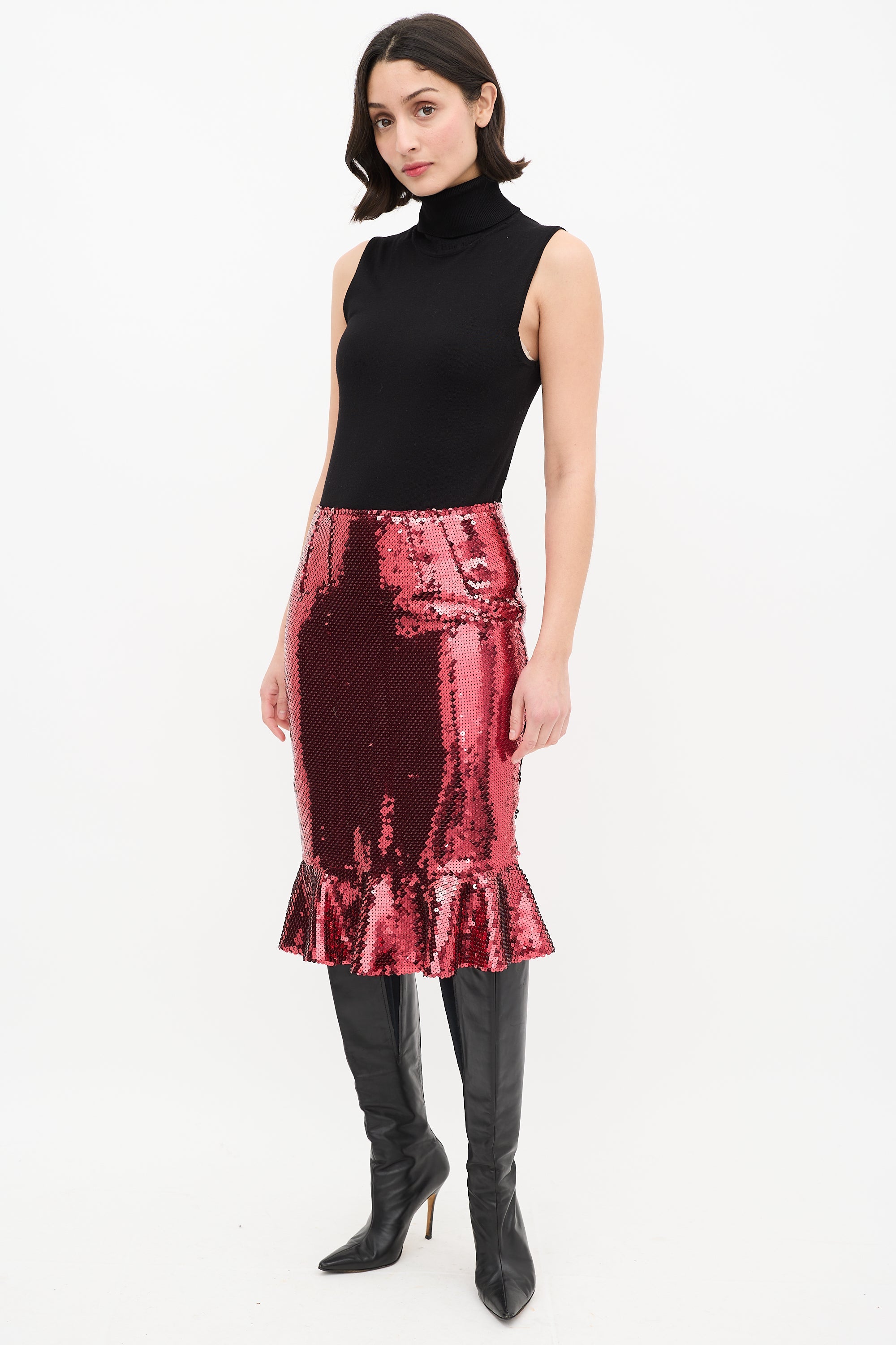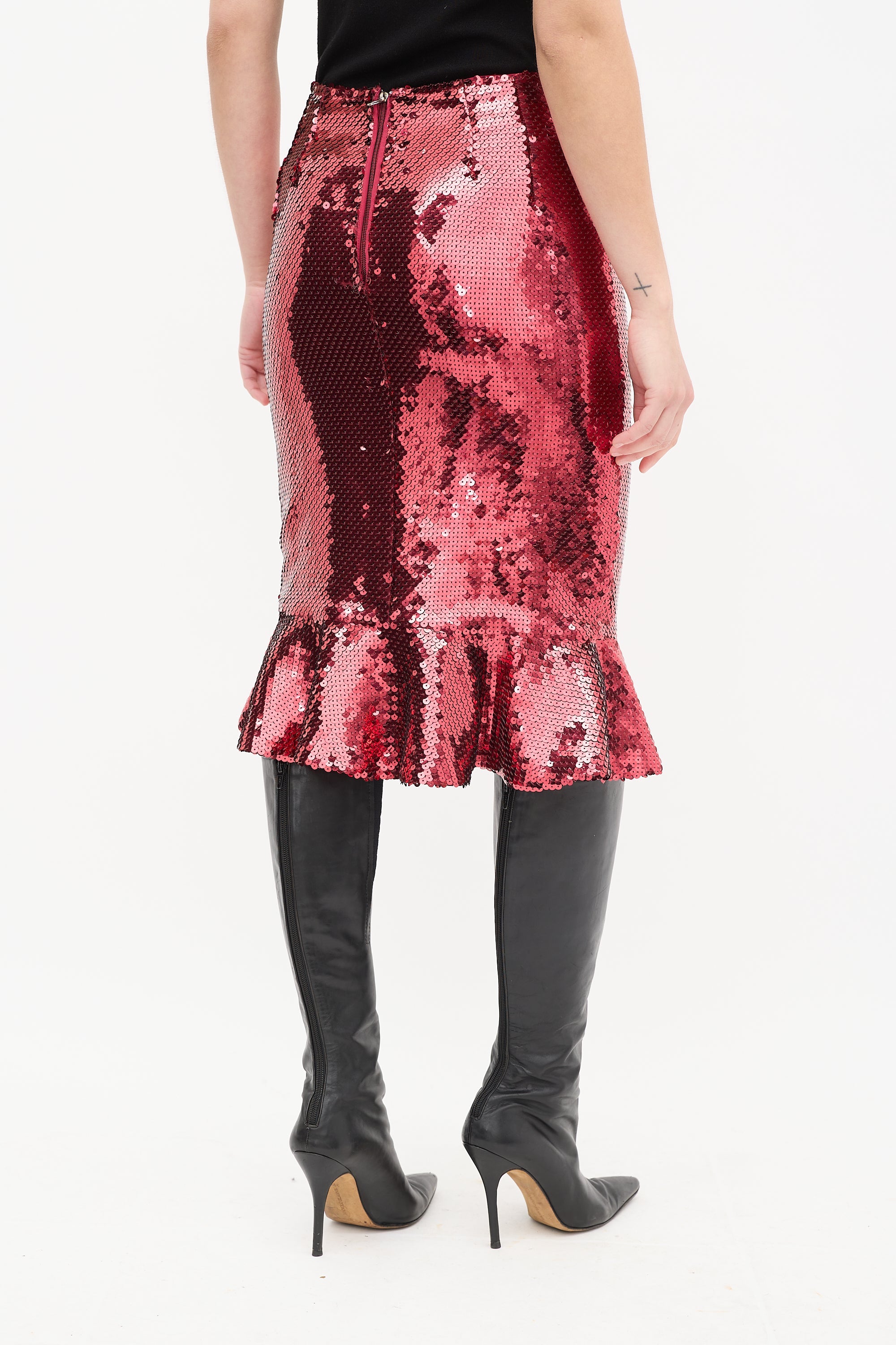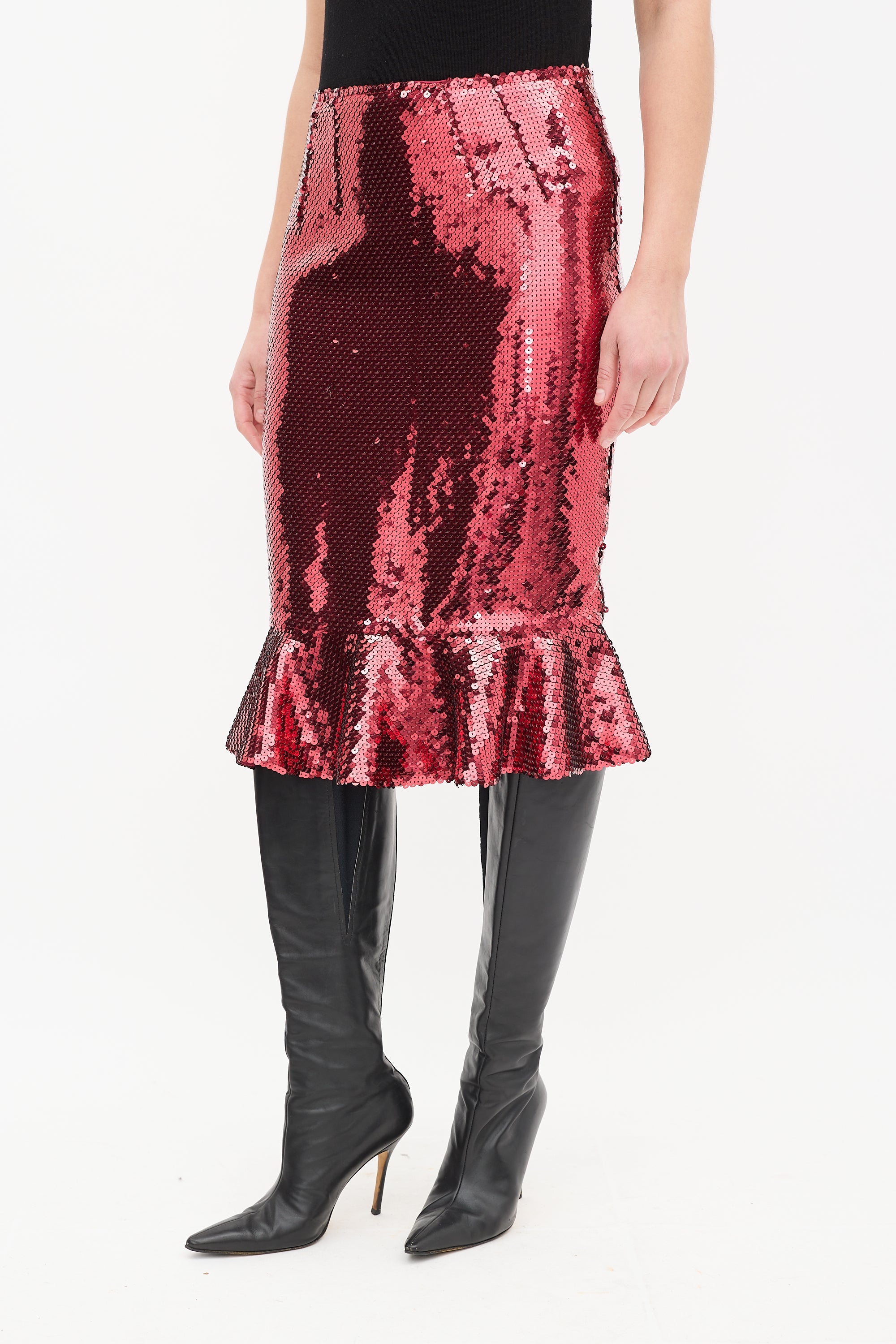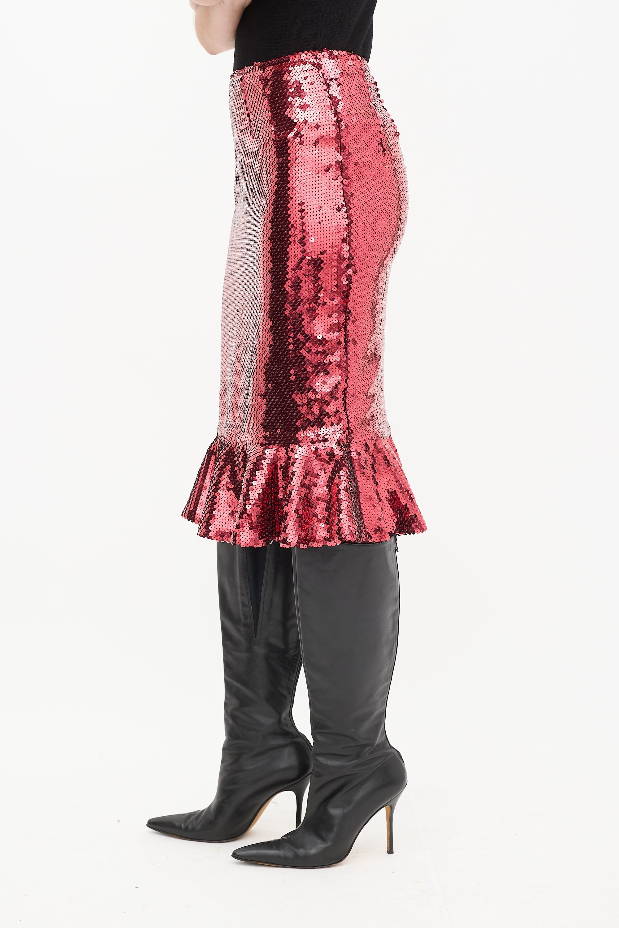 Pre-owned Dolce & Gabbana red sequin midi skirt featuring a high waist, flounce hem, and concealed back zip closure. Lined.
