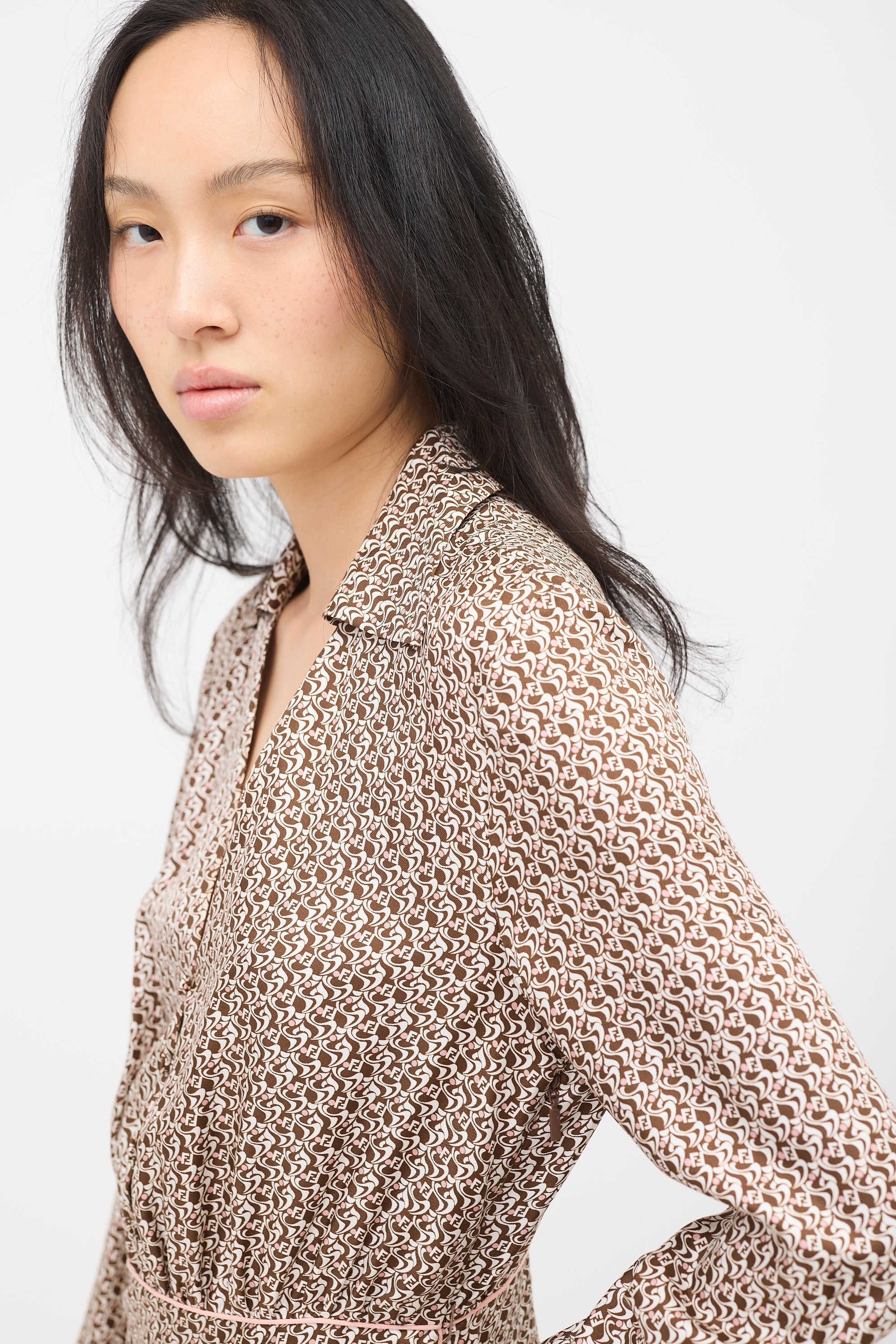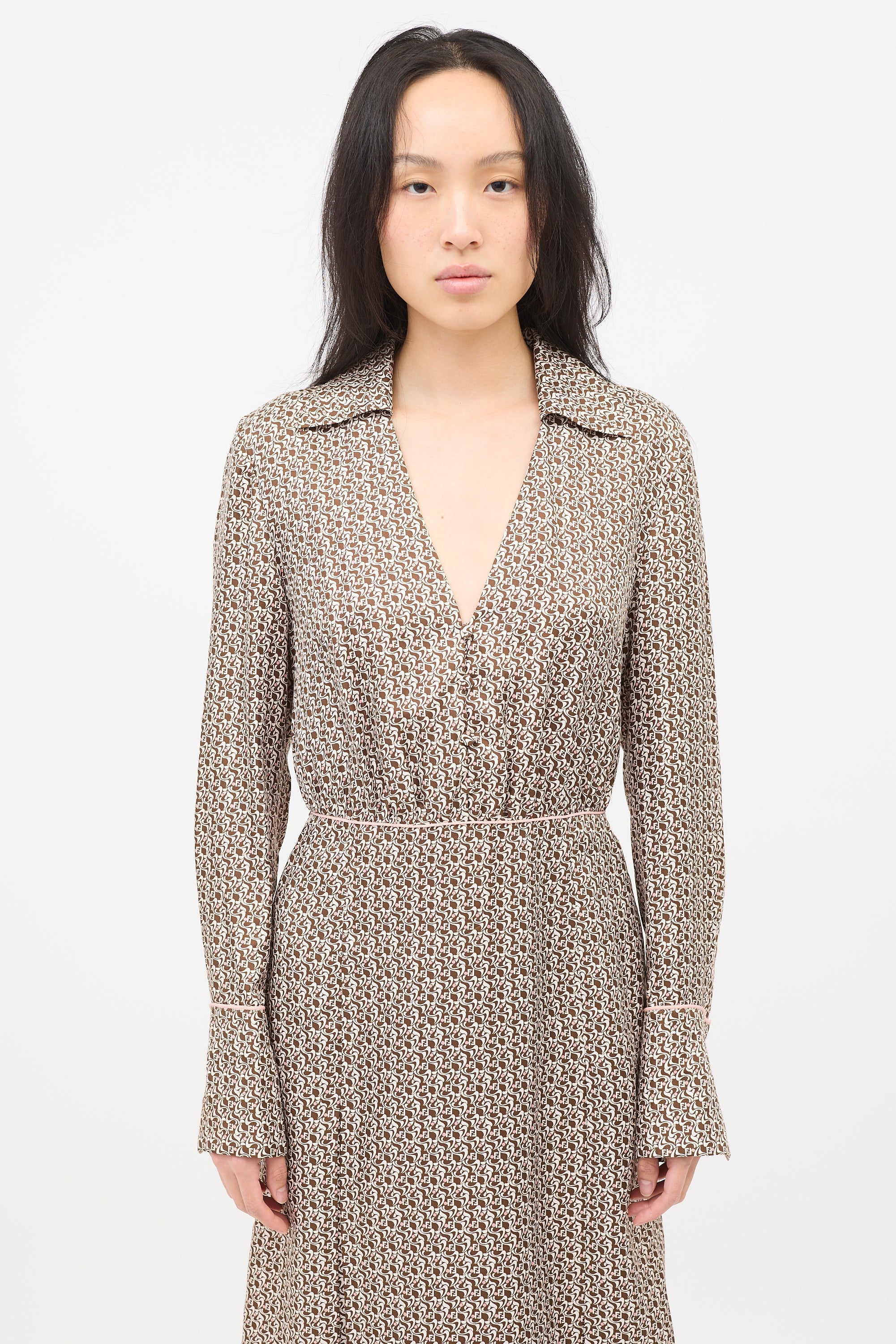 Pre-owned Fendi cream and brown silk midi dress featuring an abstract print with FF monogram throughout, V-neckline, point collar, button up chest, side zip closure, pink piping, invert pleated skirt, and buttoned cuffs.