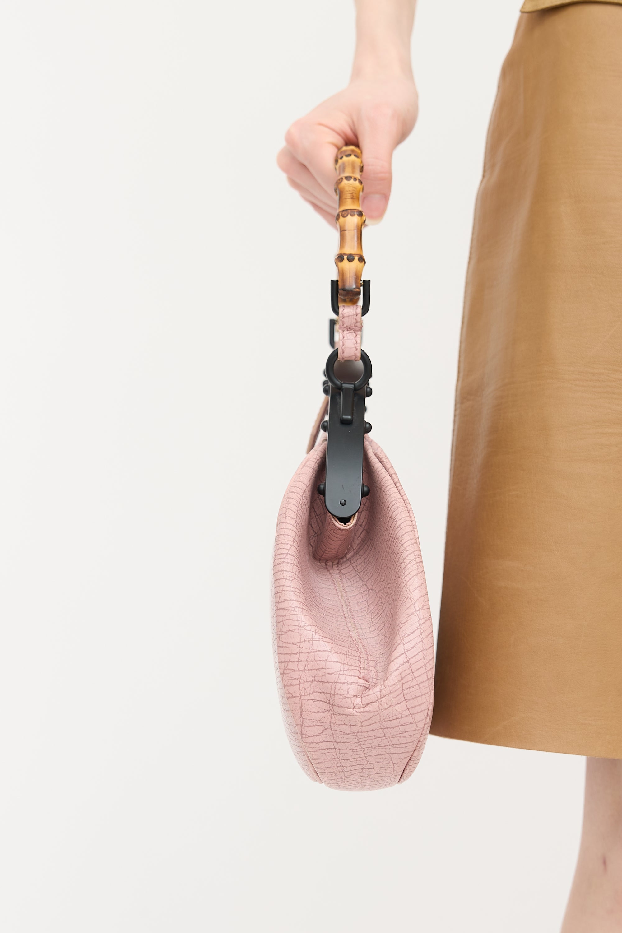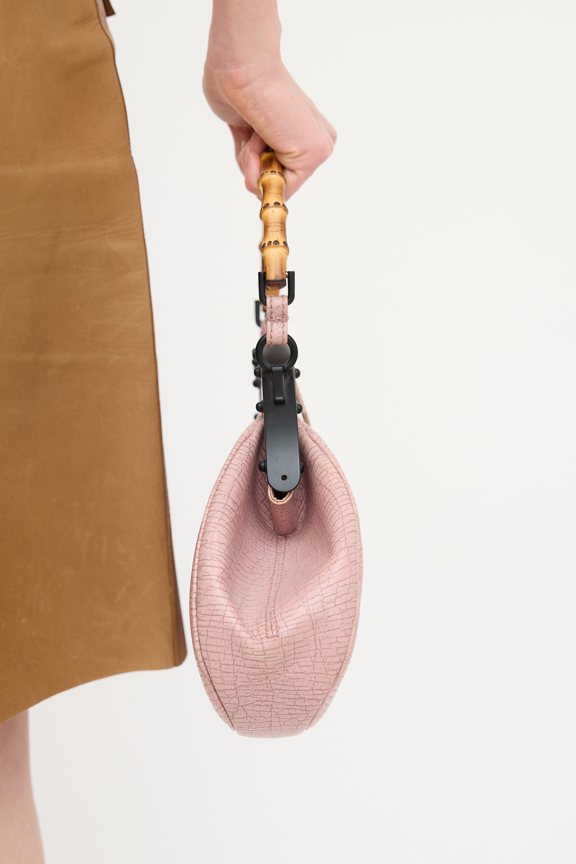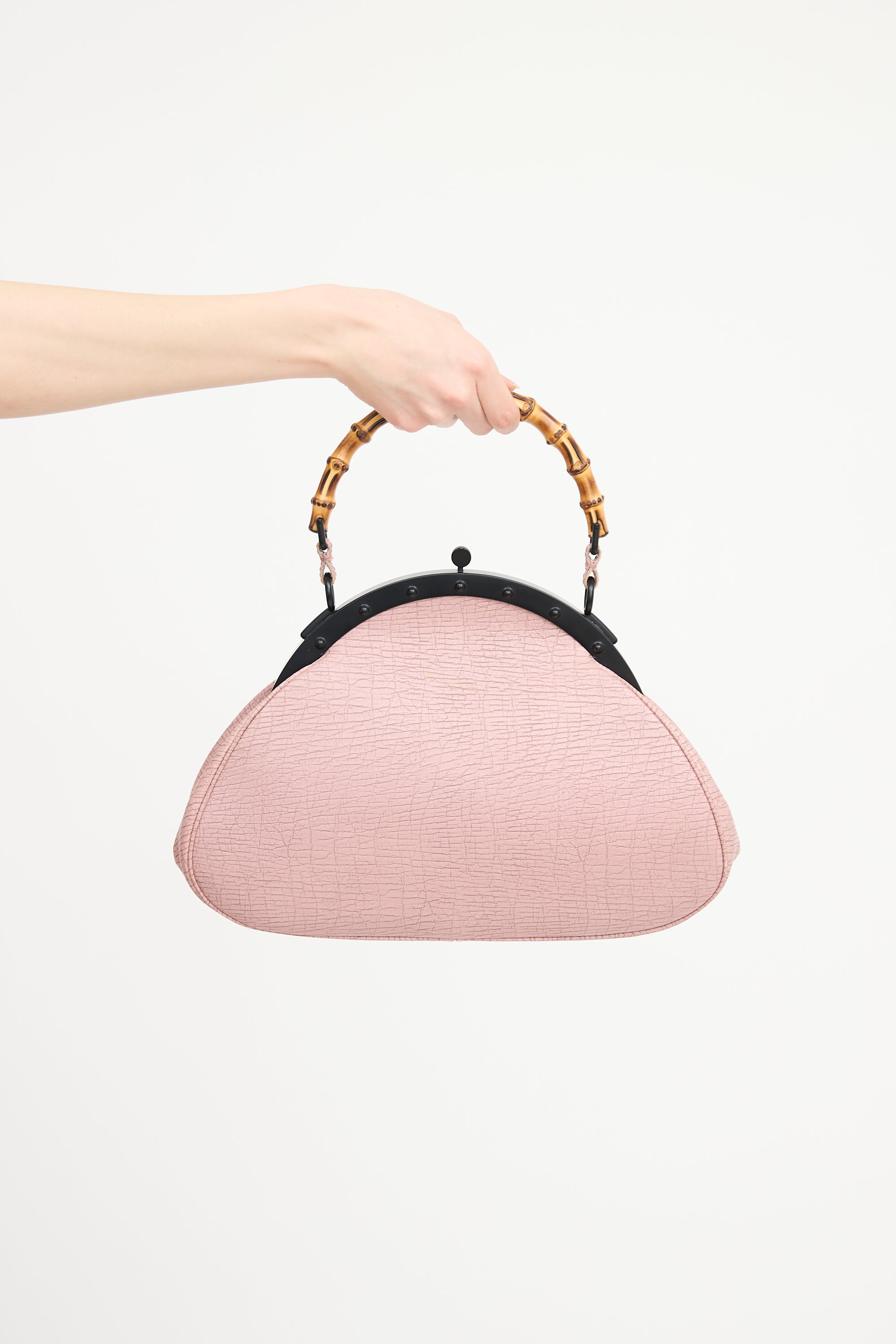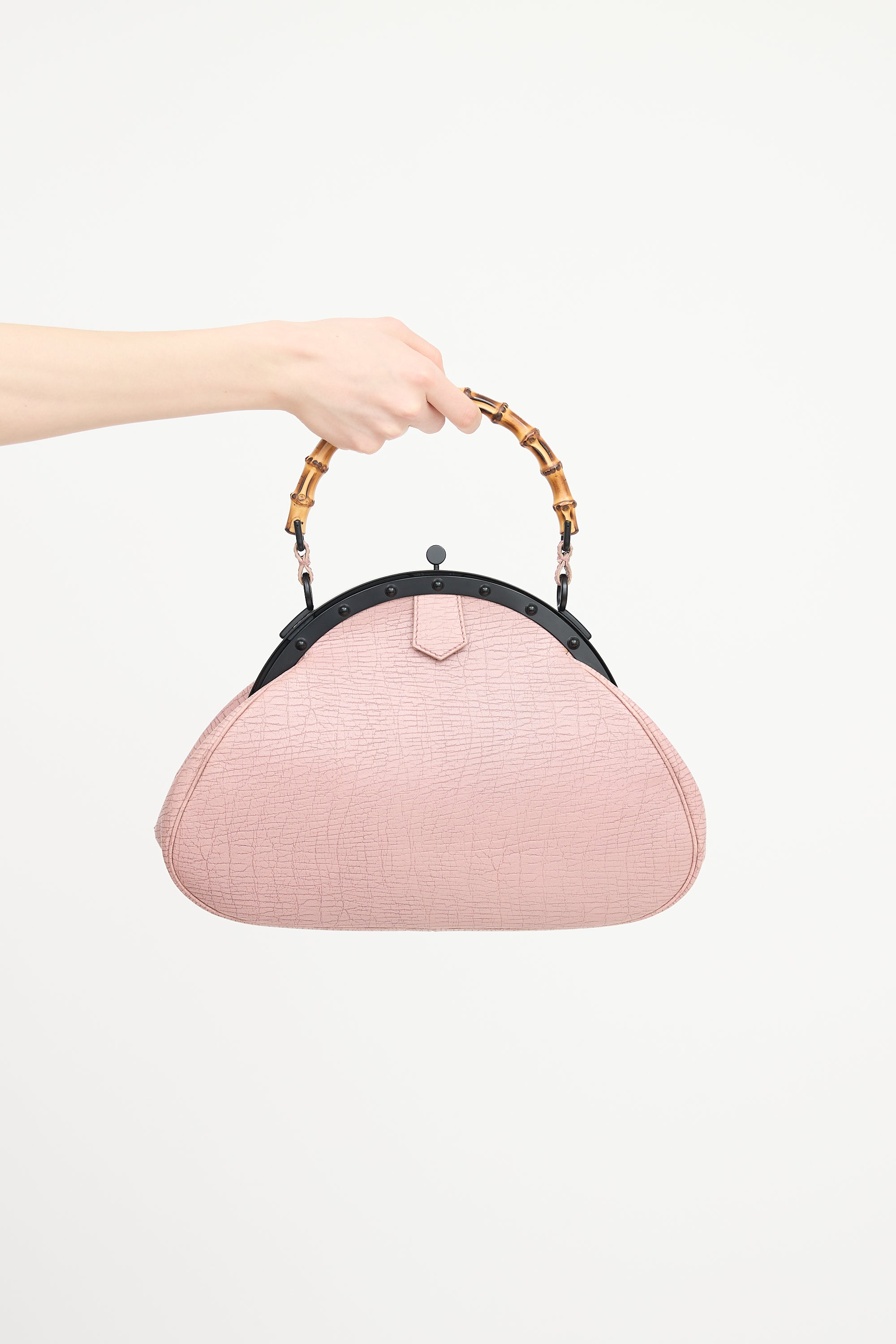 Pre-owned Gucci pink grained leather Pagoda Frame bag featuring bamboo top handle, black tone hardware, push pin closure, and one brown leather lined main compartment with zip pocket.