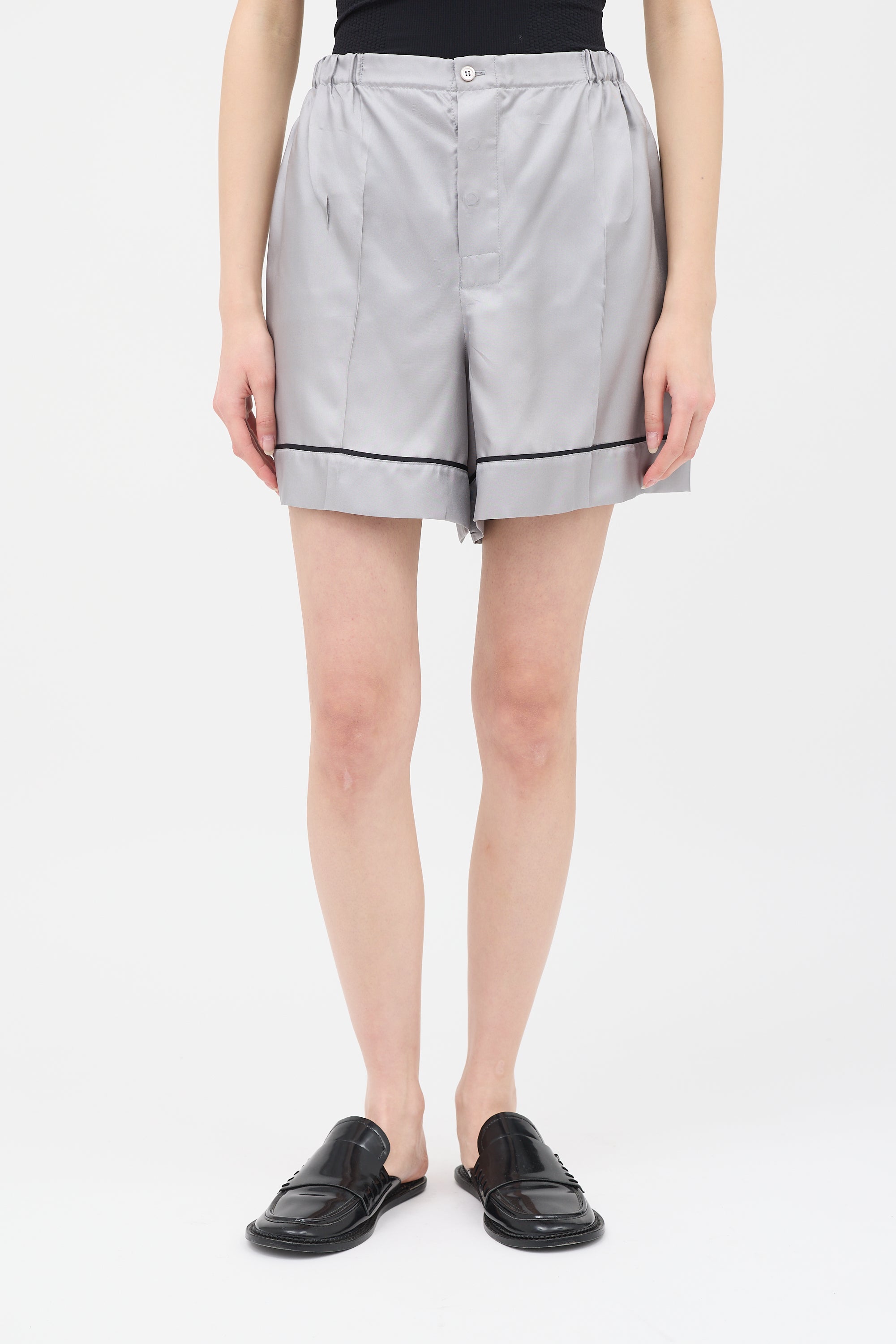 Pre-owned Prada 2017 grey silk shorts featuring elasticized waist, front creases, black trim cuff detail, and button fly.