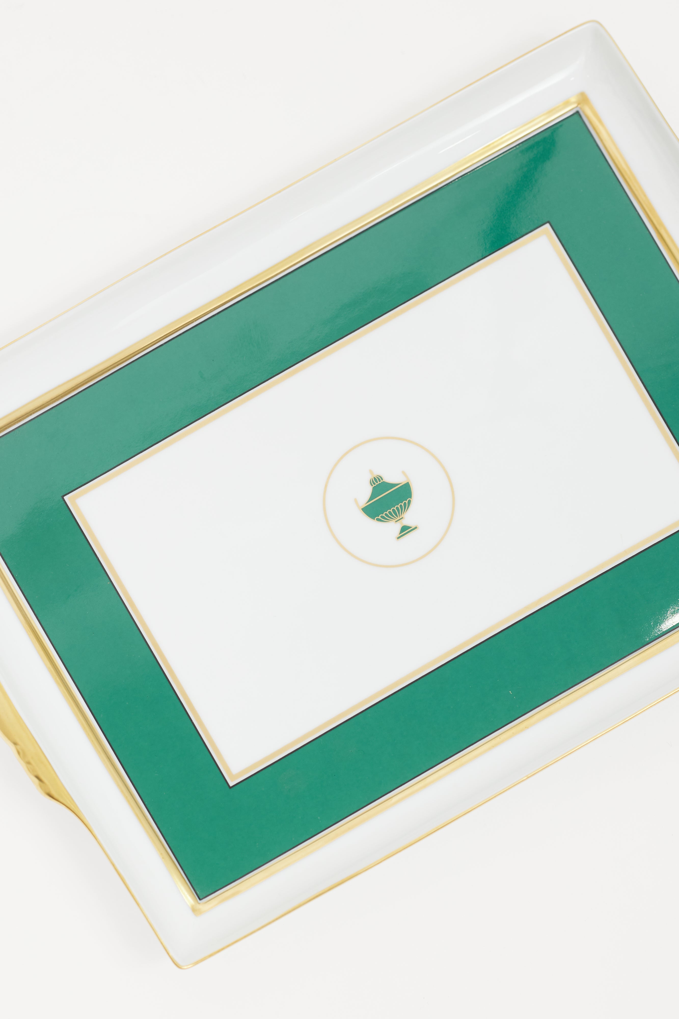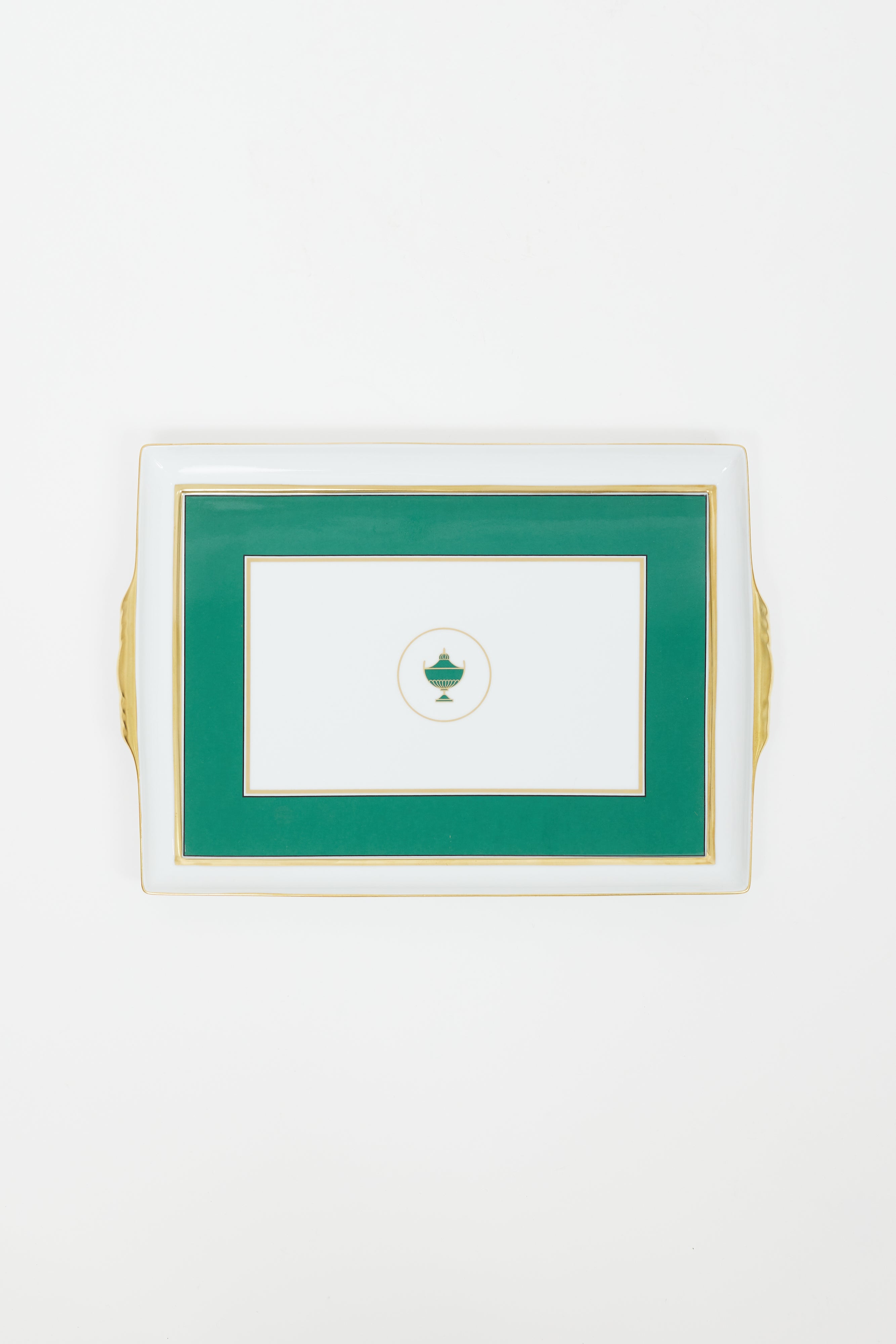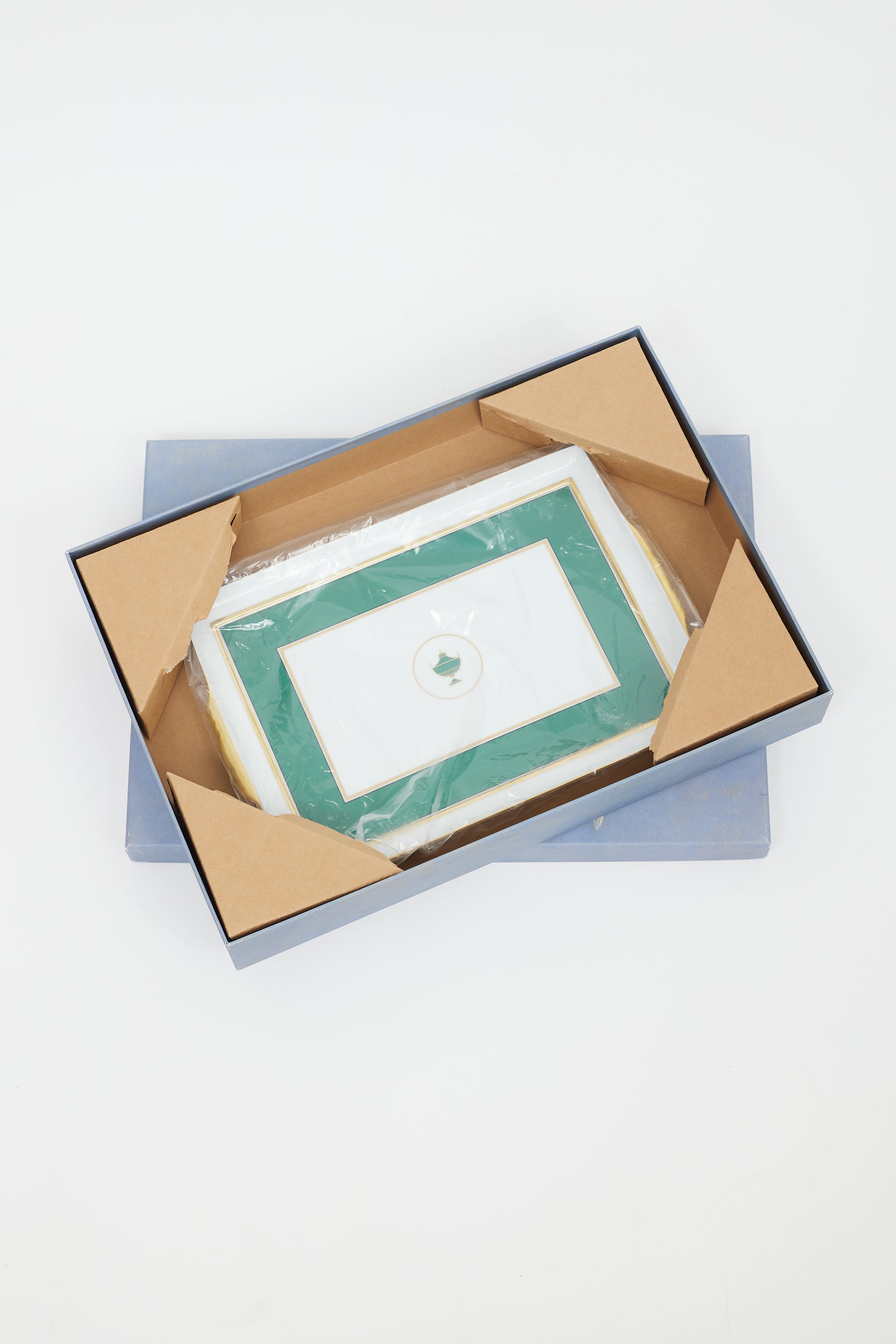 Pre-owned Richard Ginori 1735 white and emerald green porcelain Contessa Rectangular Platter featuring shallow depth, centre motif, pure gold threading, shaped handles, and dilaccatura finish. Comes with original box.