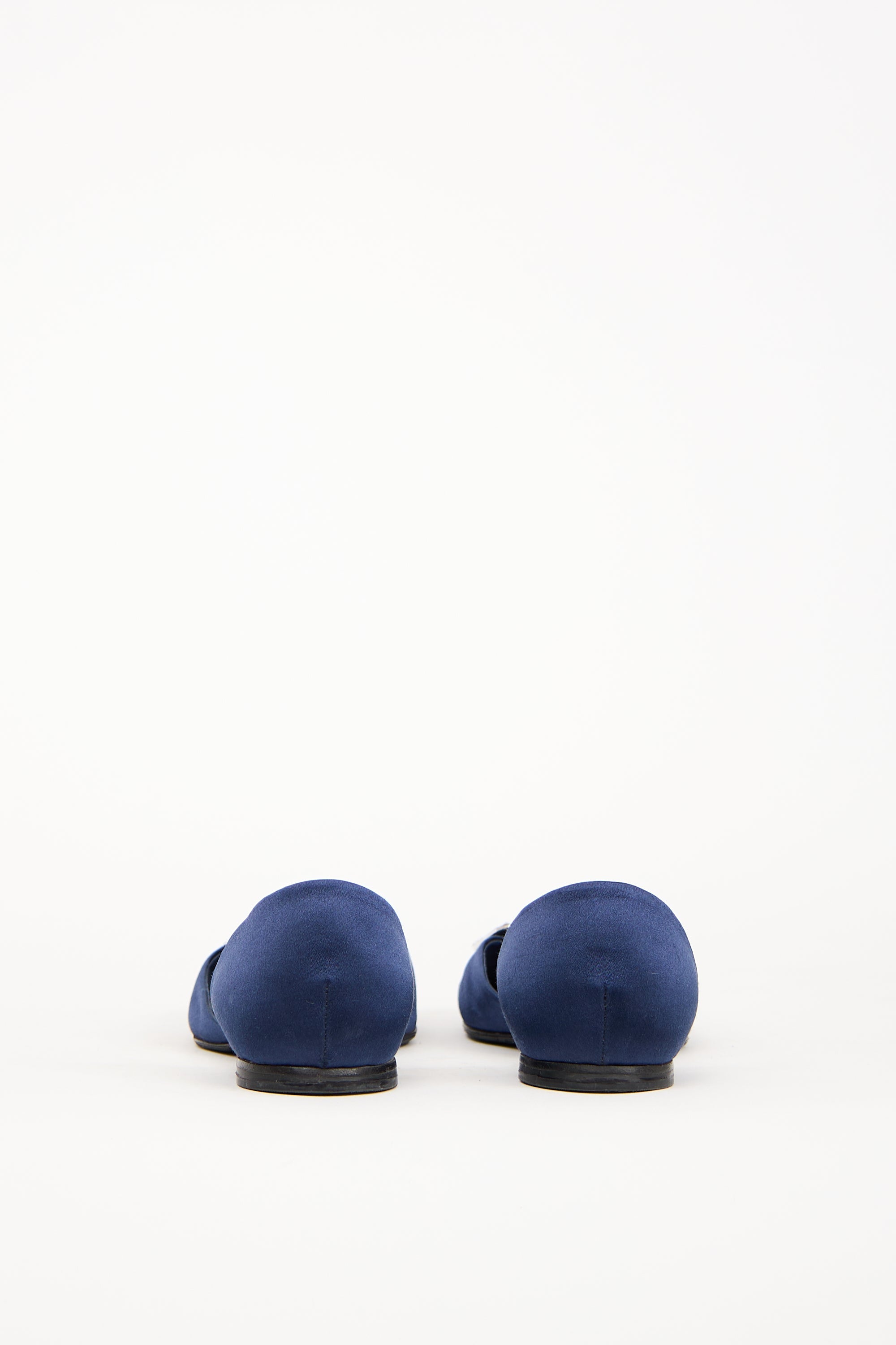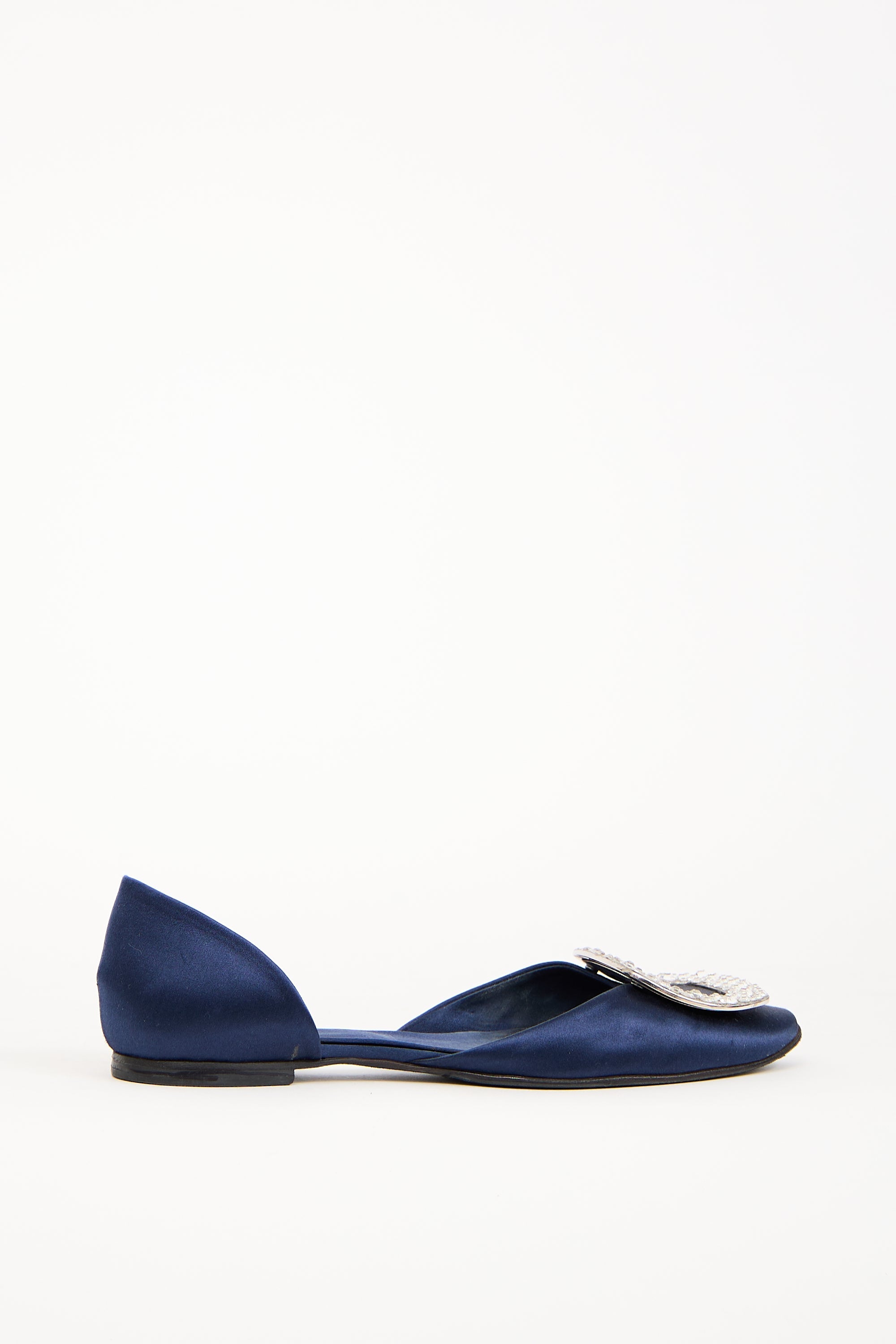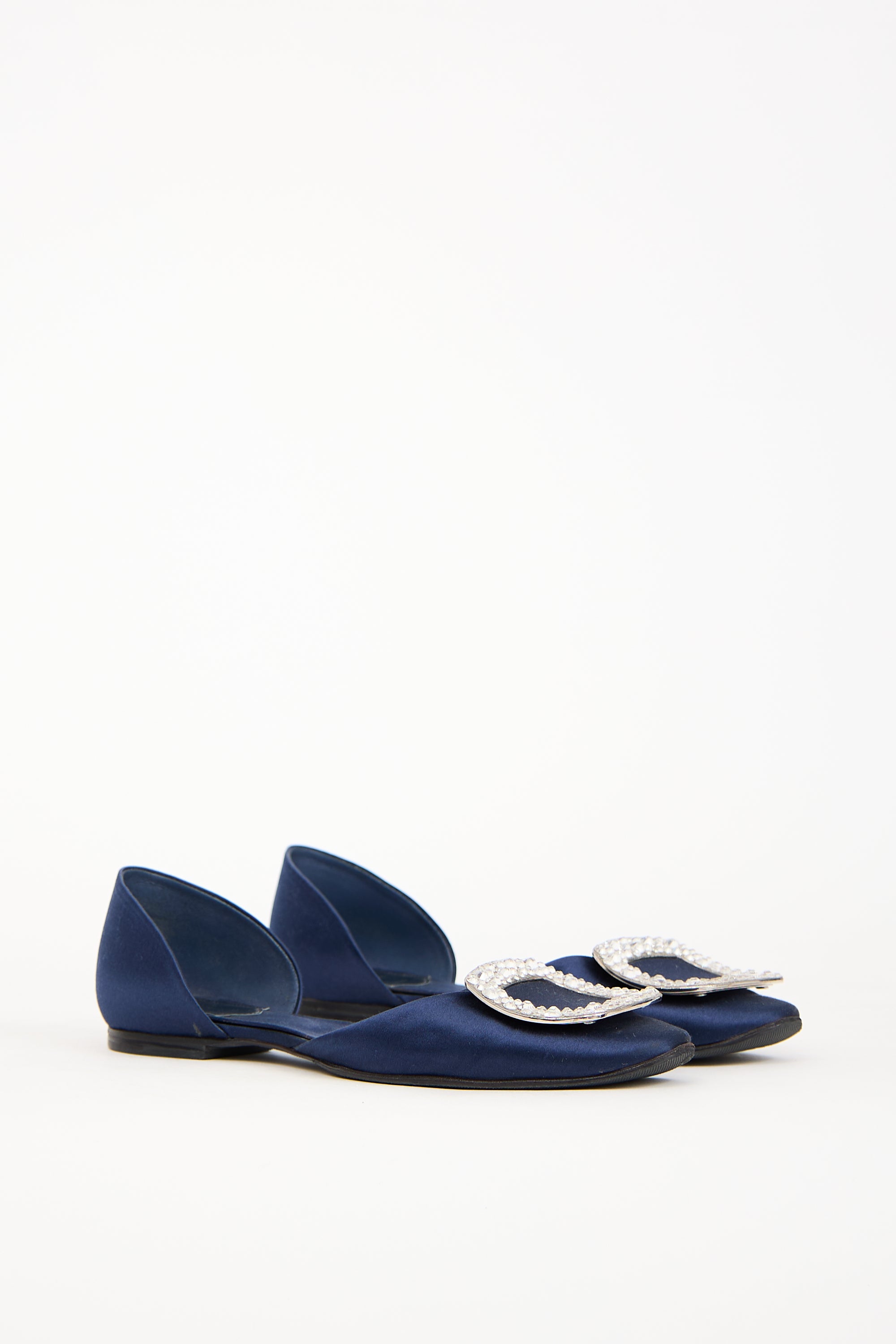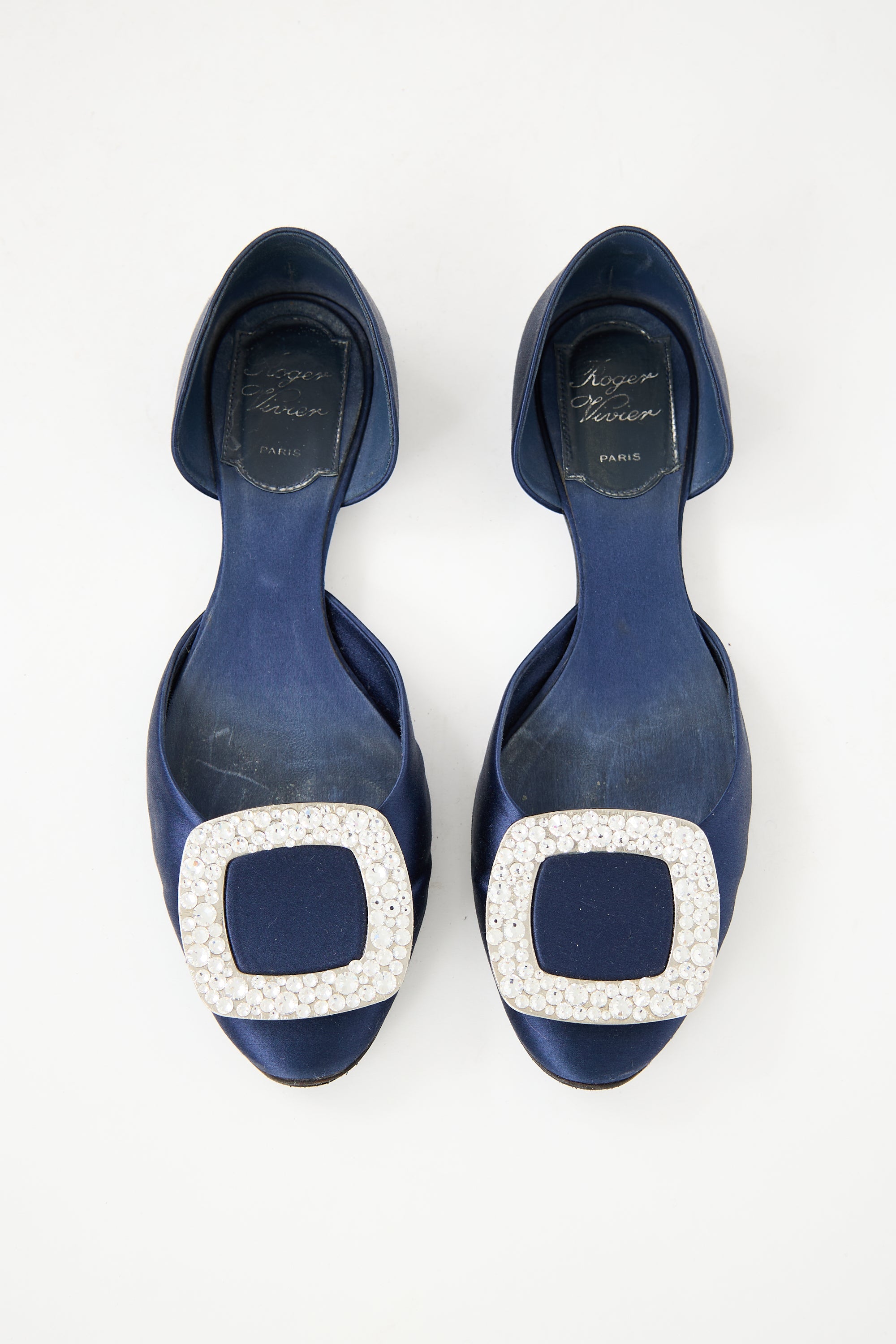 Pre-owned Roger Vivier blue satin Chips D'Orsay flats featuring an almond toe, crystal embellished buckle at vamp, and slip on entry. Comes with original dust bag.