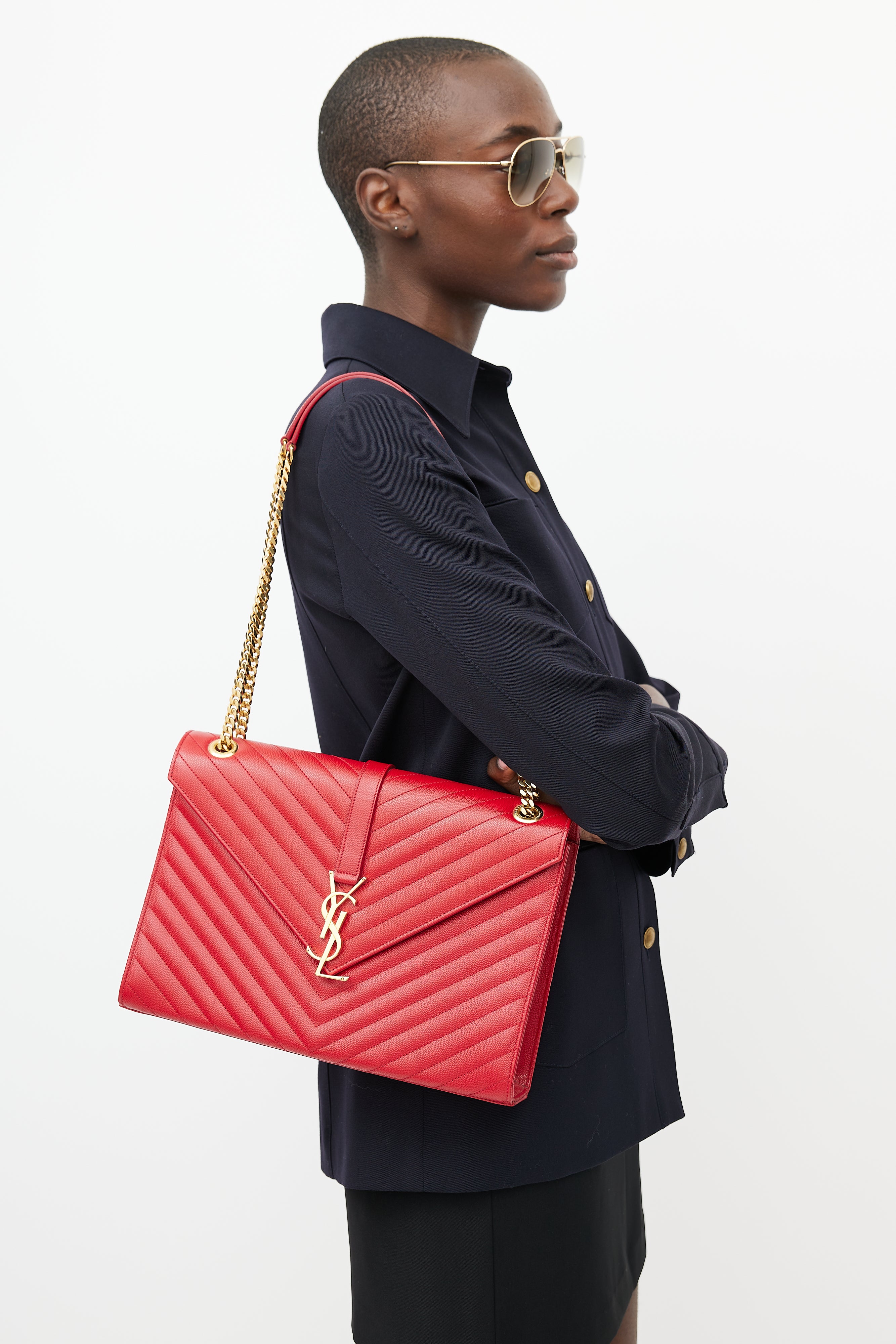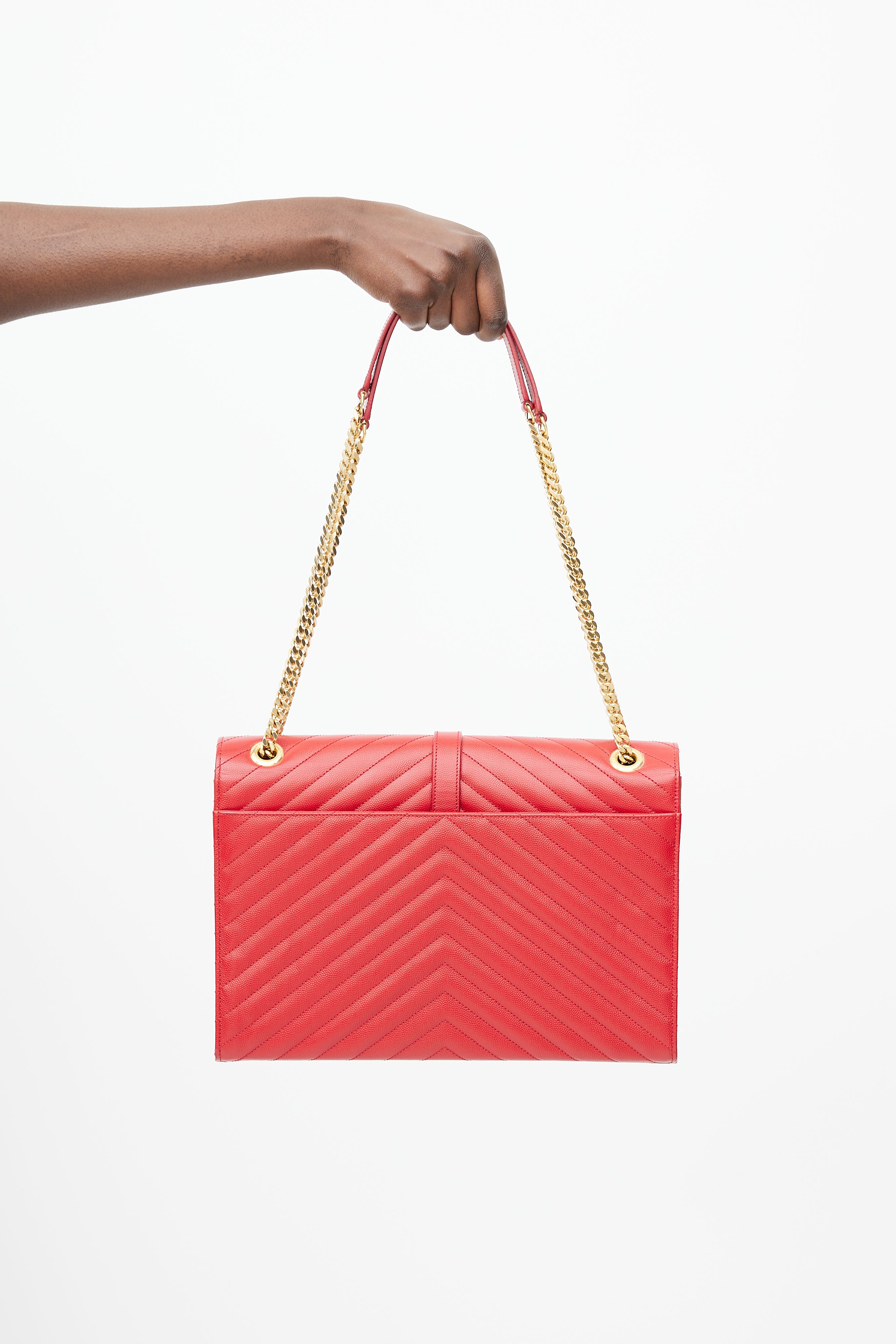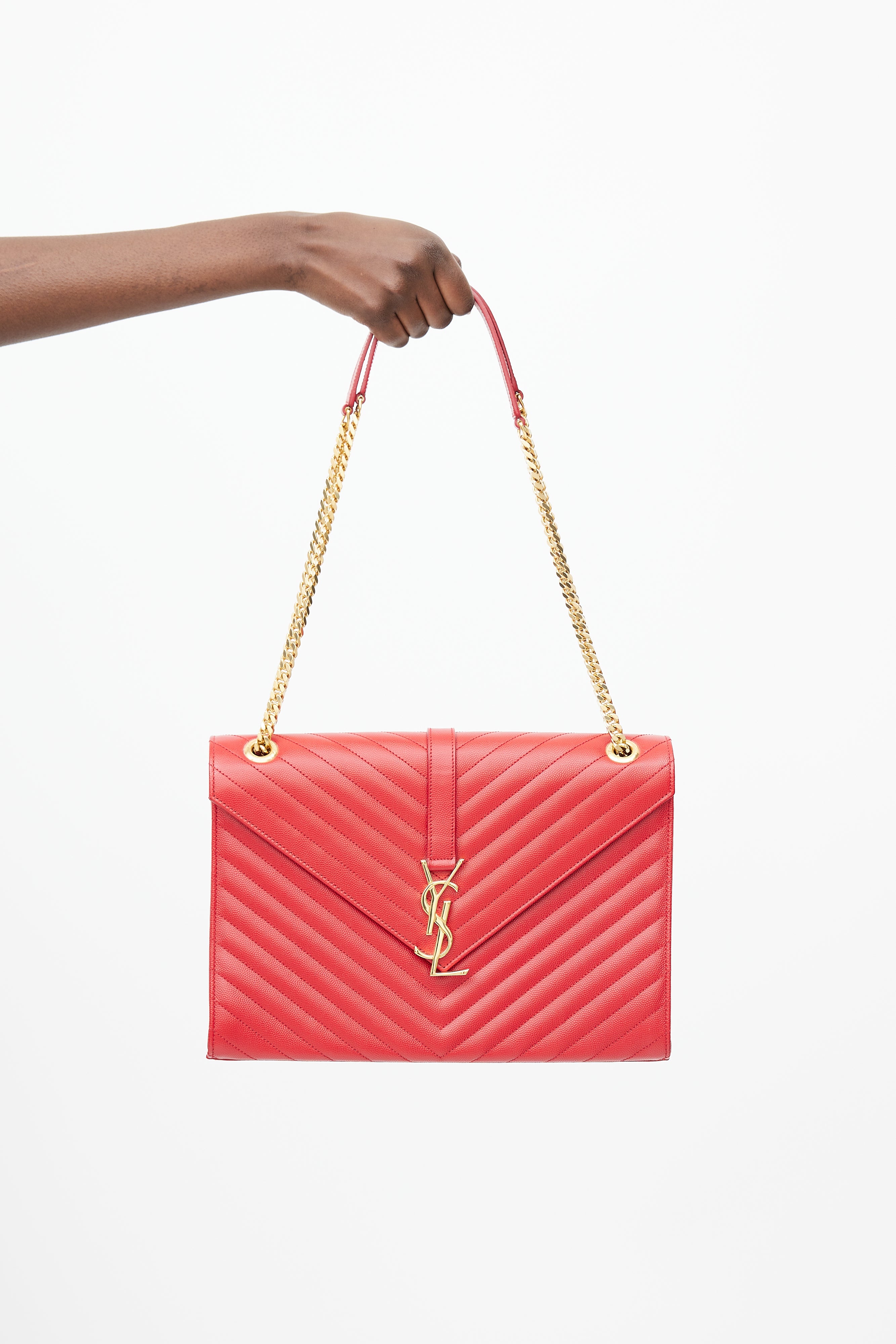 Pre-owned Saint Laurent 2014 red Large Envelope bag featuring chevron leather exterior, gold tone Cassandre logo hardware at front, slip pocket at back, adjustable chain and leather shoulder strap, magnetic button closure, lined main compartment, and one zip pocket inside. Comes with original dust bag.