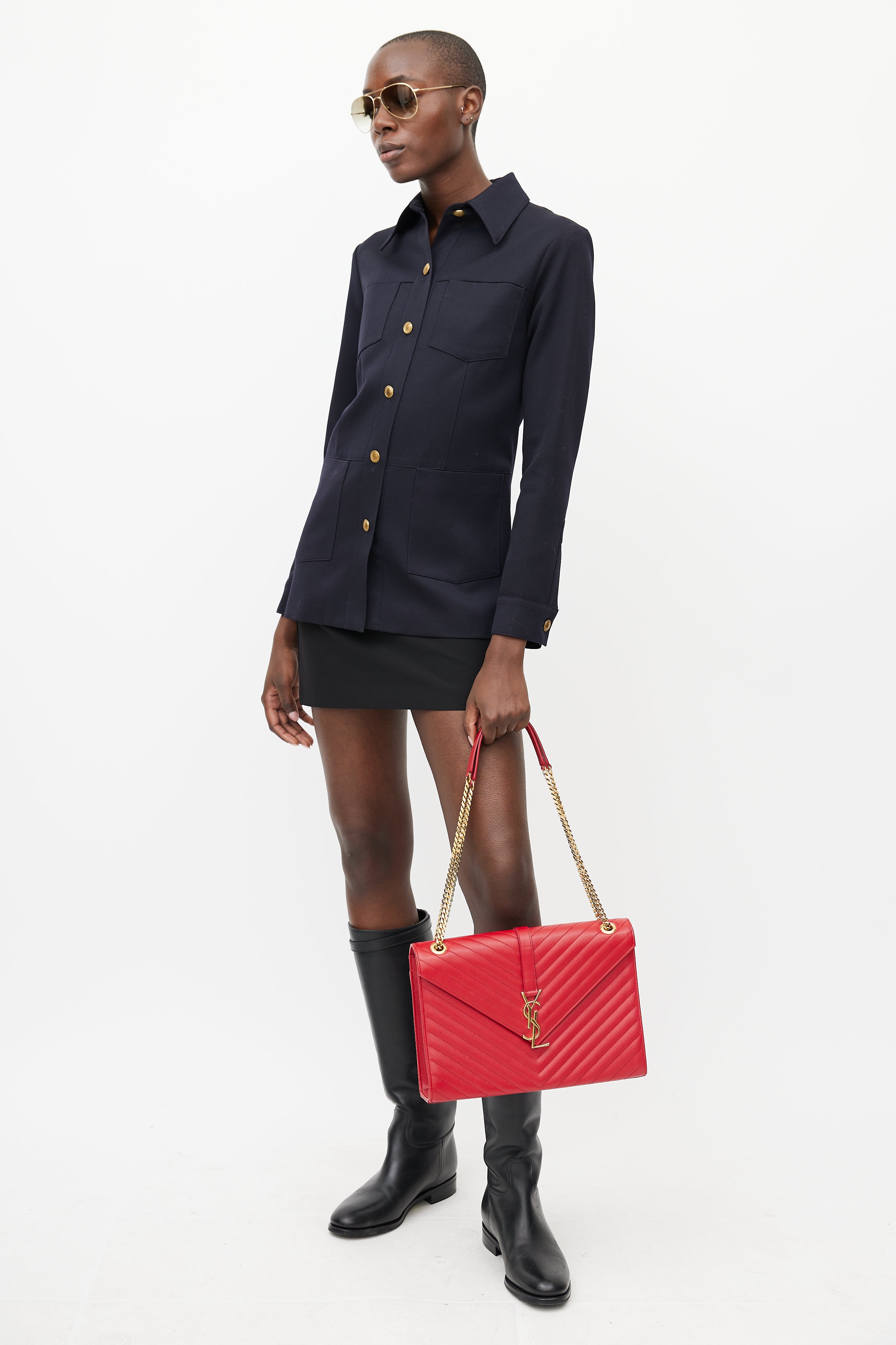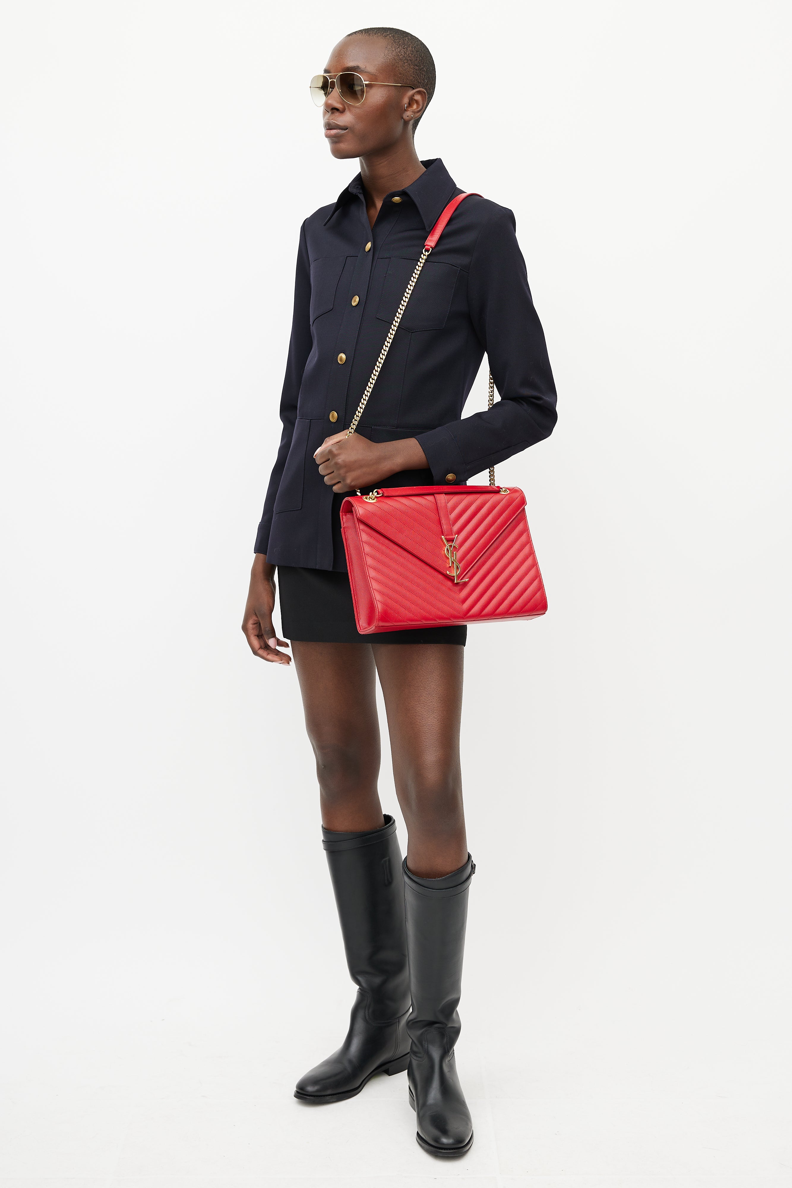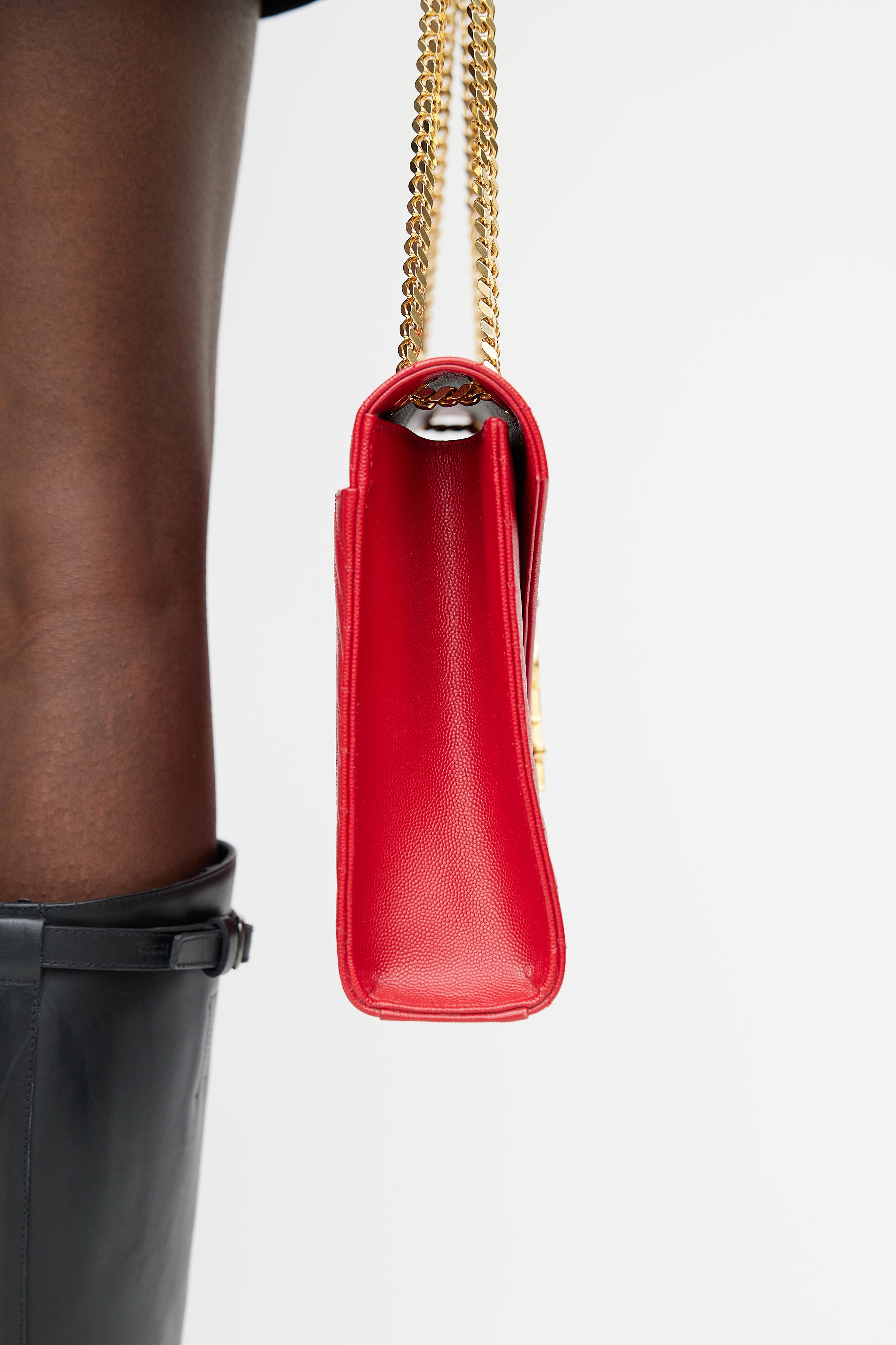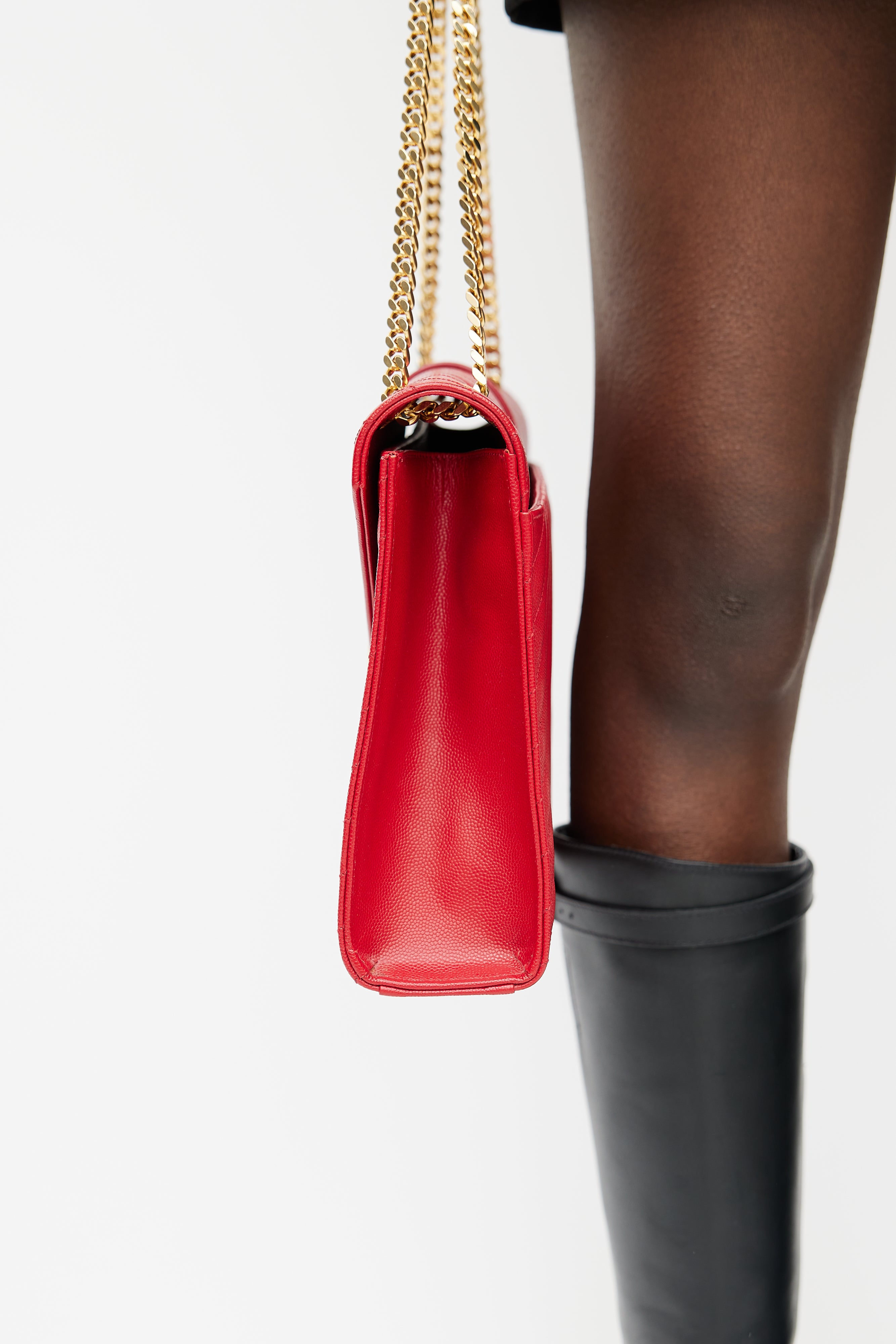 Pre-owned Saint Laurent 2014 red Large Envelope bag featuring chevron leather exterior, gold tone Cassandre logo hardware at front, slip pocket at back, adjustable chain and leather shoulder strap, magnetic button closure, lined main compartment, and one zip pocket inside. Comes with original dust bag.