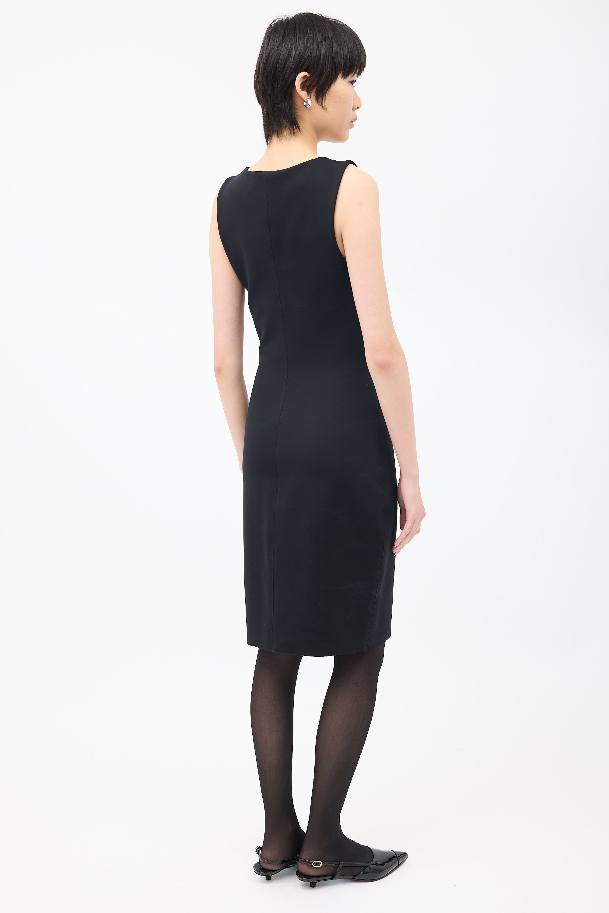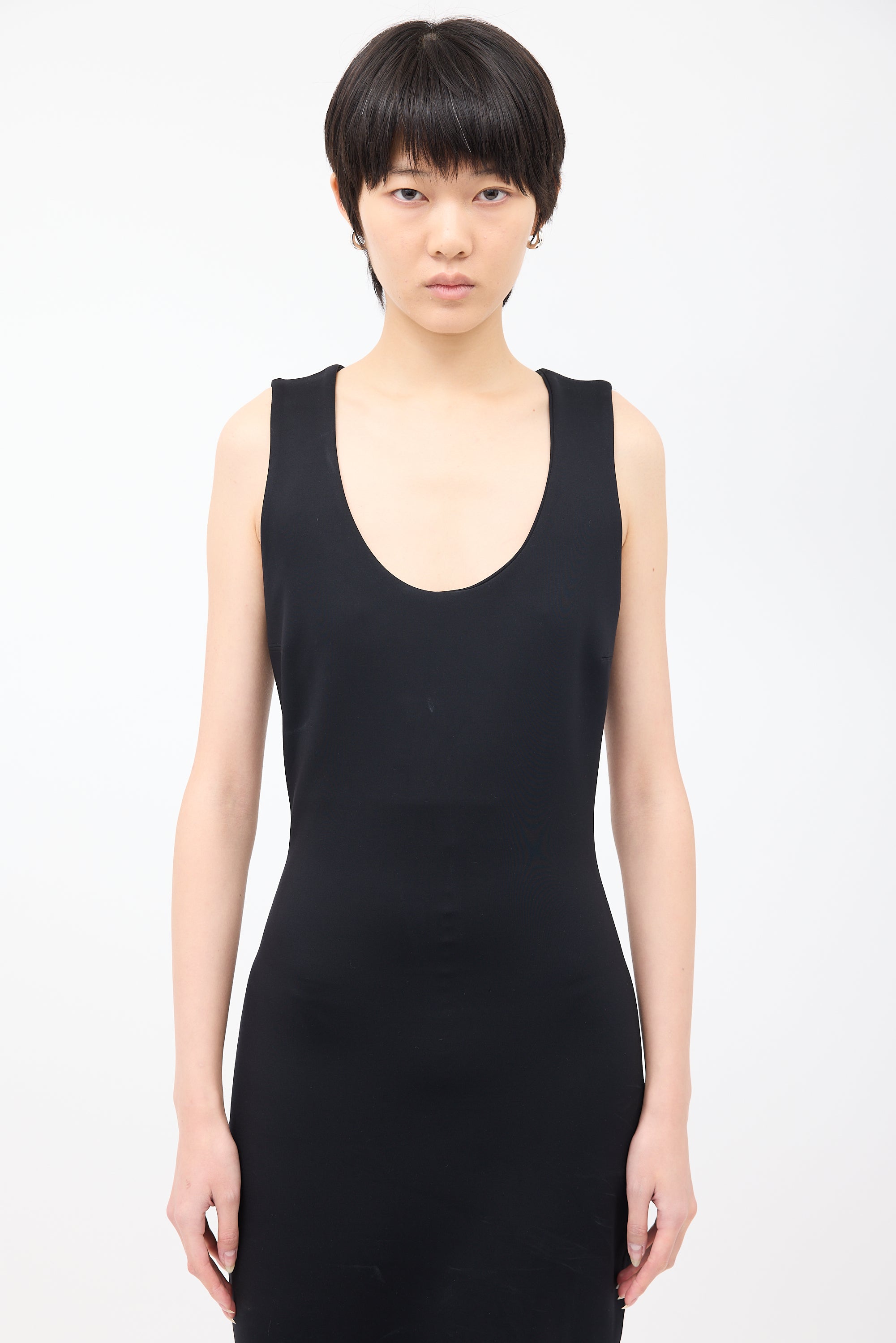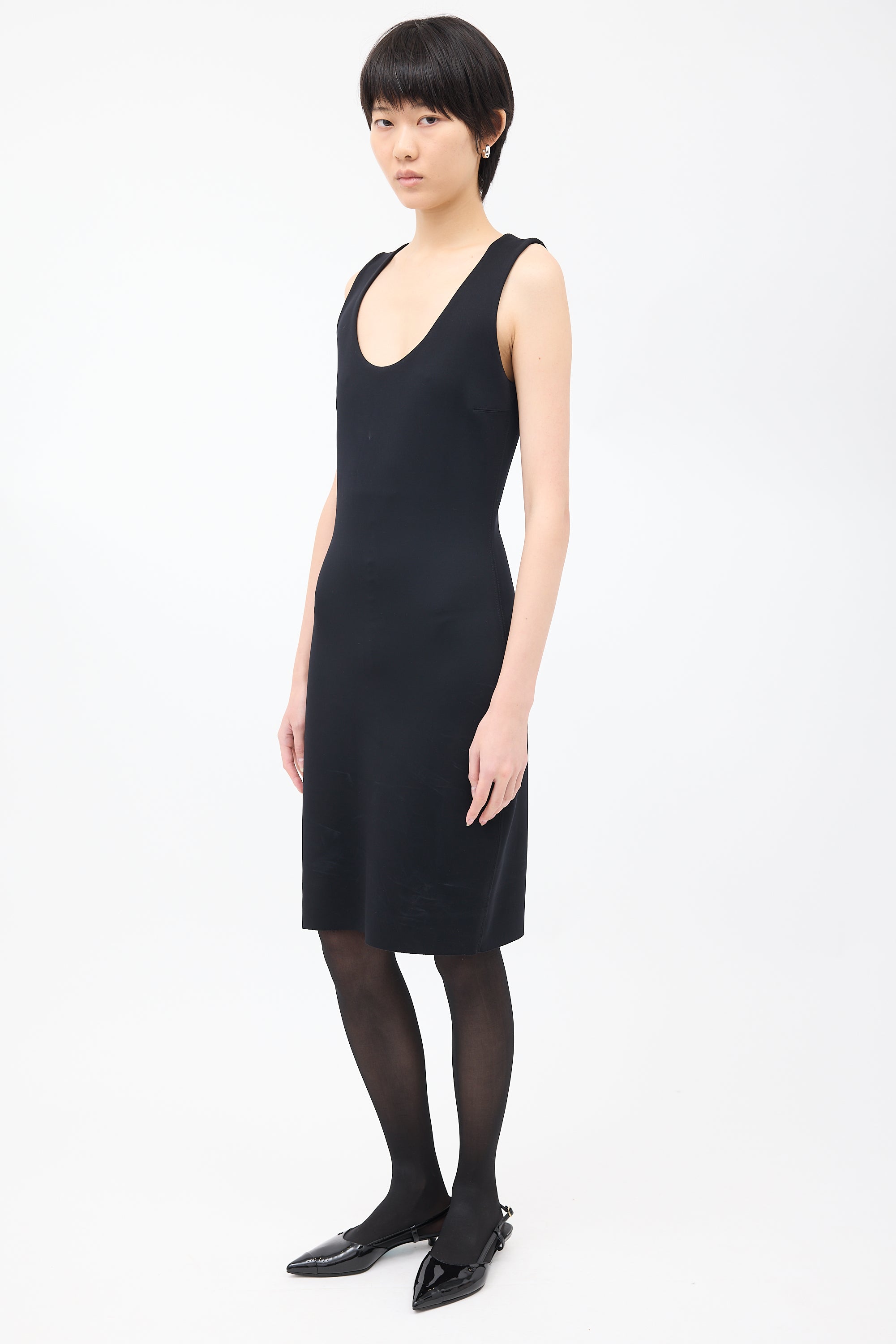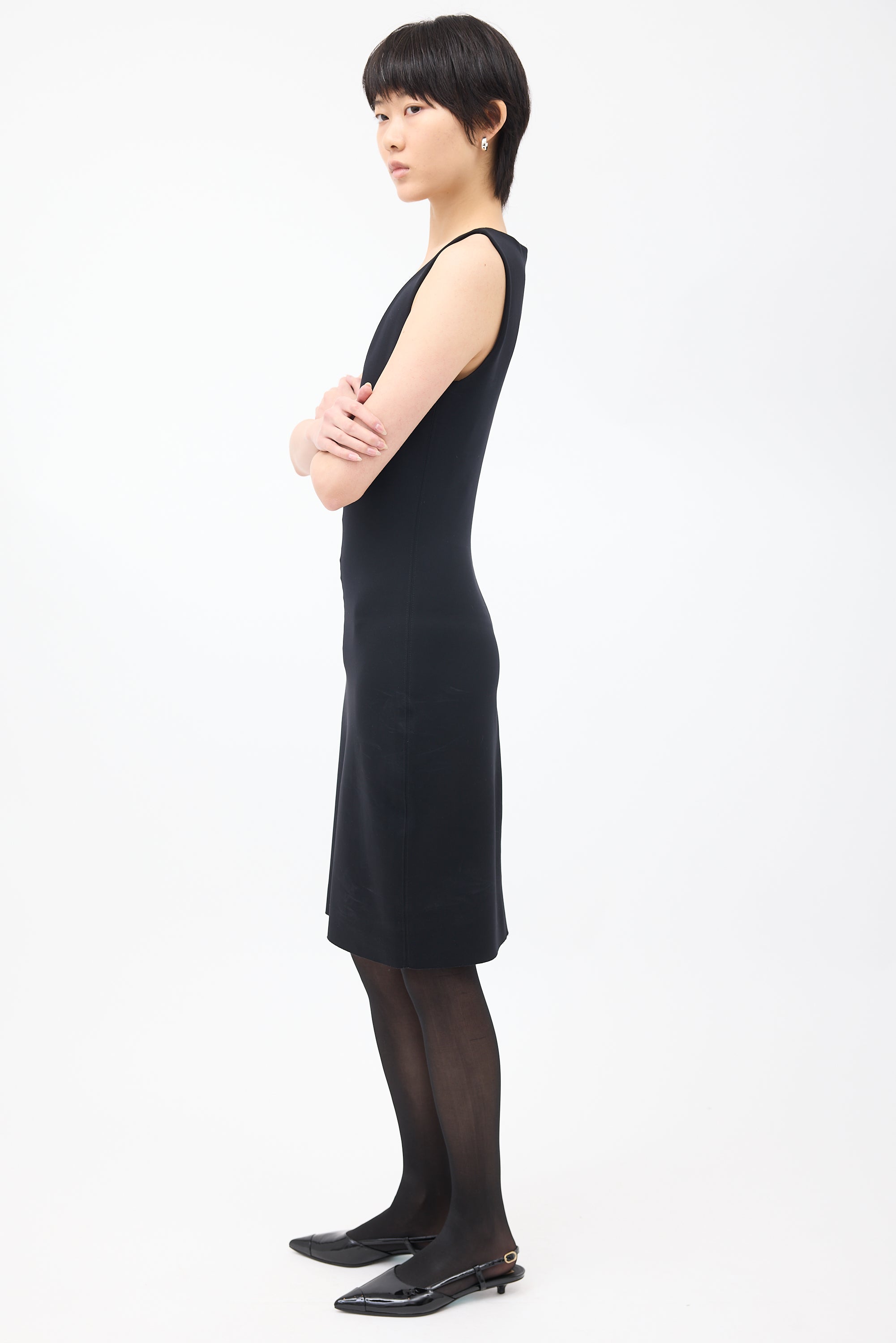 Pre-owned The Row black midi dress featuring a scoop neckline, darting at bust, and sleeveless design.