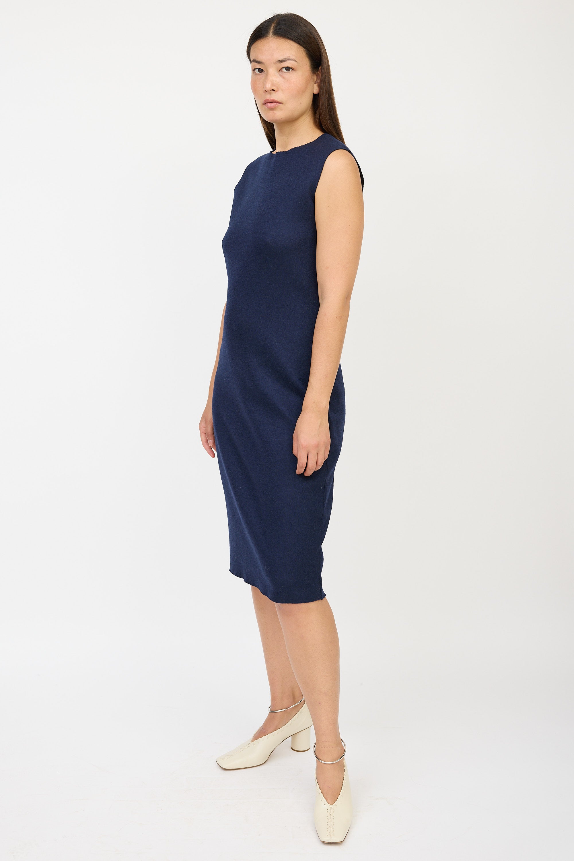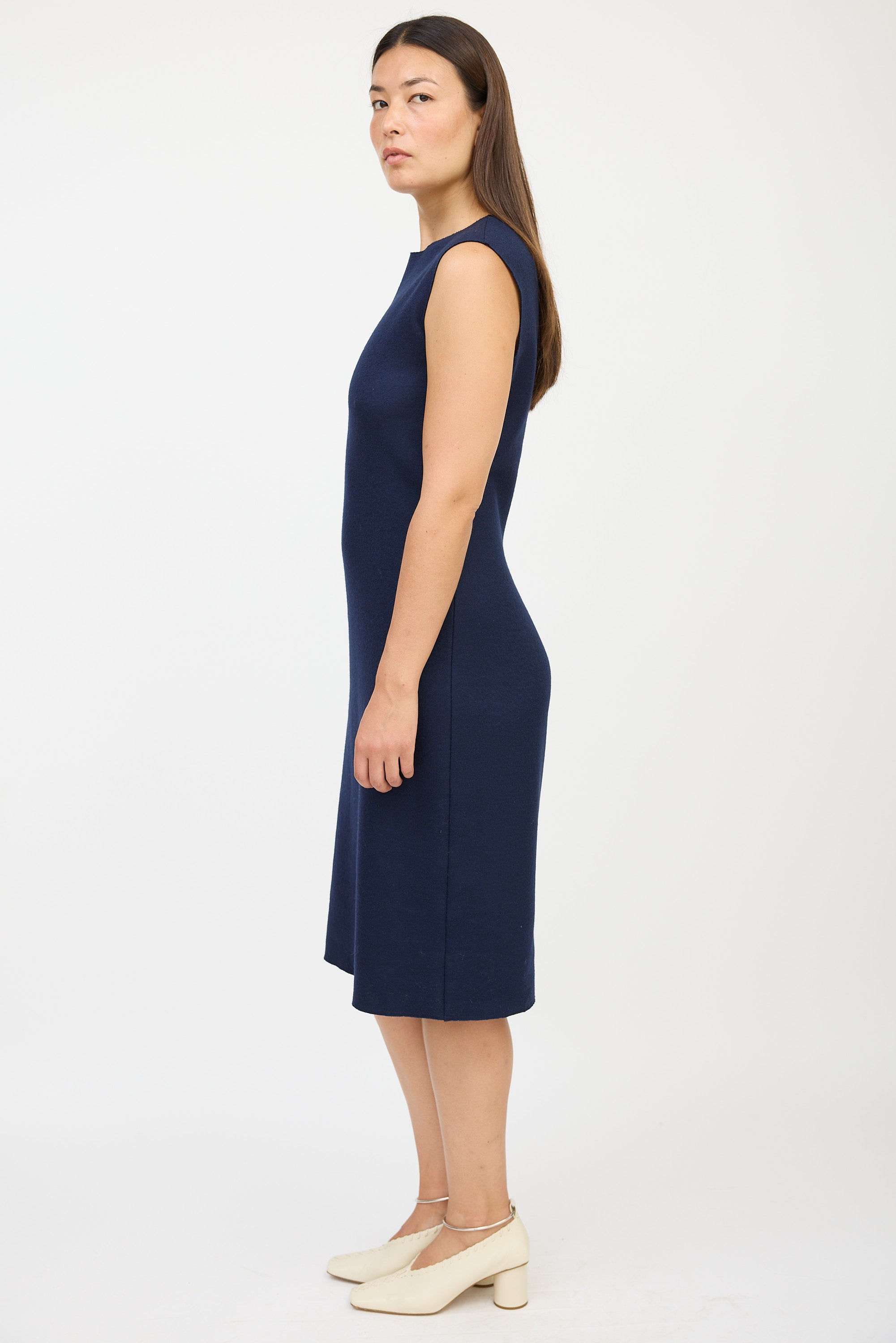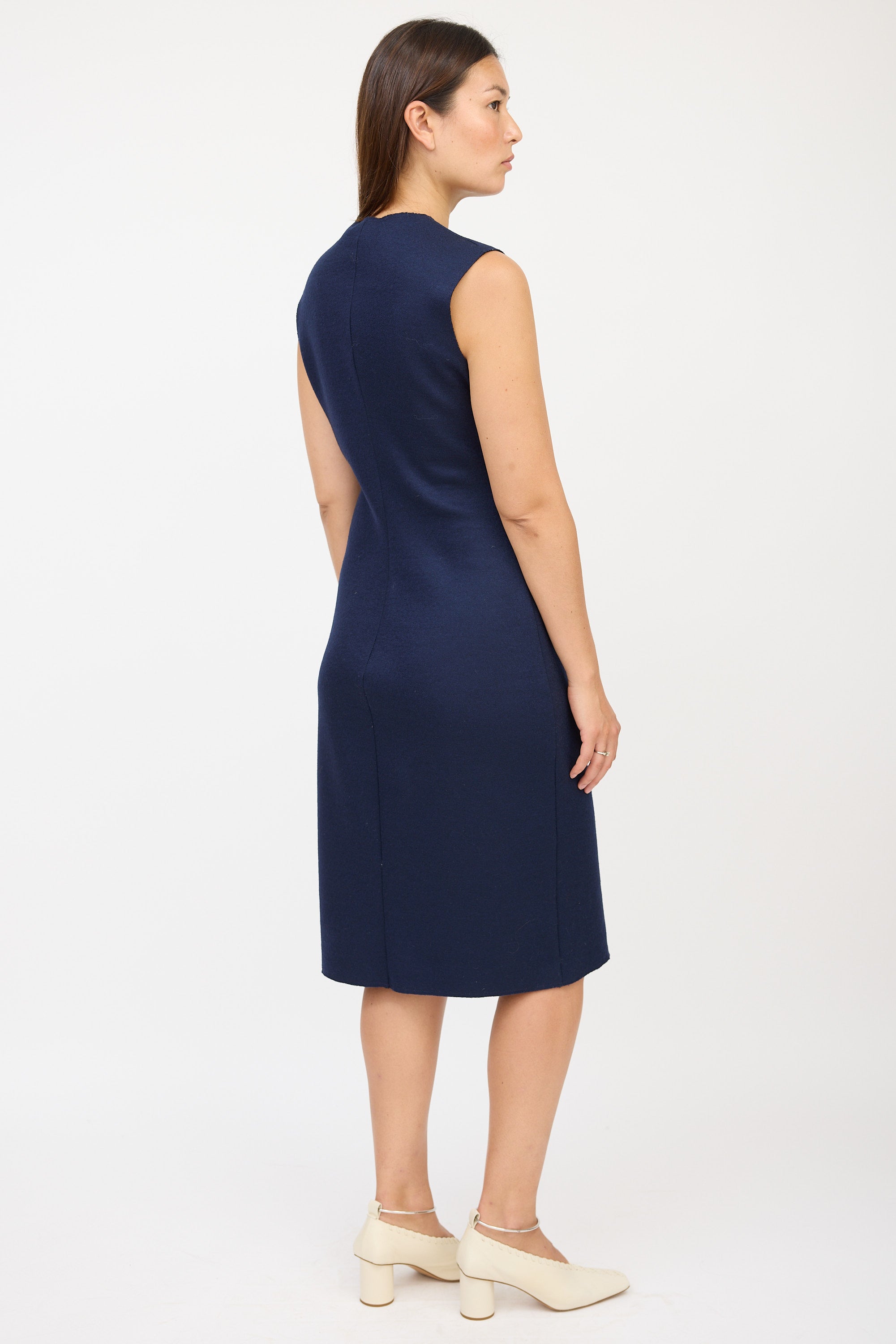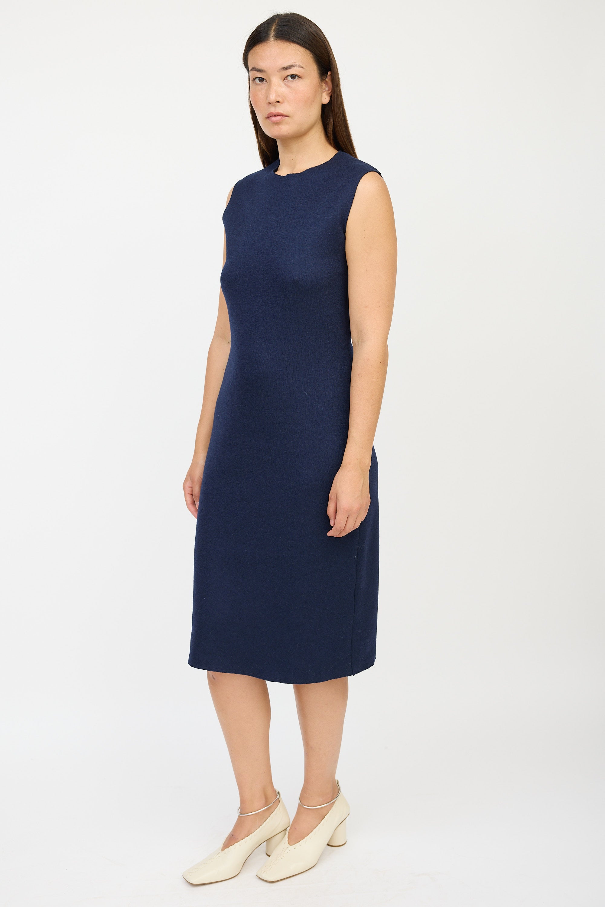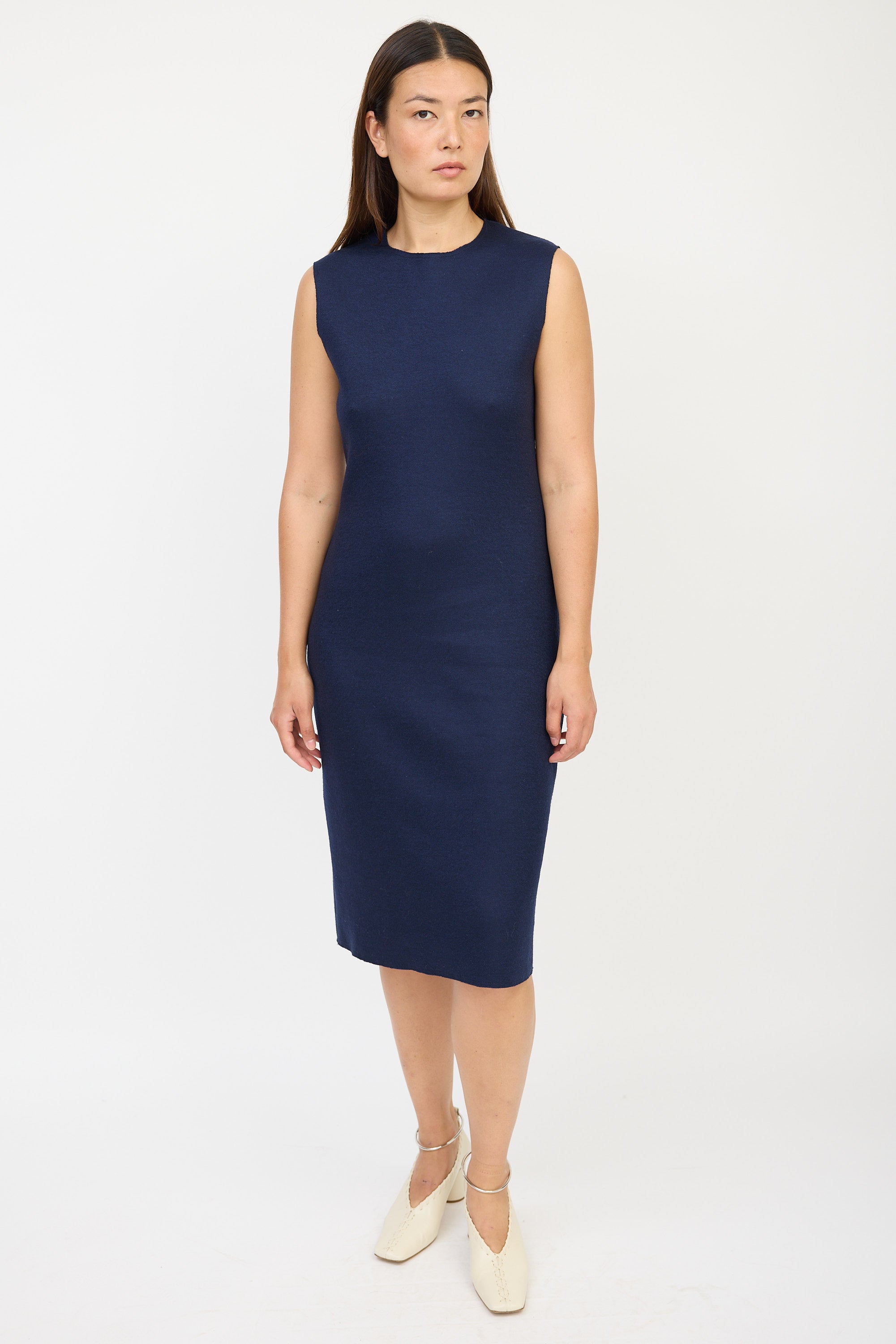 The Row navy wool midi dress featuring a round neckline, sleeveless styling, and raw hem trim.