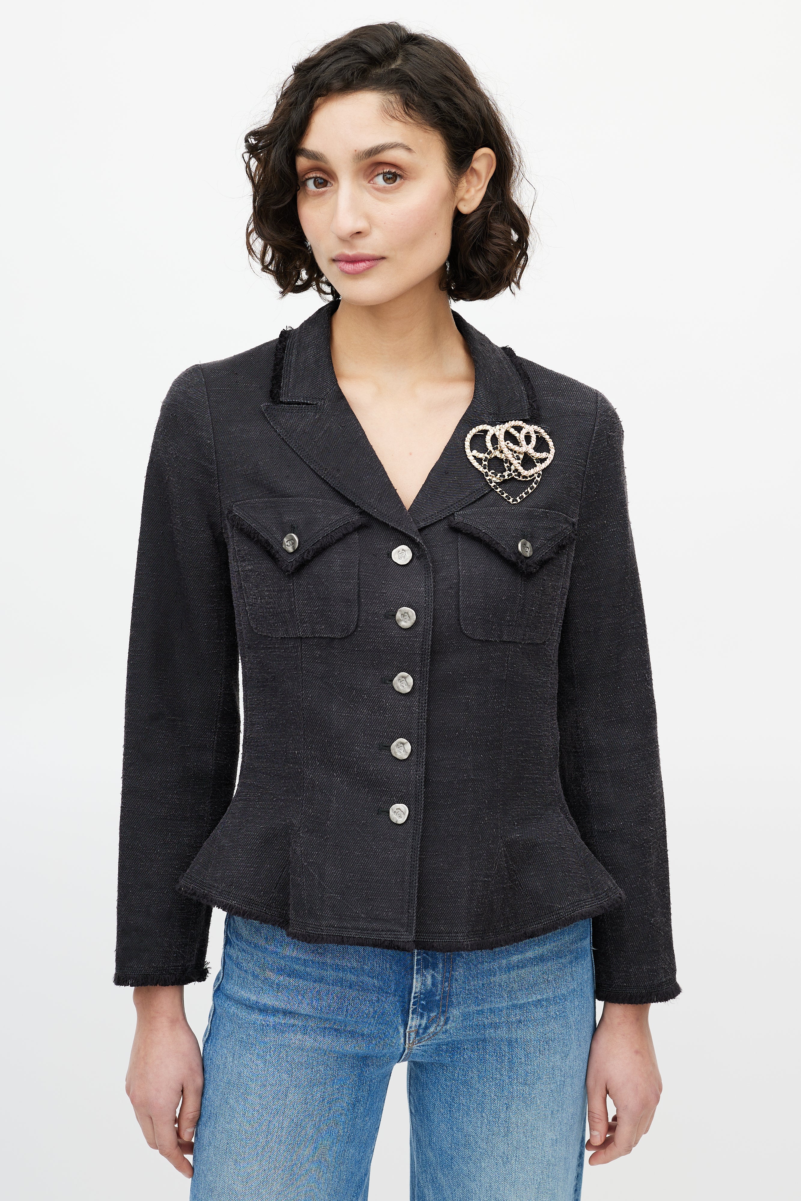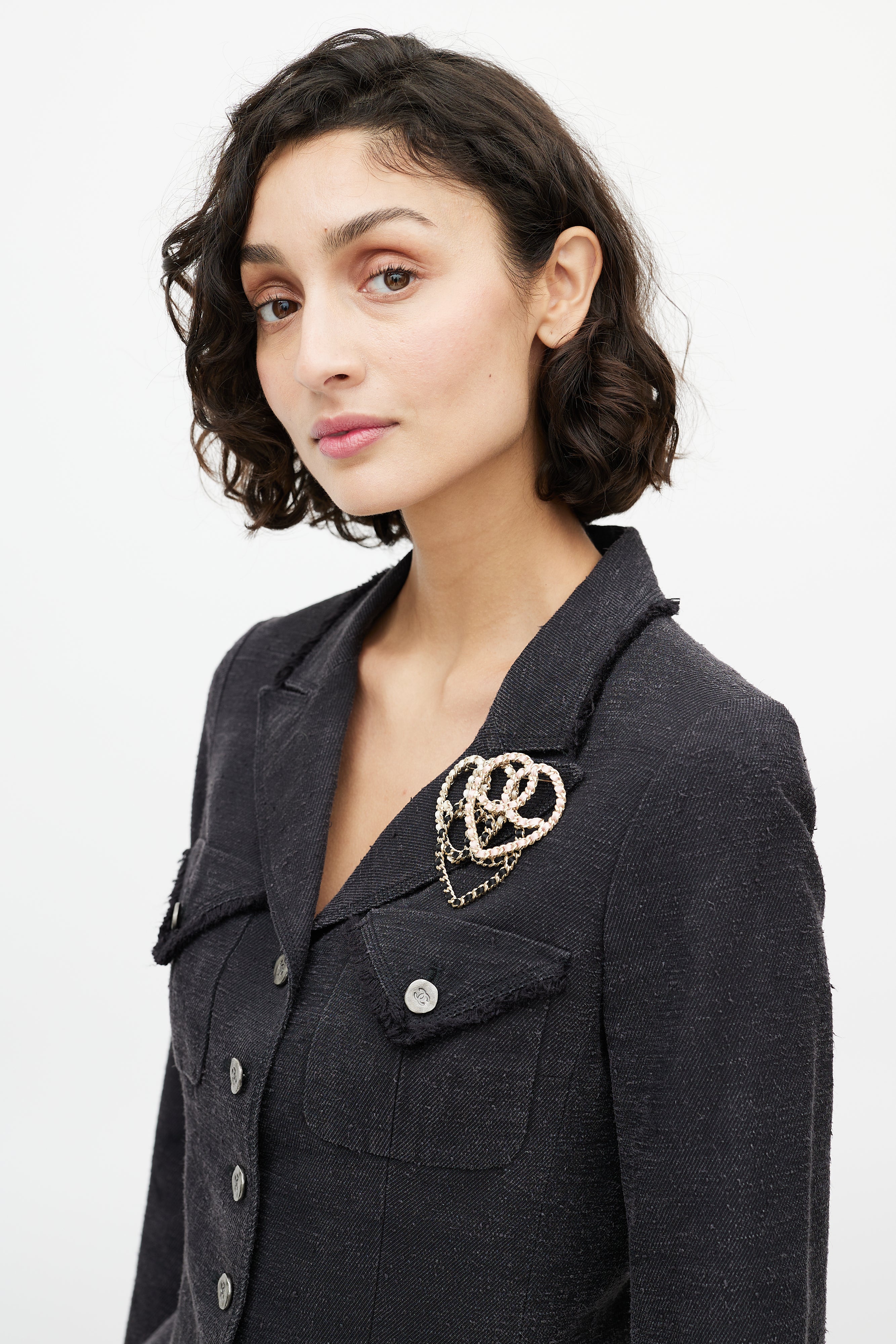 Pre-owned Cruise 2009 Chanel brooch featuring heart motif with CC logo, gold tone hardware, black, white, and pink braided satin, logo plaque at back, and pin closure.