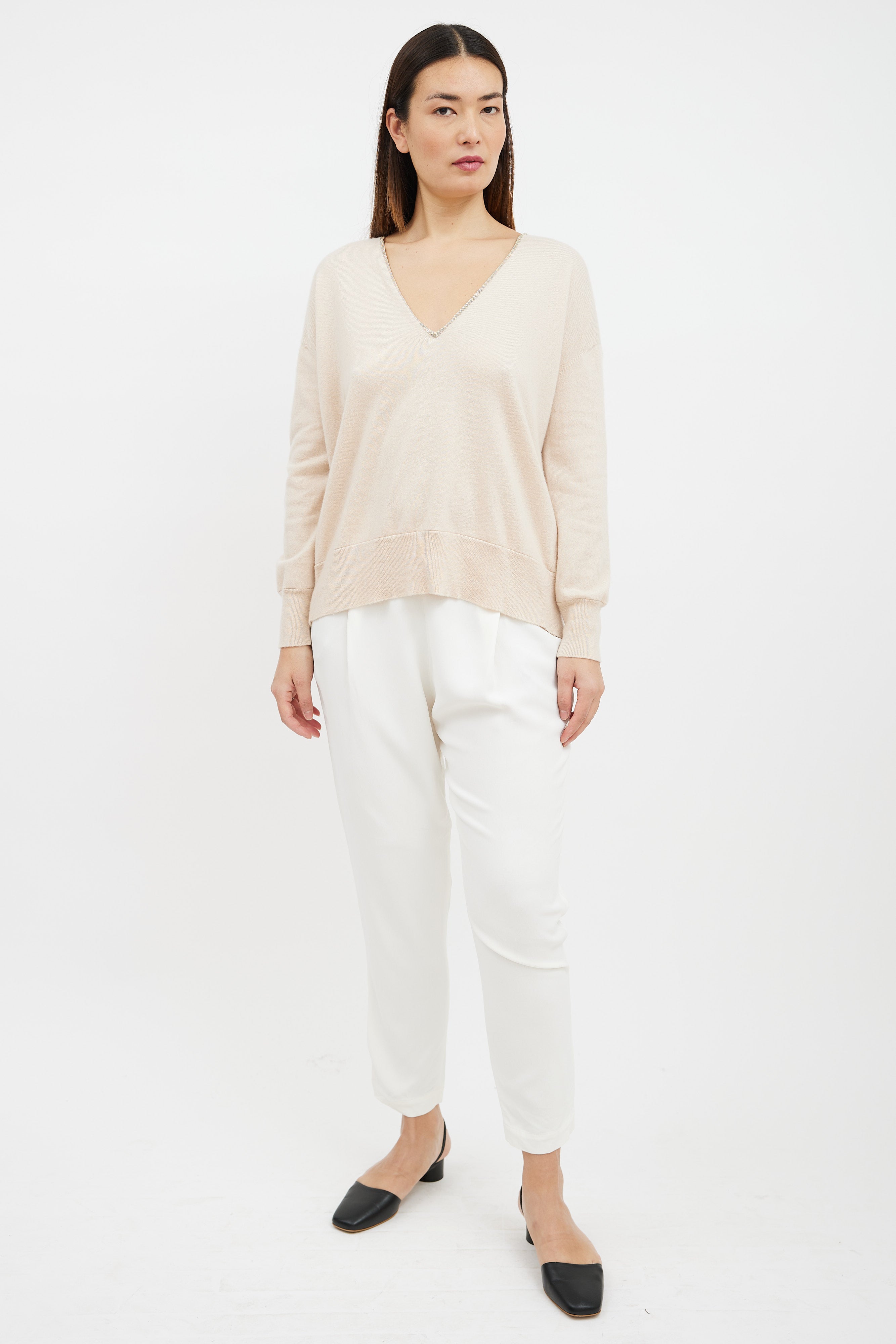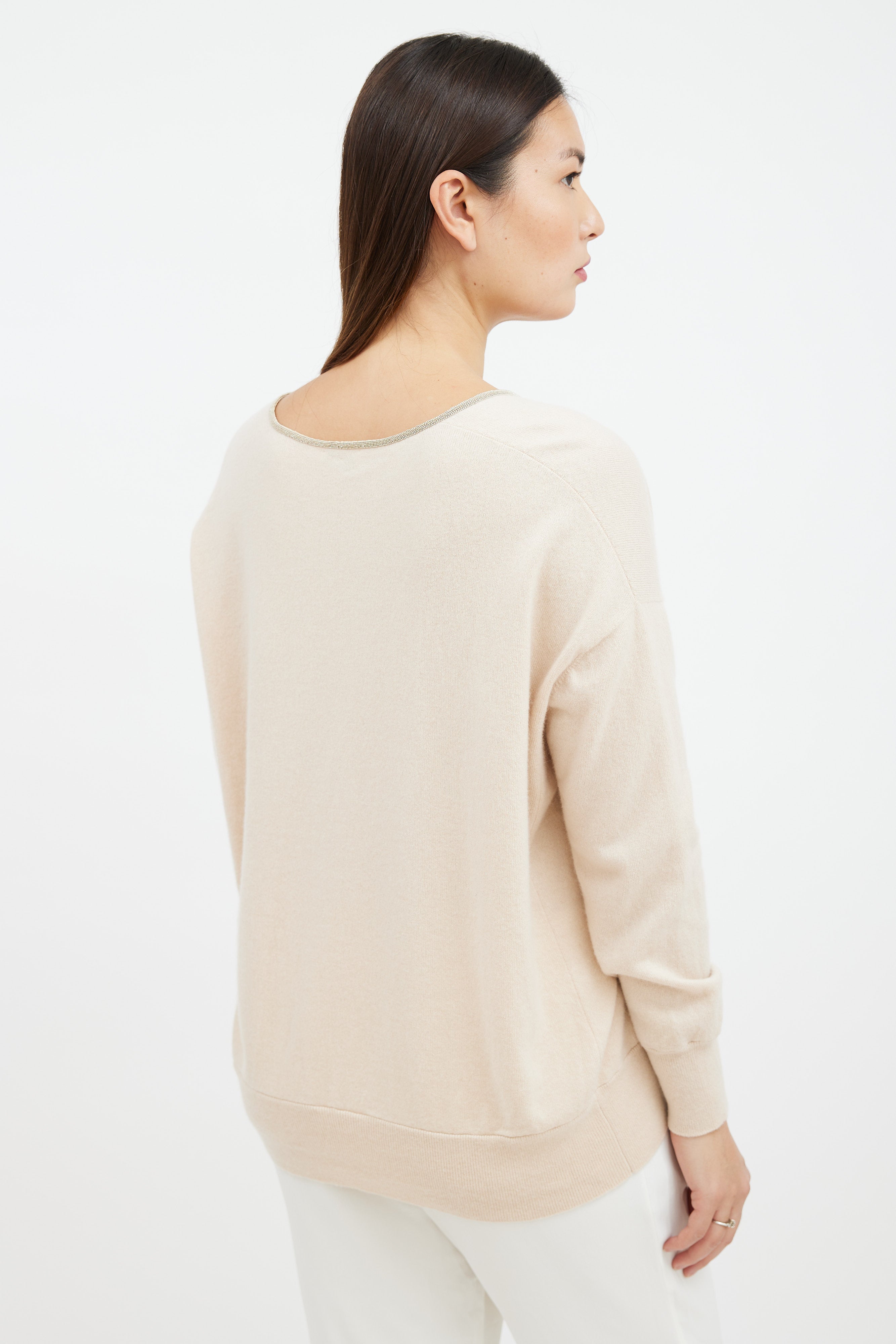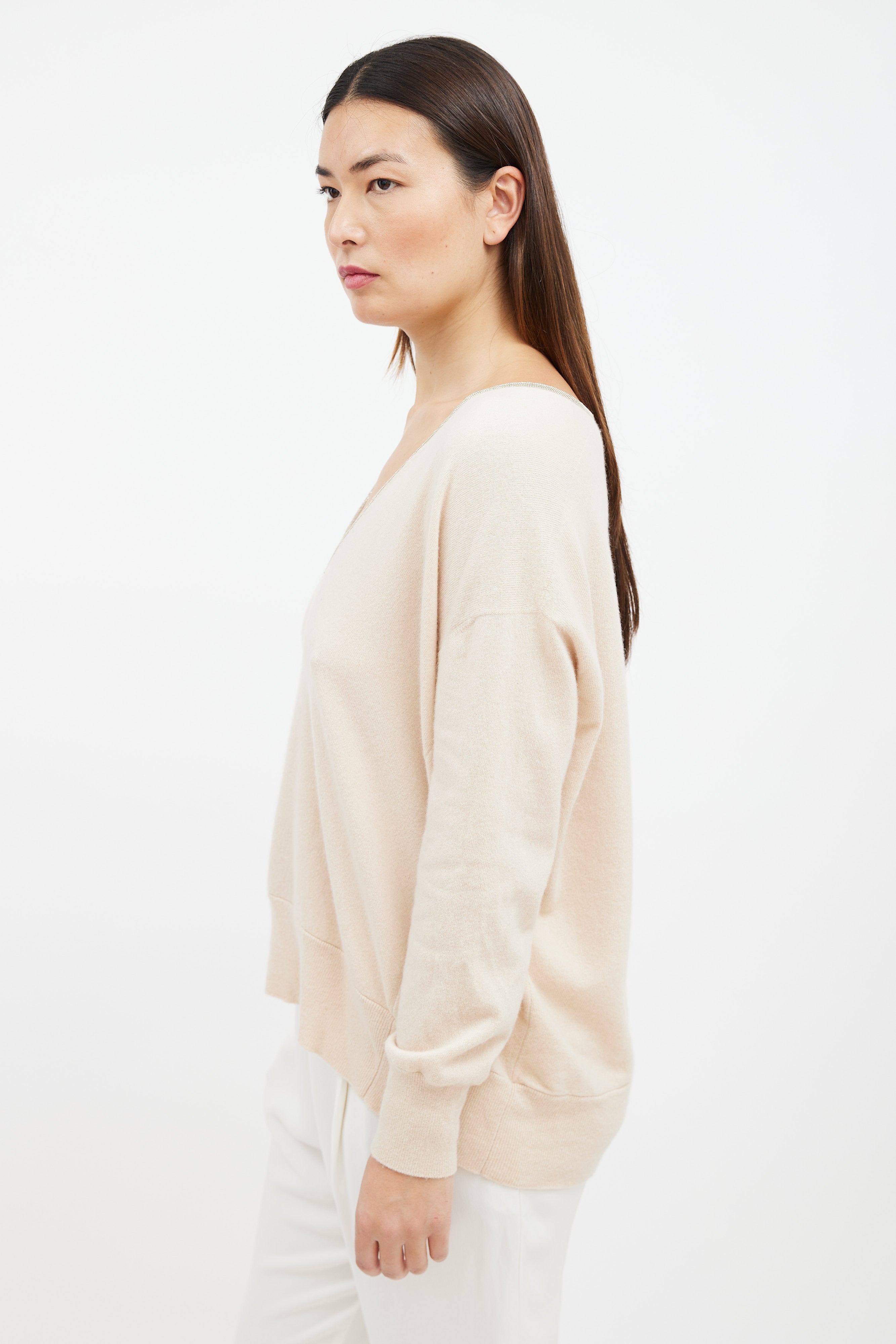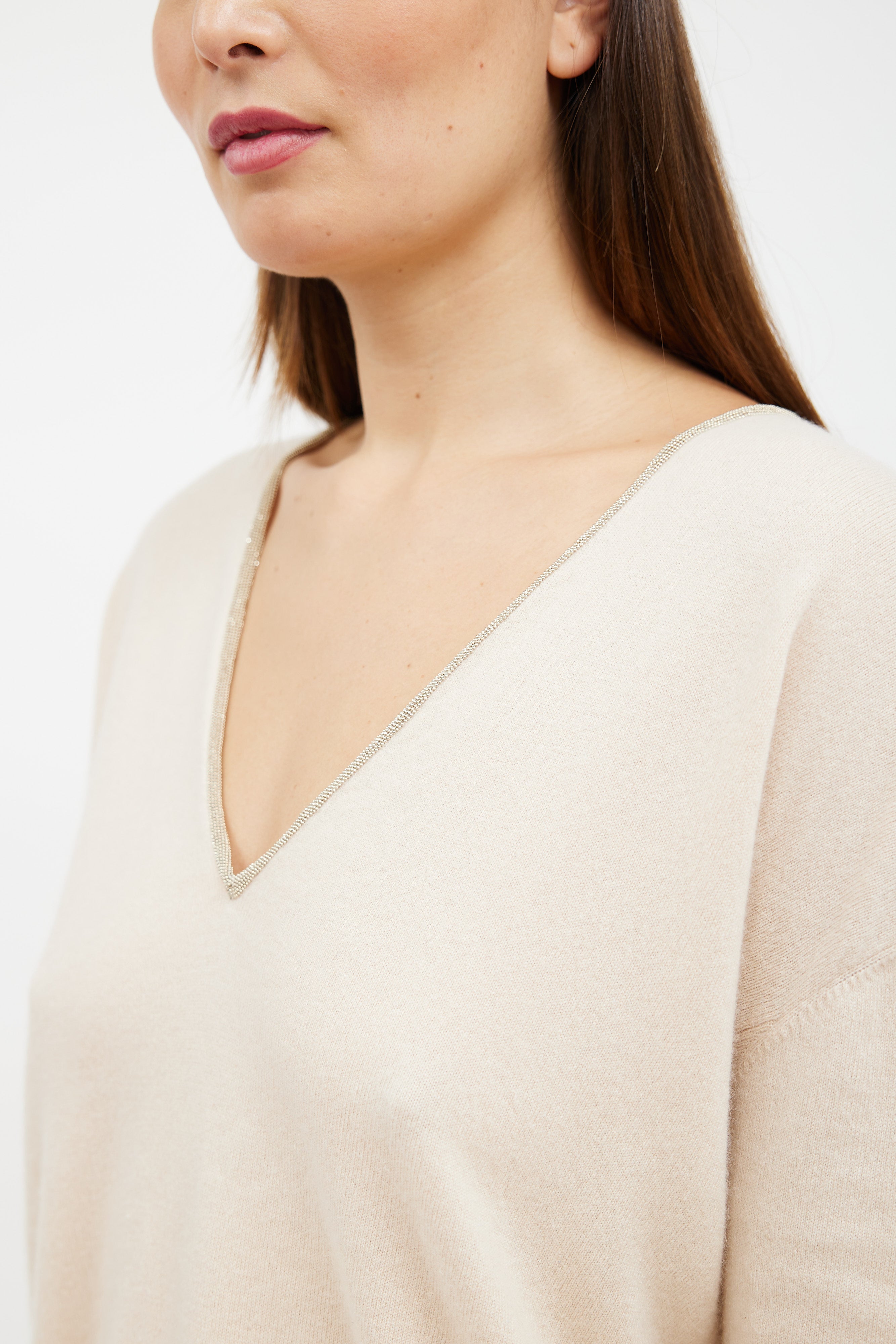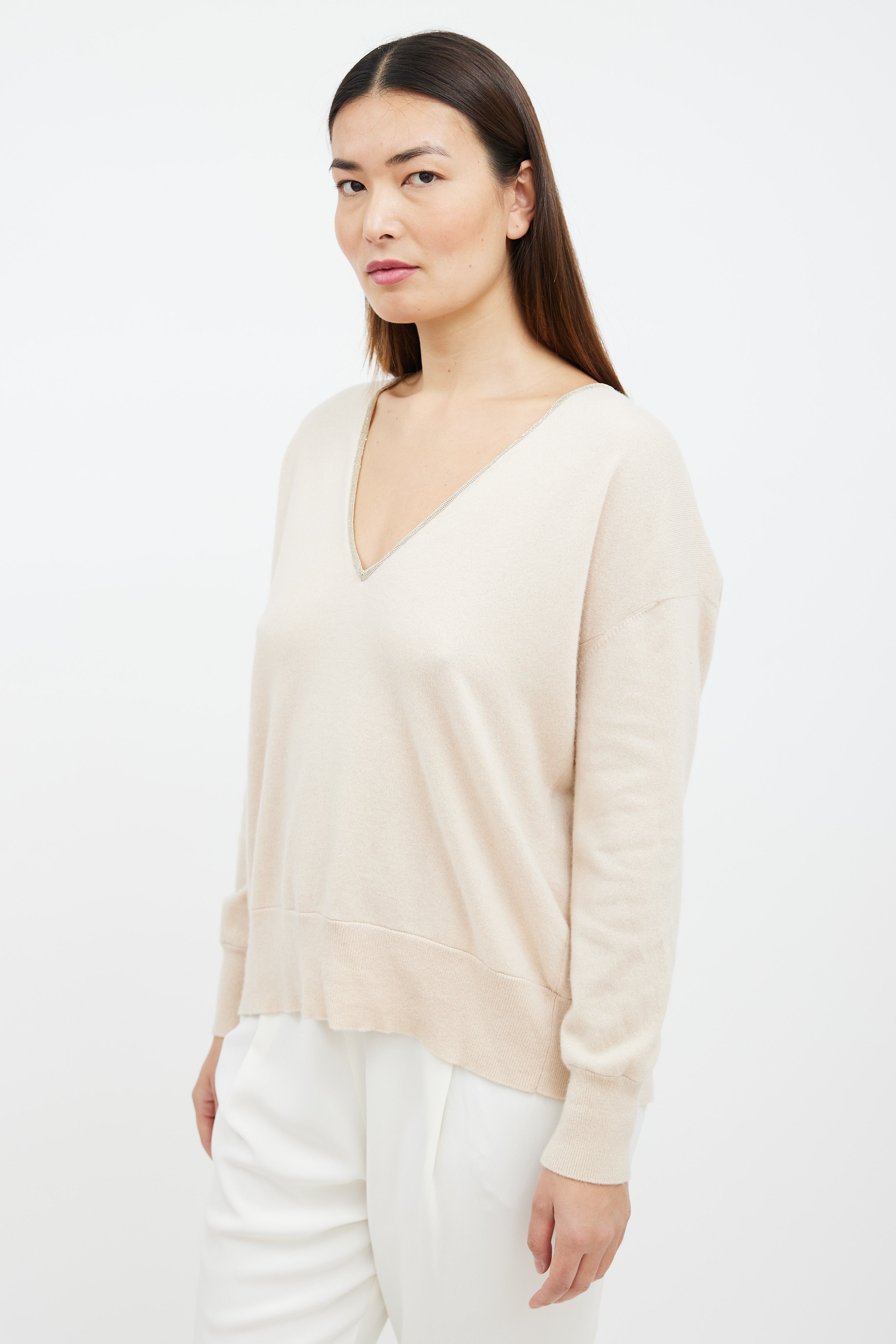 Pre-owned Brunello Cucinelli beige cashmere sweater featuring a deep V-neckline with Monili beaded trim, long sleeves with ribbed cuffs, side panelled construction, and a ribbed hemline.