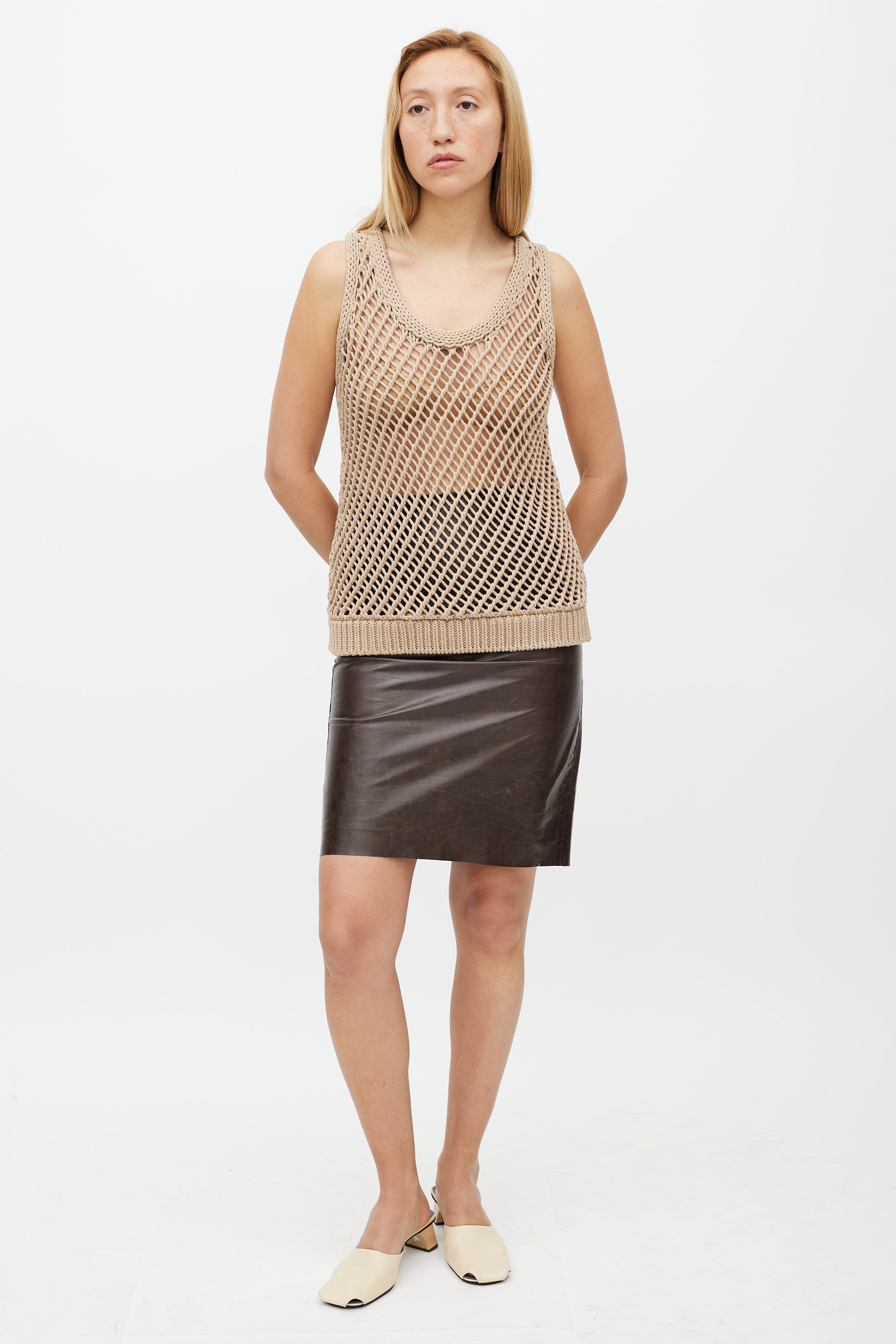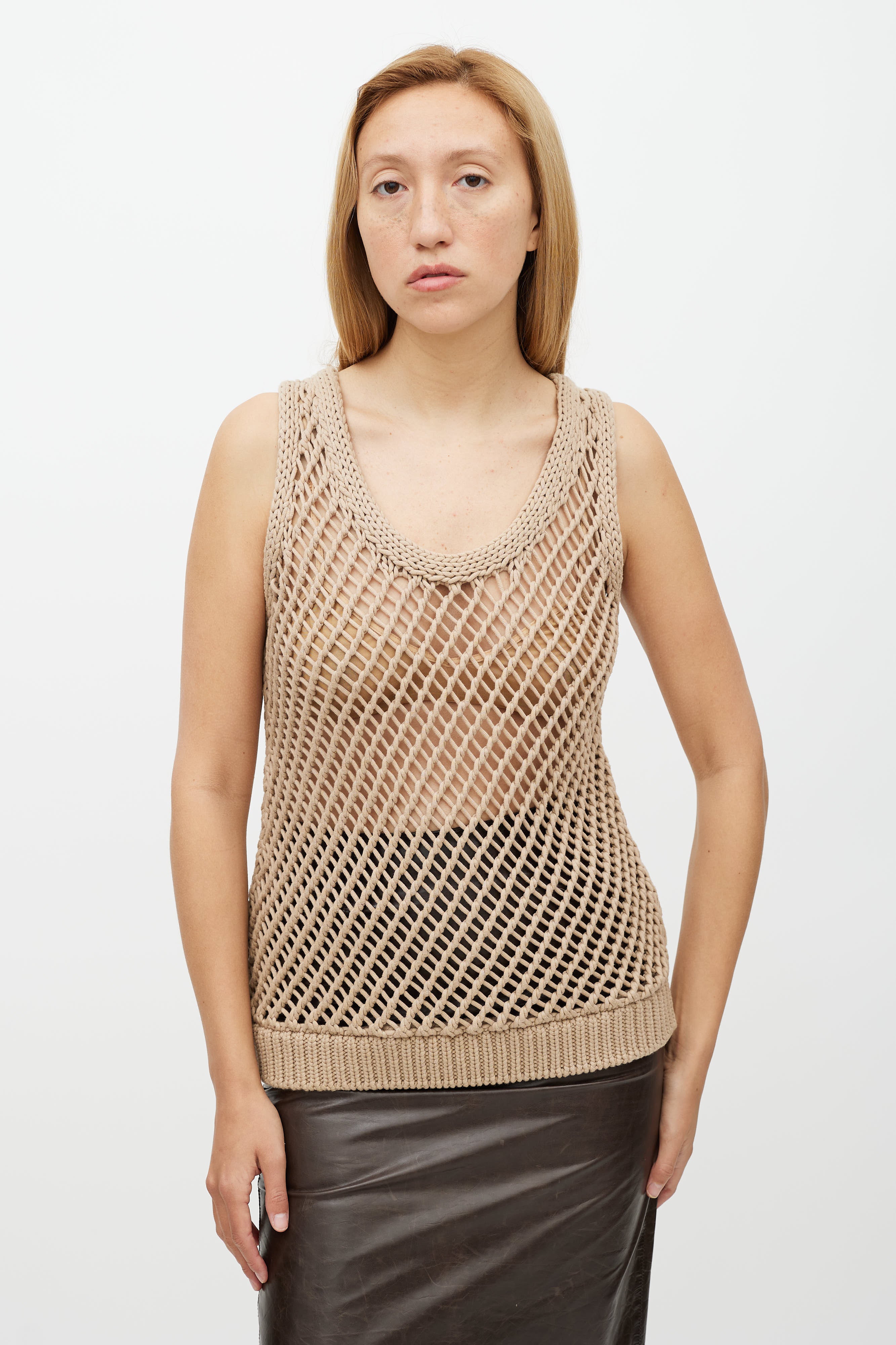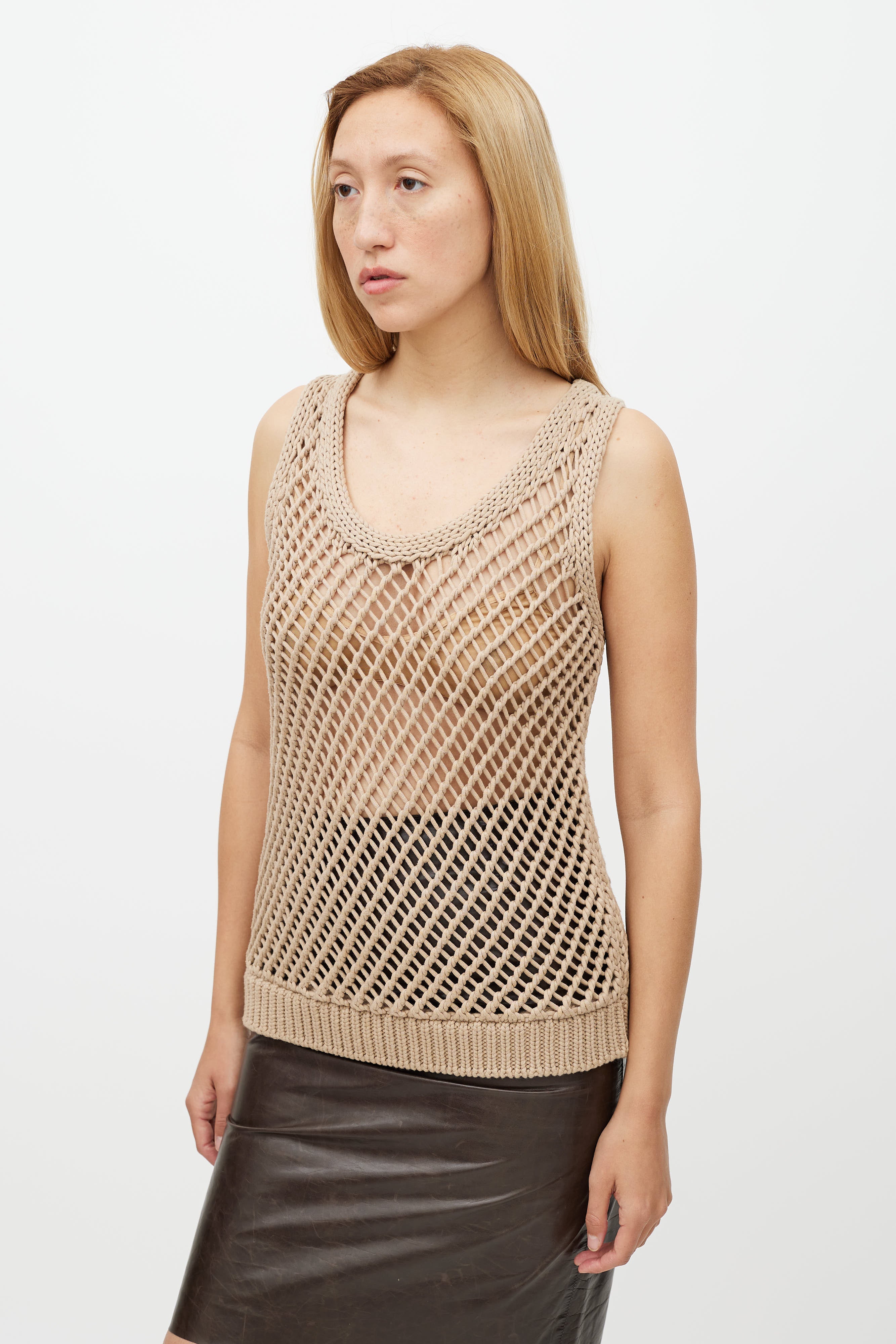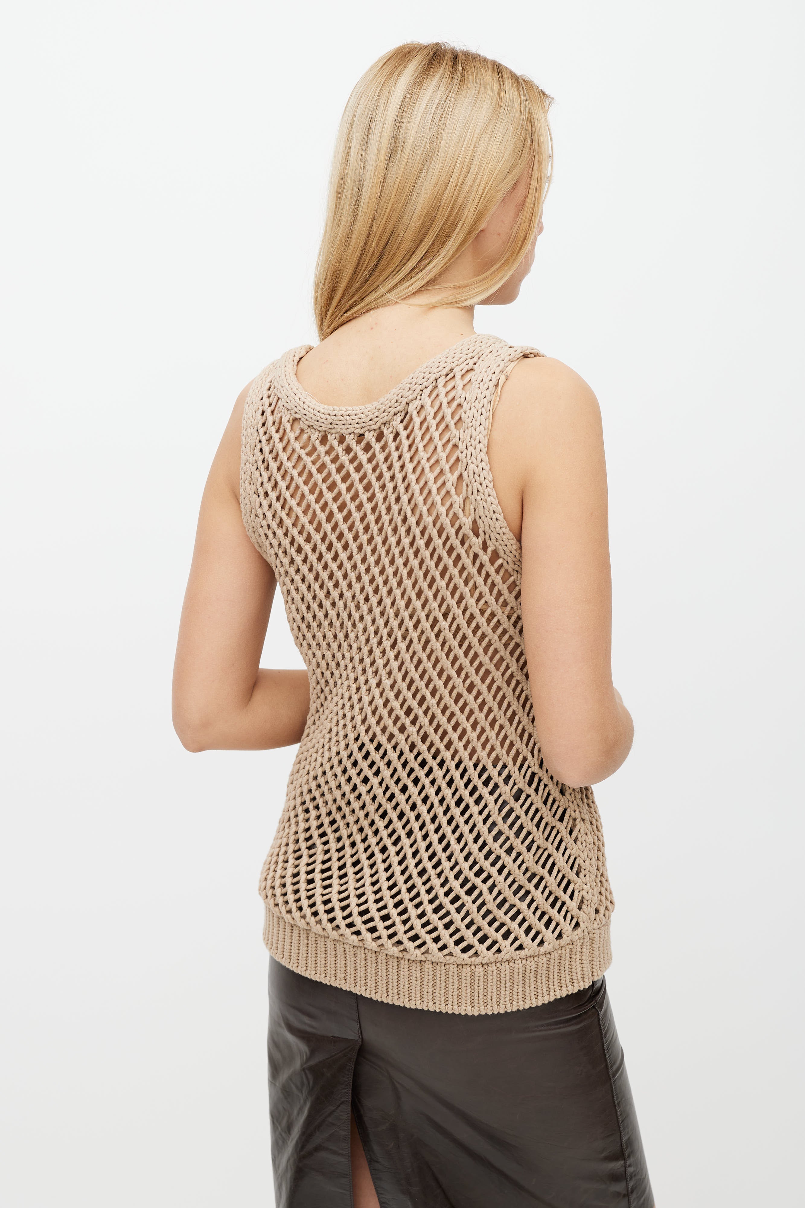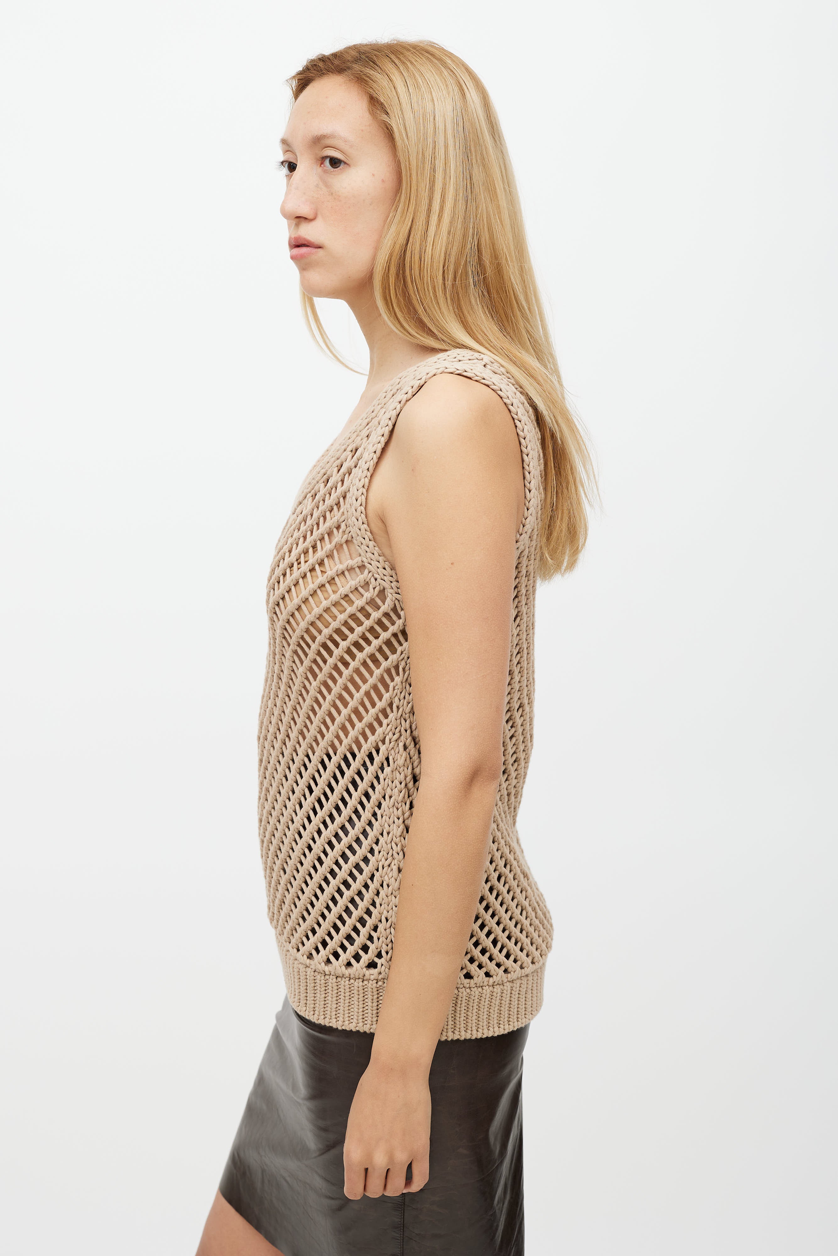 Pre-owned Brunello Cucinelli beige crocheted vest featuring a round neckline, sleeveless styling, and ribbed hem.