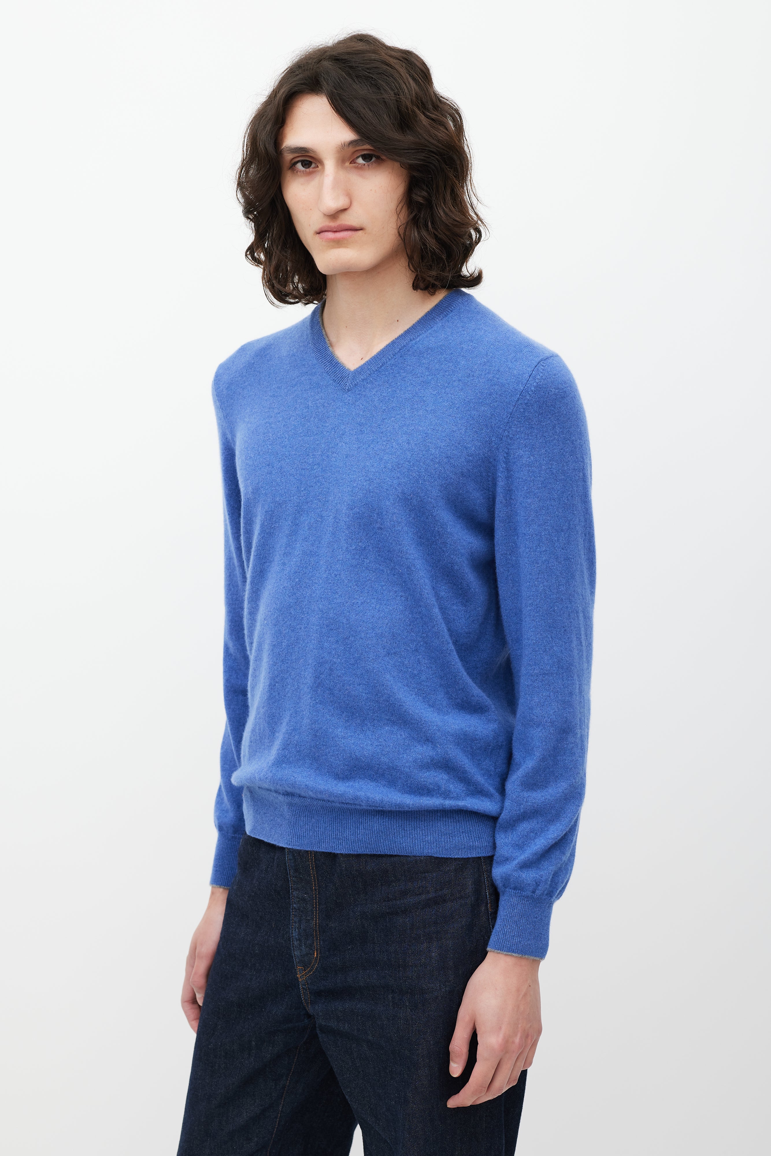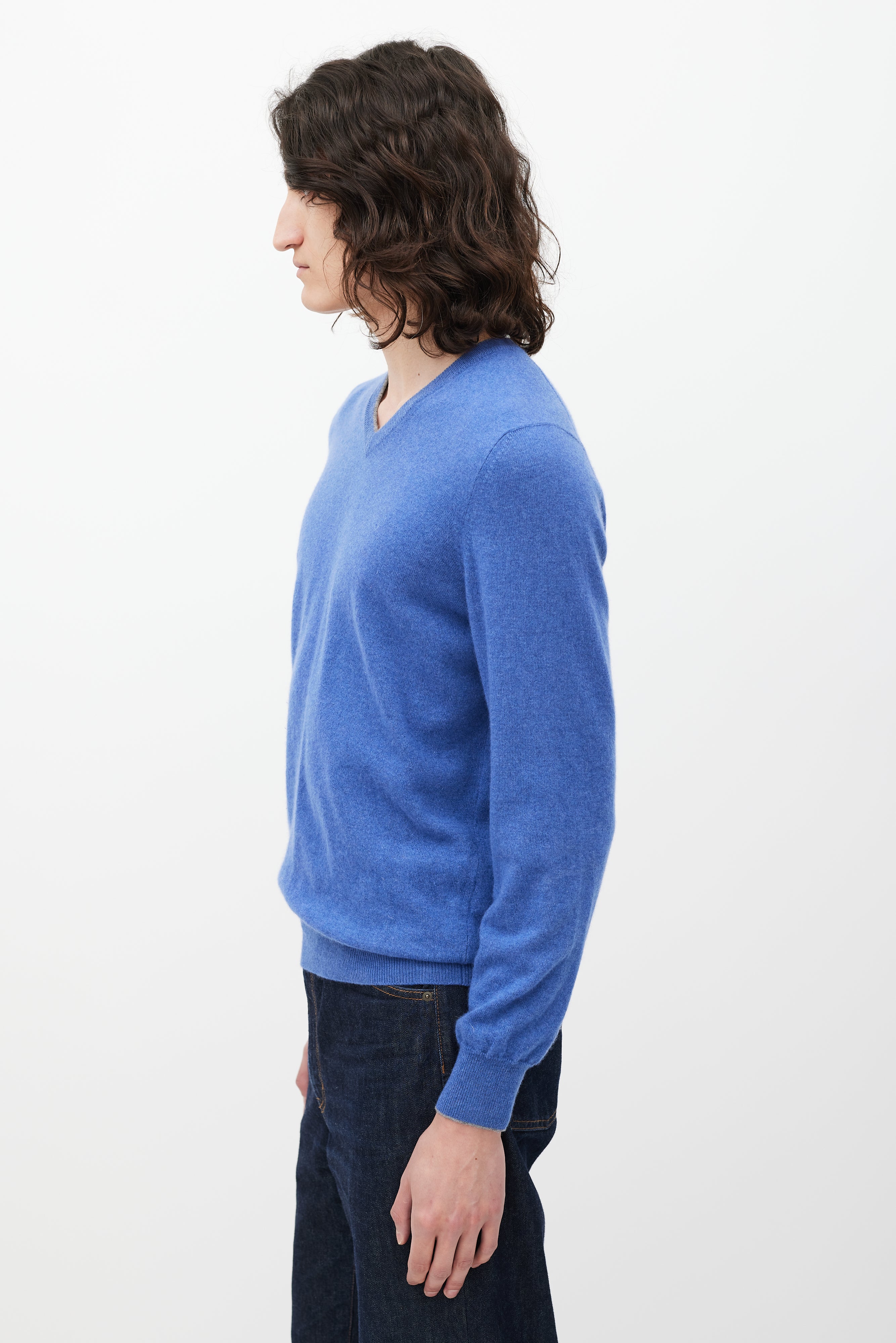 Pre-owned Brunello Cucinello blue cashmere sweater featuring a V-neckline with grey trim, long sleeves, and ribbing at neck, hem, and cuffs.