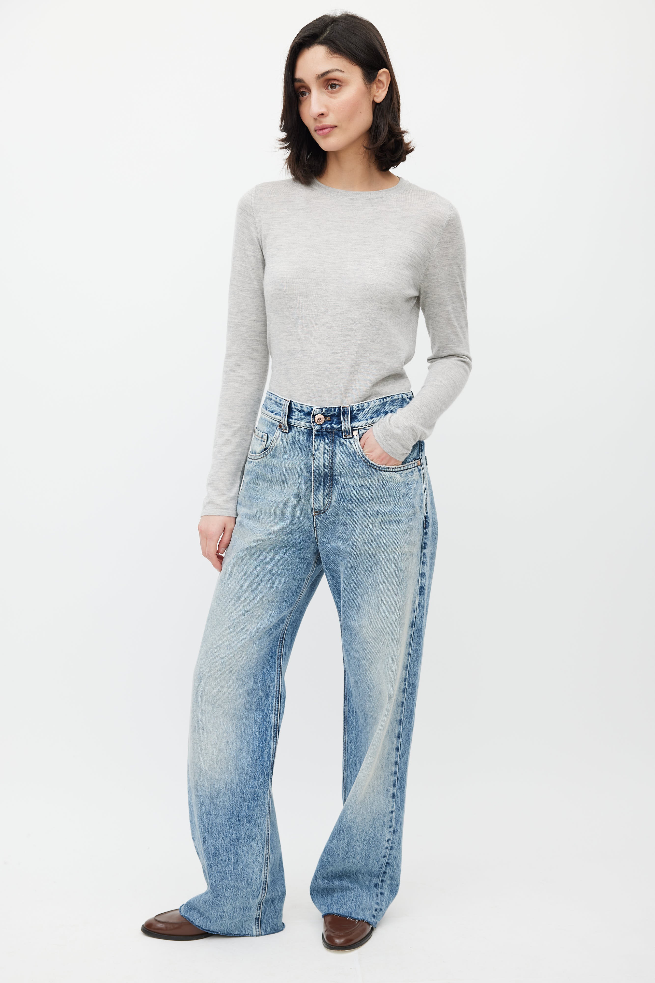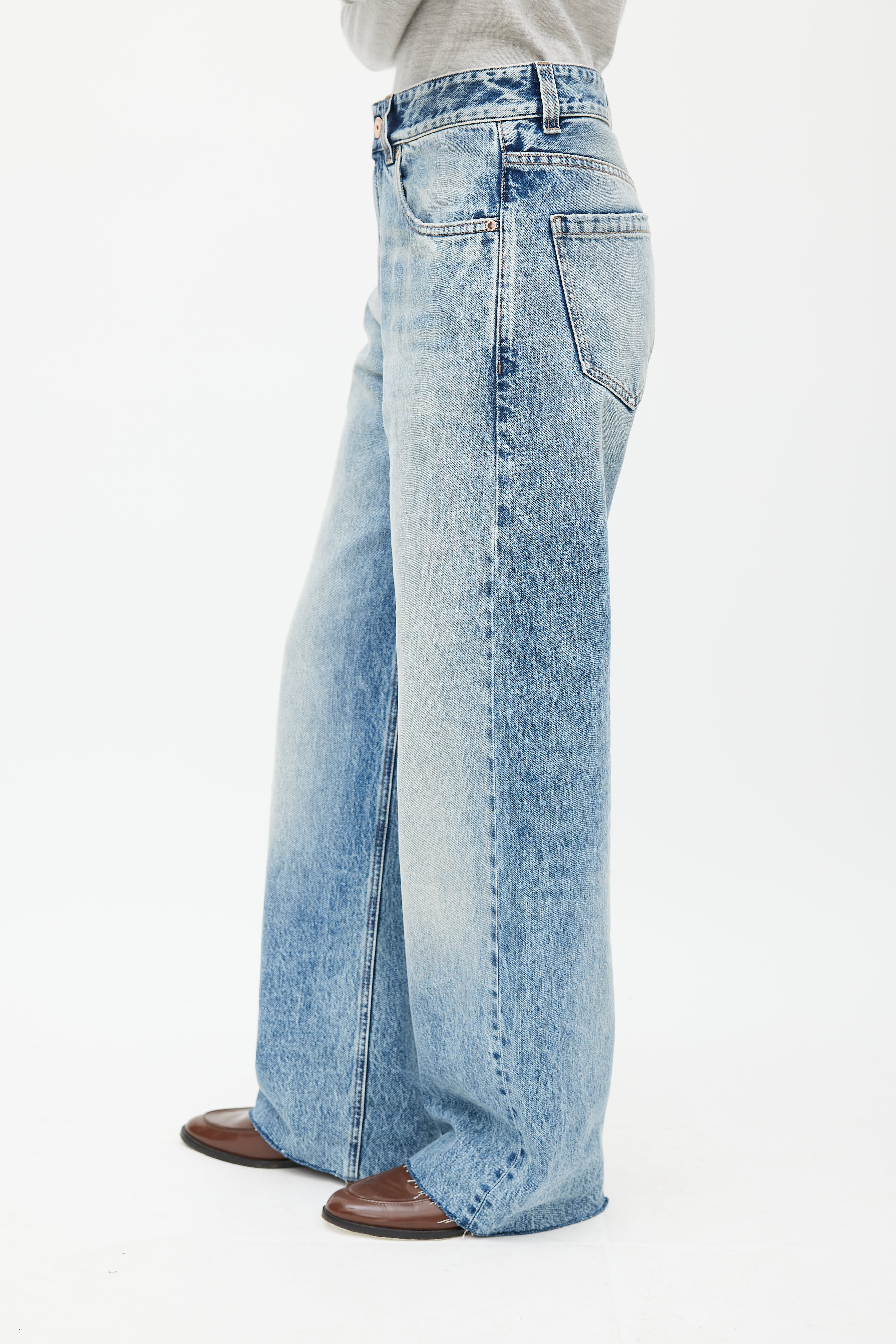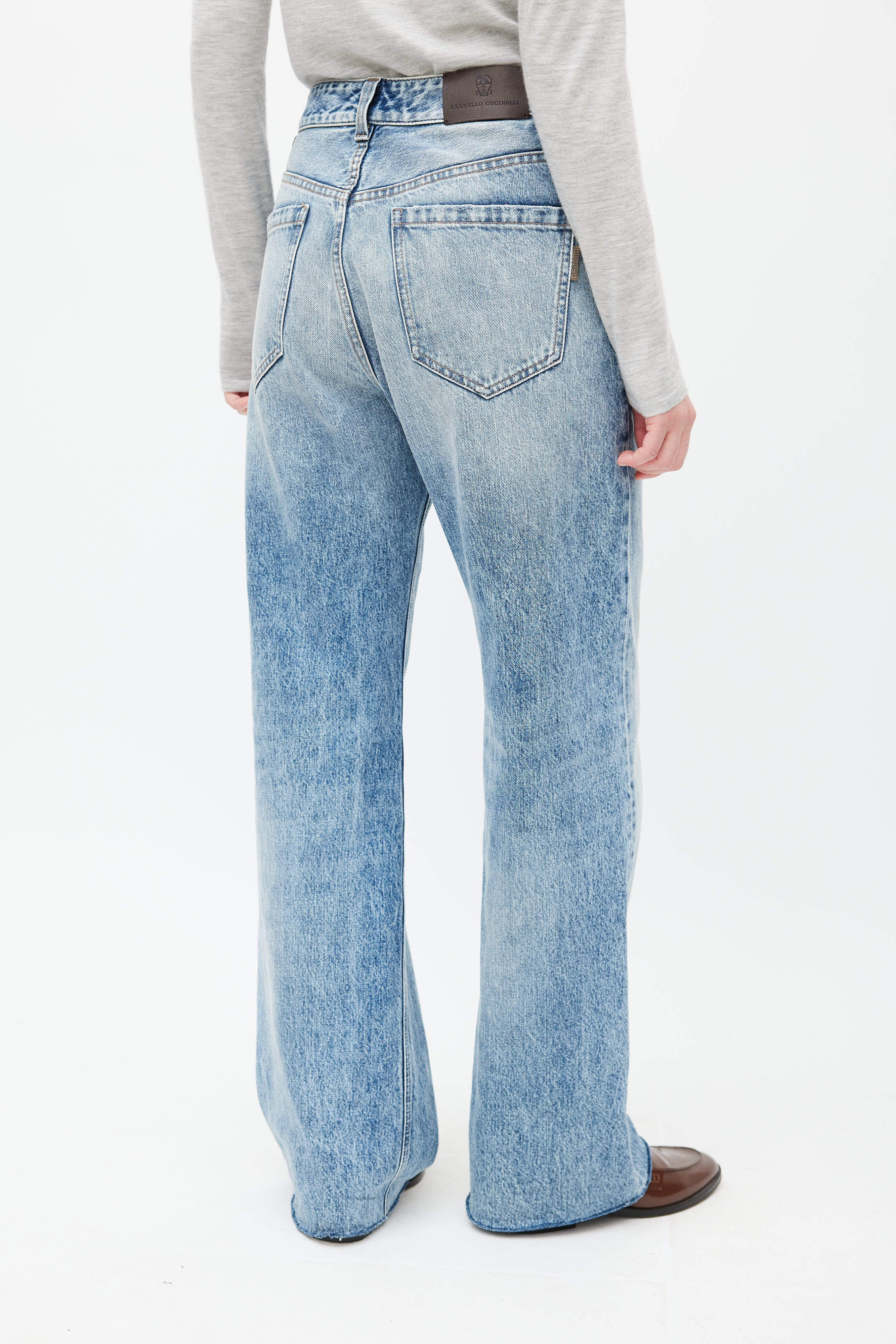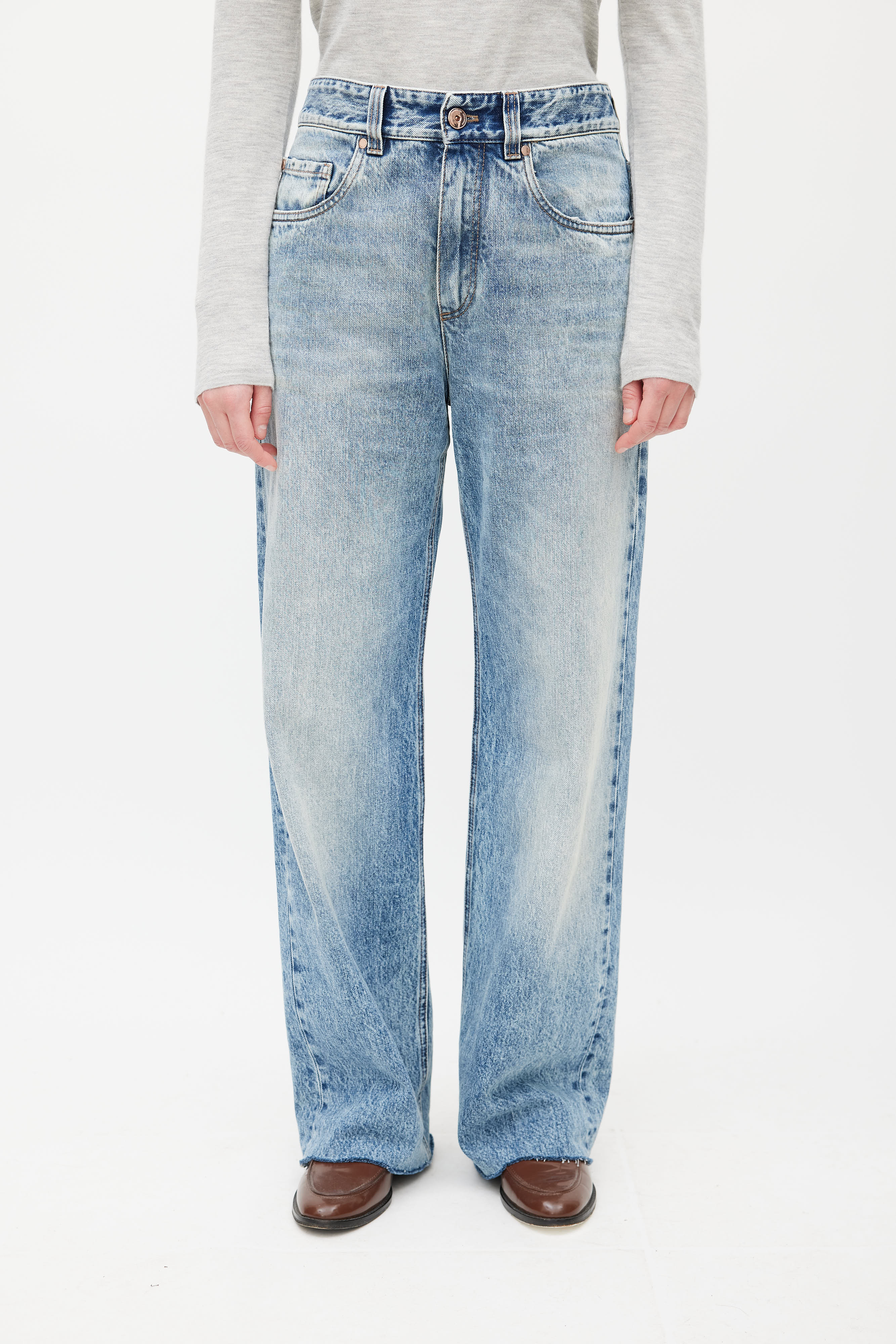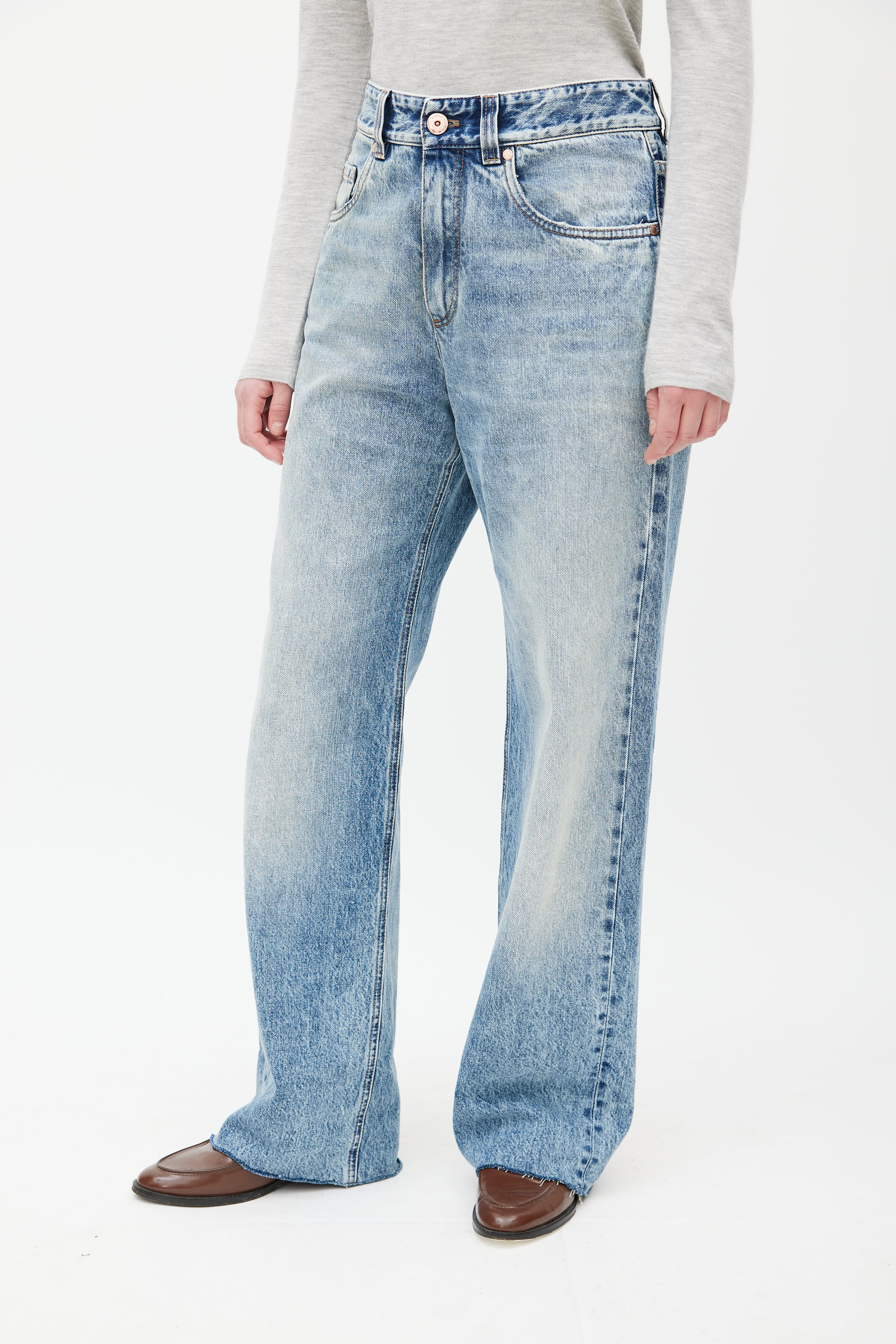 Pre-owned Brunello Cucinelli blue jeans featuring five pocket styling, embossed leather logo tab at back, wide leg, raw hem, and zip fly with button closure. Clipped to fit model.