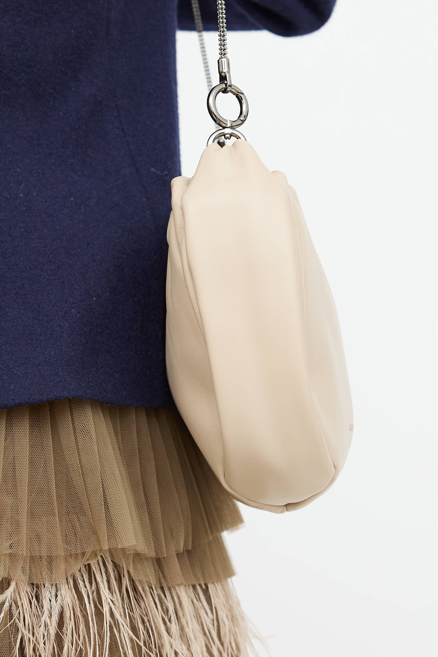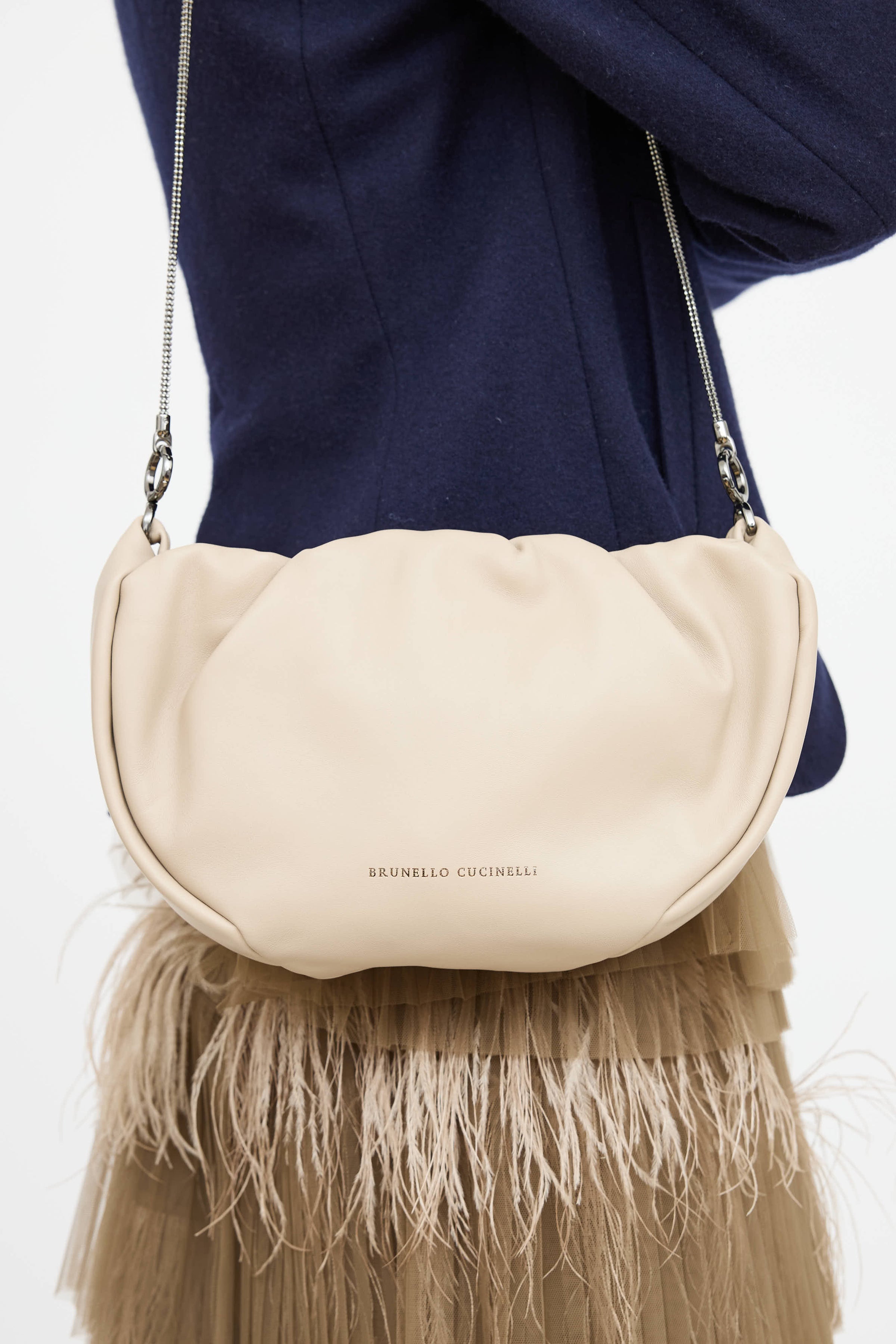 Pre-owned Brunello Cucinelli beige Brioche Hobo bag featuring singular gunmetal tone chain shoulder strap, cinched top, printed logo at front, top zip closure, and one main compartment with one card slot.