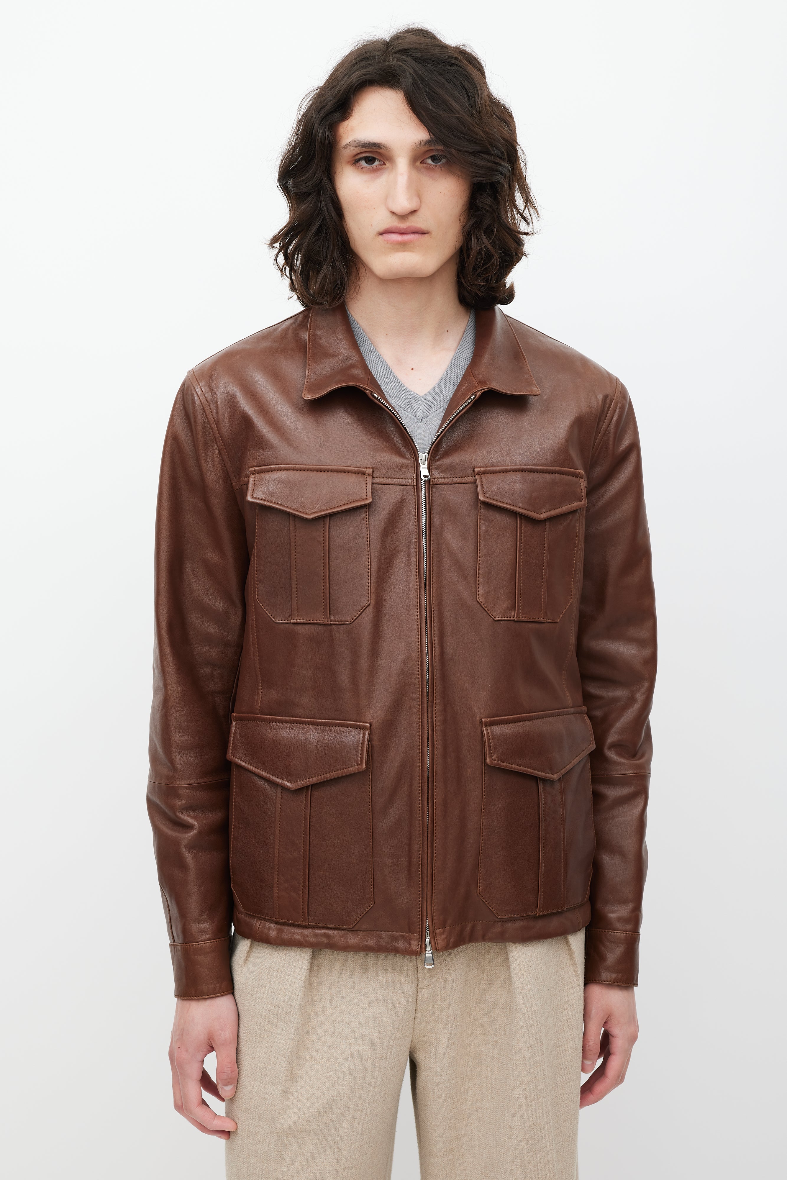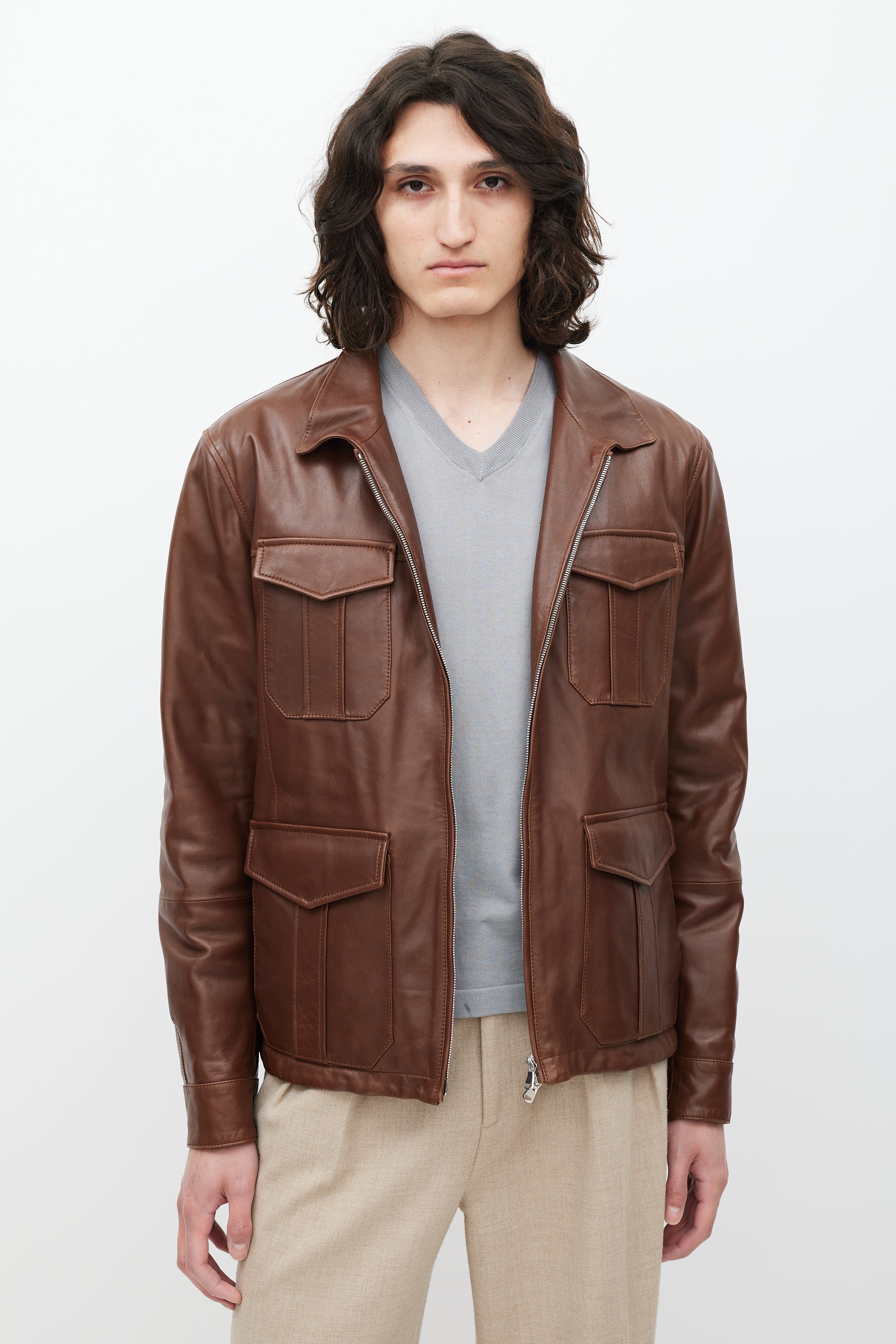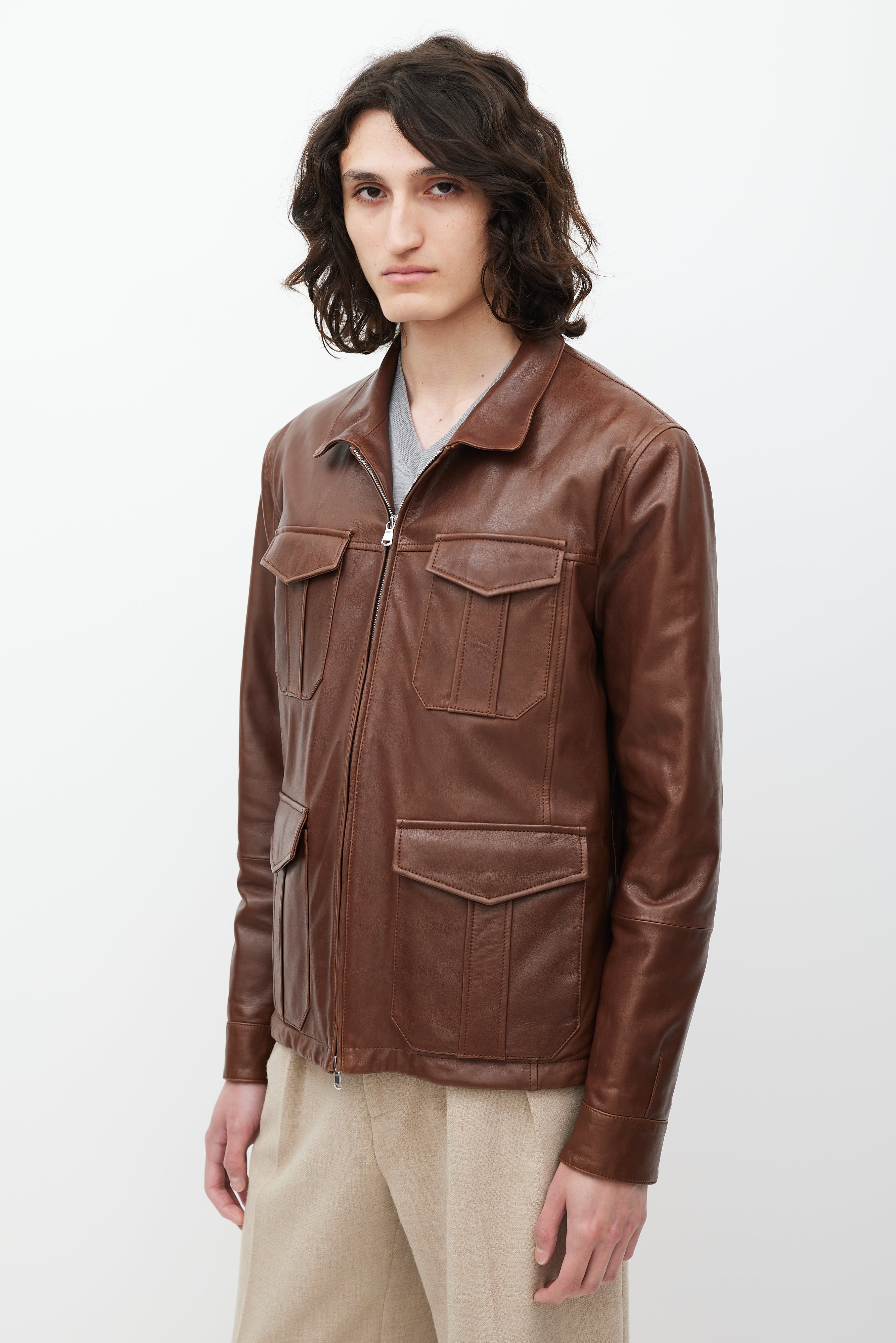 Pre-owned Brunello Cucinelli brown leather jacket featuring a collared neck, silver tone double zip front, four front cargo pockets, two interior zip pockets, and long sleeves. Lined and insulated.