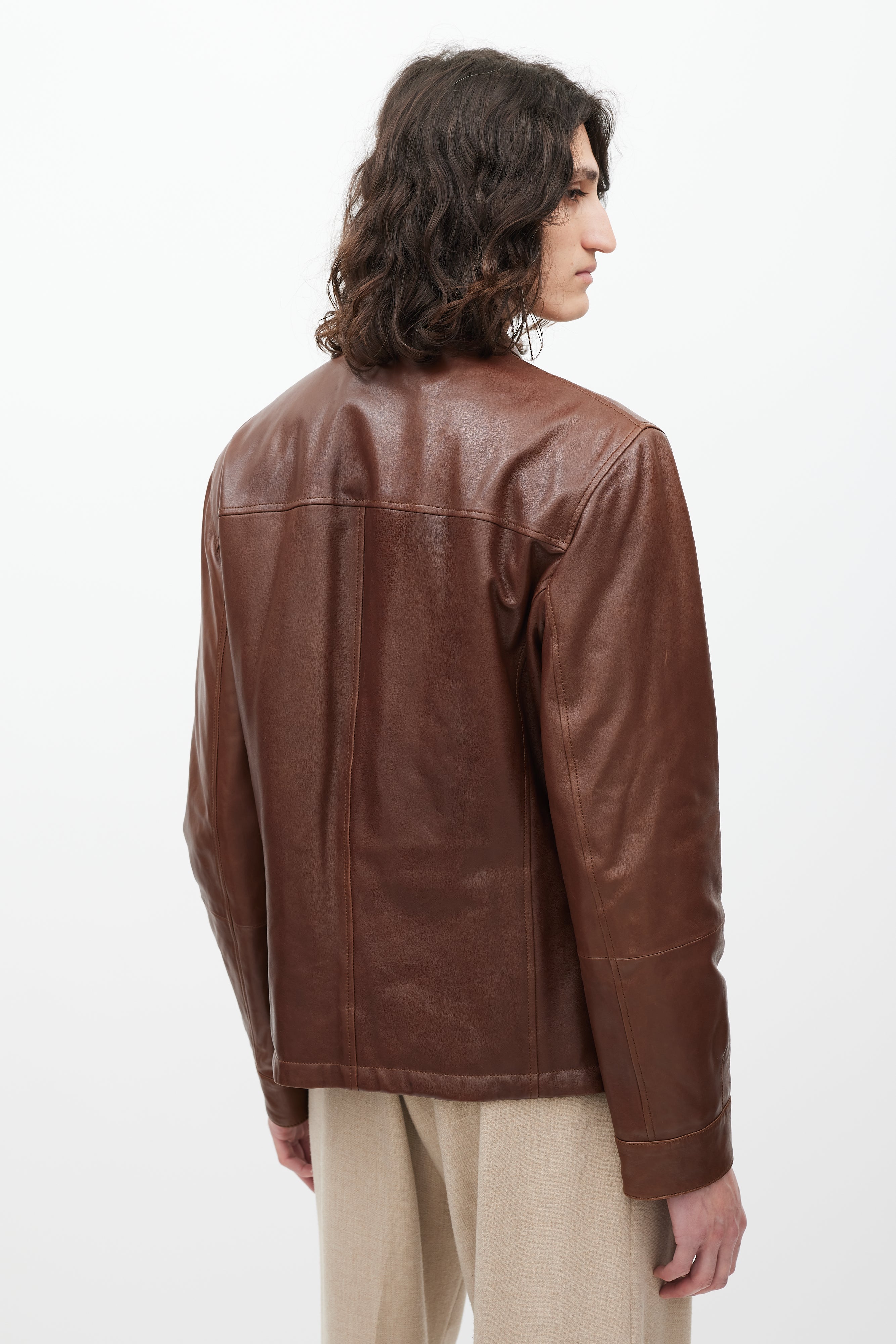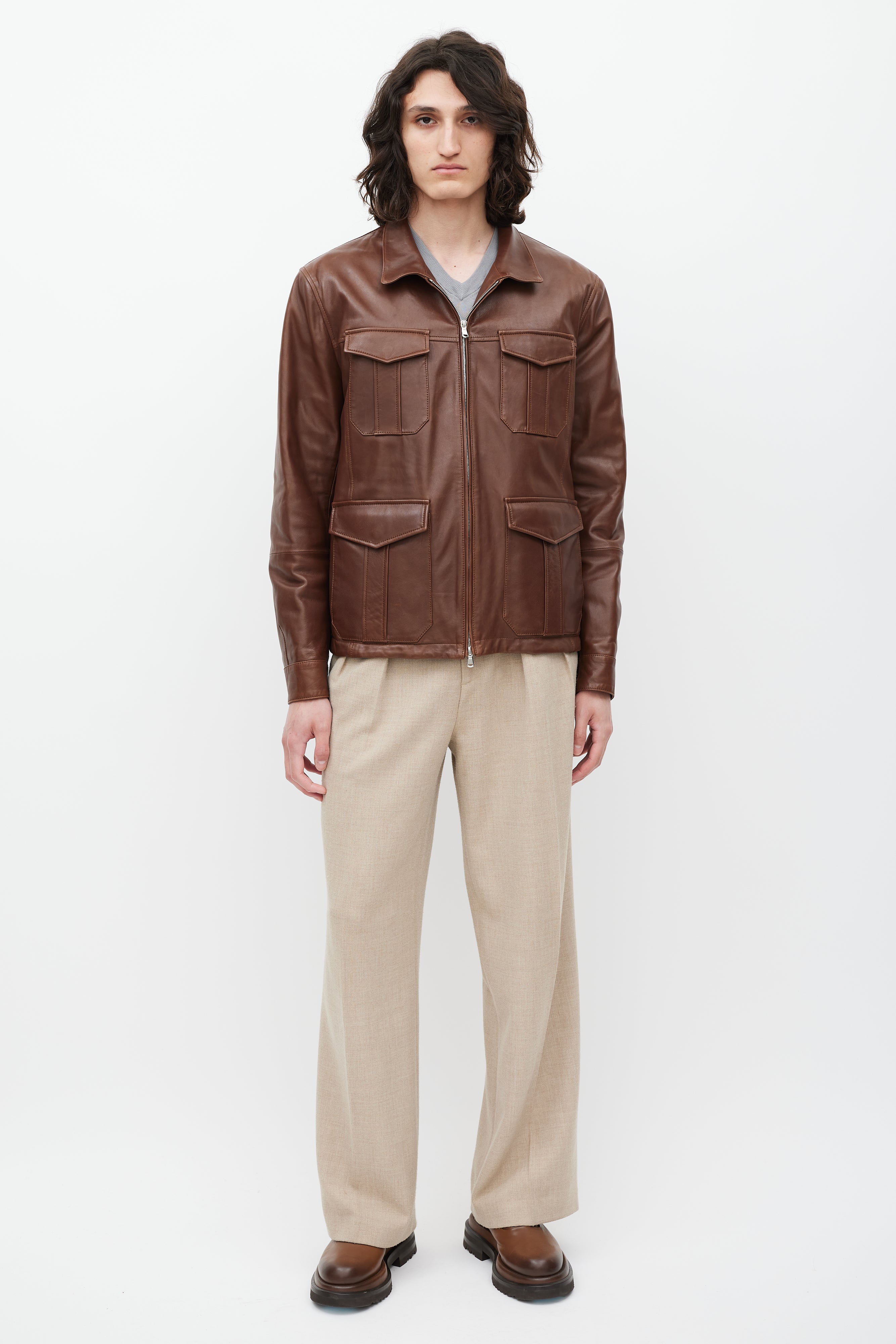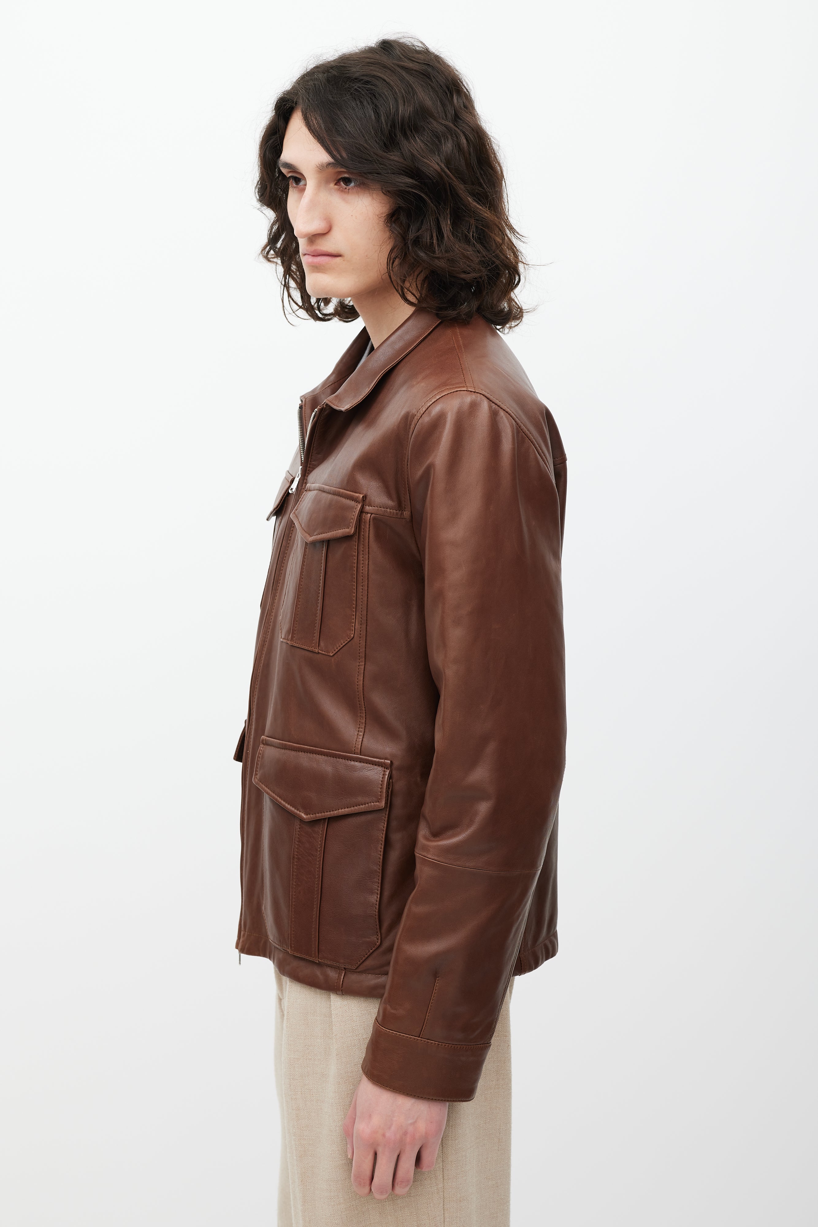 Pre-owned Brunello Cucinelli brown leather jacket featuring a collared neck, silver tone double zip front, four front cargo pockets, two interior zip pockets, and long sleeves. Lined and insulated.