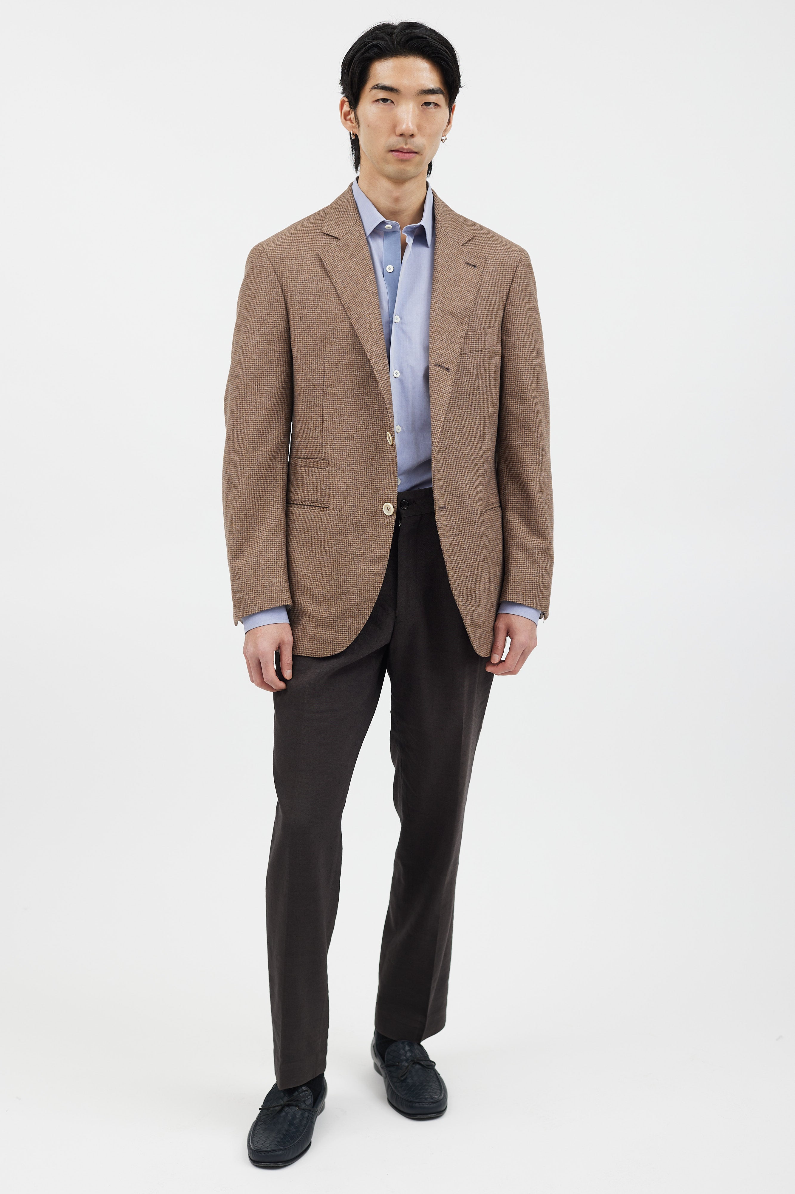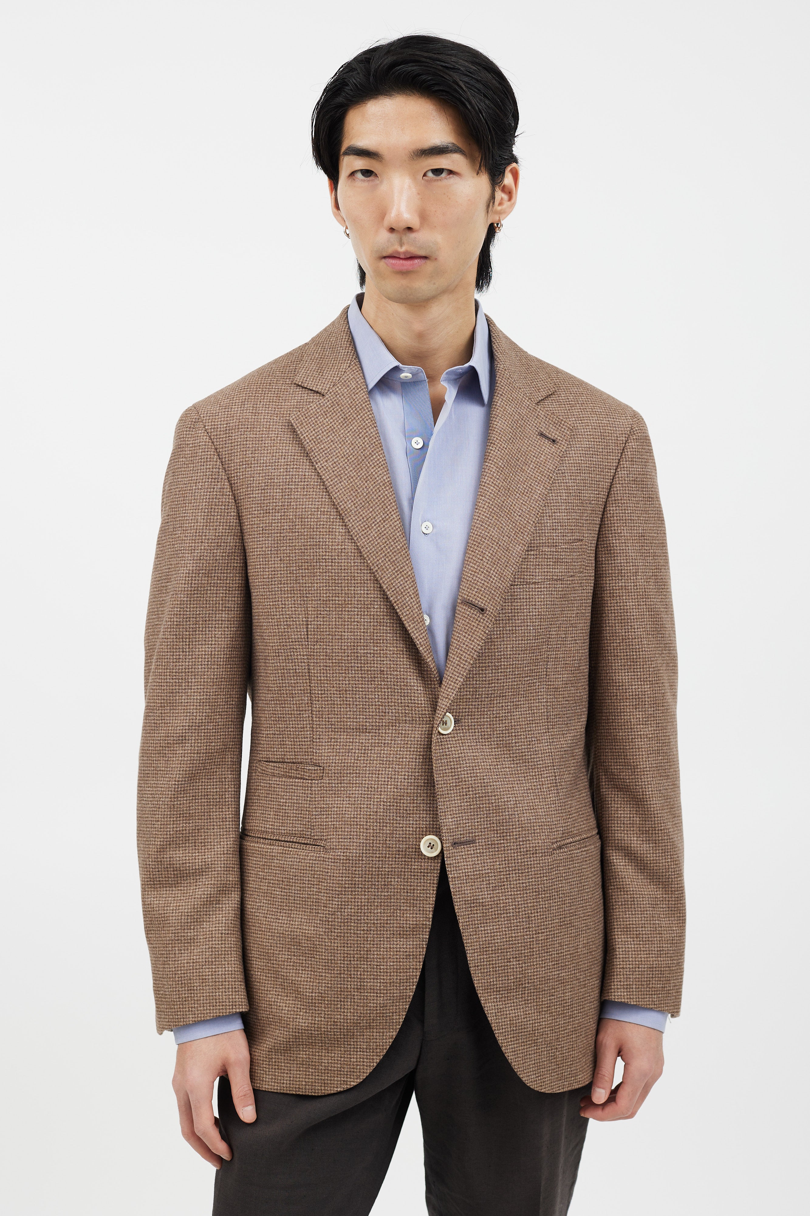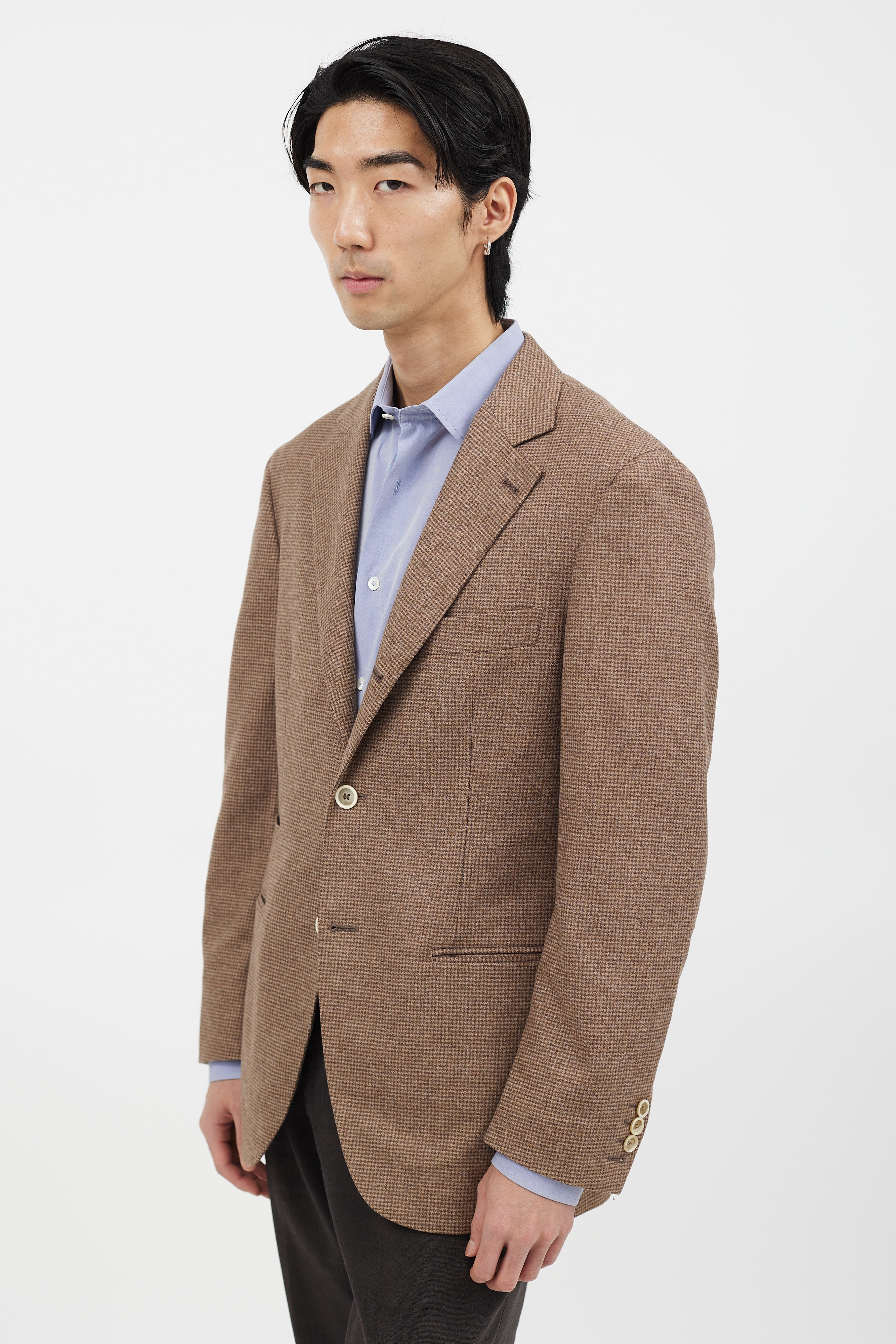 Pre-owned Brunello Cucinelli brown checkmark blazer featuring four slip pockets at front, button closure at waist, and buttoned cuff. Unlined.