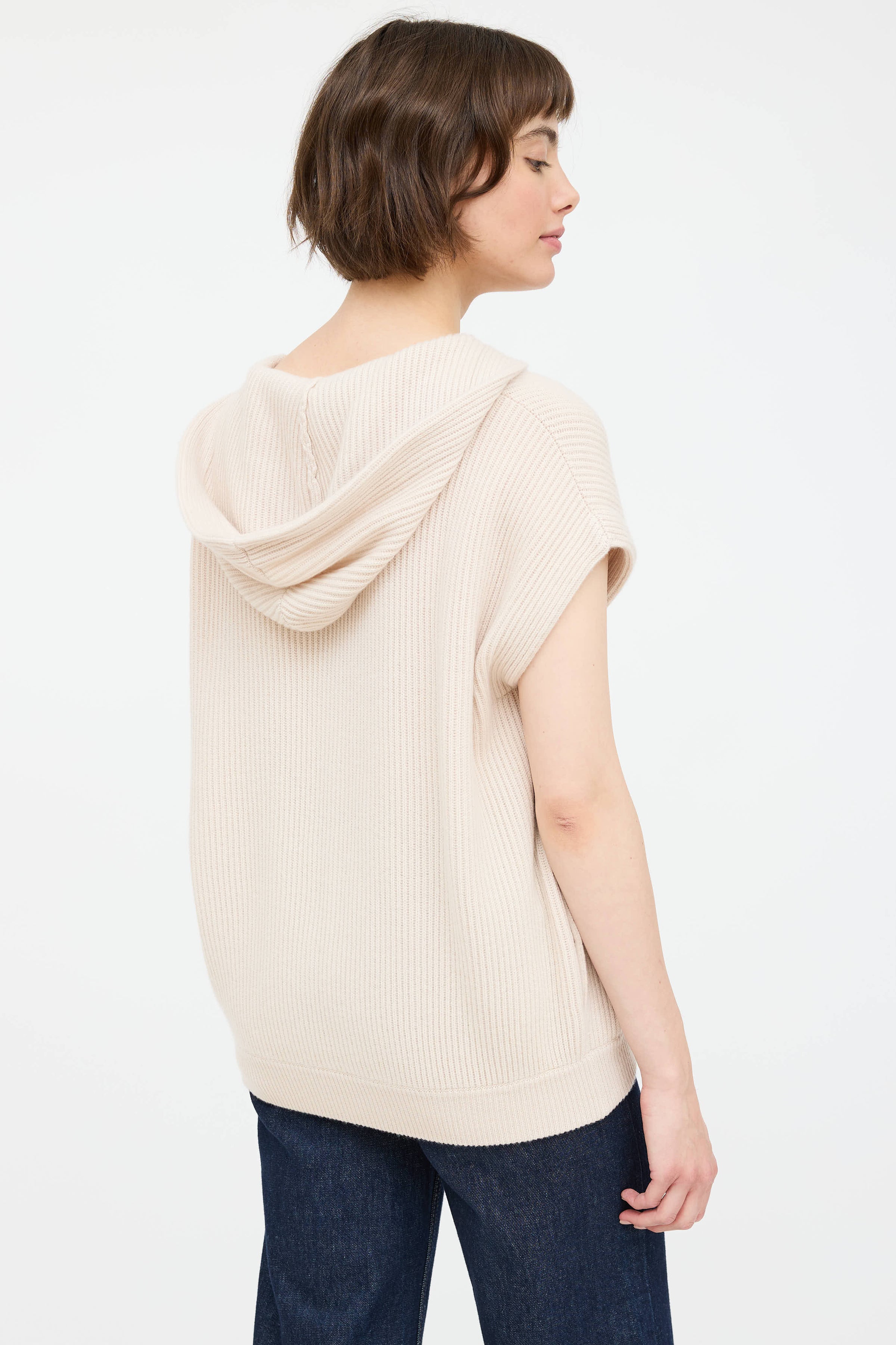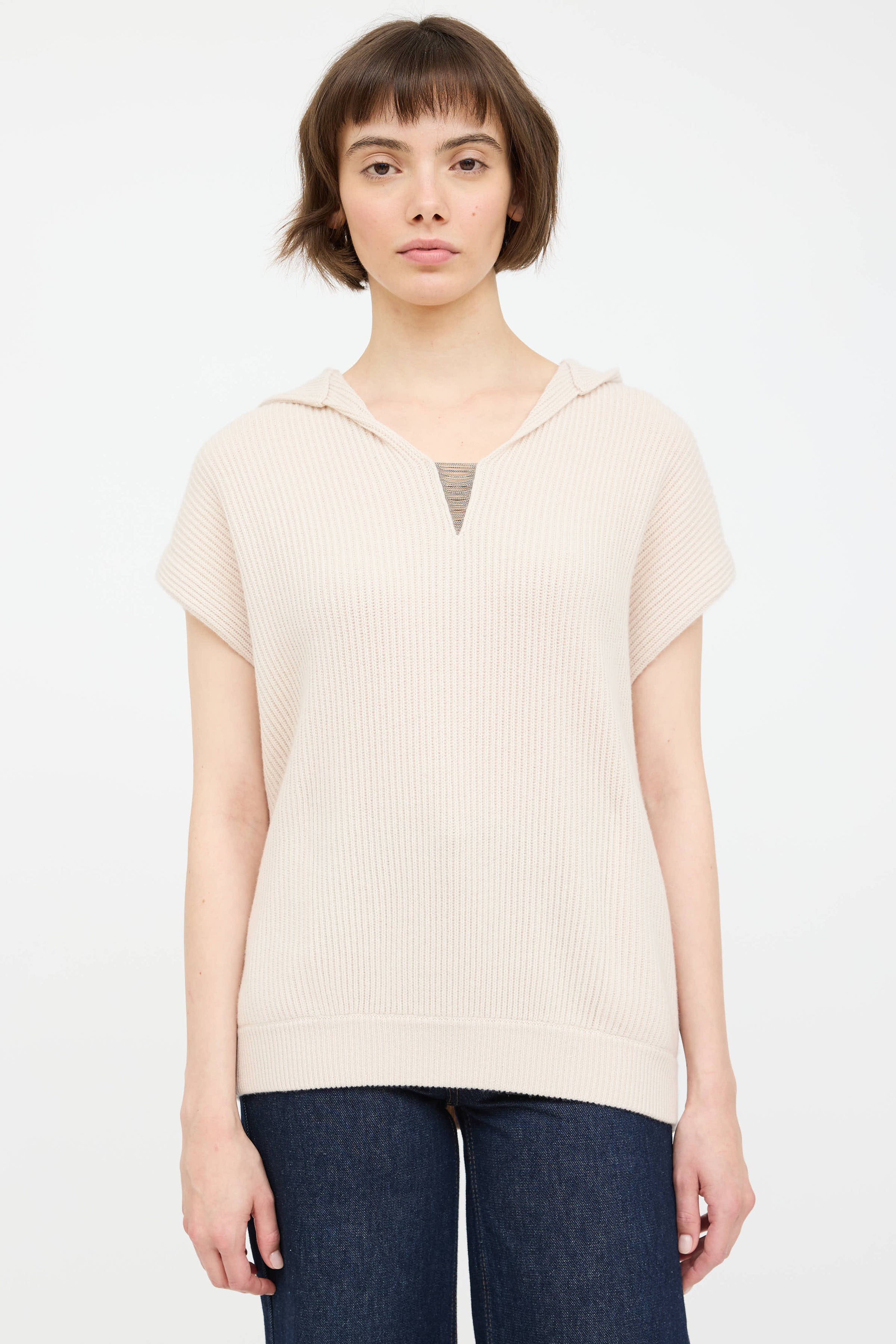 Pre-owned Brunello Cucinelli cream cashmere knit hoodie featuring an attached hood, V-neckline with monili bead trim, sleeveless styling, two slip pockets at hip, and ribbed detailing.