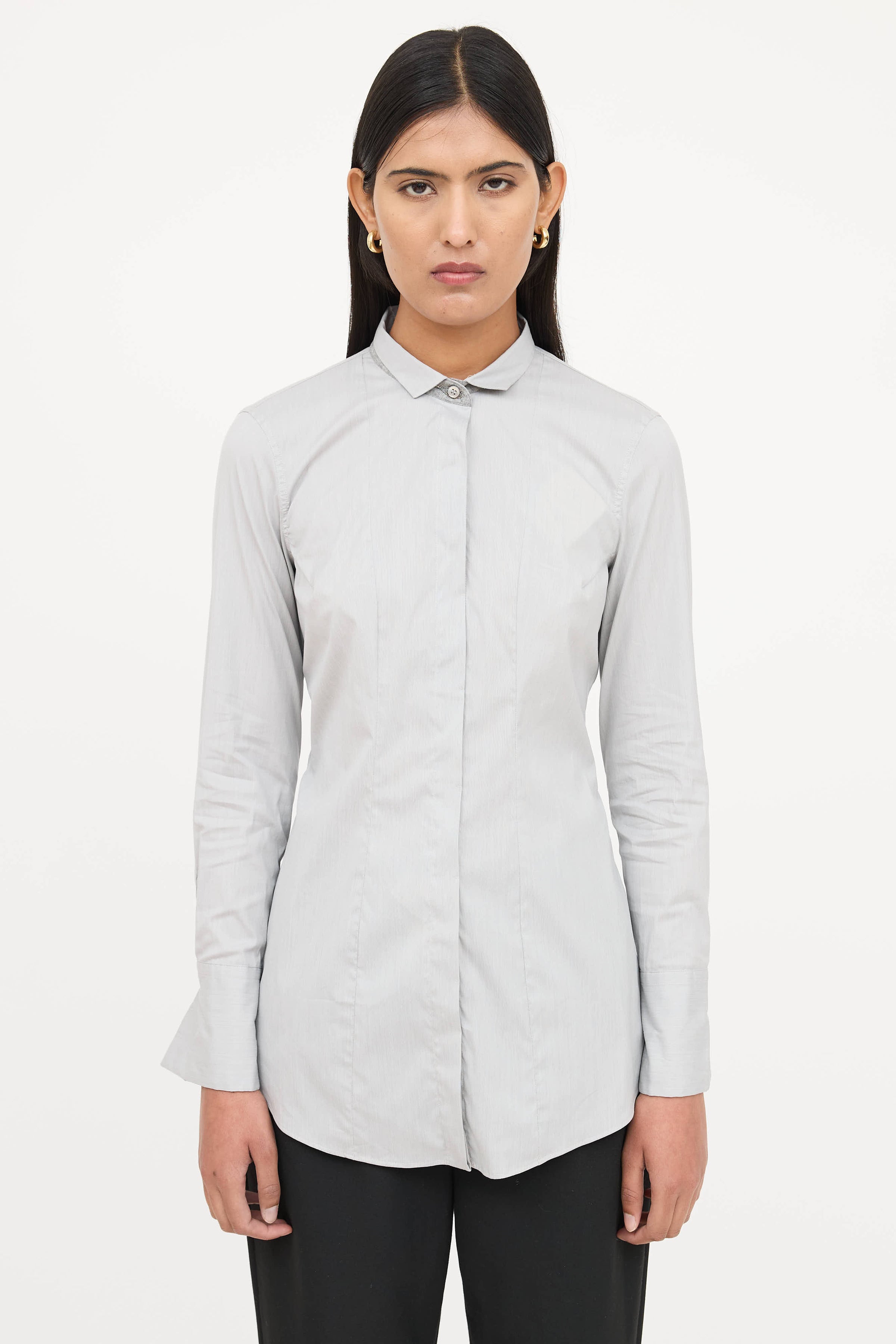 Pre-owned Brunello Cucinelli grey long sleeve shirt featuring pointed collar with Monili trim, button front, and buttoned cuffs.