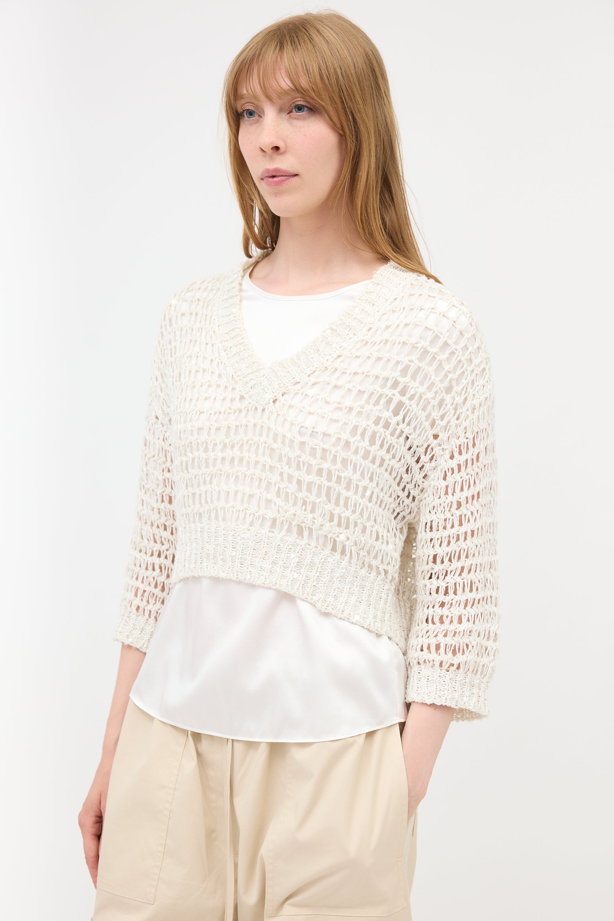 Pre-owned Brunello Cucinelli cream cropped open knit sweater featuring sequins throughout, ribbed V-neckline, dropped shoulder with three quarter length sleeves, and ribbed hem and cuffs.