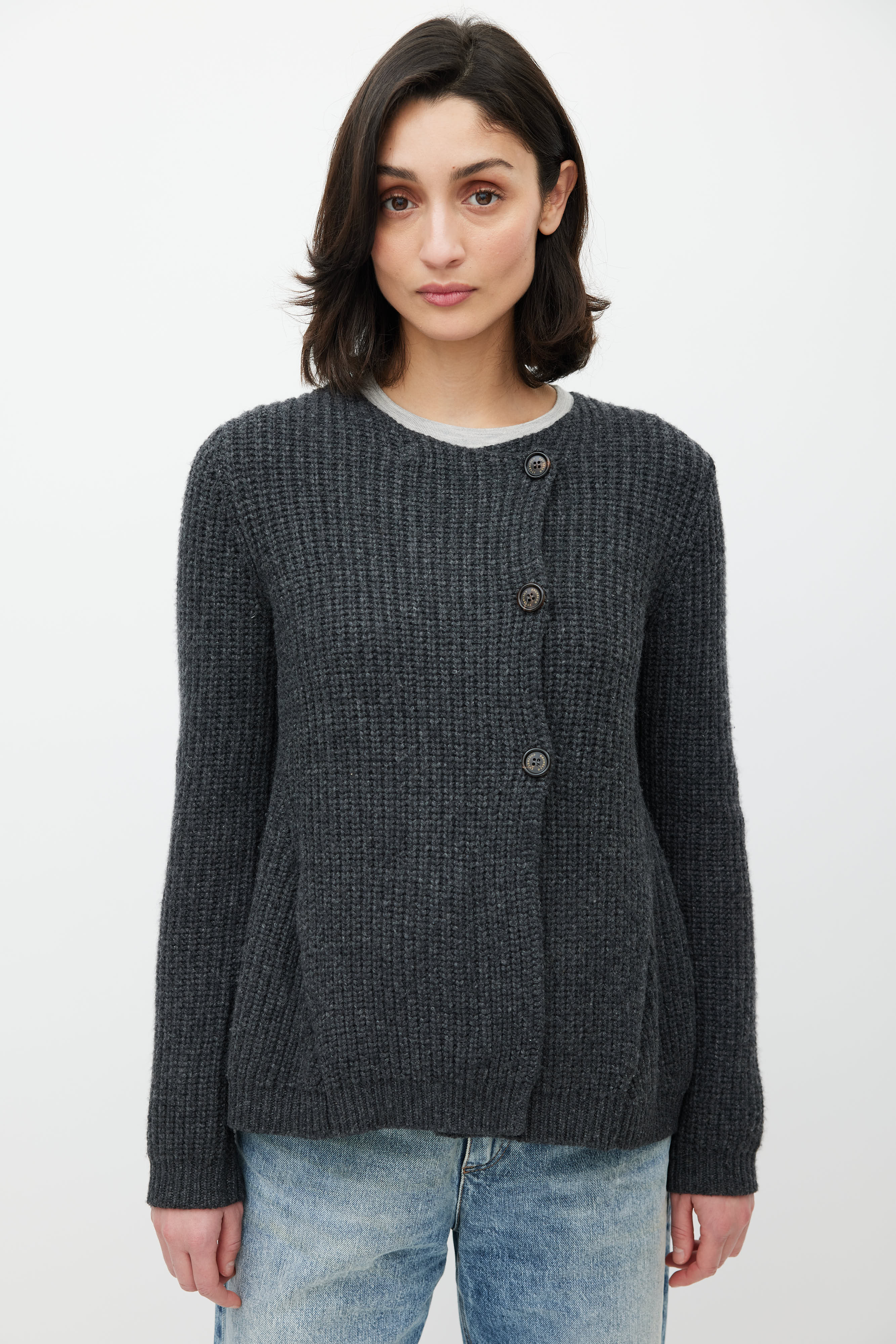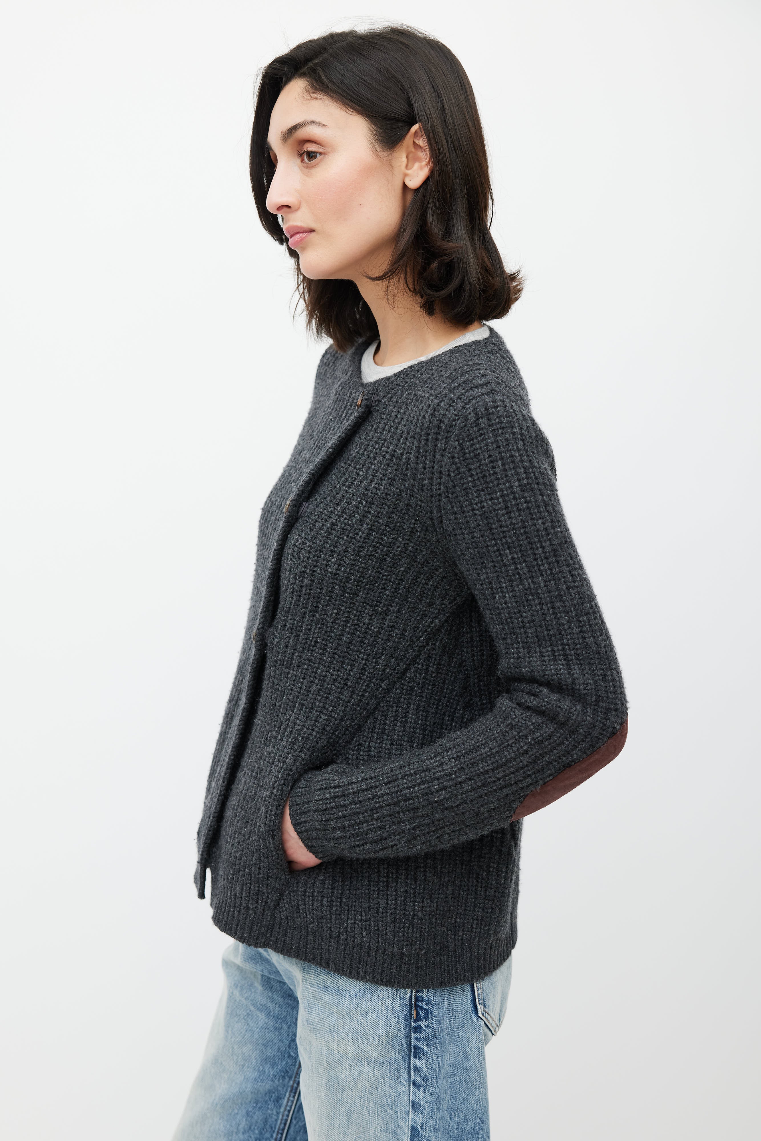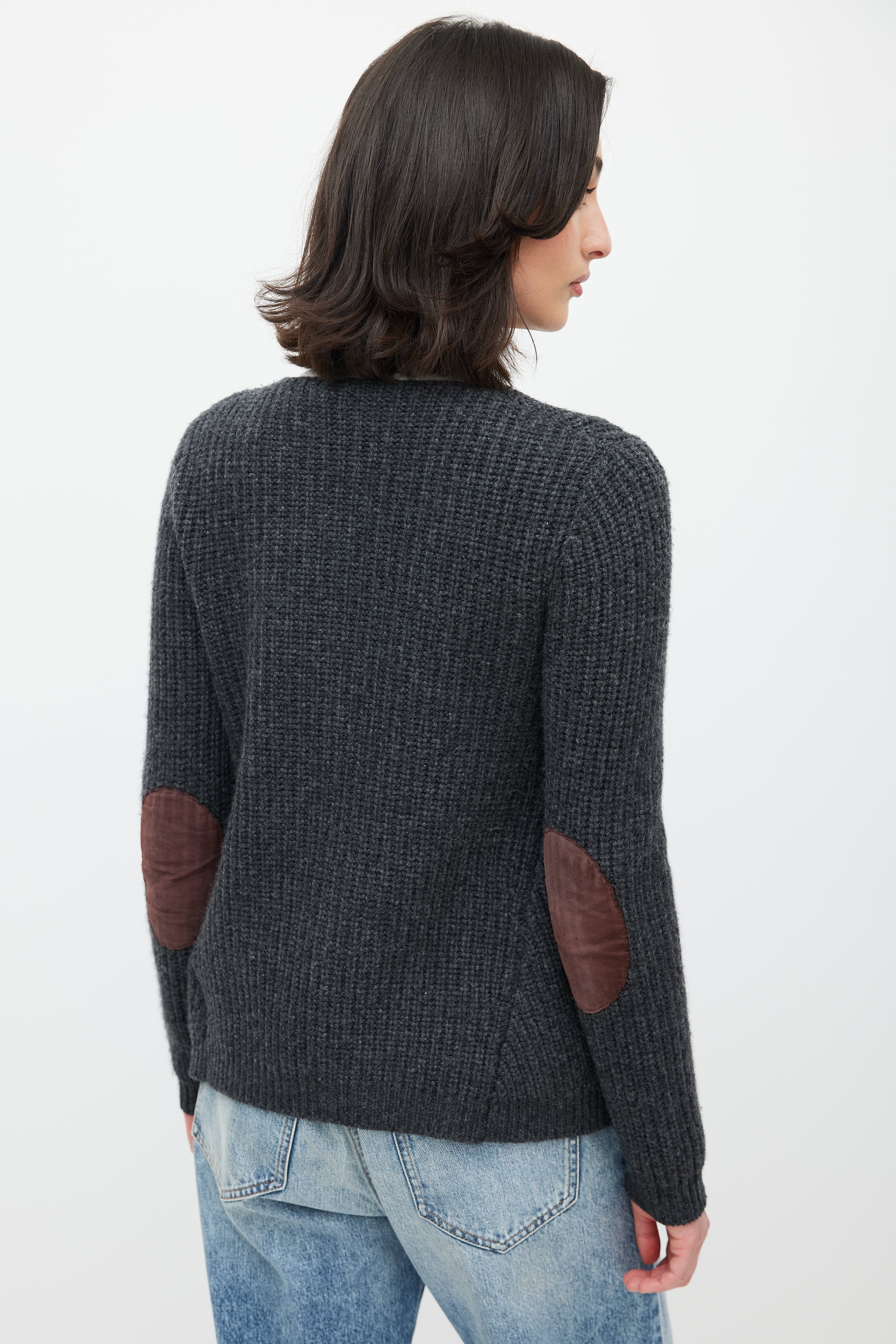 Pre-owned Brunello Cucinelli grey cashmere knit sweater featuring a round neckline, long sleeves with elbow patches, and wrap front button closure.