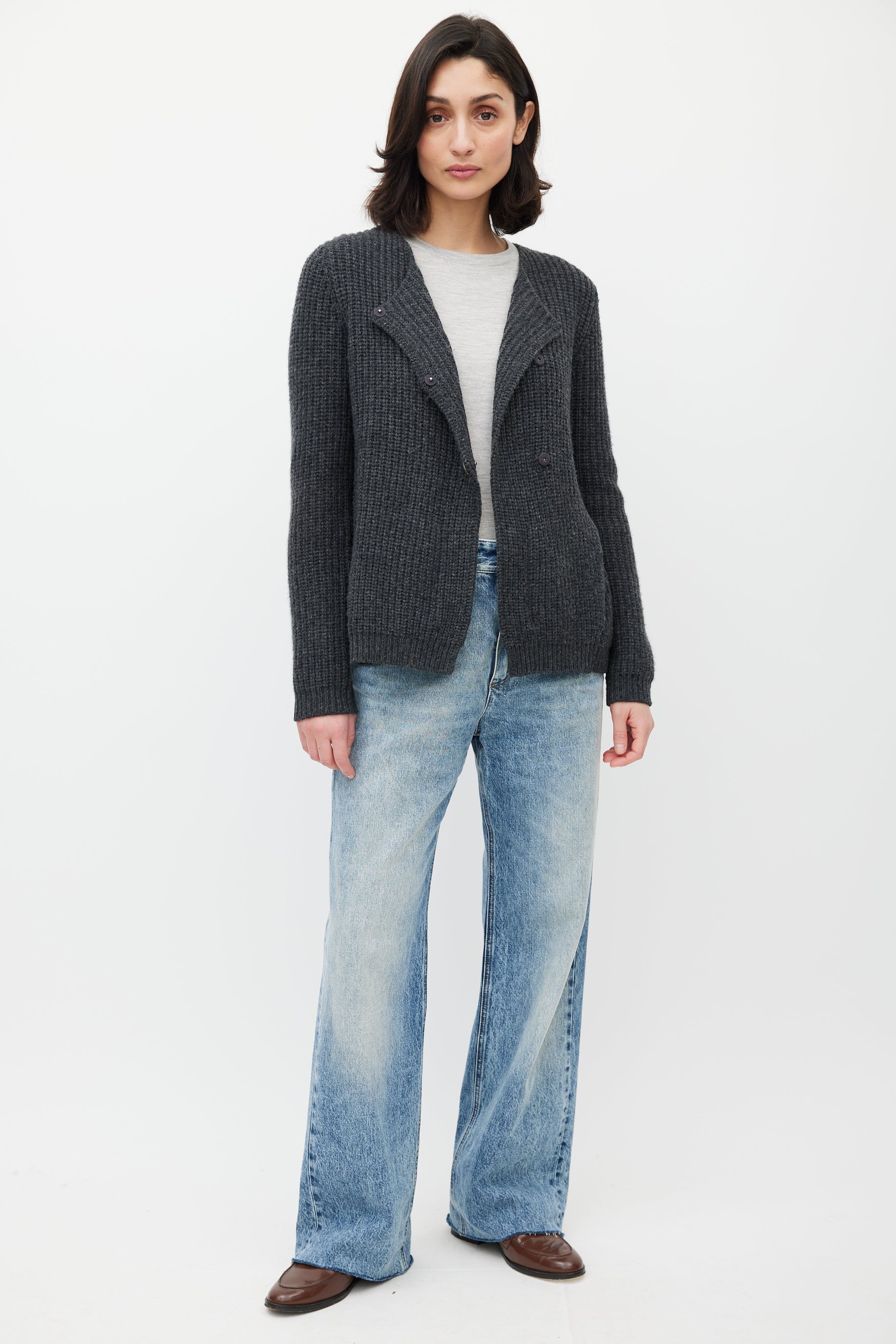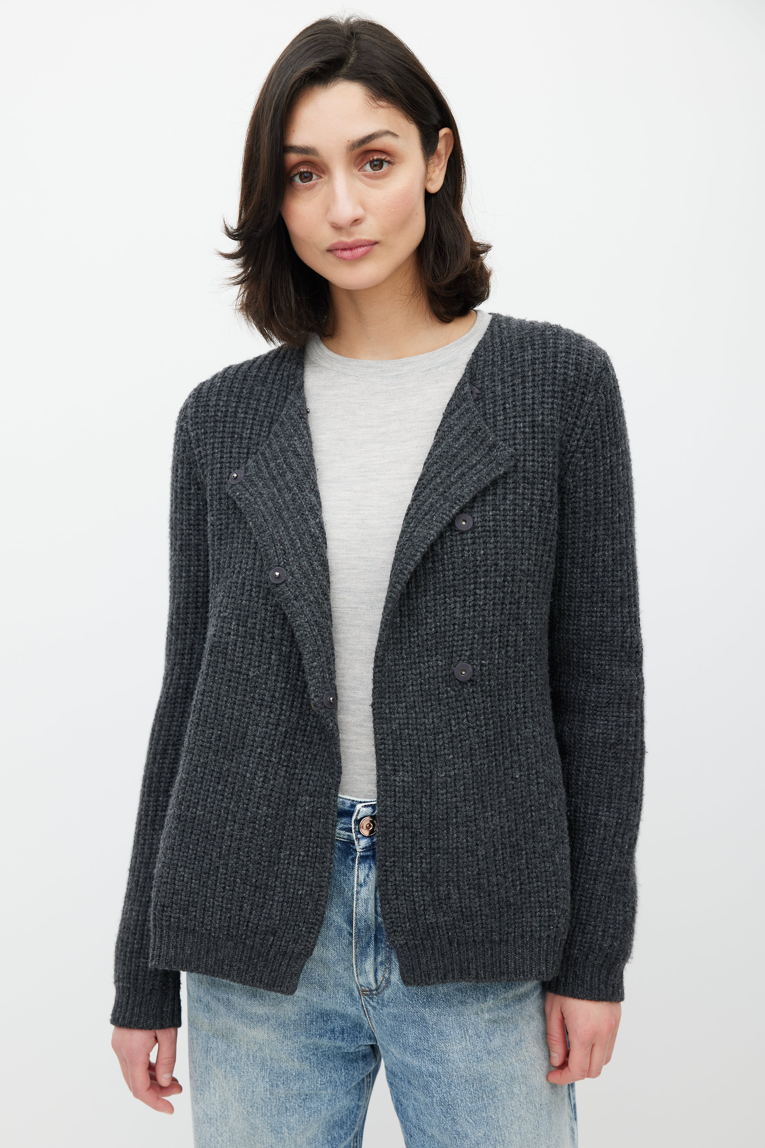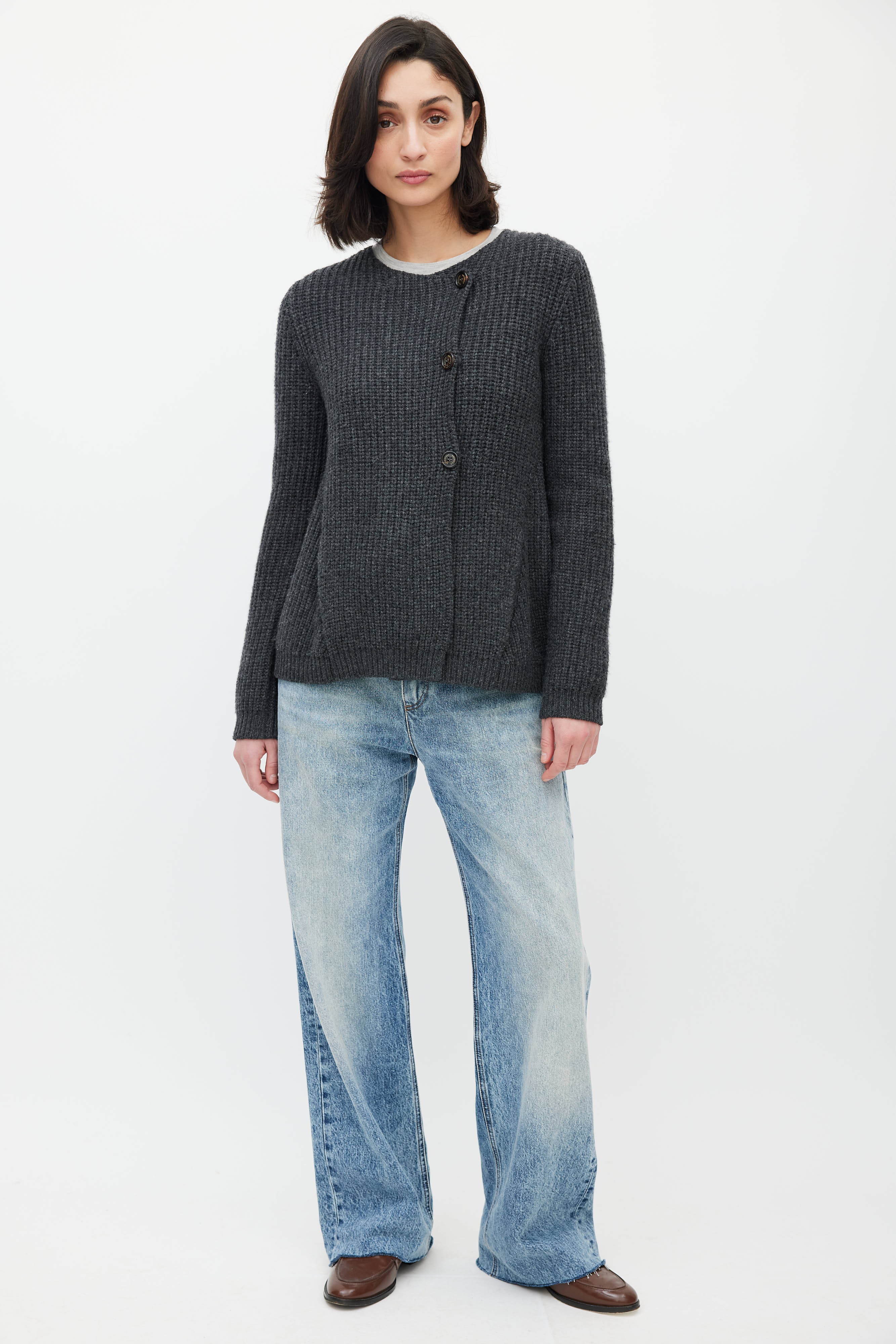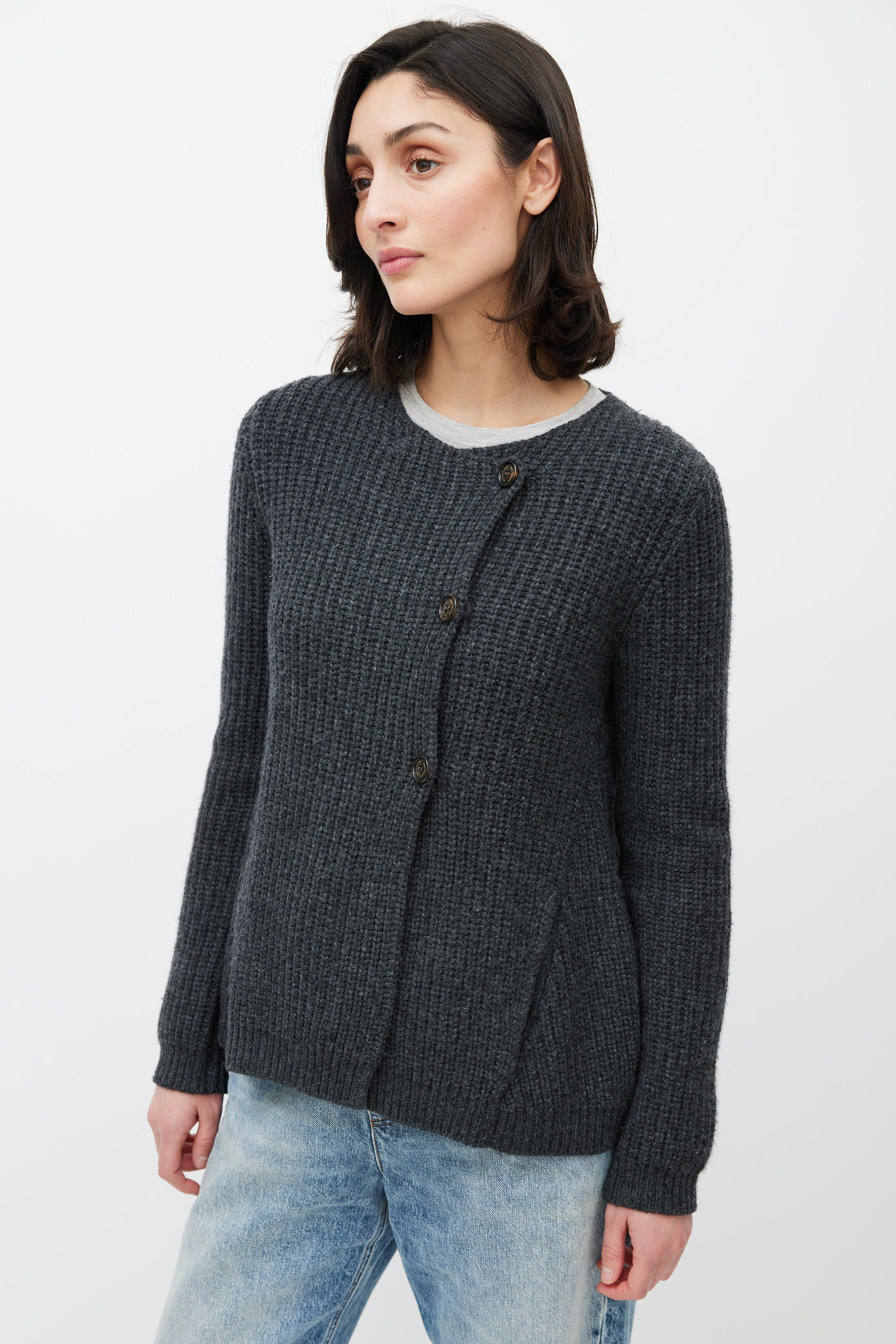 Pre-owned Brunello Cucinelli grey cashmere knit sweater featuring a round neckline, long sleeves with elbow patches, and wrap front button closure.