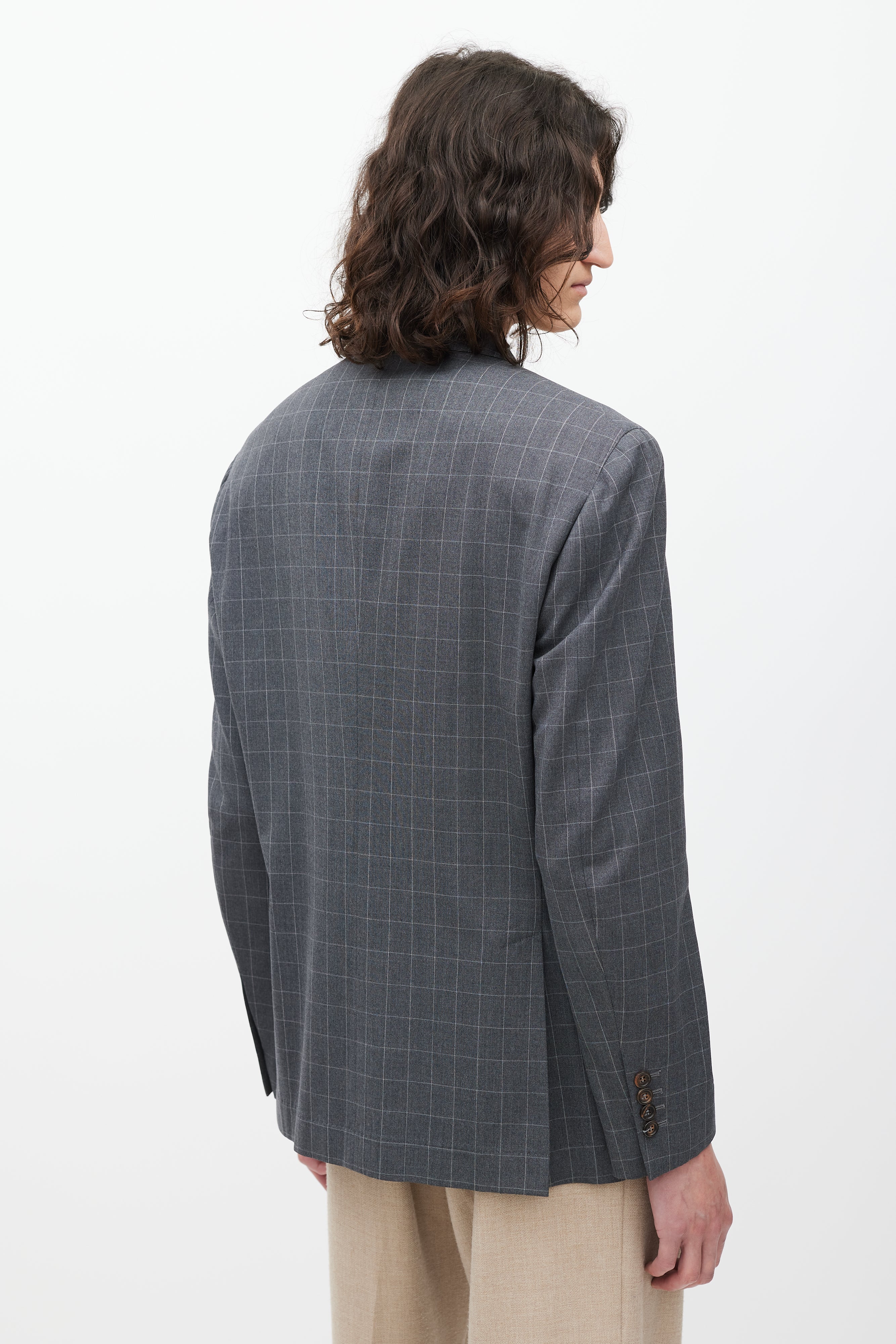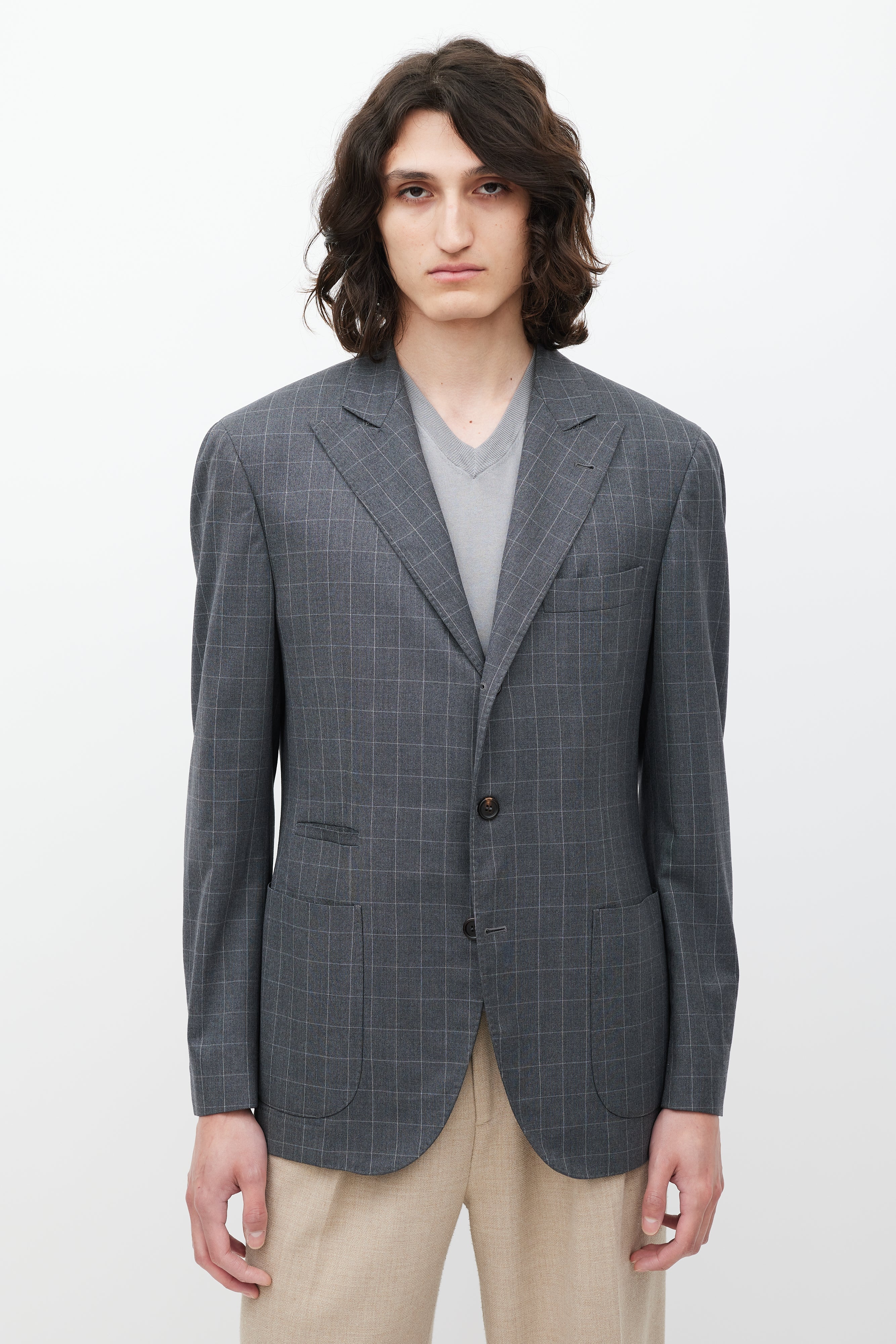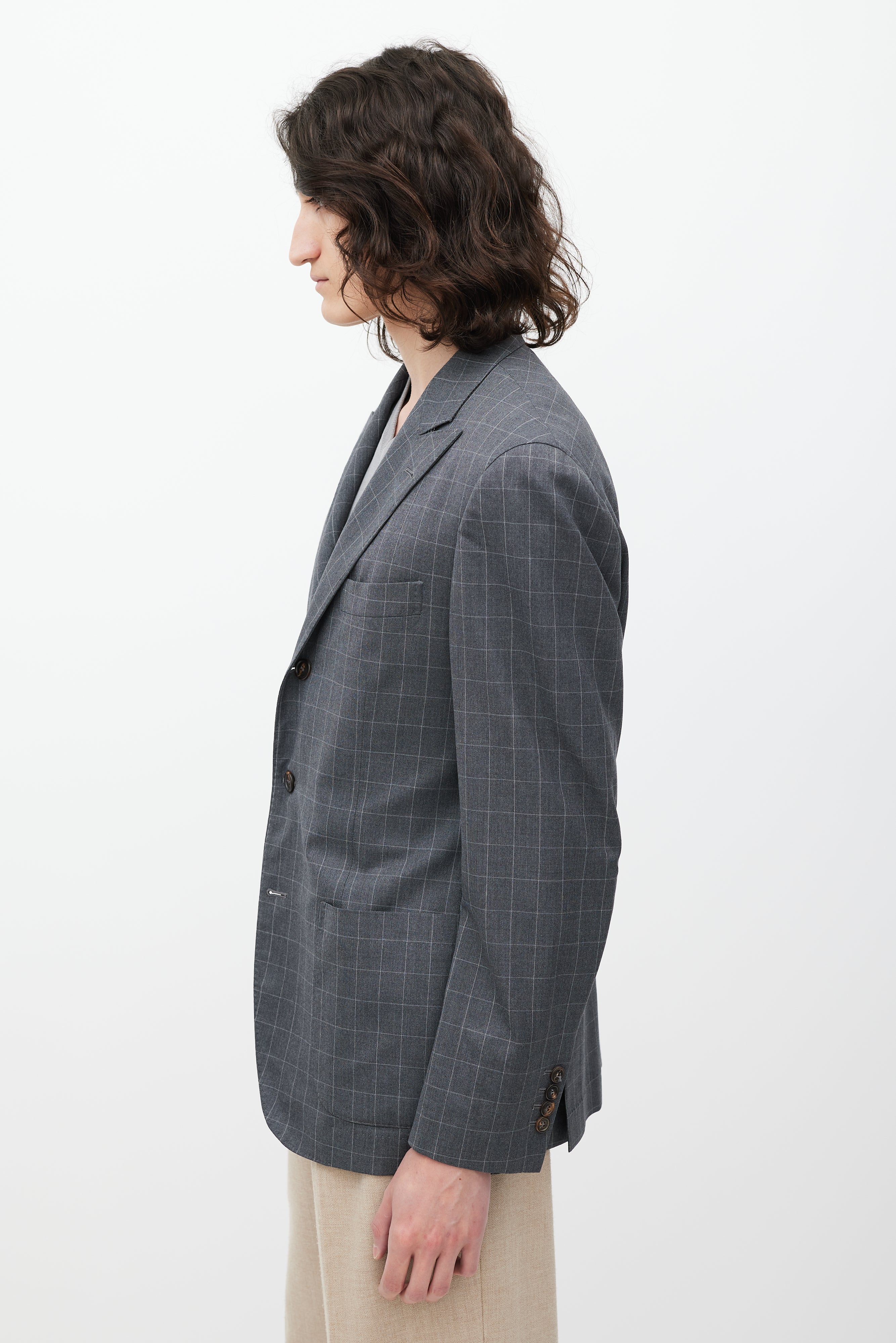 Pre-owned Brunello Cucinelli grey wool blend blazer featuring a grid pattern throughout, peak lapel, padded shoulders, button front, slip pockets at left chest and right waist, two front patch pockets, long sleeves with buttoned cuffs, and back double vent. Partially lined.