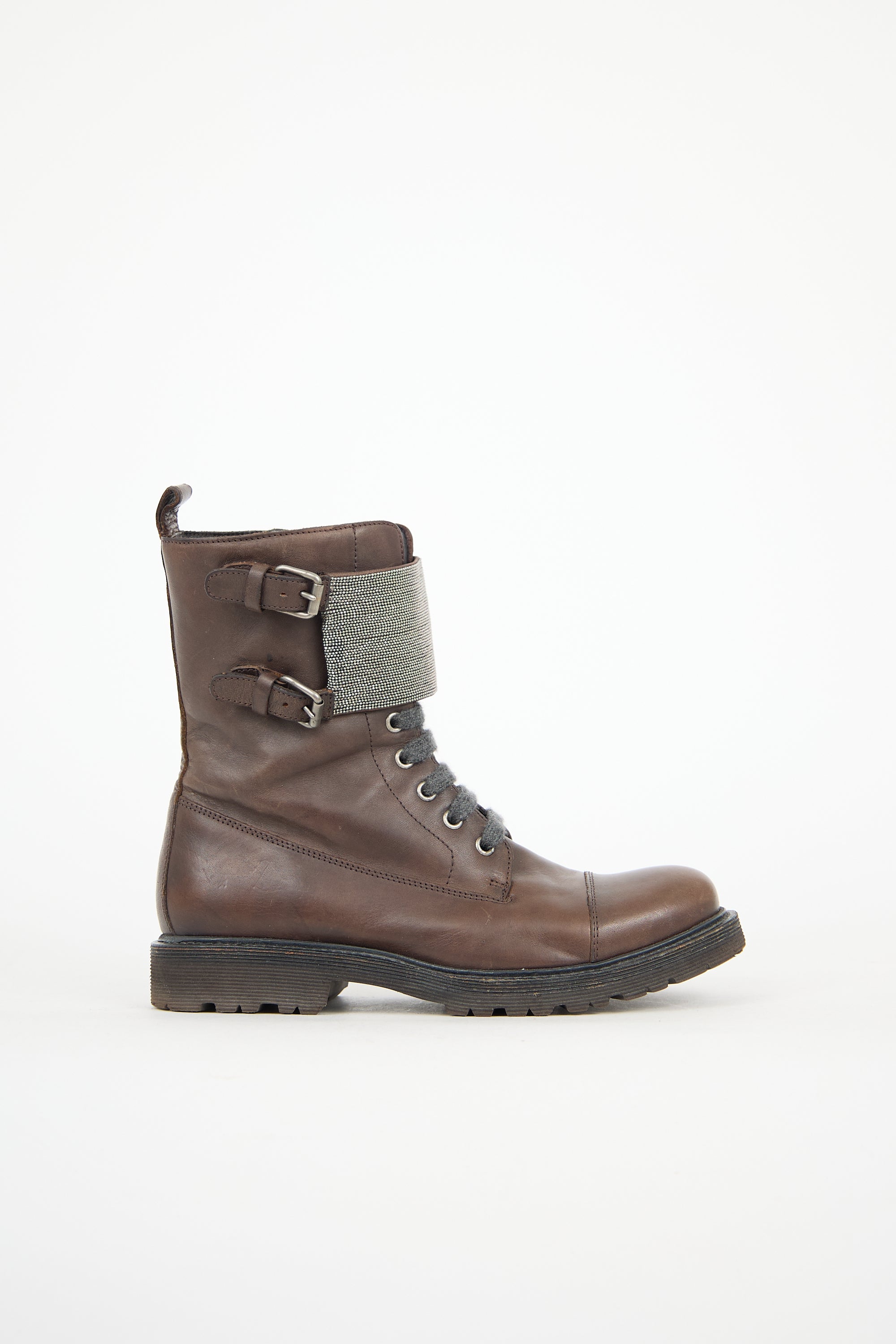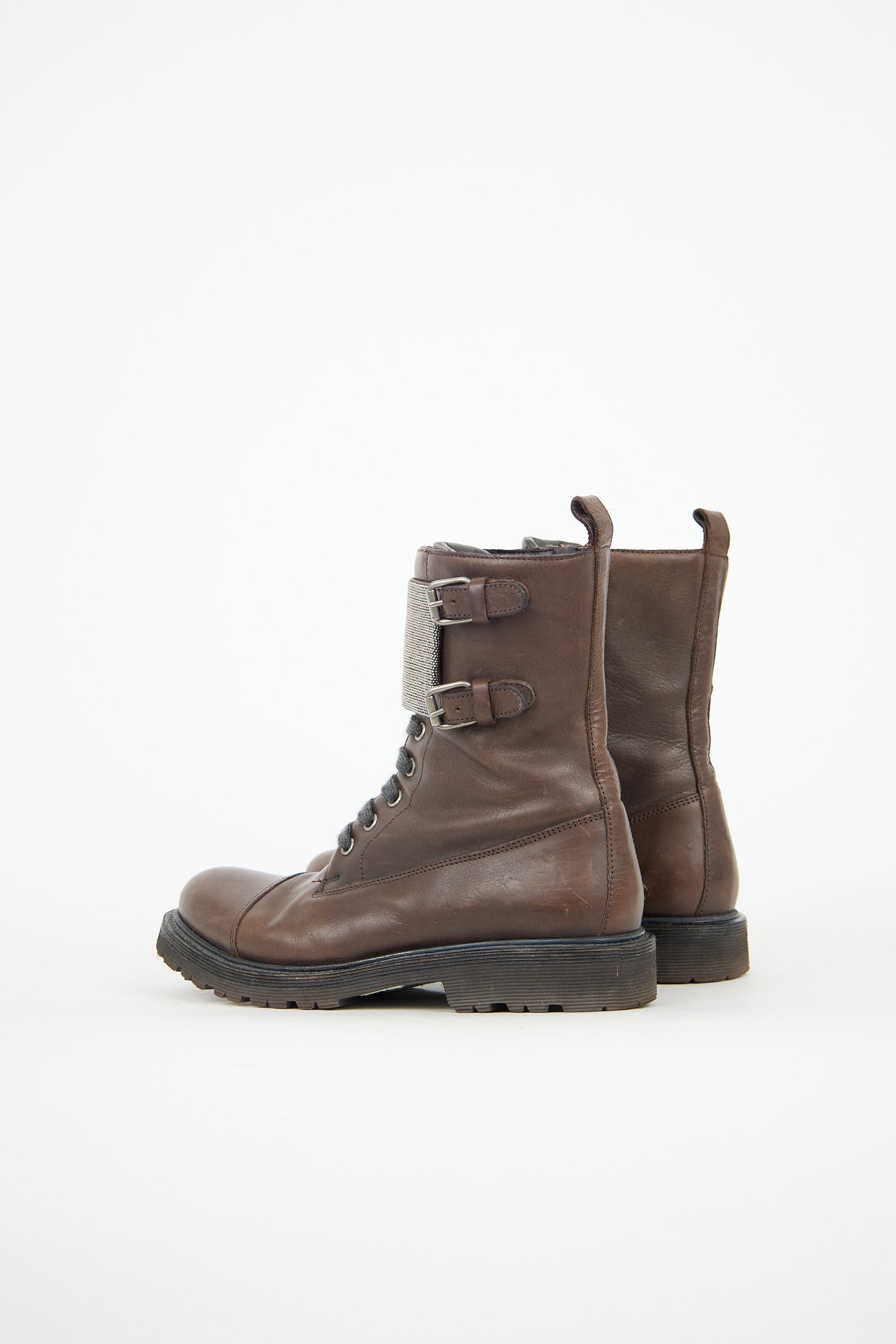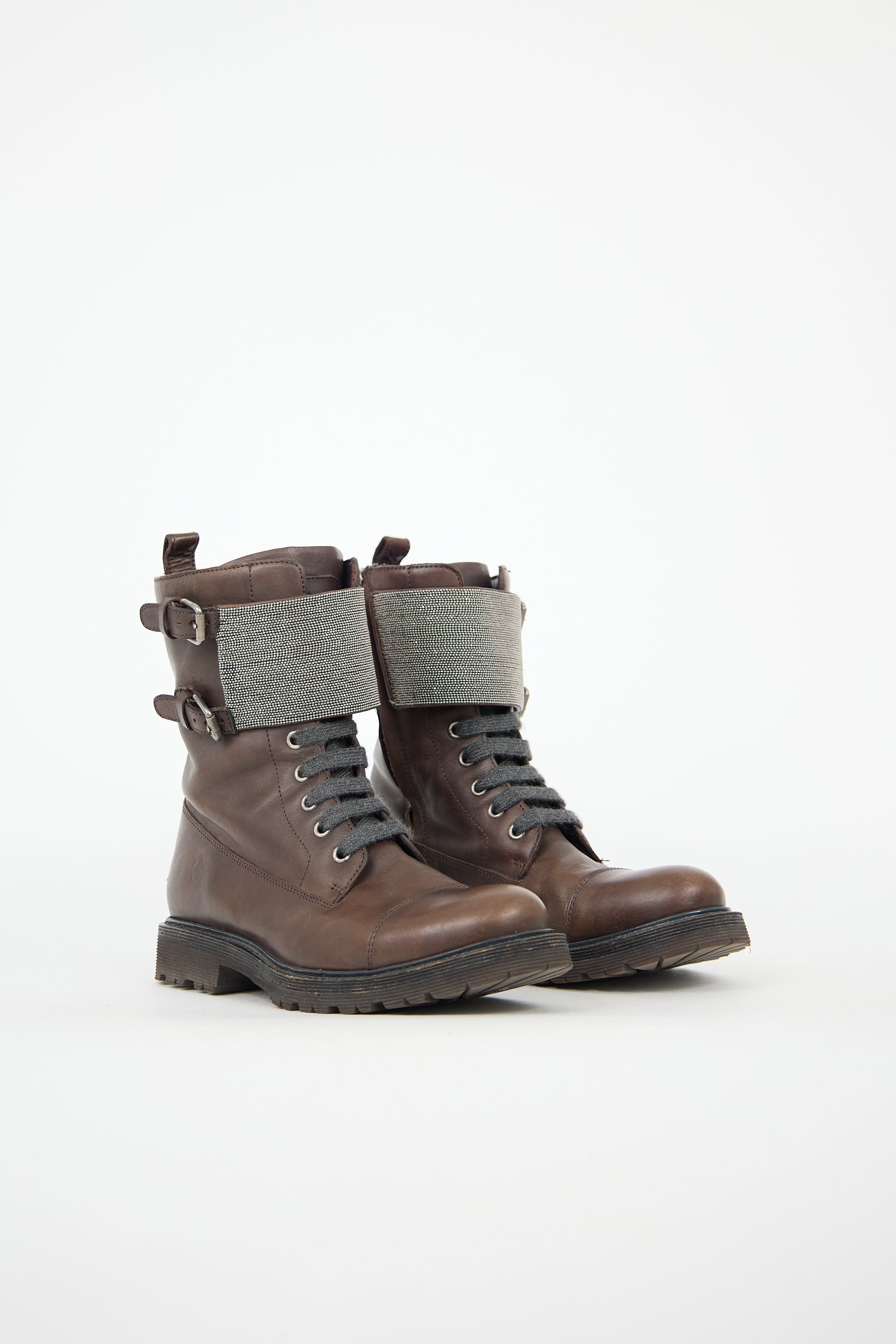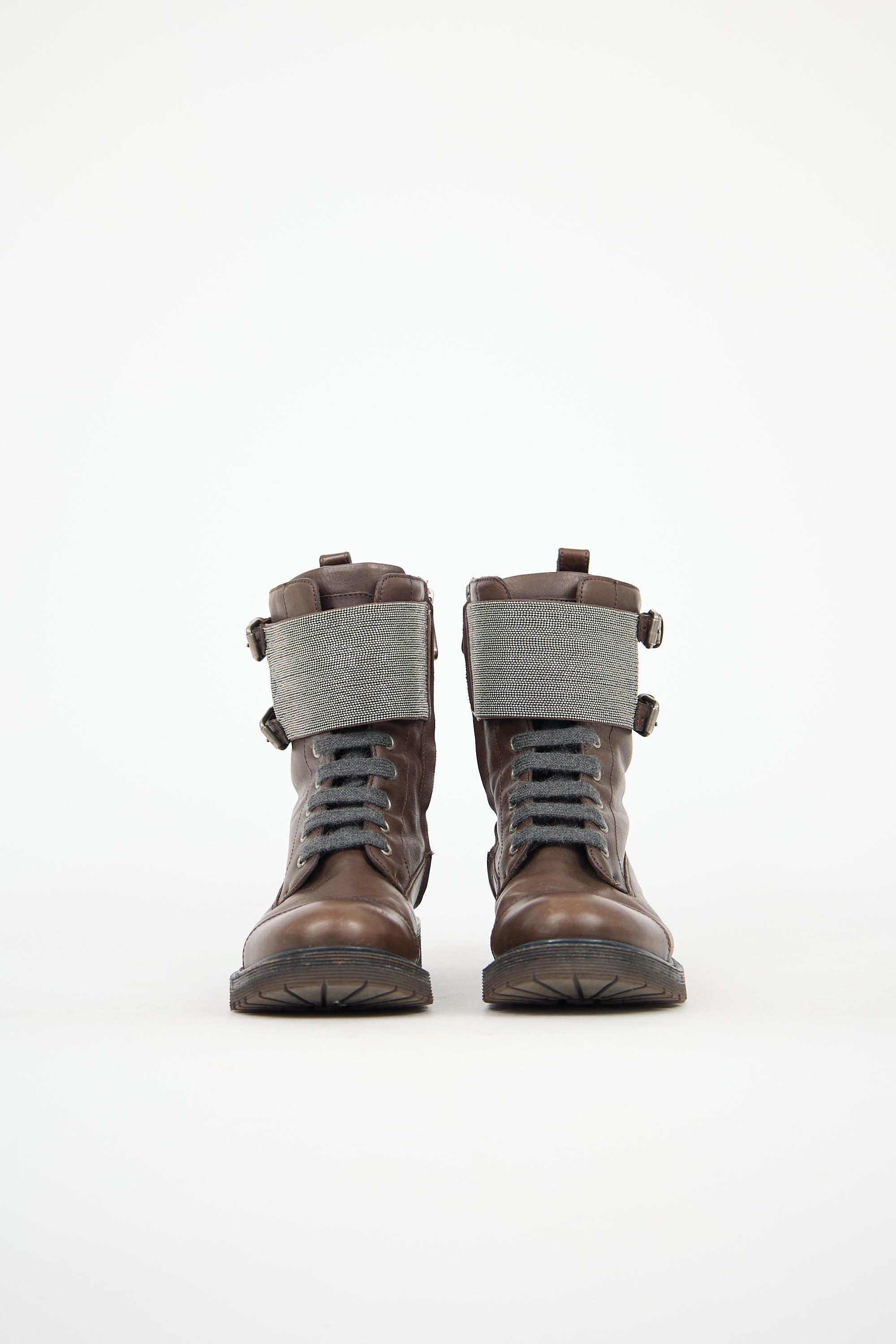 Pre-owned Brunello Cucinelli brown leather combat boots featuring a rounded toe, lace up front, signature Monili beaded adjustable strap at collar, side zip, and textured rubber sole. Comes with original dust bag.