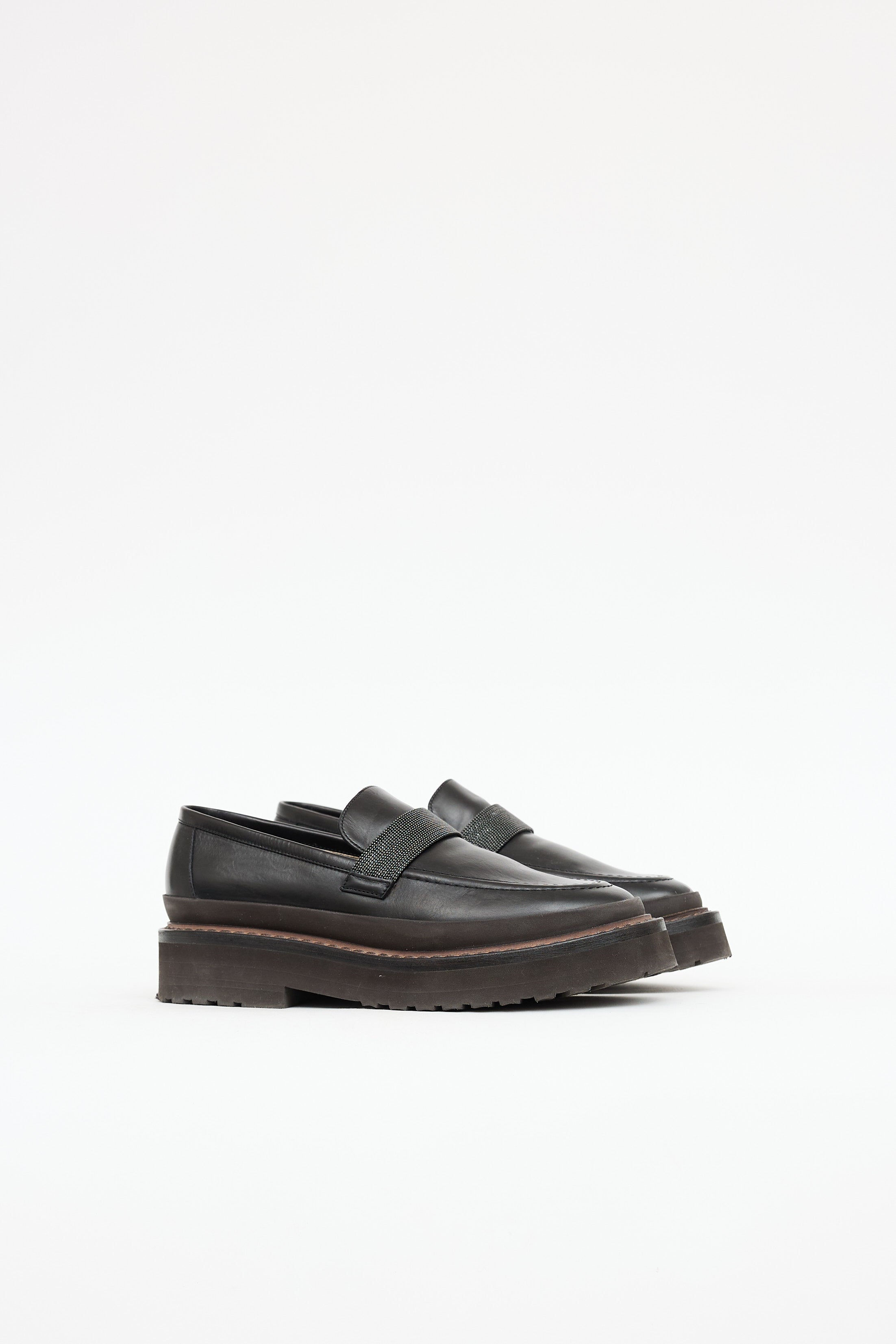 Pre-owned Brunello Cucinelli brown leather loafer featuring rounded toe, platform midsole, and monili trim at vamp.