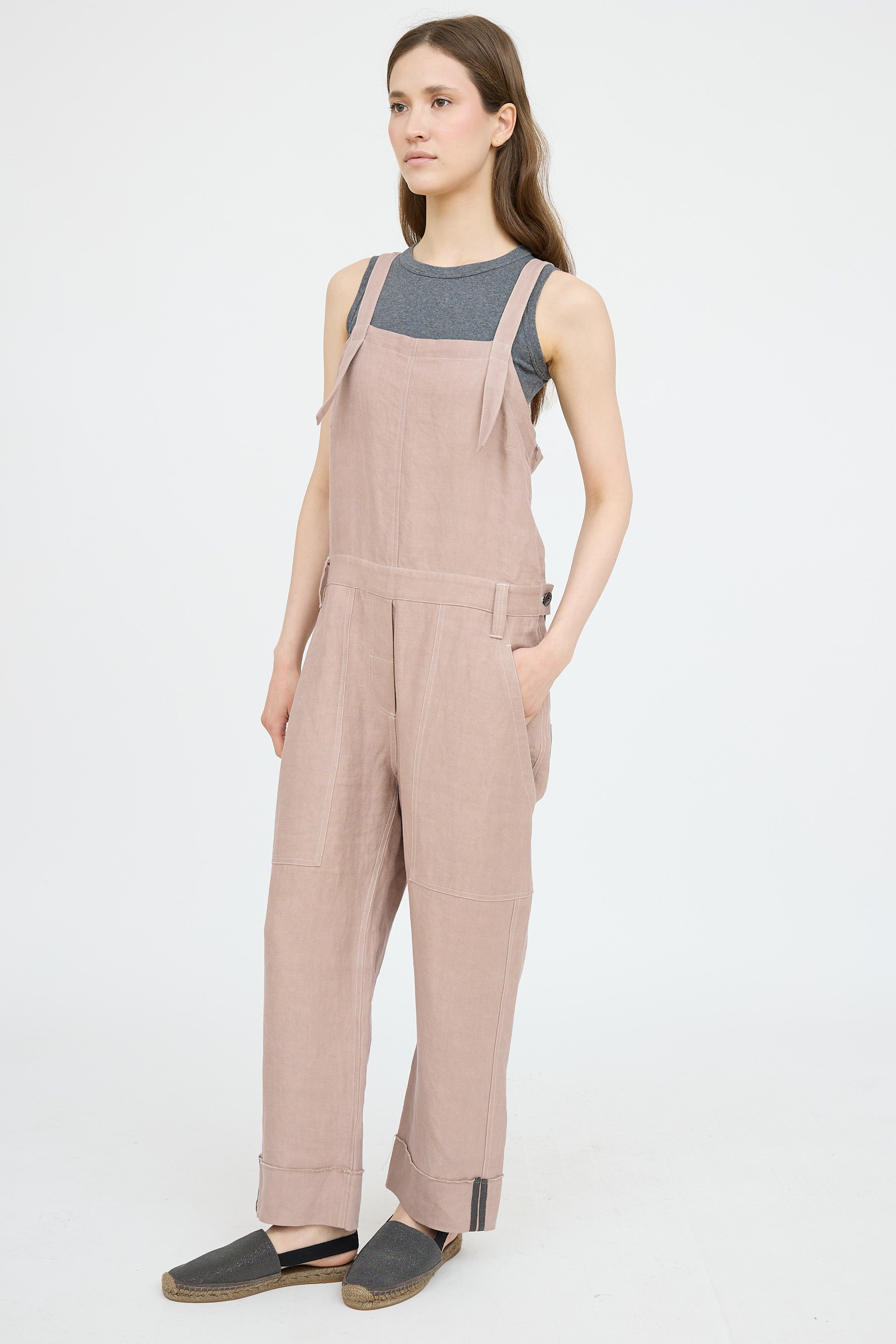 Pre-owned Brunello Cucinelli pink linen overalls featuring adjustable shoulder straps, belt loops, concealed zip at side with button closure, slit pockets at hip, patch pockets at back, and Monili trim at hem.