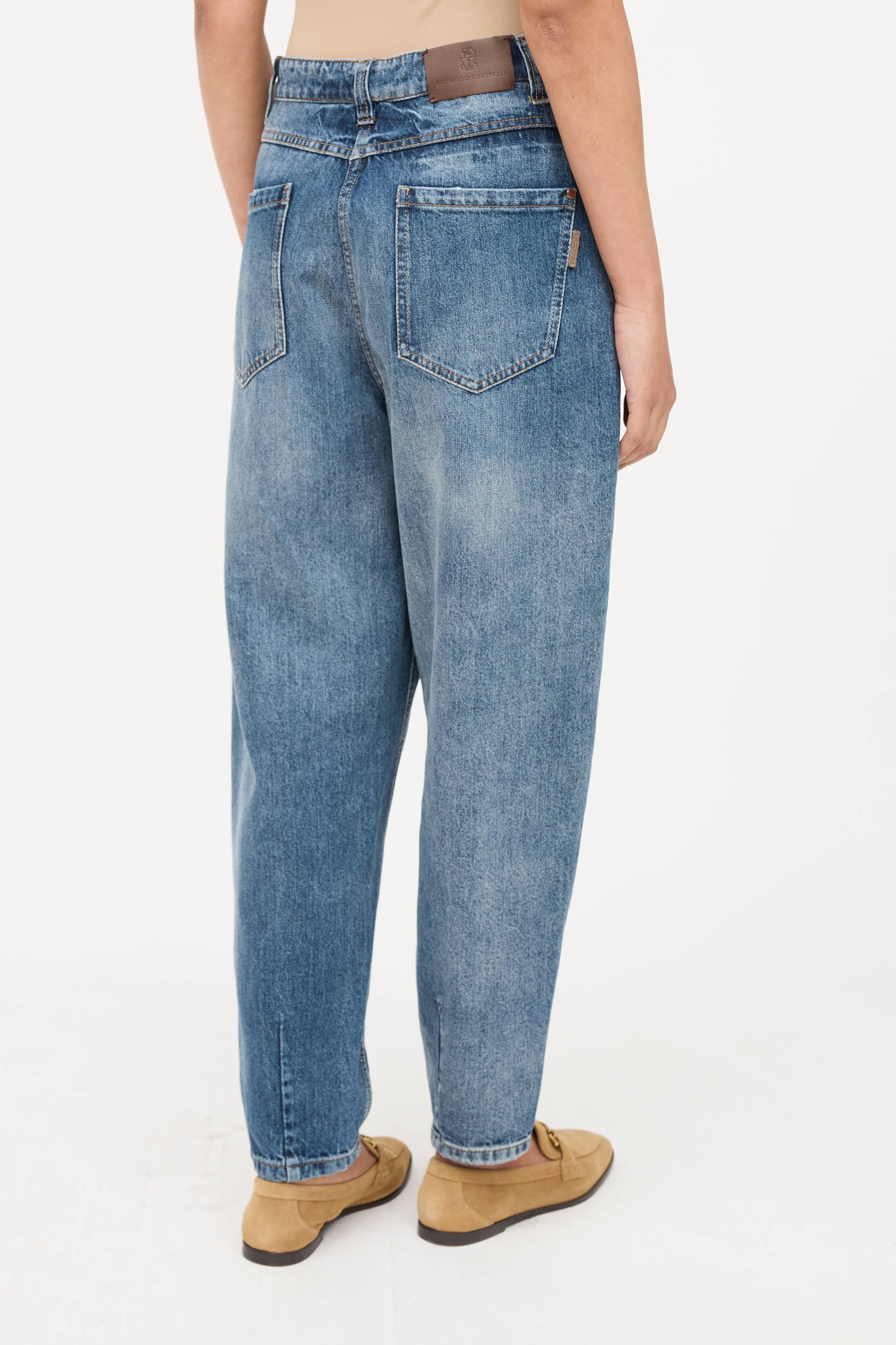 Pre-owned Brunello Cucinelli medium wash barrel jeans featuring tapered leg, belt loops, zip fly, five pocket styling, leather logo patch at back, and Monili tab at back pocket.