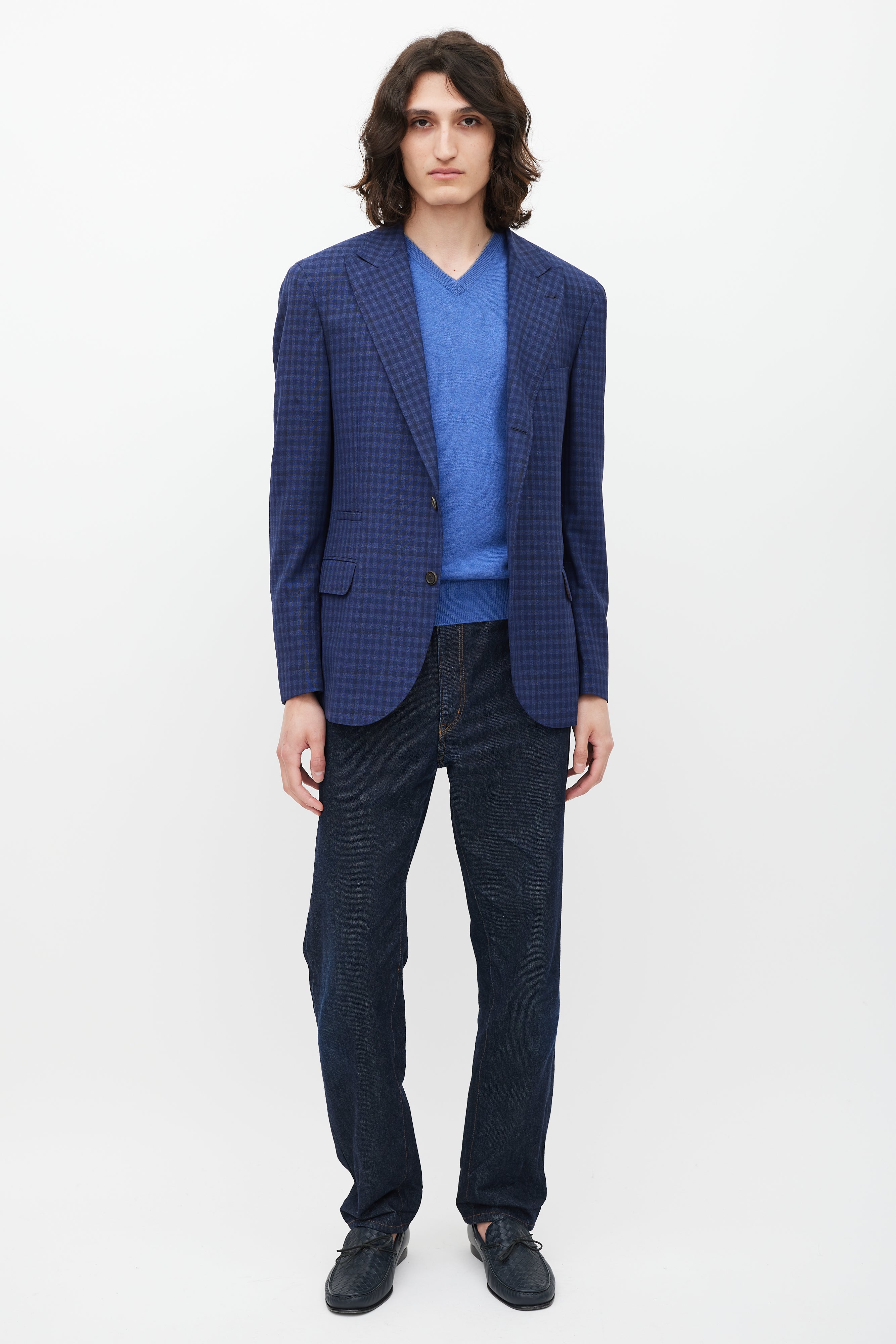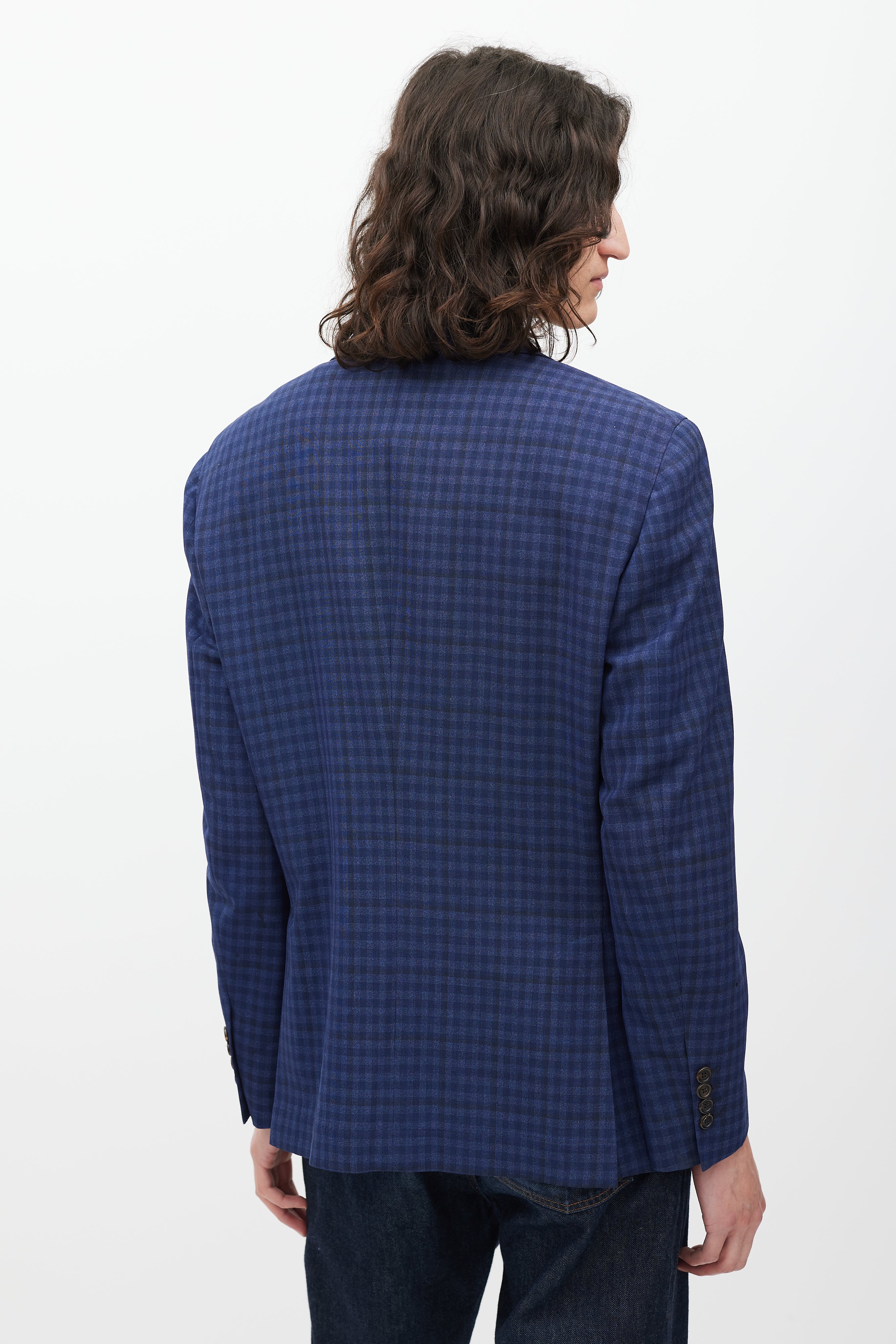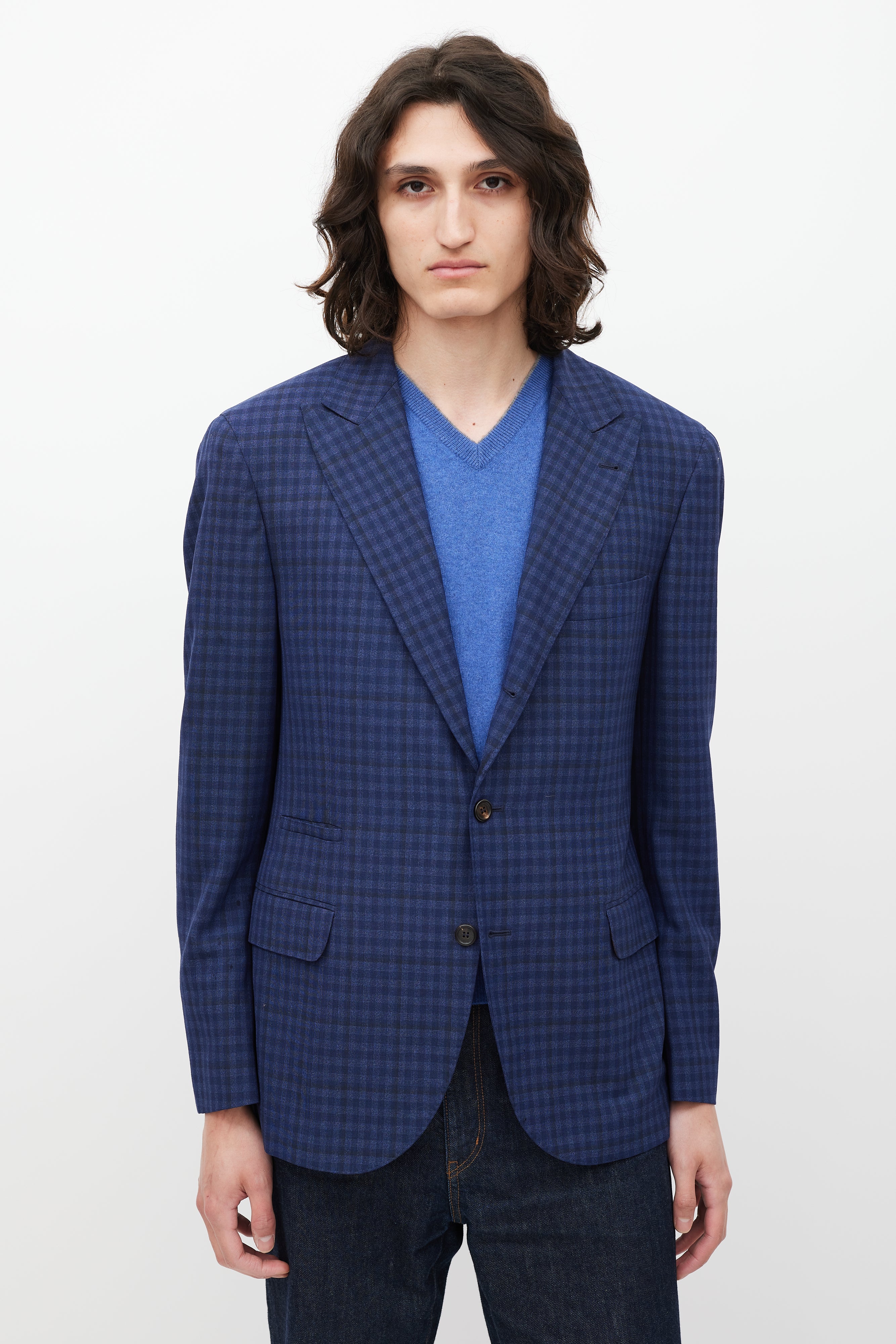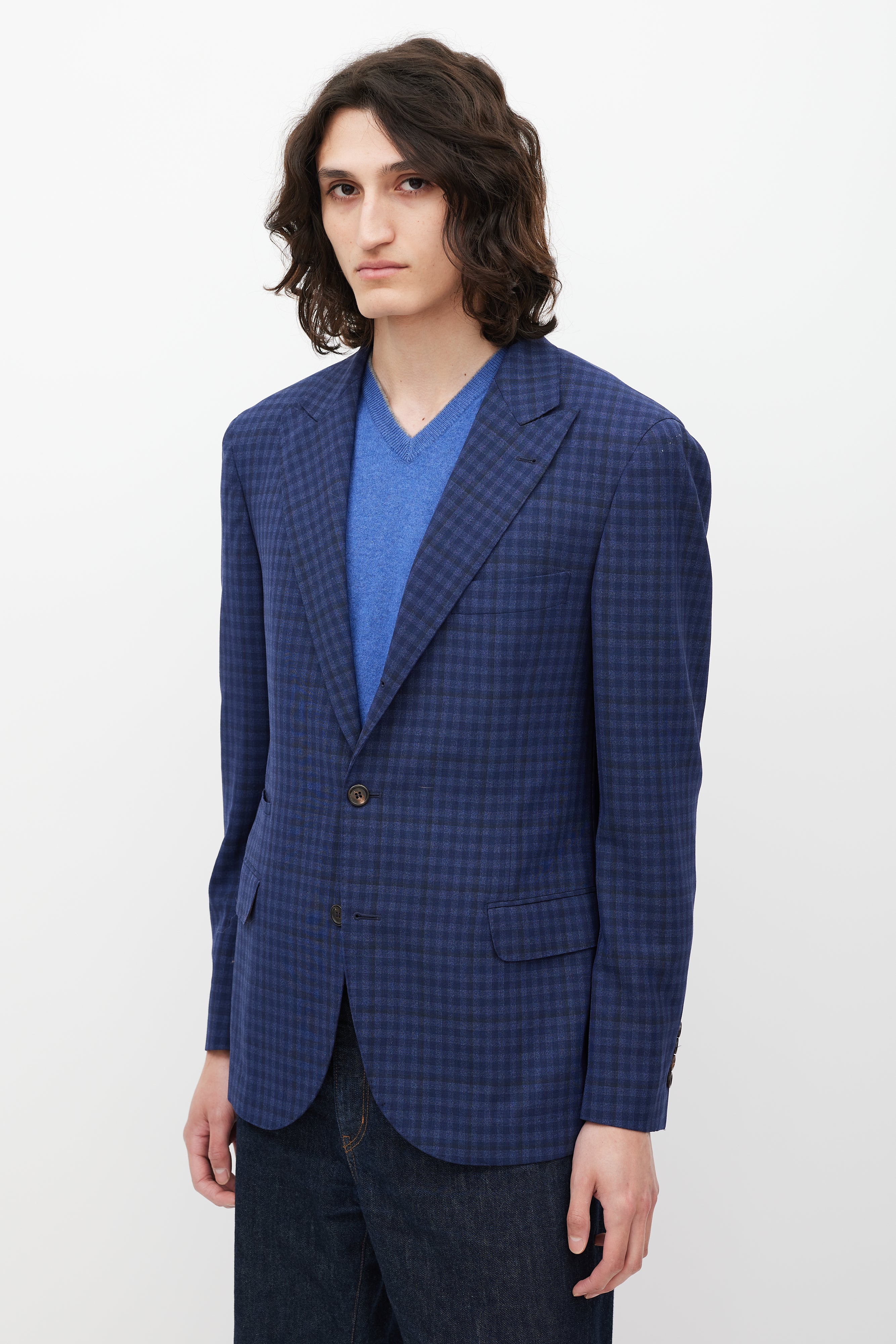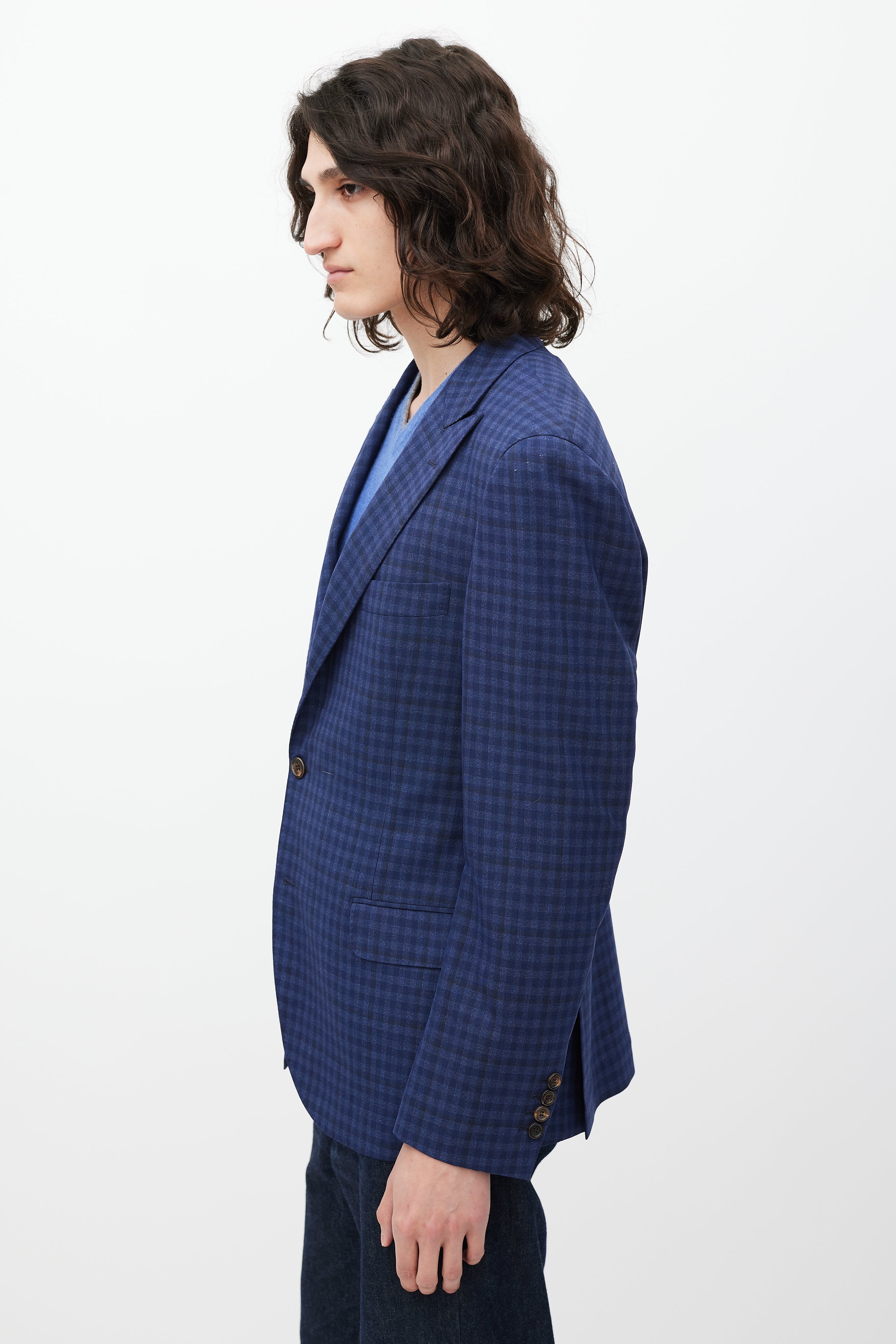 Pre-owned Brunello Cucinelli navy wool blend blazer featuring a check print throughout, peak lapel, padded shoulders, button front, slip pockets at left chest and right waist, two front flap pockets, long sleeves with buttoned cuffs, and back double vent. Partially lined.