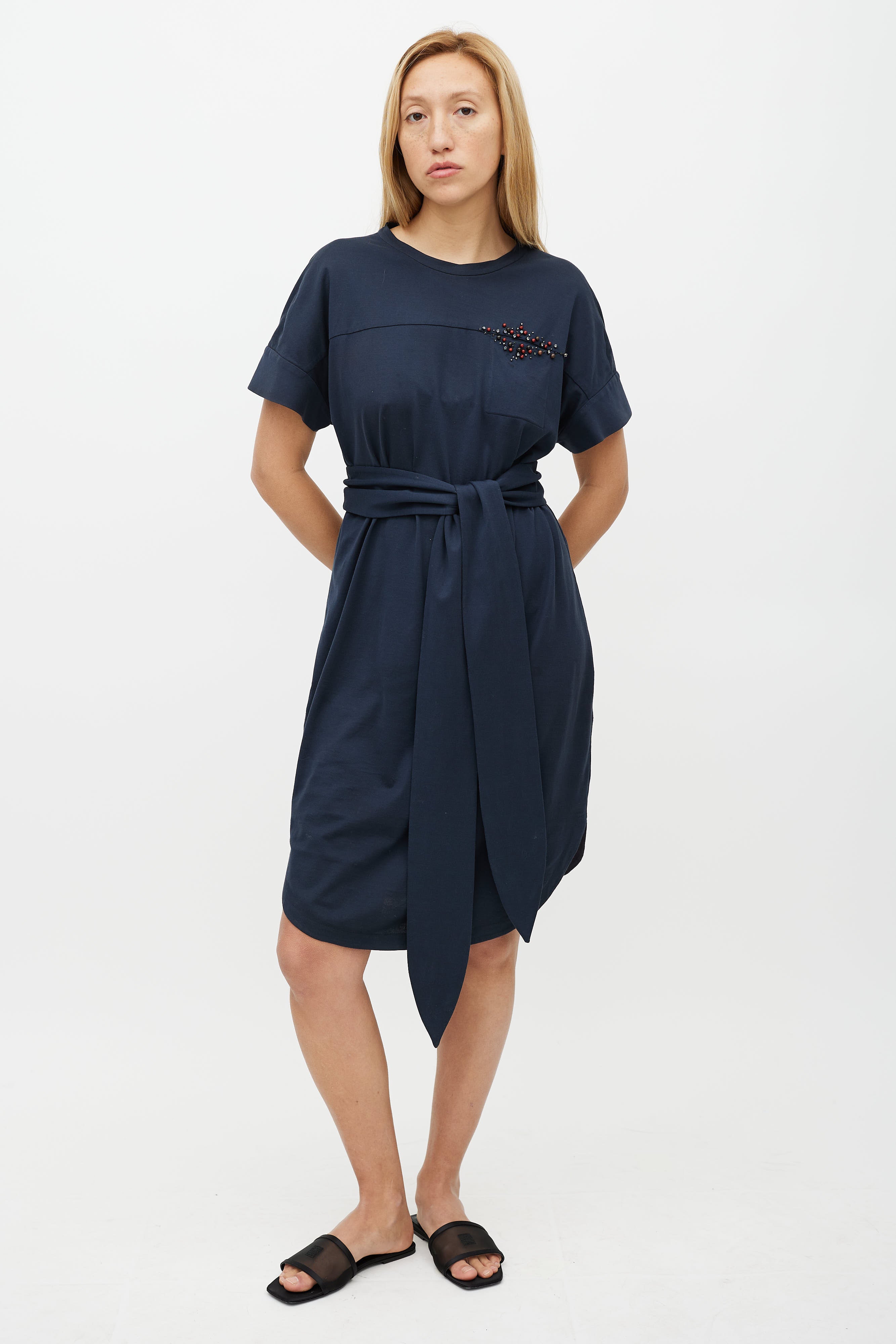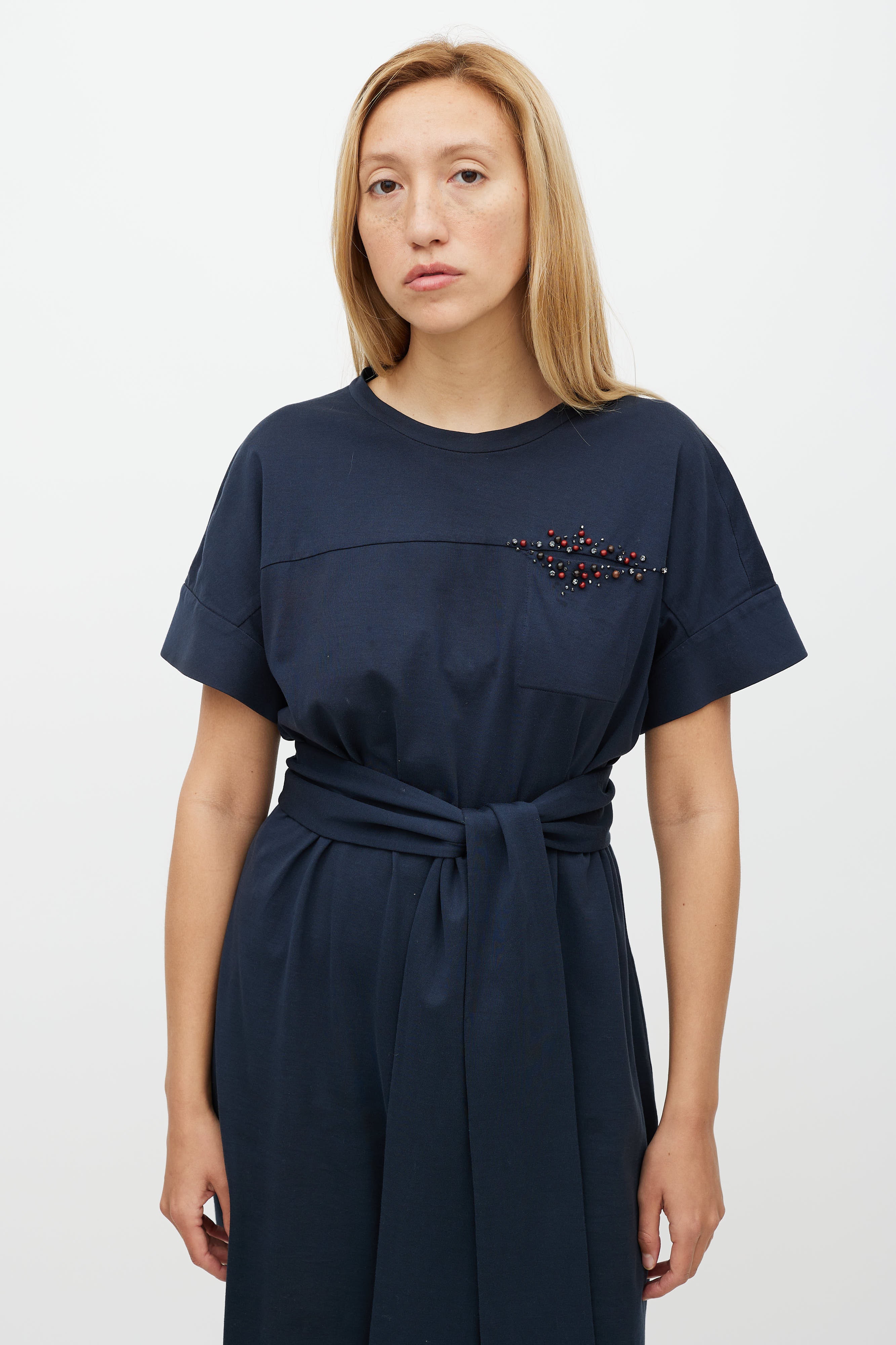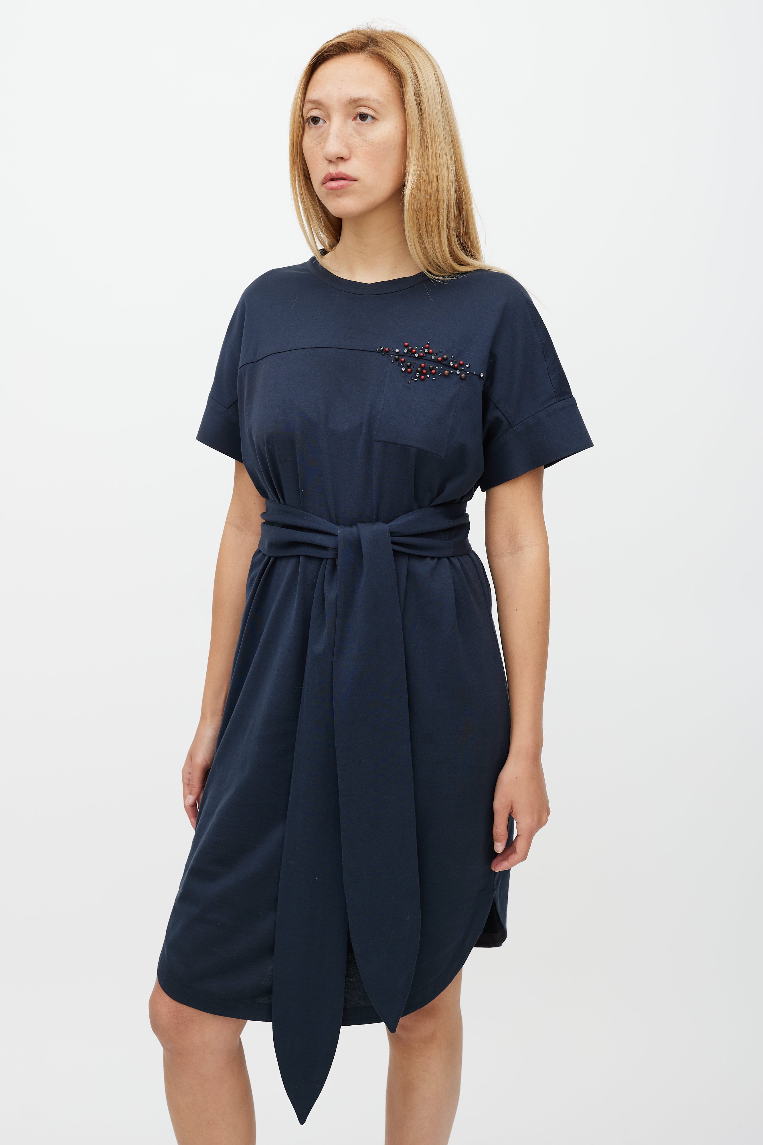 Pre-owned Brunello Cucinelli navy dress featuring a round neckline, one slip pocket at chest with multicolour beaded detail, tie belt at waist, short sleeves, and button closure at back.