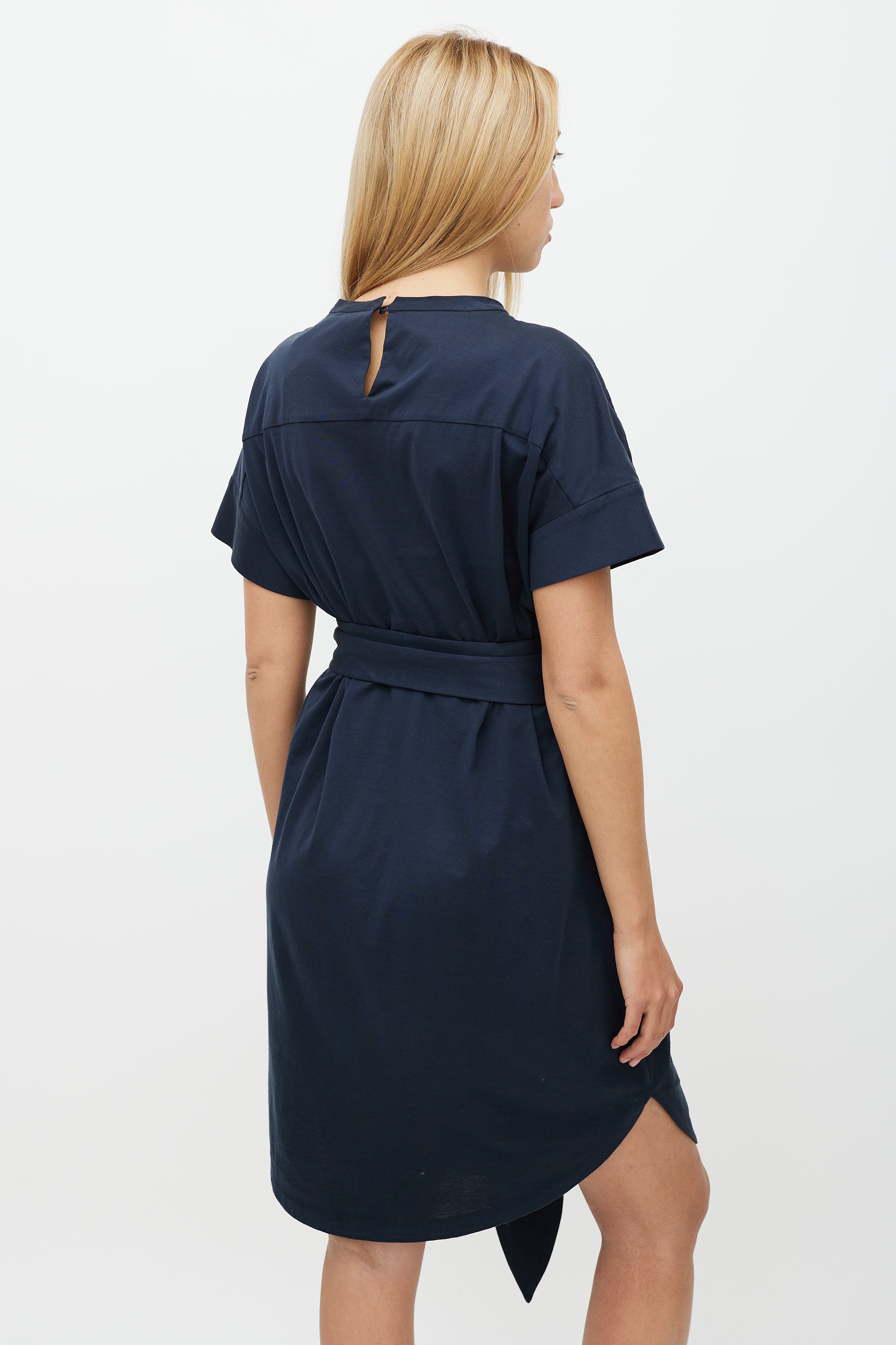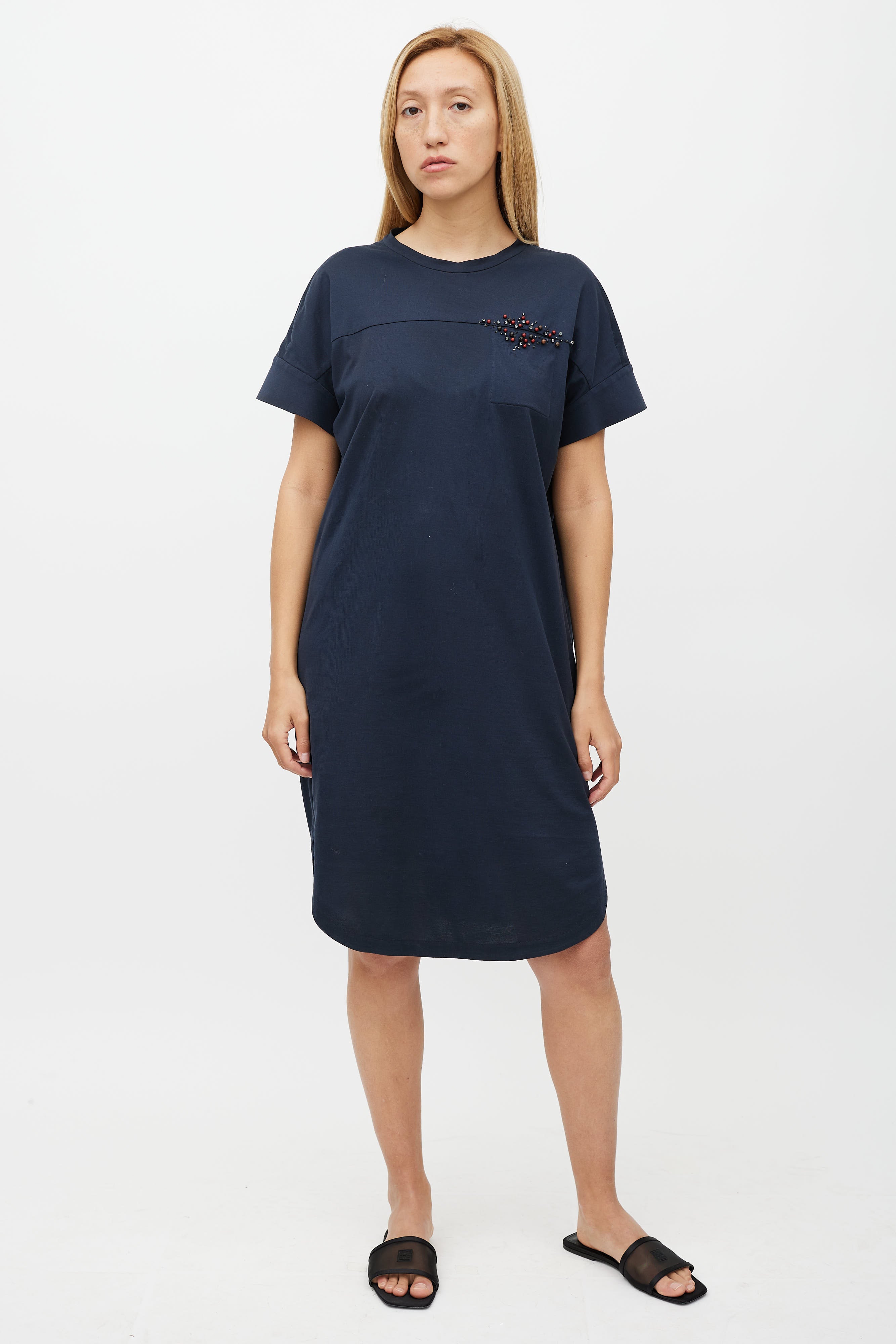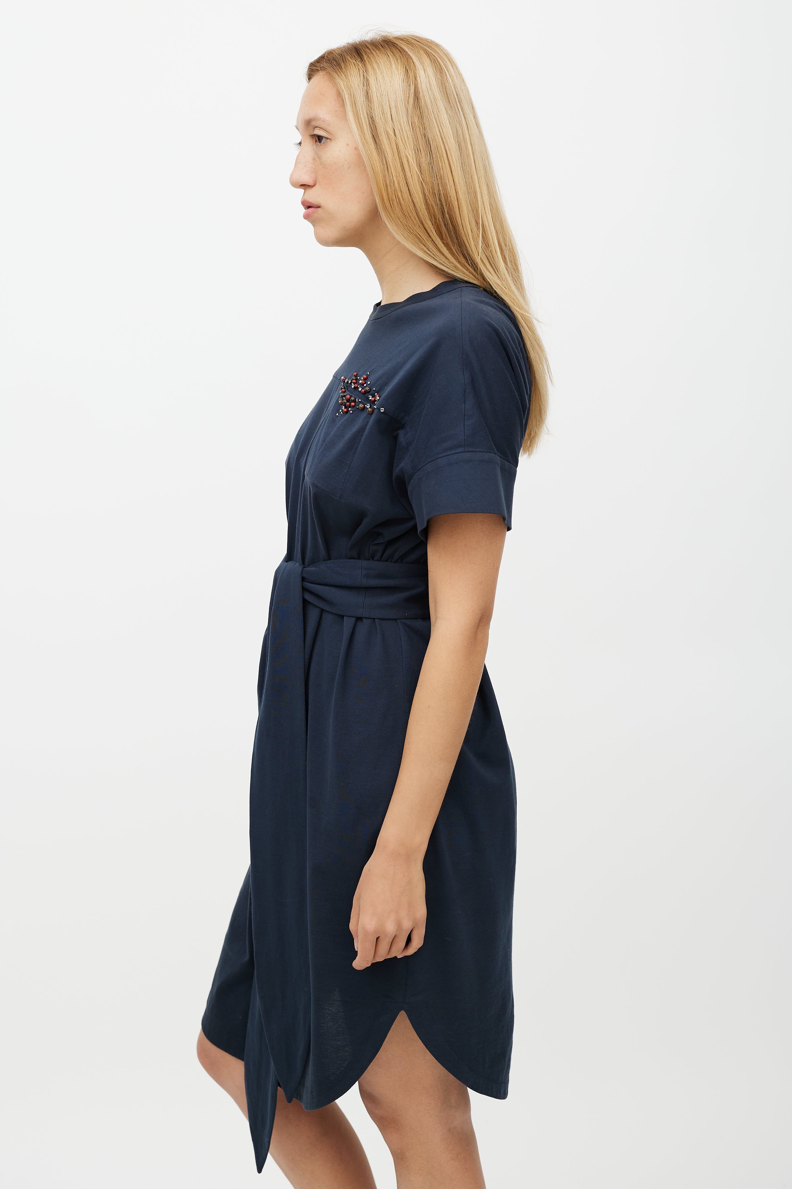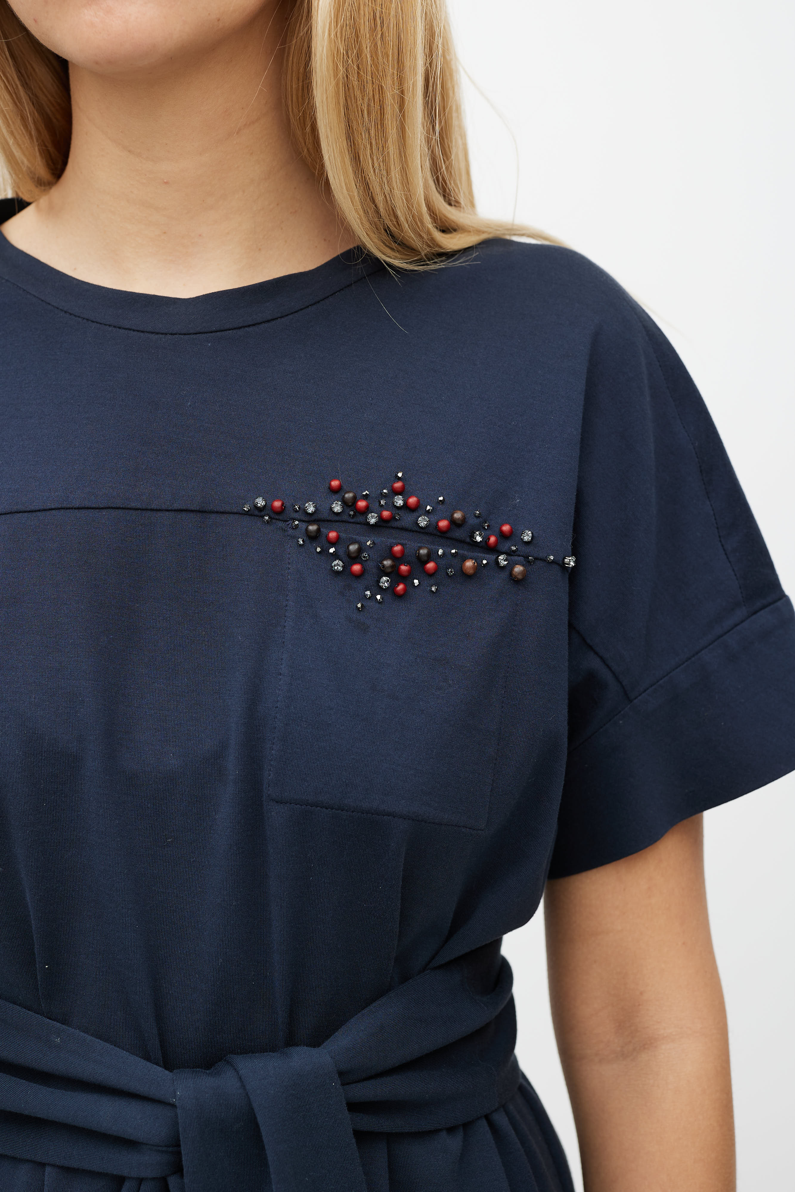 Pre-owned Brunello Cucinelli navy dress featuring a round neckline, one slip pocket at chest with multicolour beaded detail, tie belt at waist, short sleeves, and button closure at back.