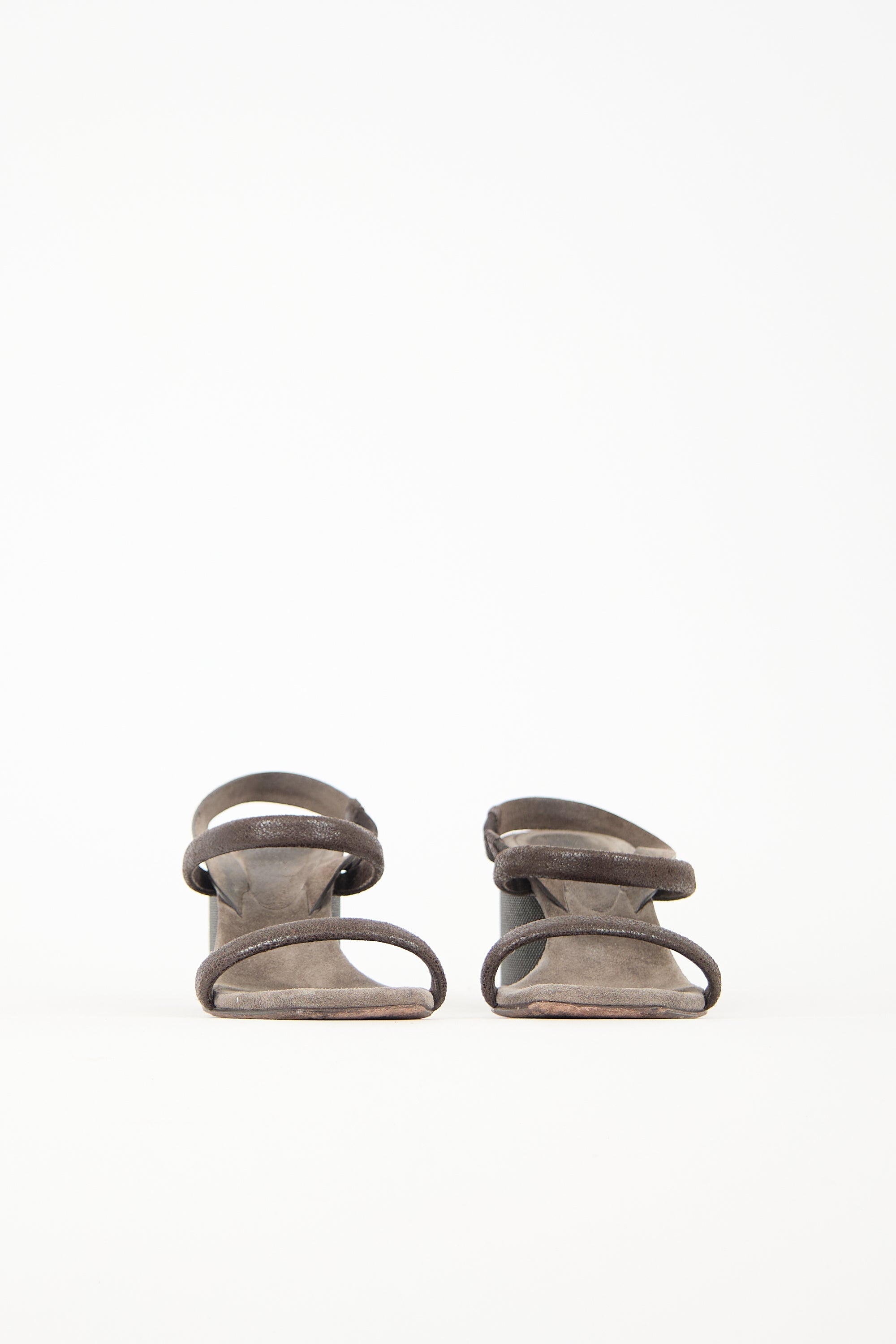 Pre-owned Brunello Cucinelli dark grey suede sandals featuring an open squared toe, shiny strap across vamp and insteap, elasticized slingback ankle strap, and a Monili covered block heel.