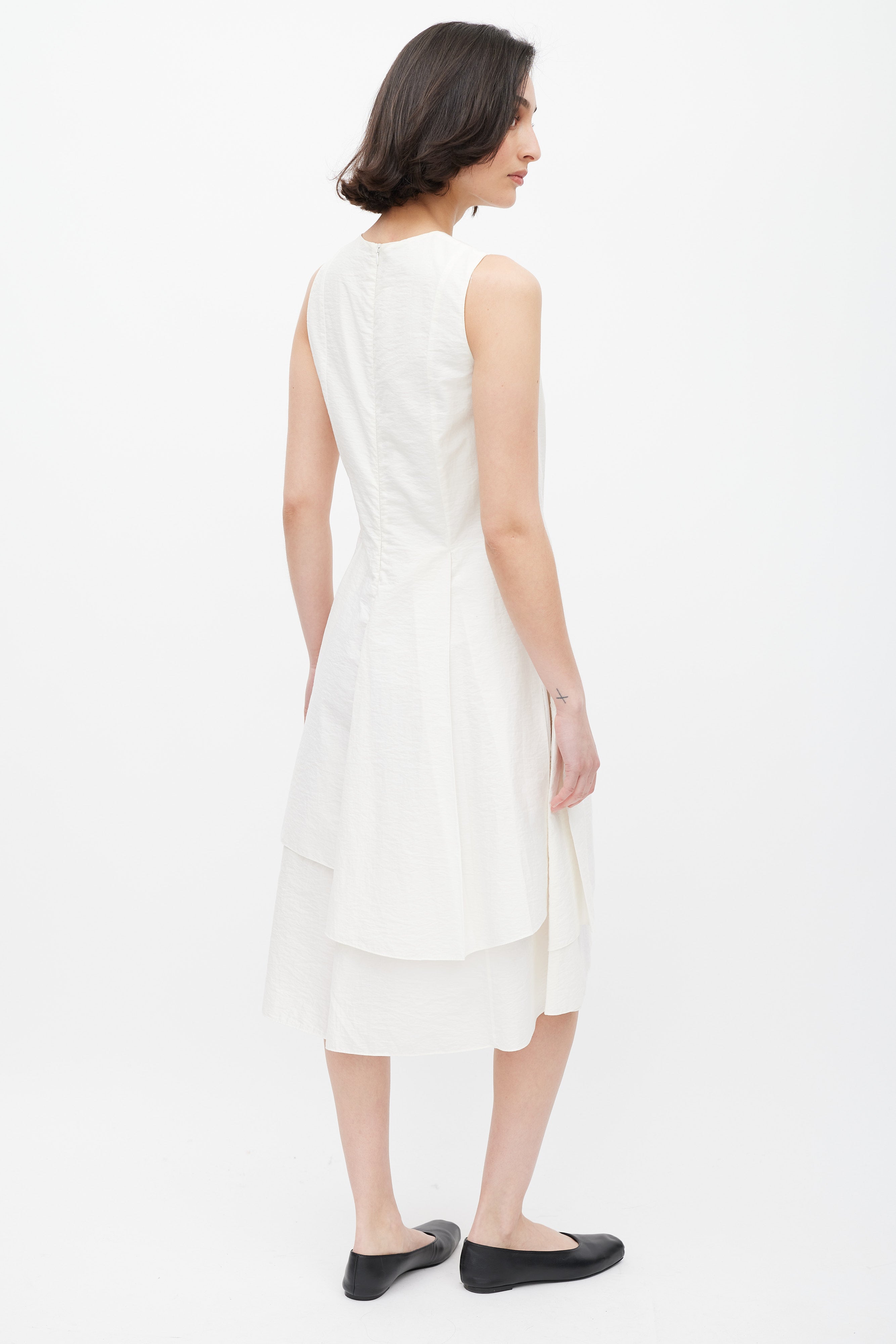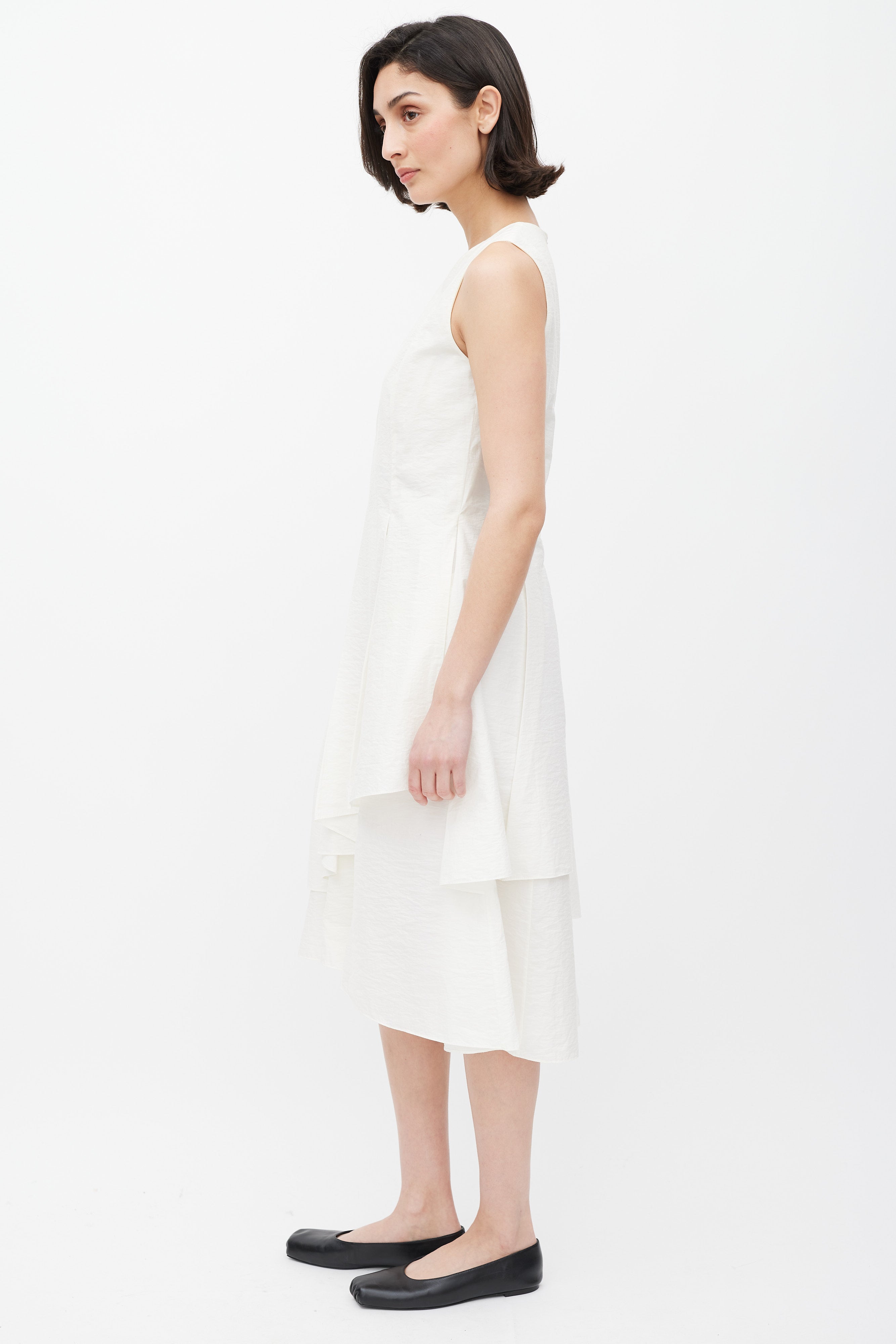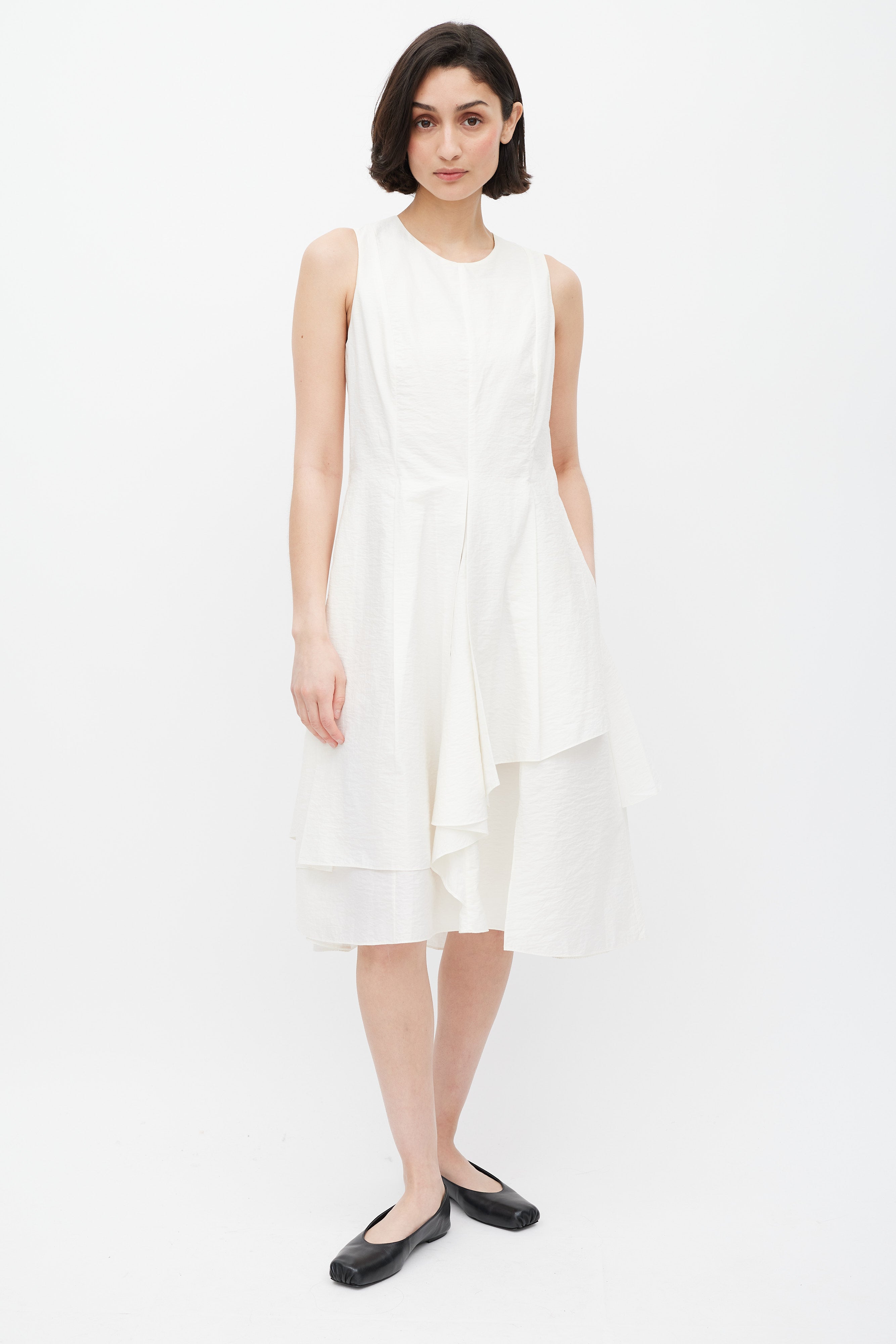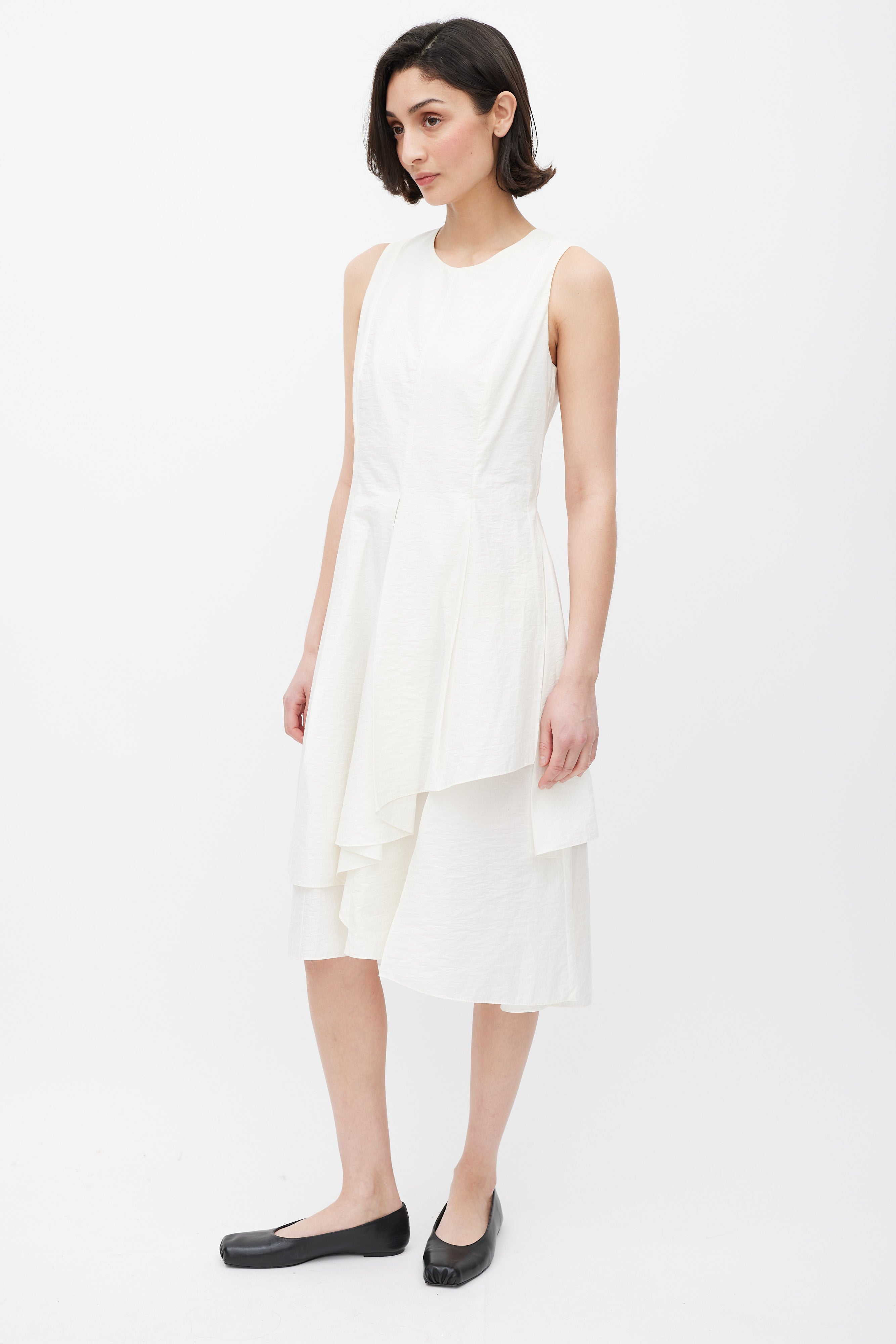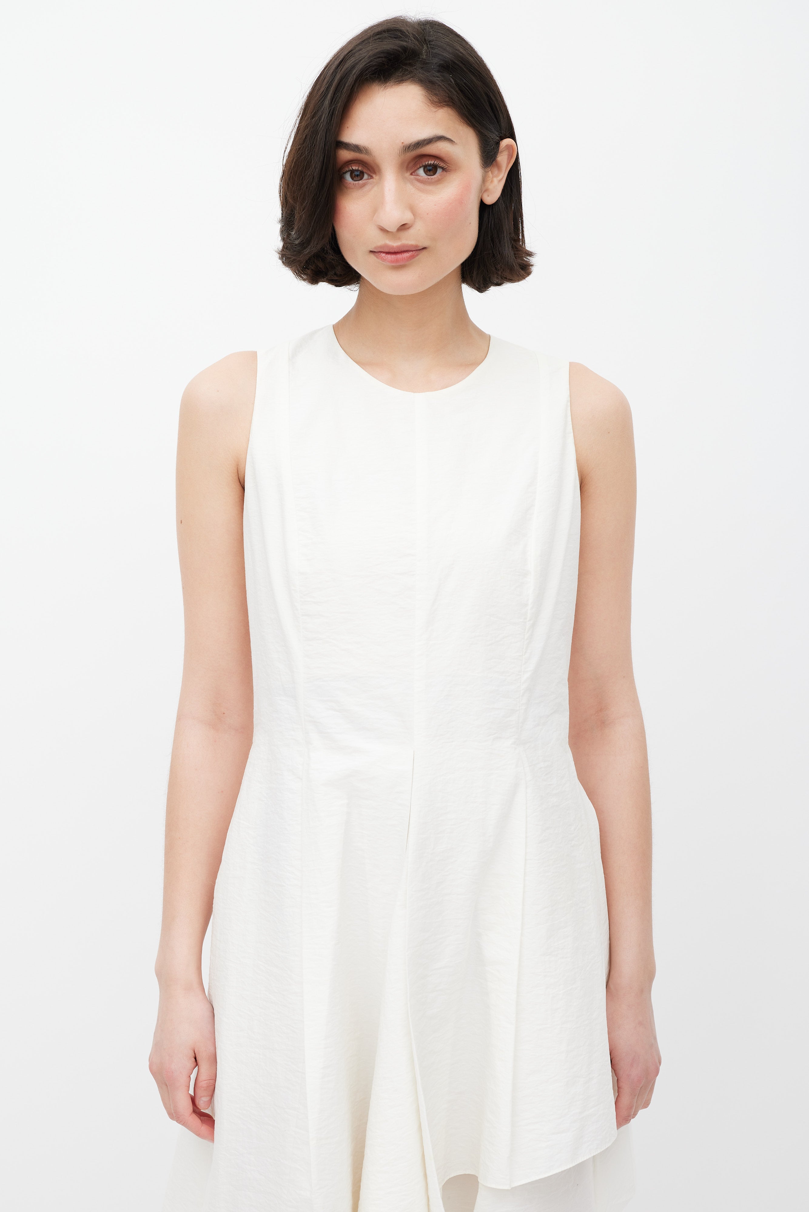 Pre-owned Brunello Cucinelli white dress featuring a round neckline, sleeveless styling, pleated overlay at waist, two slip pockets at hip, and zip closure at back. Lined.