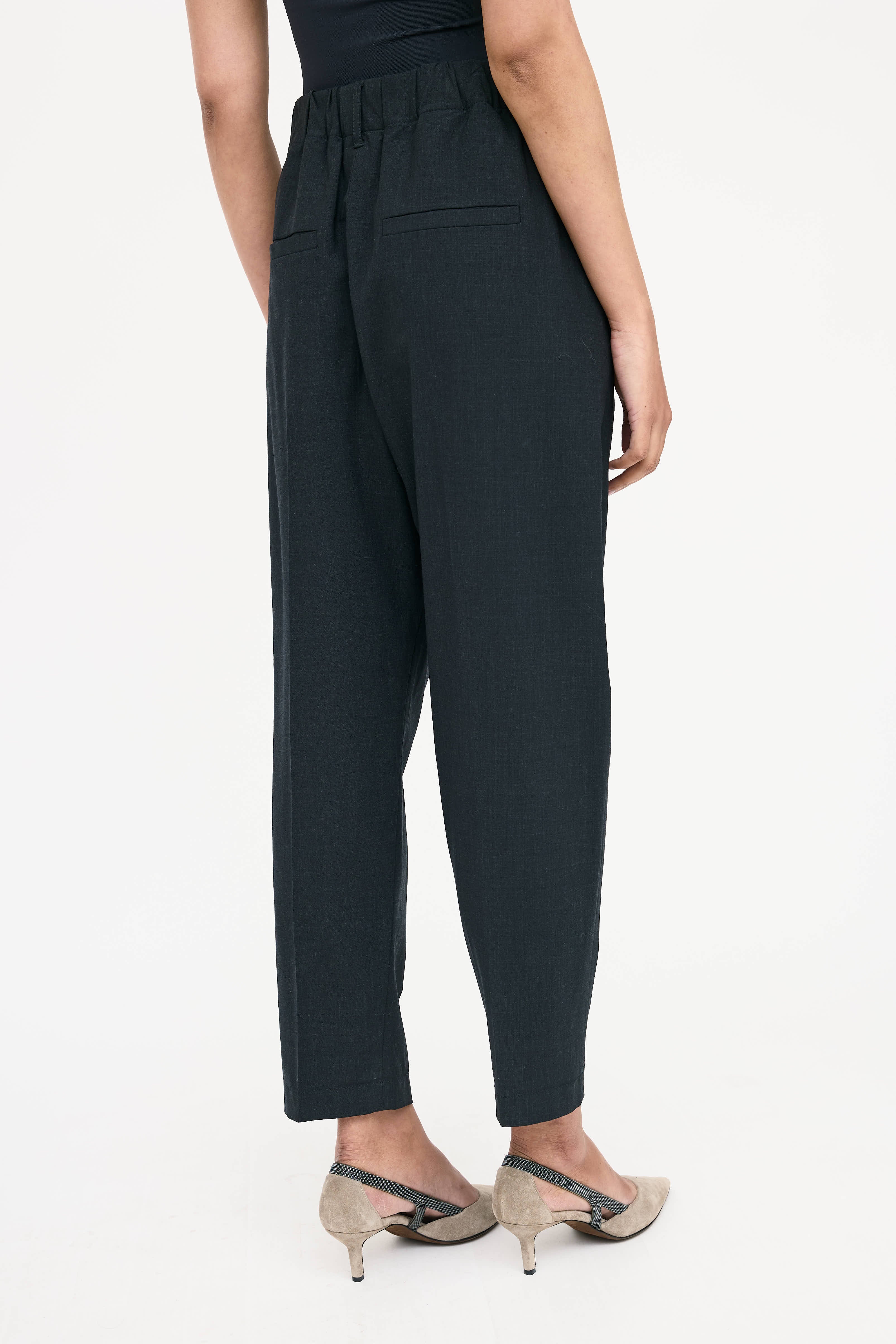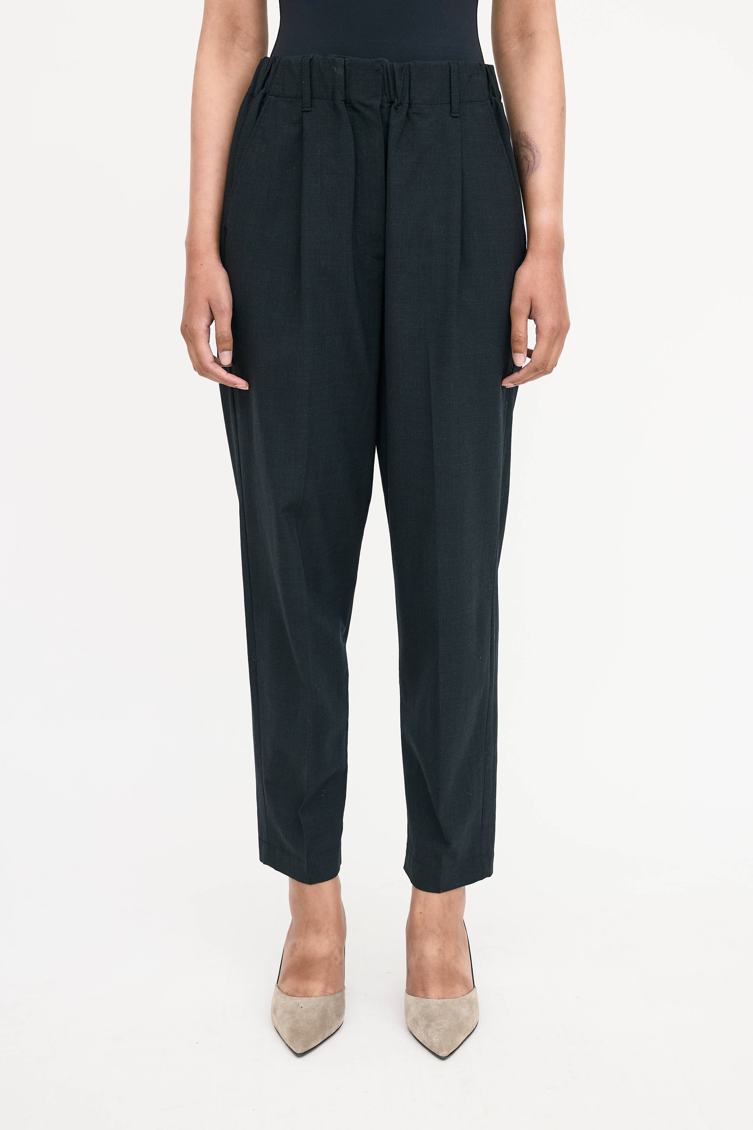 Pre-owned Brunello Cucinelli grey wool trousers featuring an elastic waist, two slip pockets at hip, two welt pockets at back, pleated front, tapered leg, and zip fly with hook and eye closure. Lined.