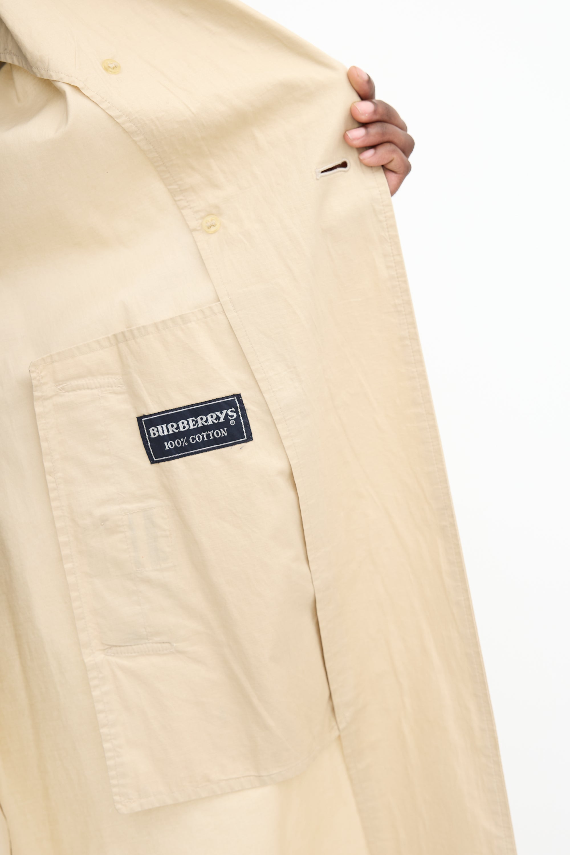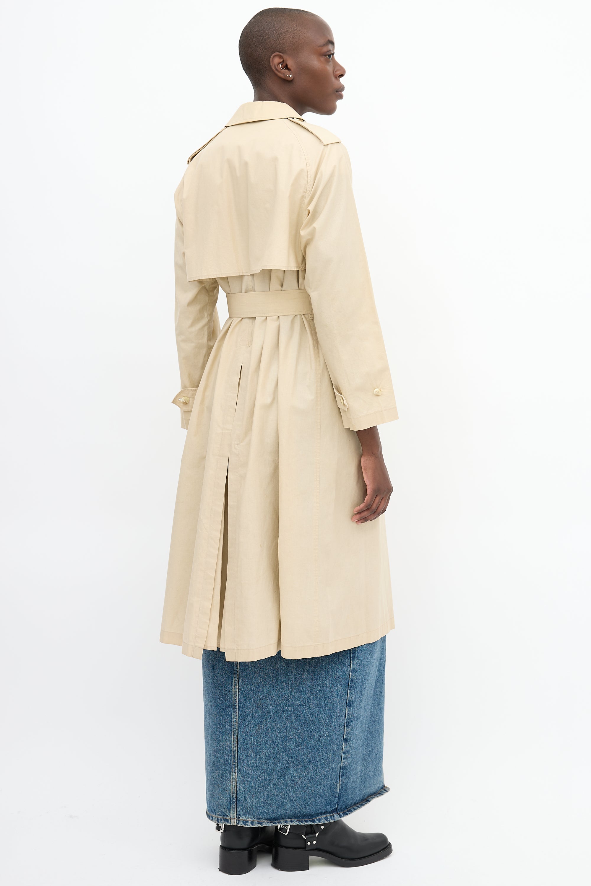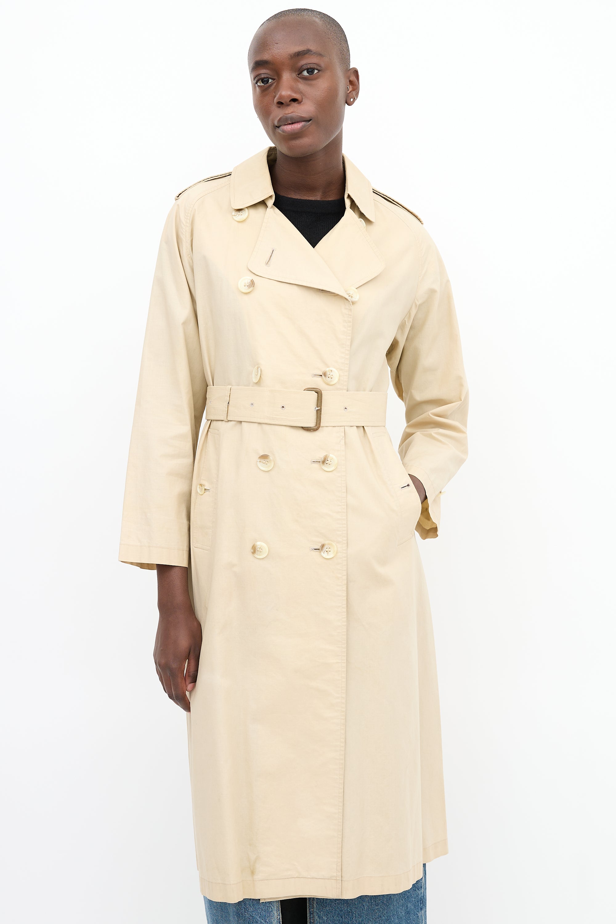Pre-owned Burberry vintage beige trench coat featuring a trench collar, double breasted button up front closure, two front pockets, back storm shield, waist belt, back kick pleat, epaulettes at shoulders, and straps at cuffs. Unlined. c. 1980s.