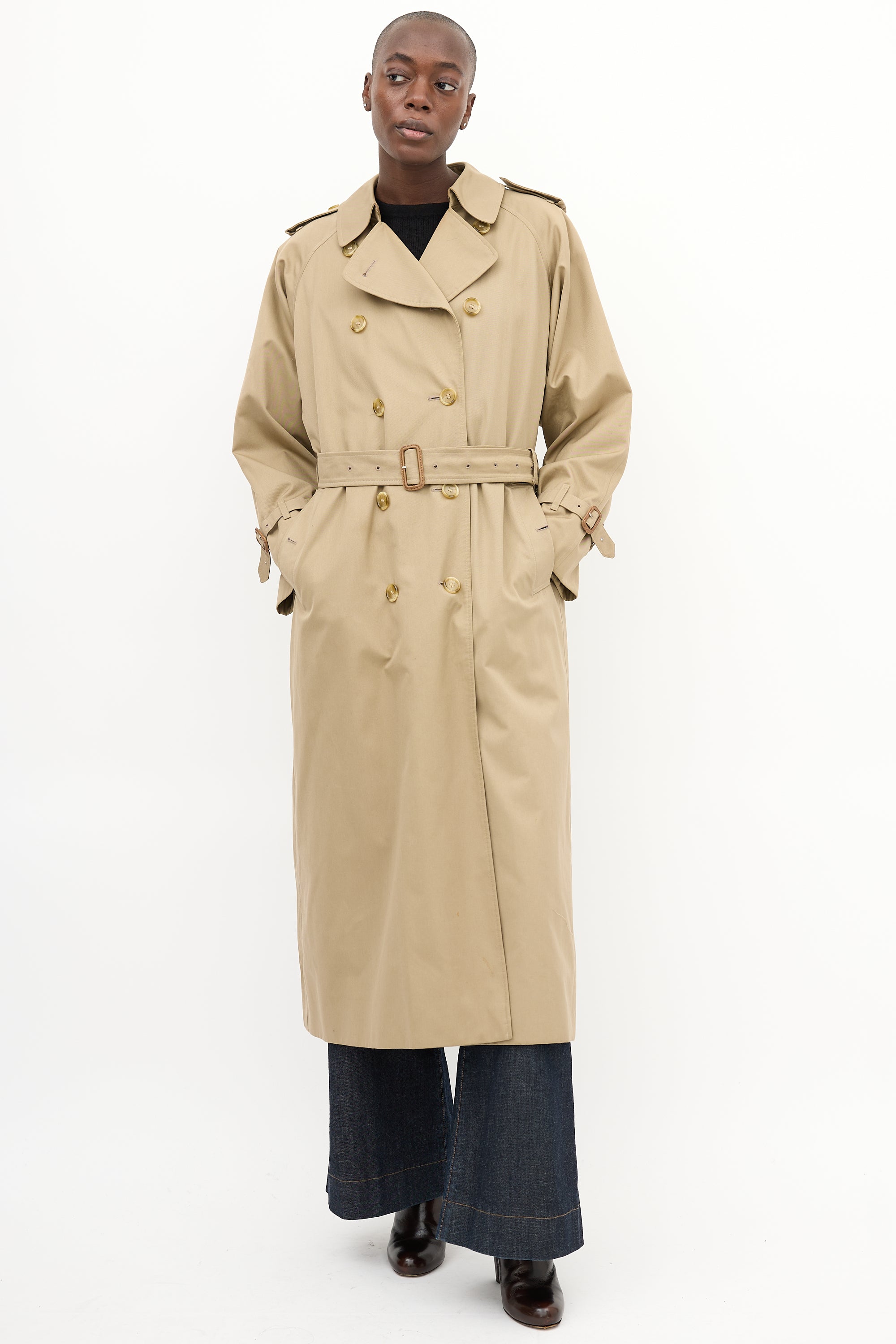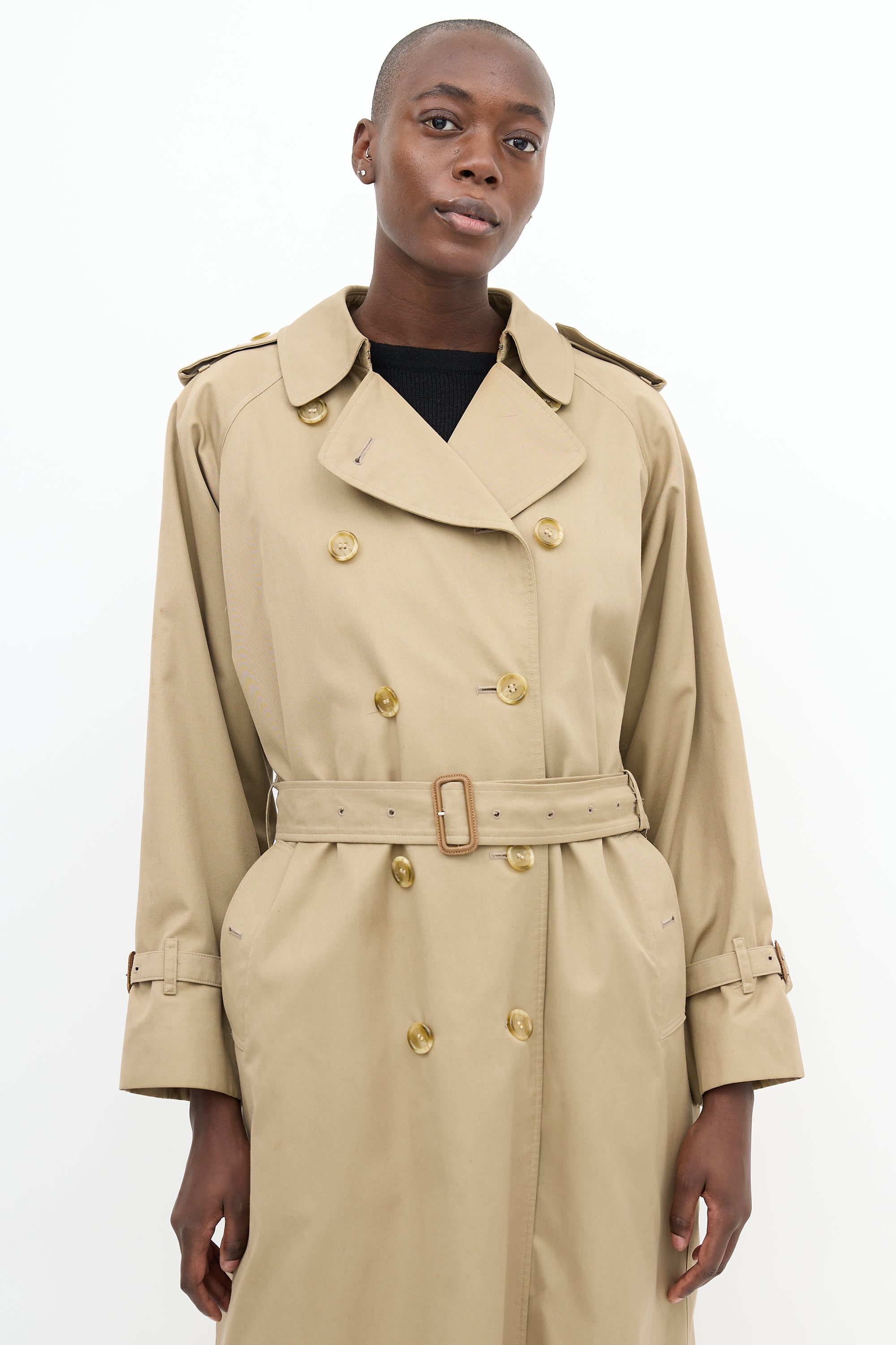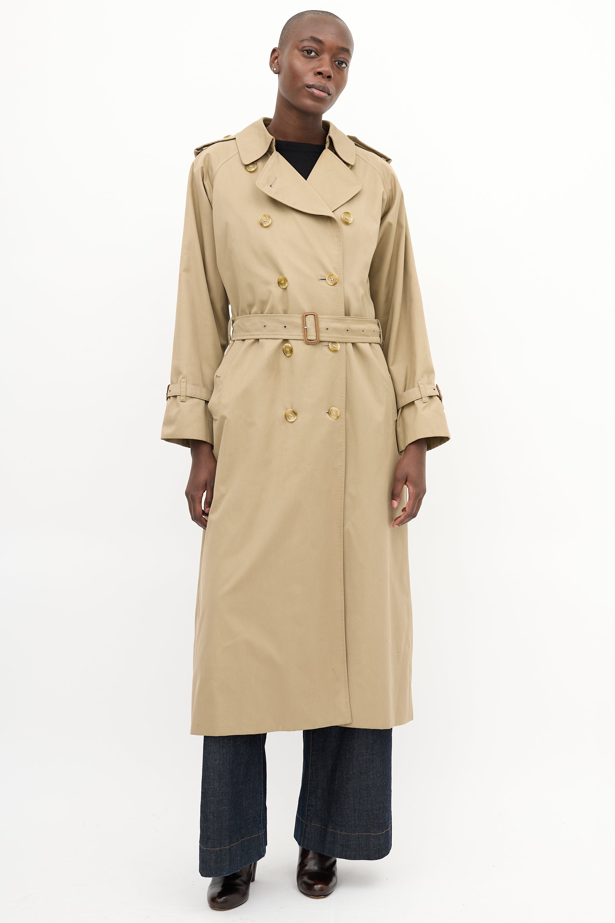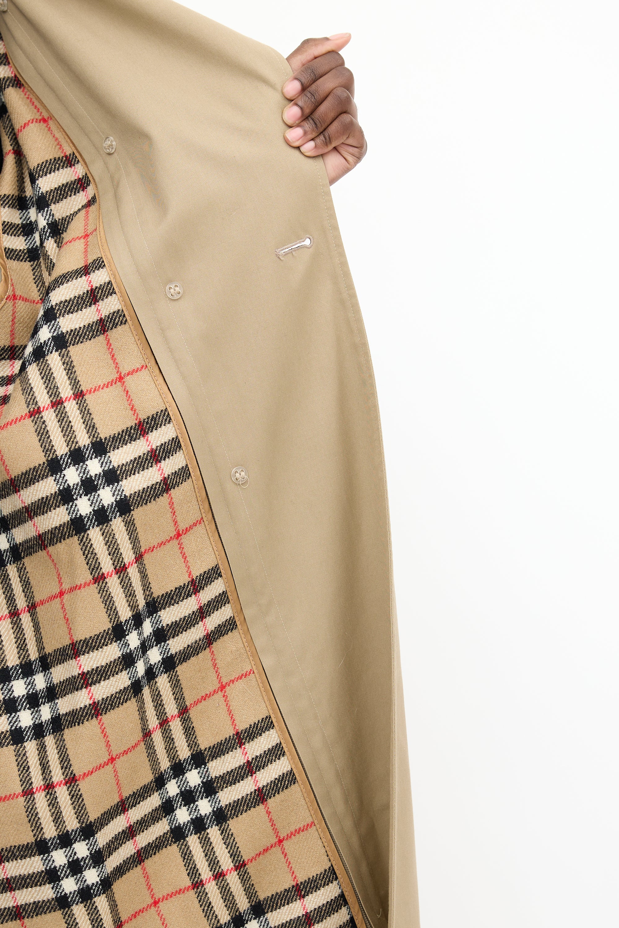 Pre-owned Burberry vintage brown trench coat featuring a trench collar, double breasted button up front closure, two front pockets, waist belt, back kick pleat, epaulettes at shoulders, straps at cuffs, and detachable woven Nova Check lining. Lined. c. 1980s.