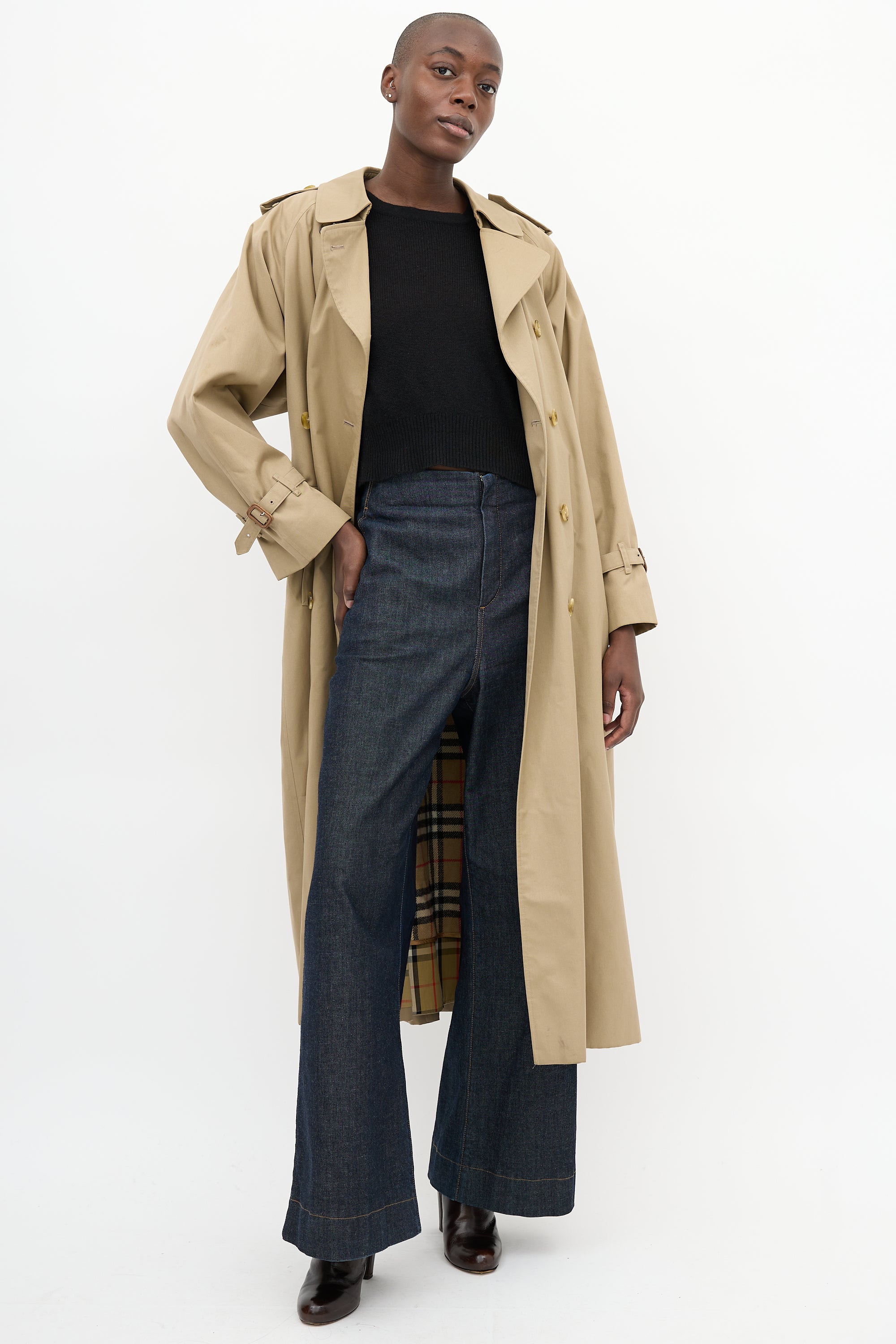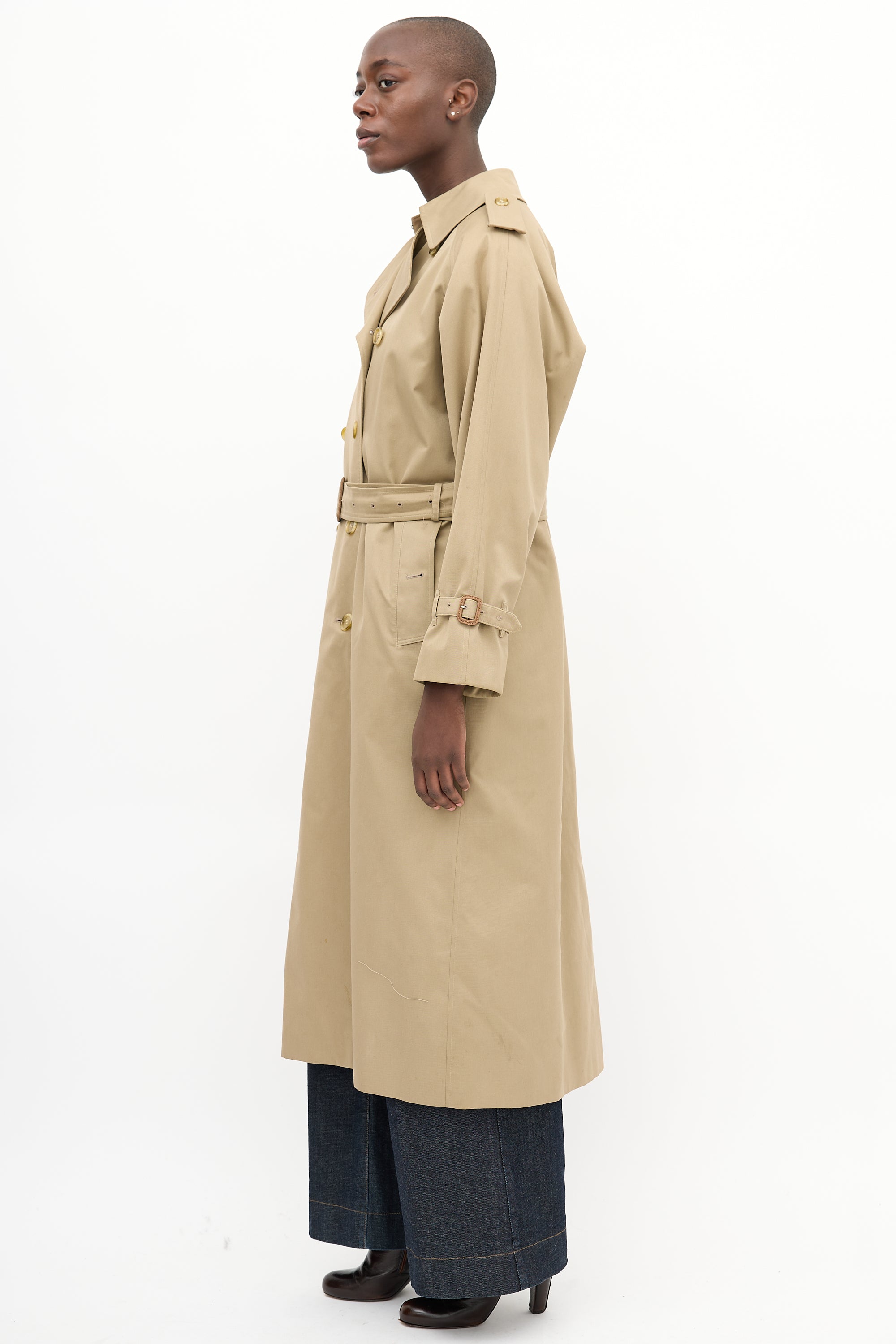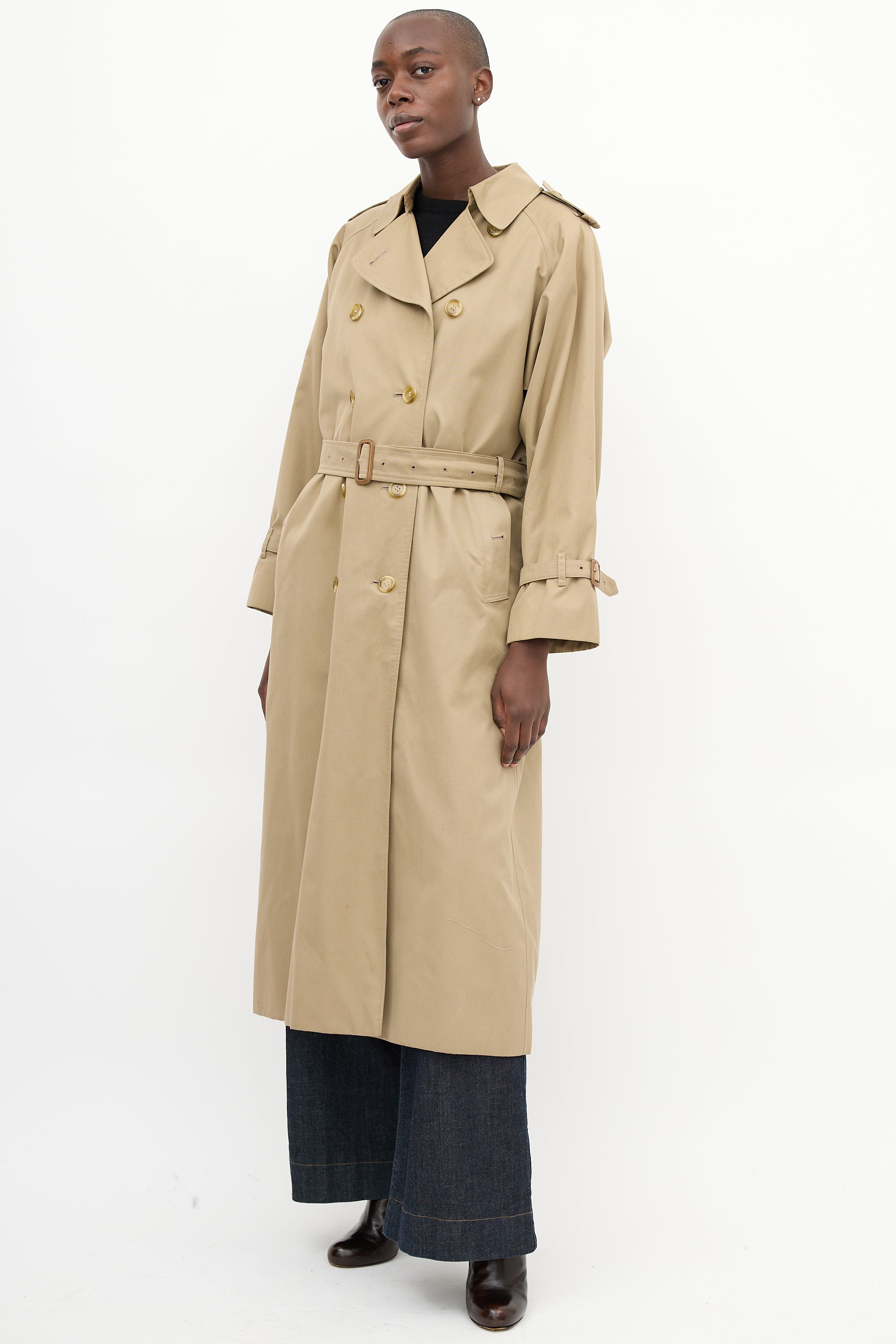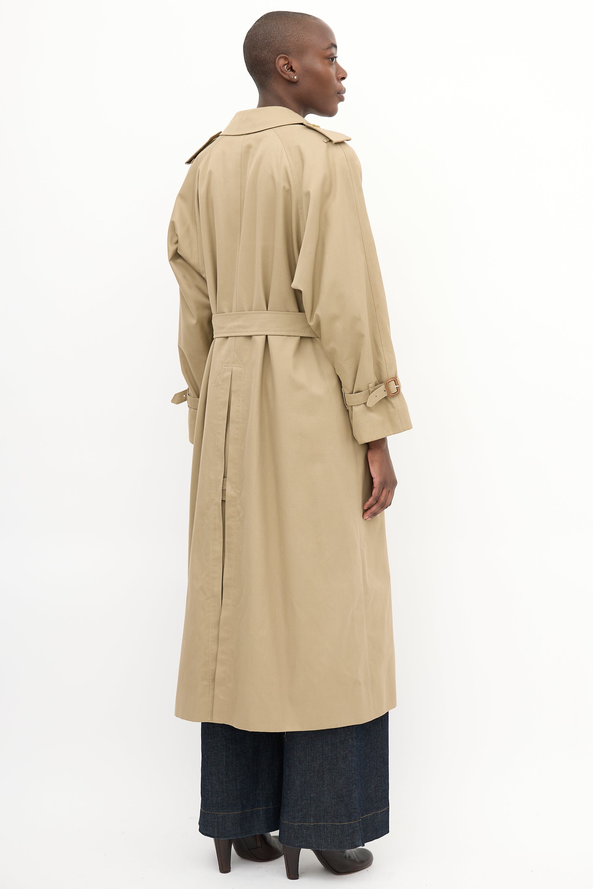 Pre-owned Burberry vintage brown trench coat featuring a trench collar, double breasted button up front closure, two front pockets, waist belt, back kick pleat, epaulettes at shoulders, straps at cuffs, and detachable woven Nova Check lining. Lined. c. 1980s.