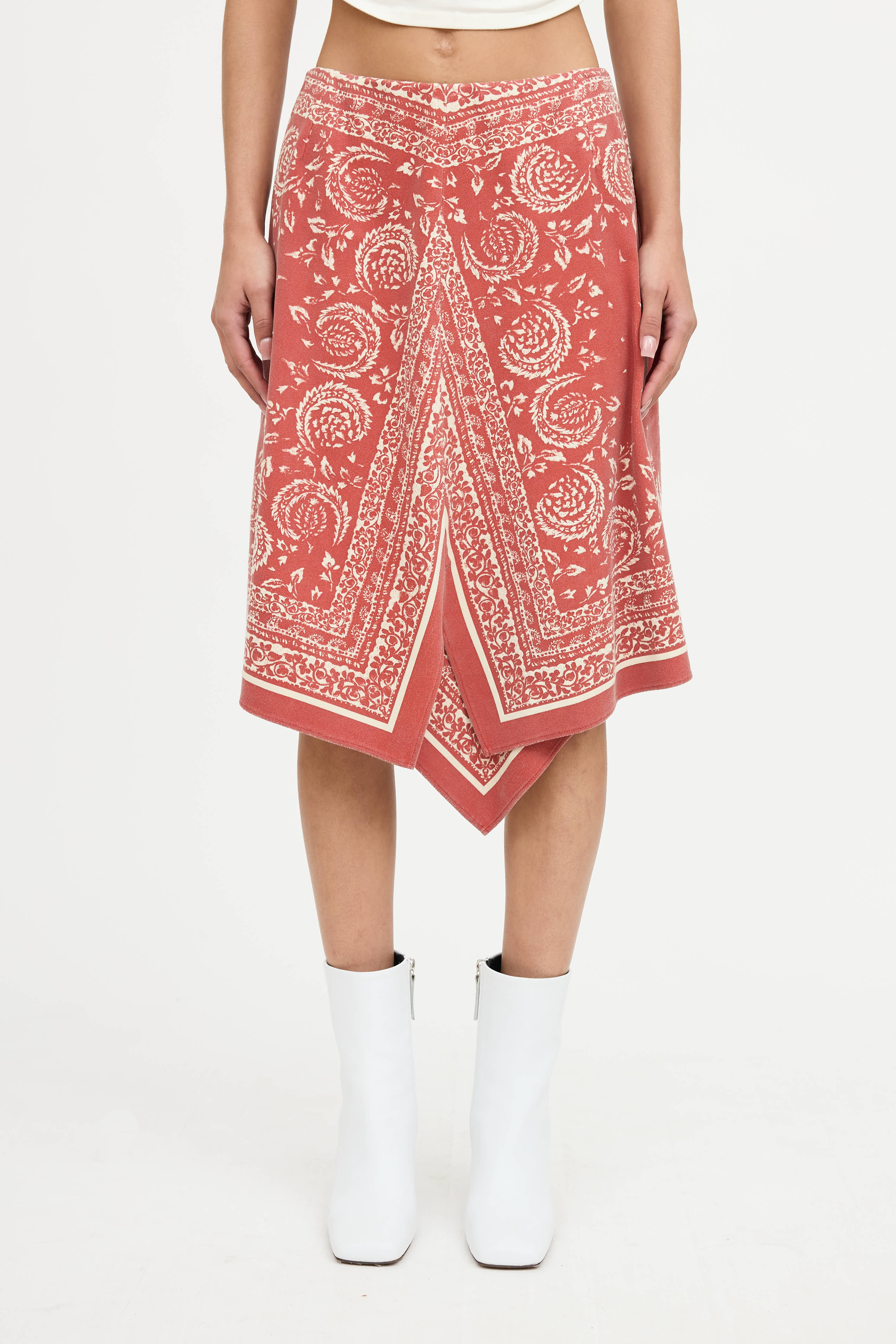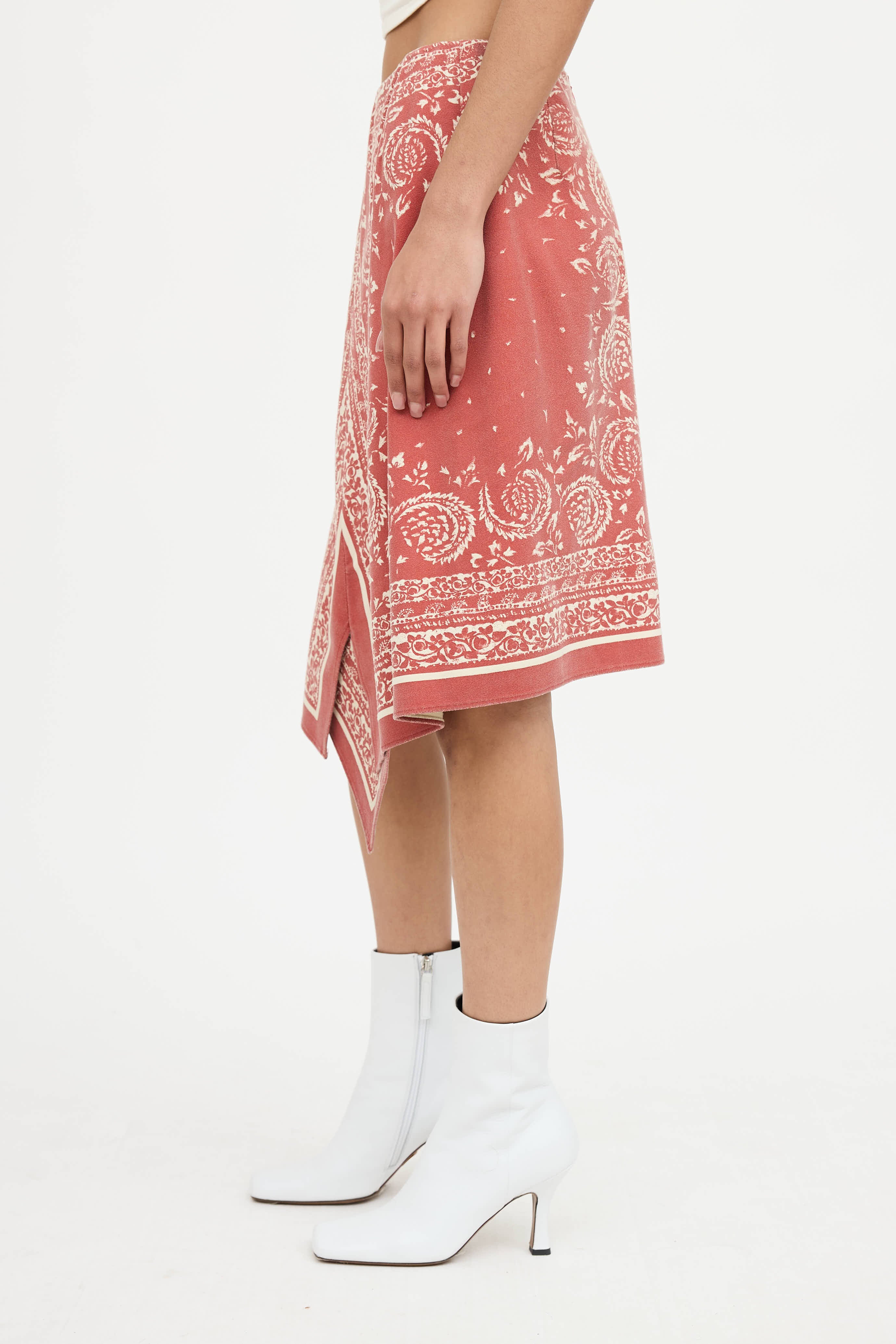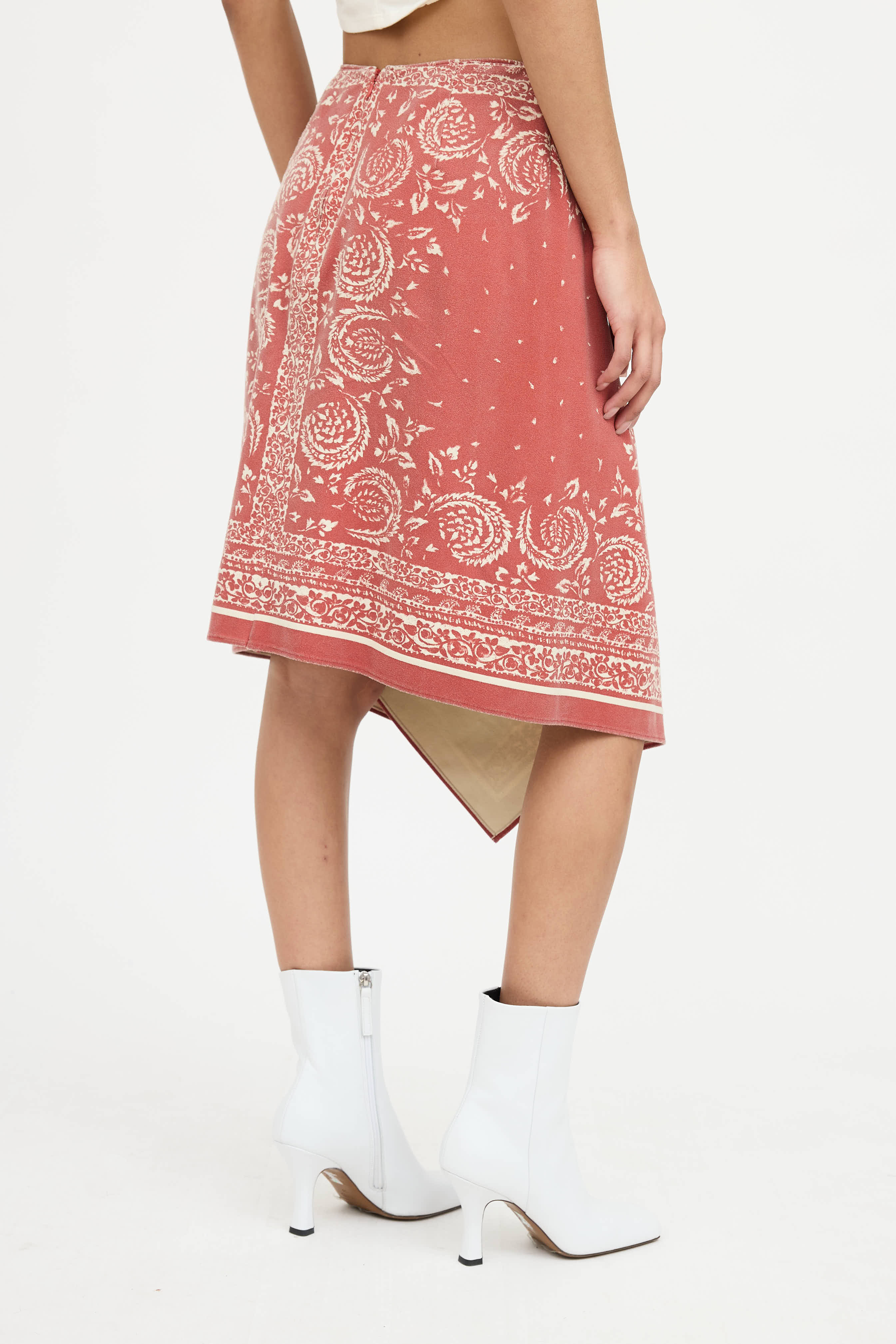 Pre-owned Burberry orange and cream skirt featuring concealed zip at back, paisley print throughout, and asymmetrical hemline.