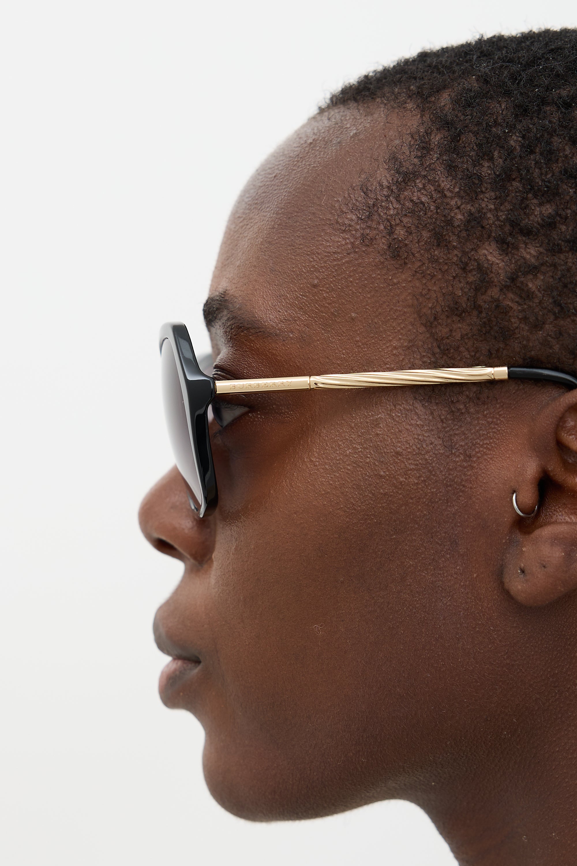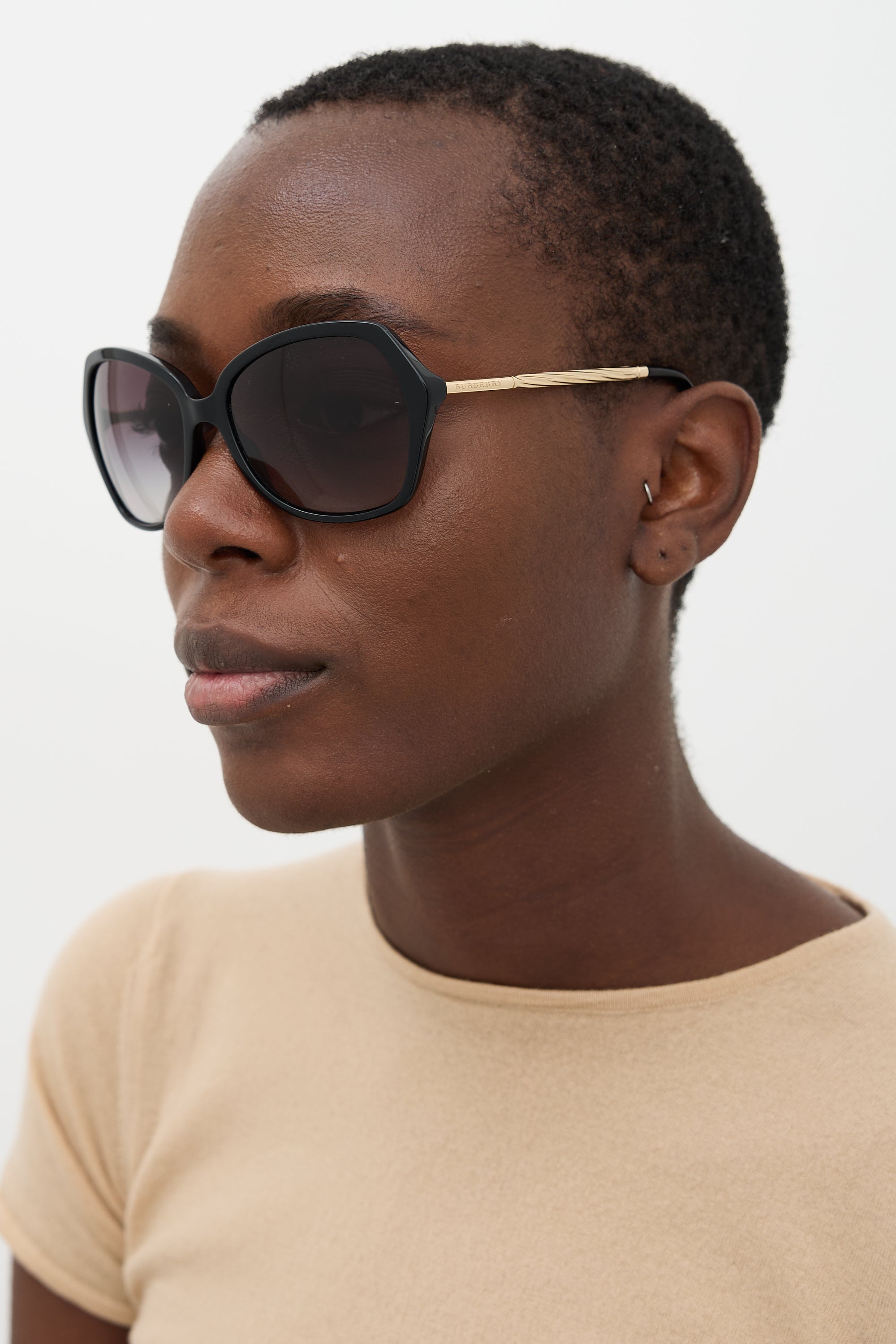Pre-owned Burberry B4193 sunglasses featuring a round black frame, saddle nose bridge, black tinted lenses, gold tone metal arms with twisted detail, and engraved logo at temples. Includes original case and box.