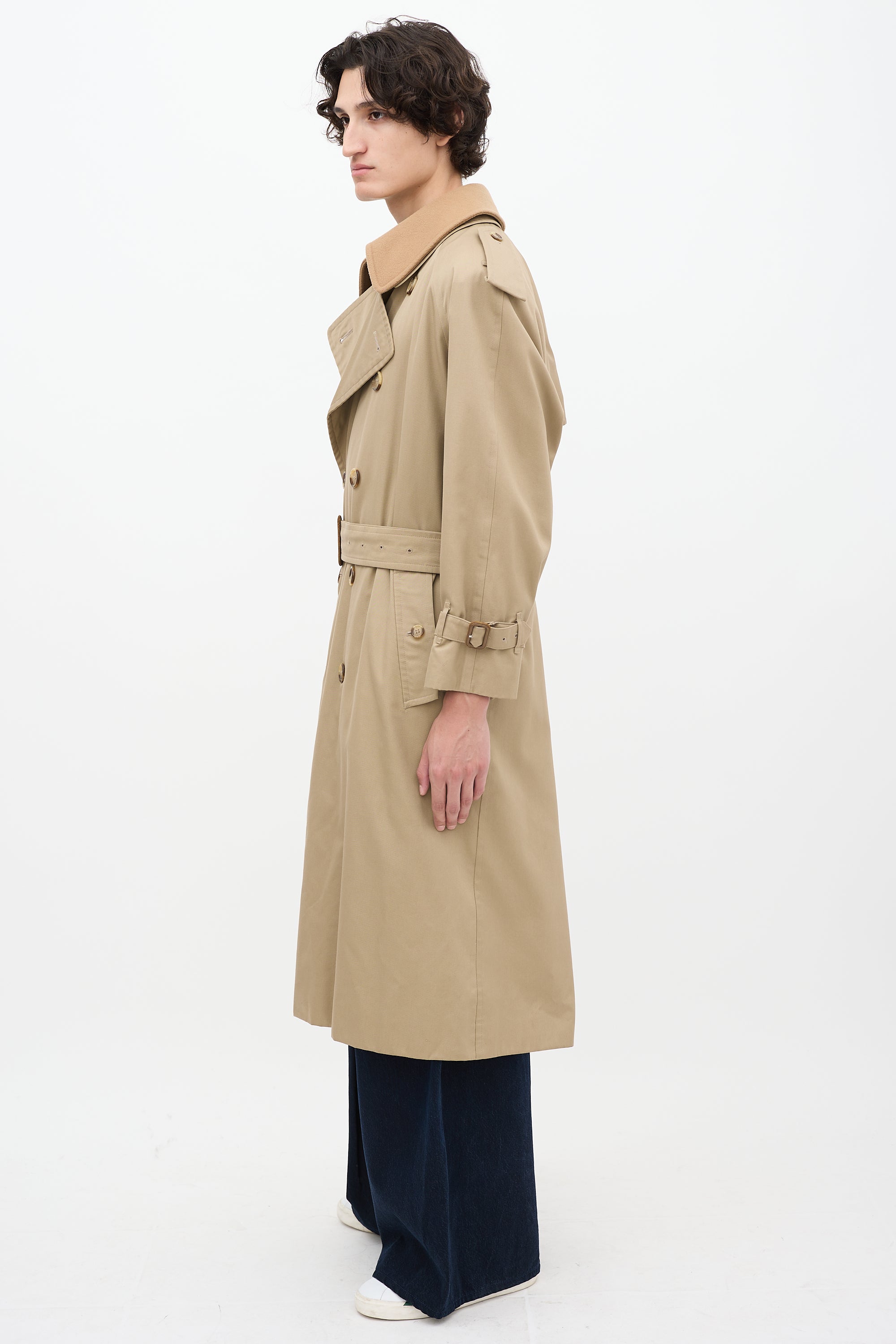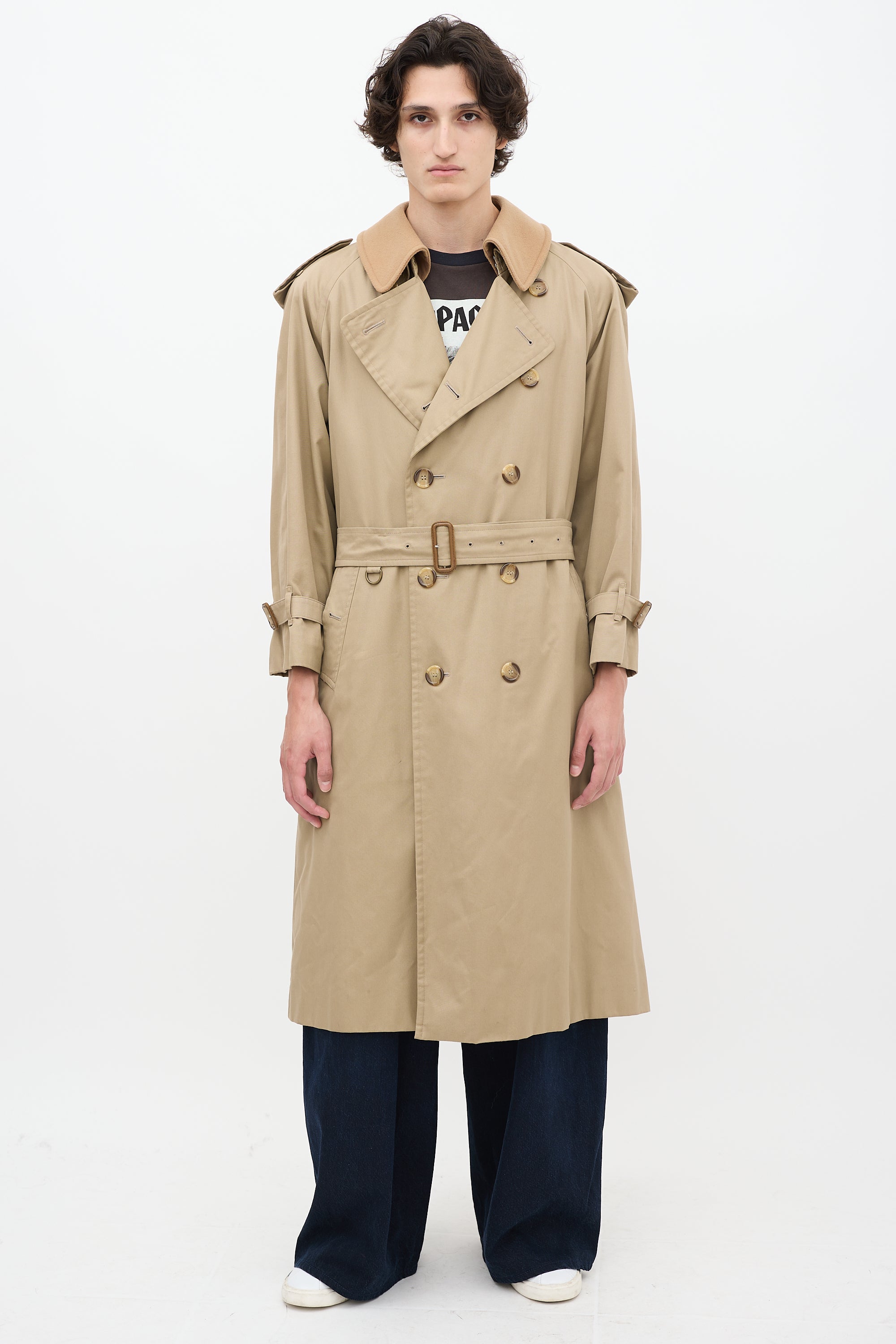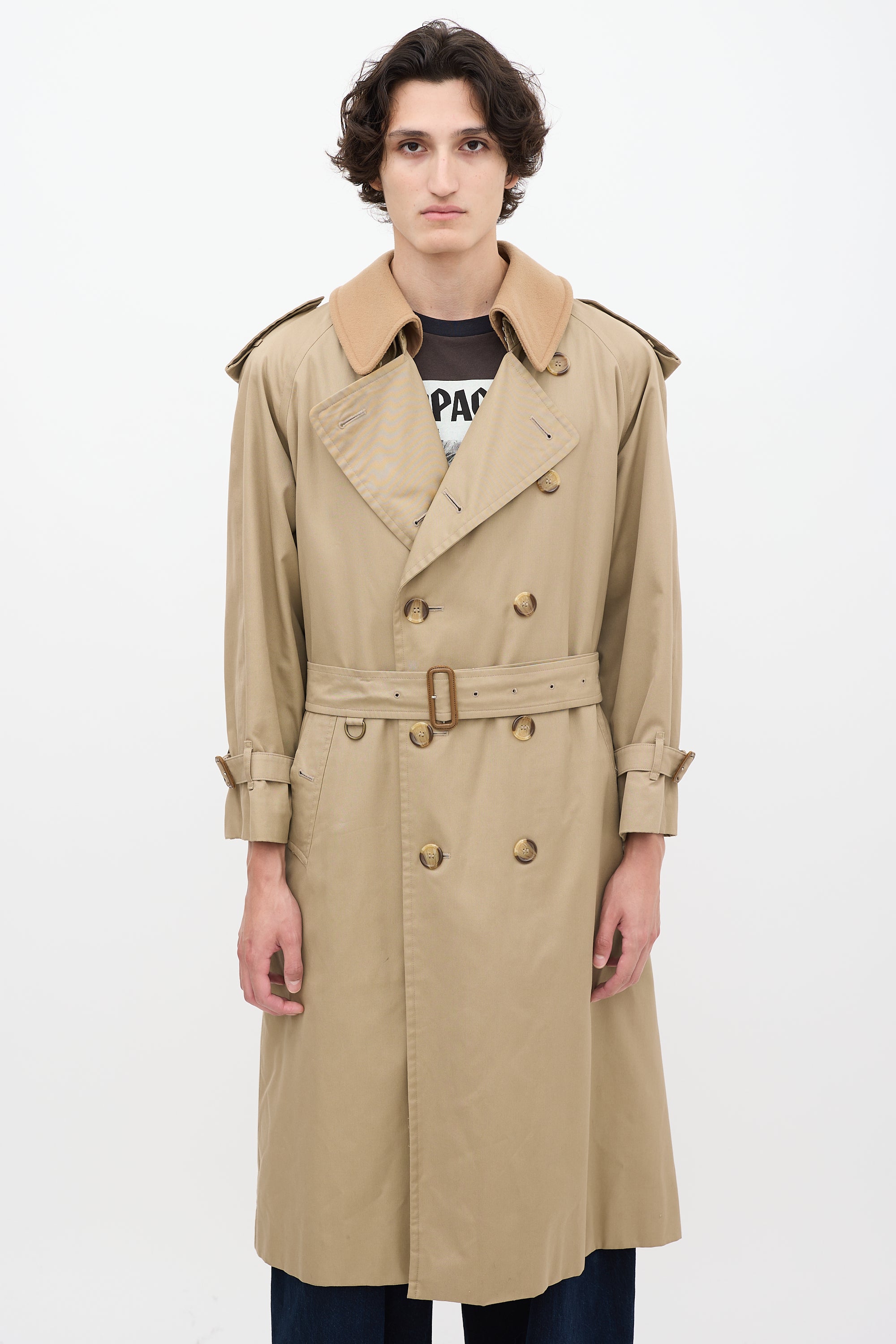 Pre-owned Burberry beige trench coat featuring a collared neck with detachable layer, double breasted button up front, back storm shield, buttoned kick pleat at back, belted waist, two buttoned slip pockets at front hip, epaulettes at shoulders, long sleeves with adjustable straps at cuffs, and detachable wool blend lining. Lined.