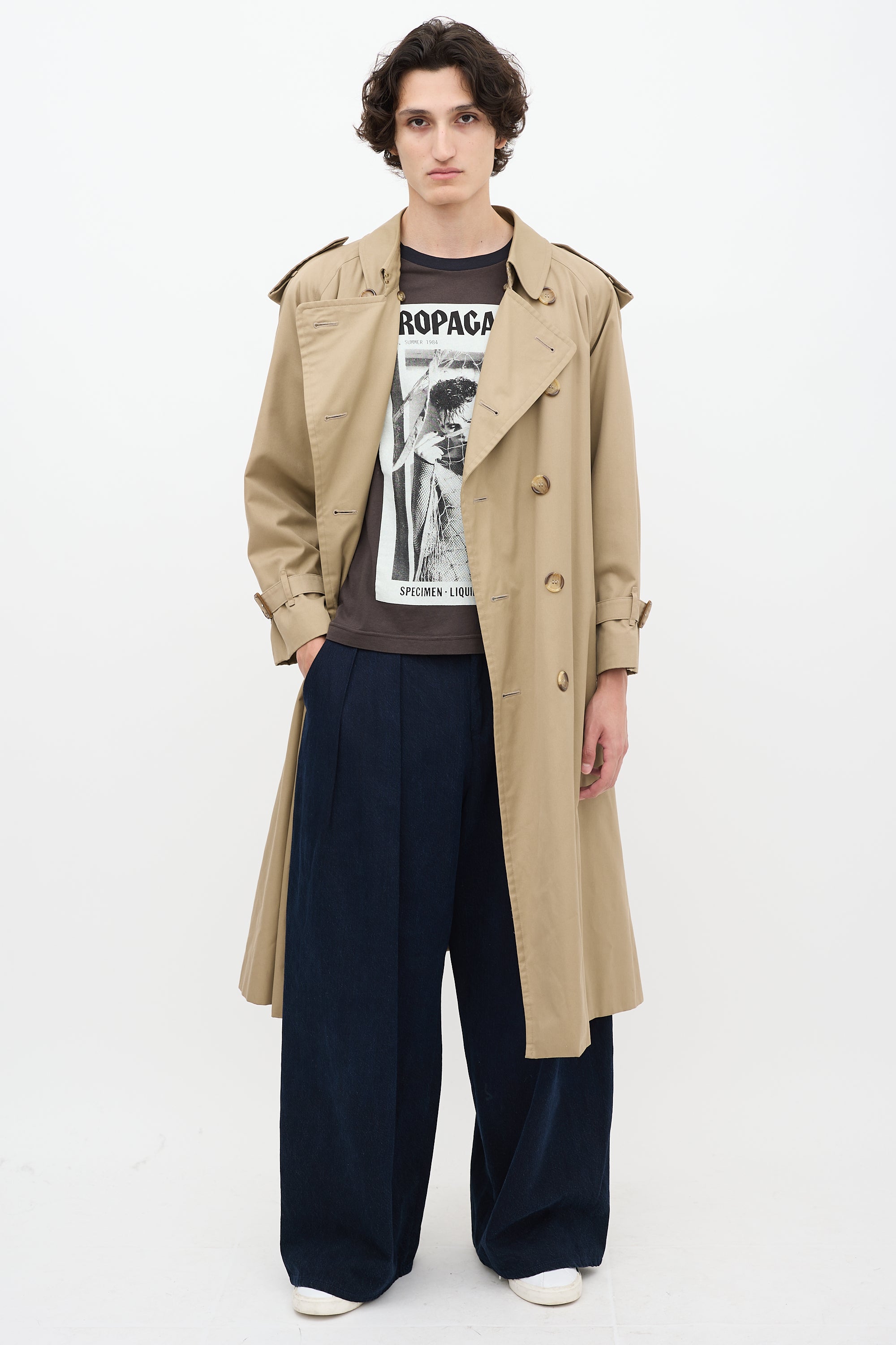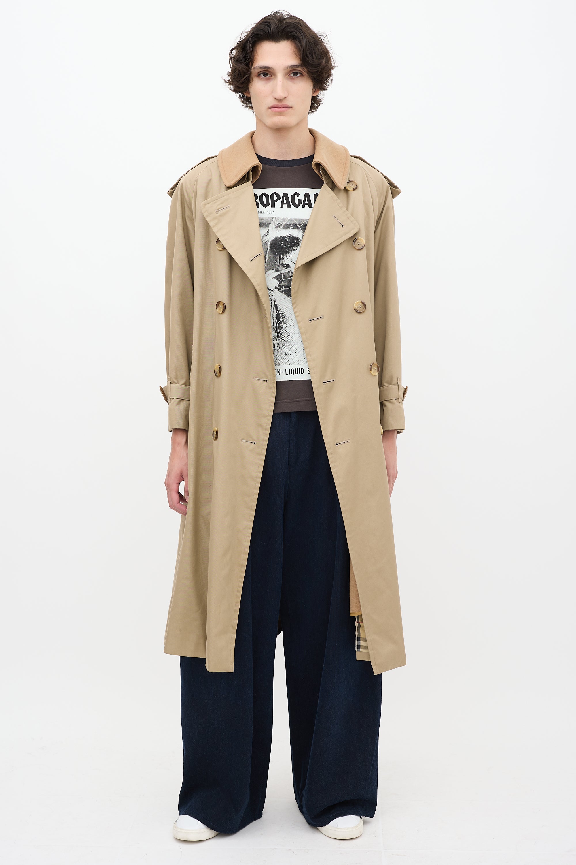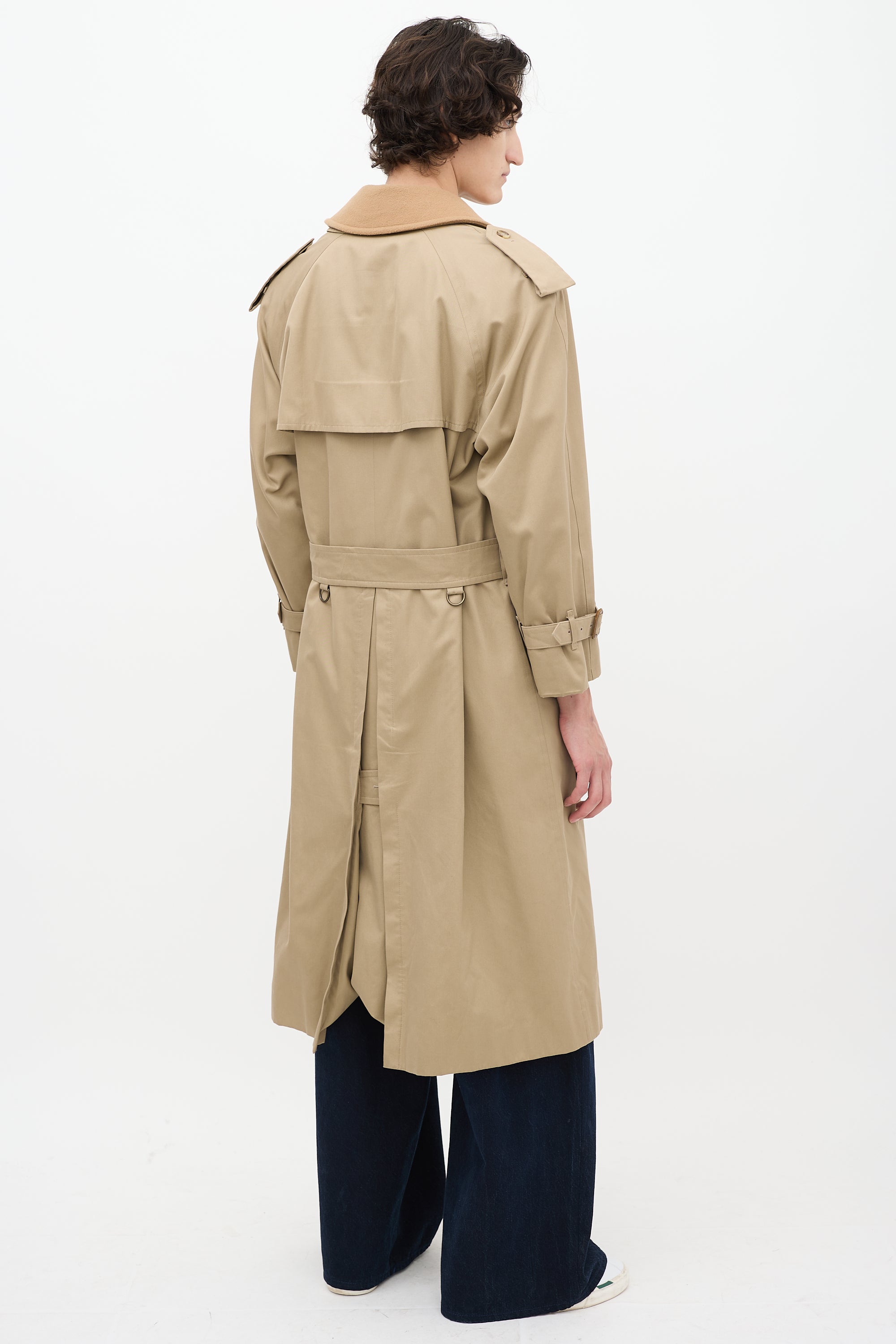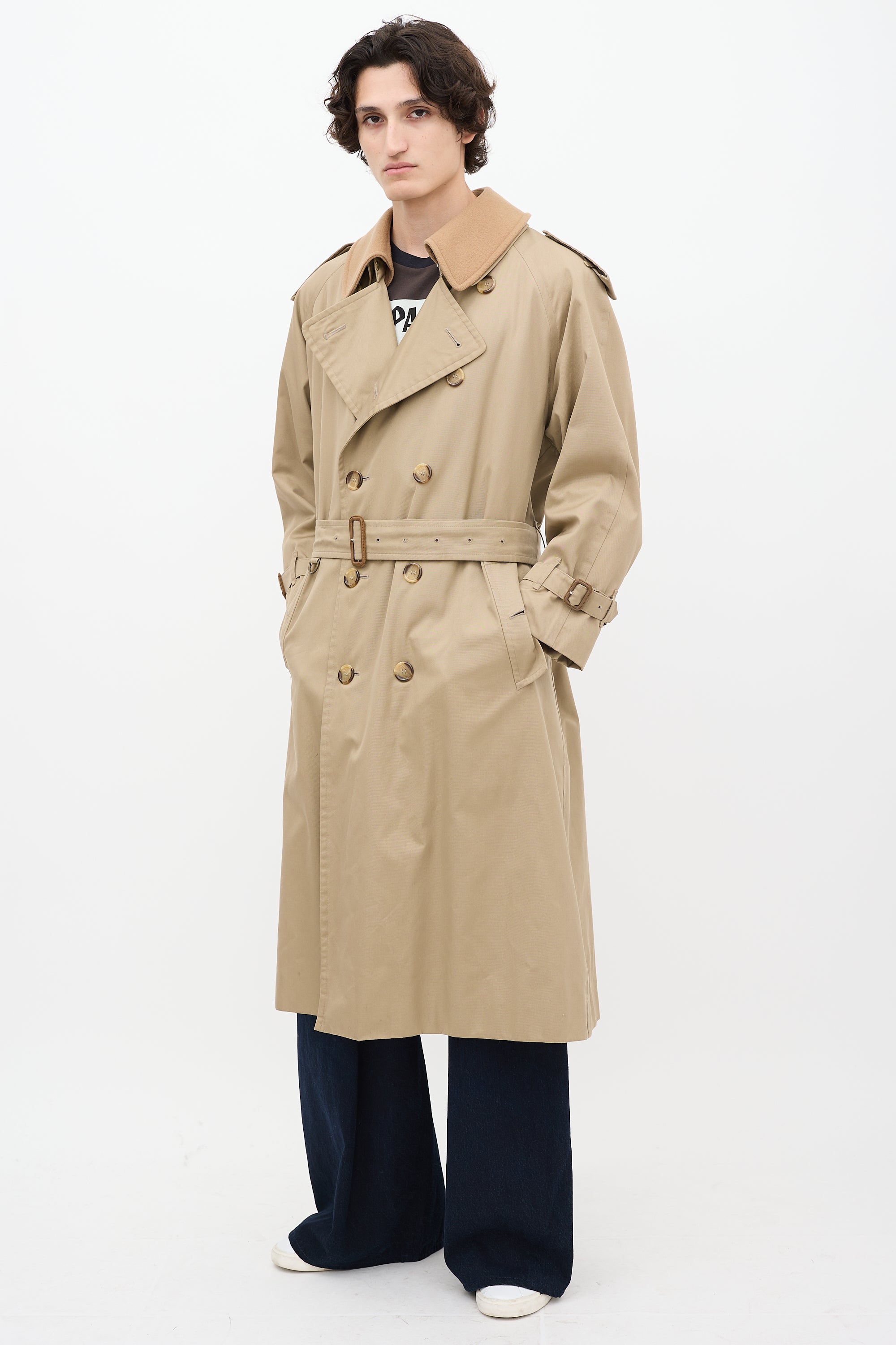 Pre-owned Burberry beige trench coat featuring a collared neck with detachable layer, double breasted button up front, back storm shield, buttoned kick pleat at back, belted waist, two buttoned slip pockets at front hip, epaulettes at shoulders, long sleeves with adjustable straps at cuffs, and detachable wool blend lining. Lined.
