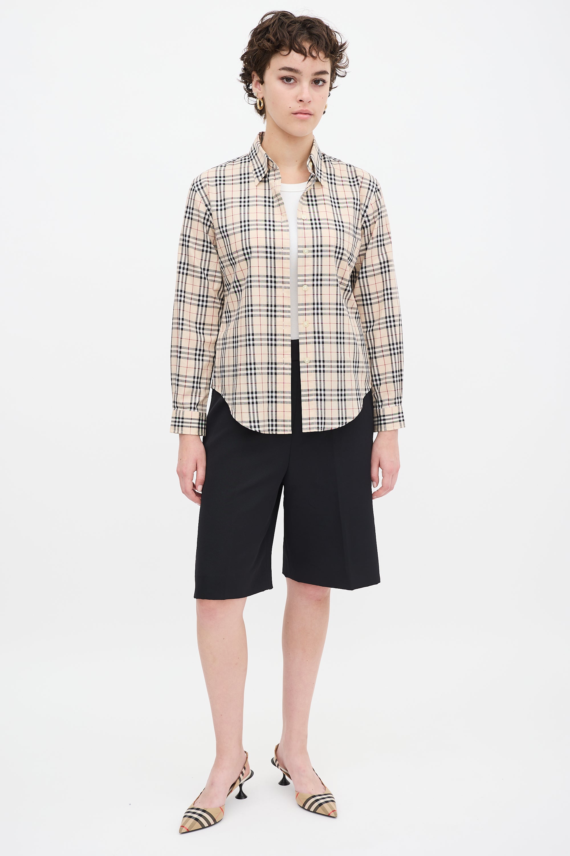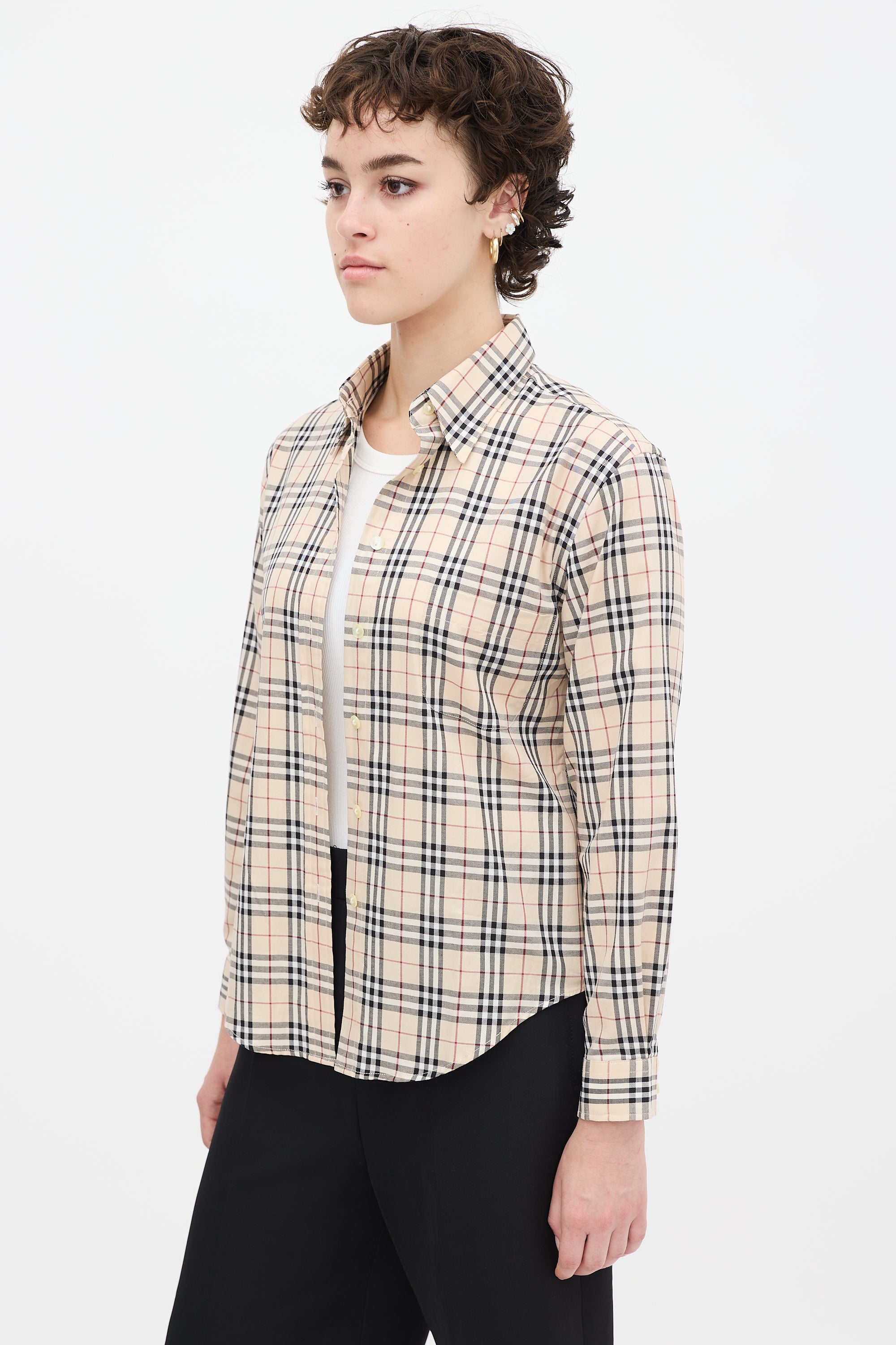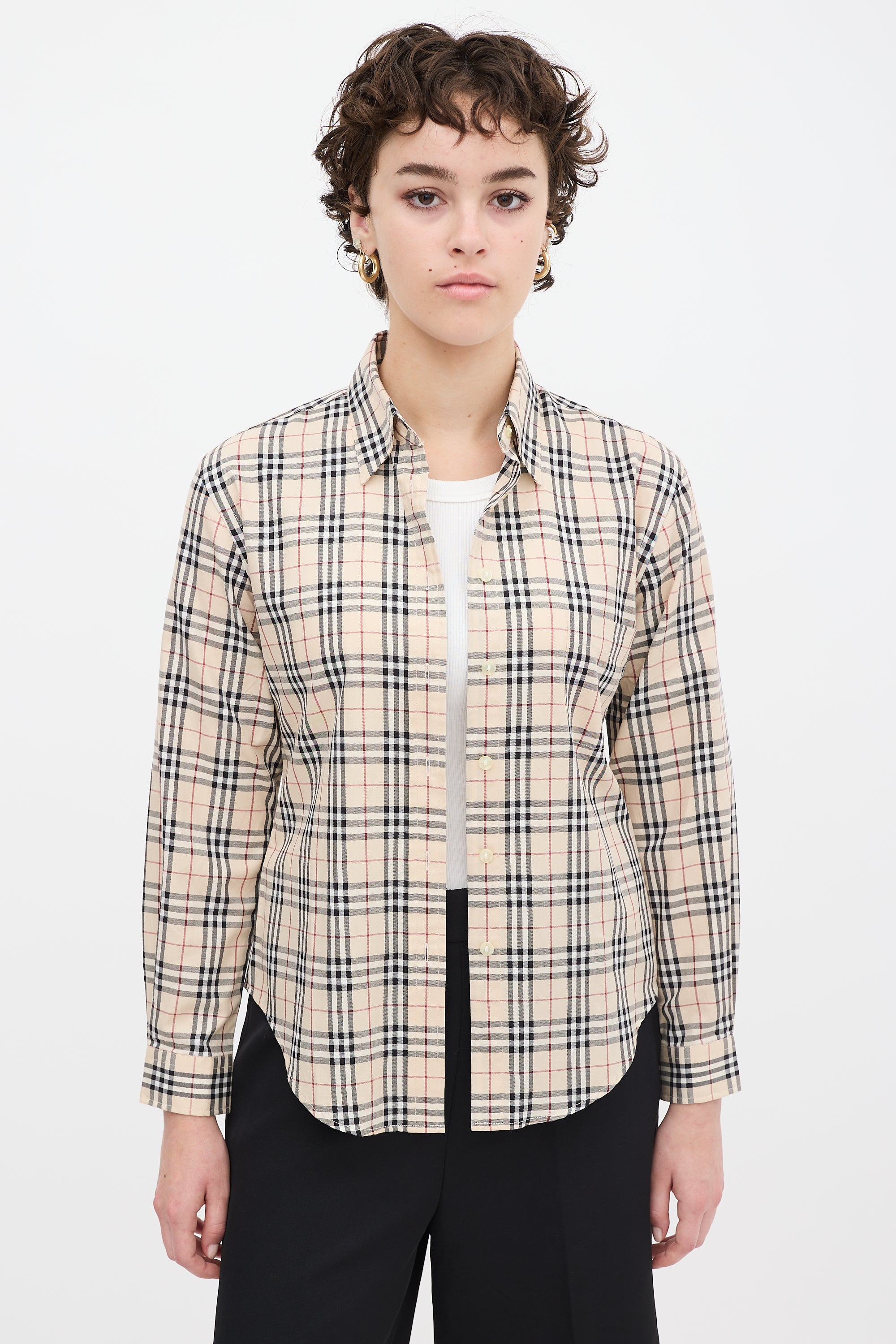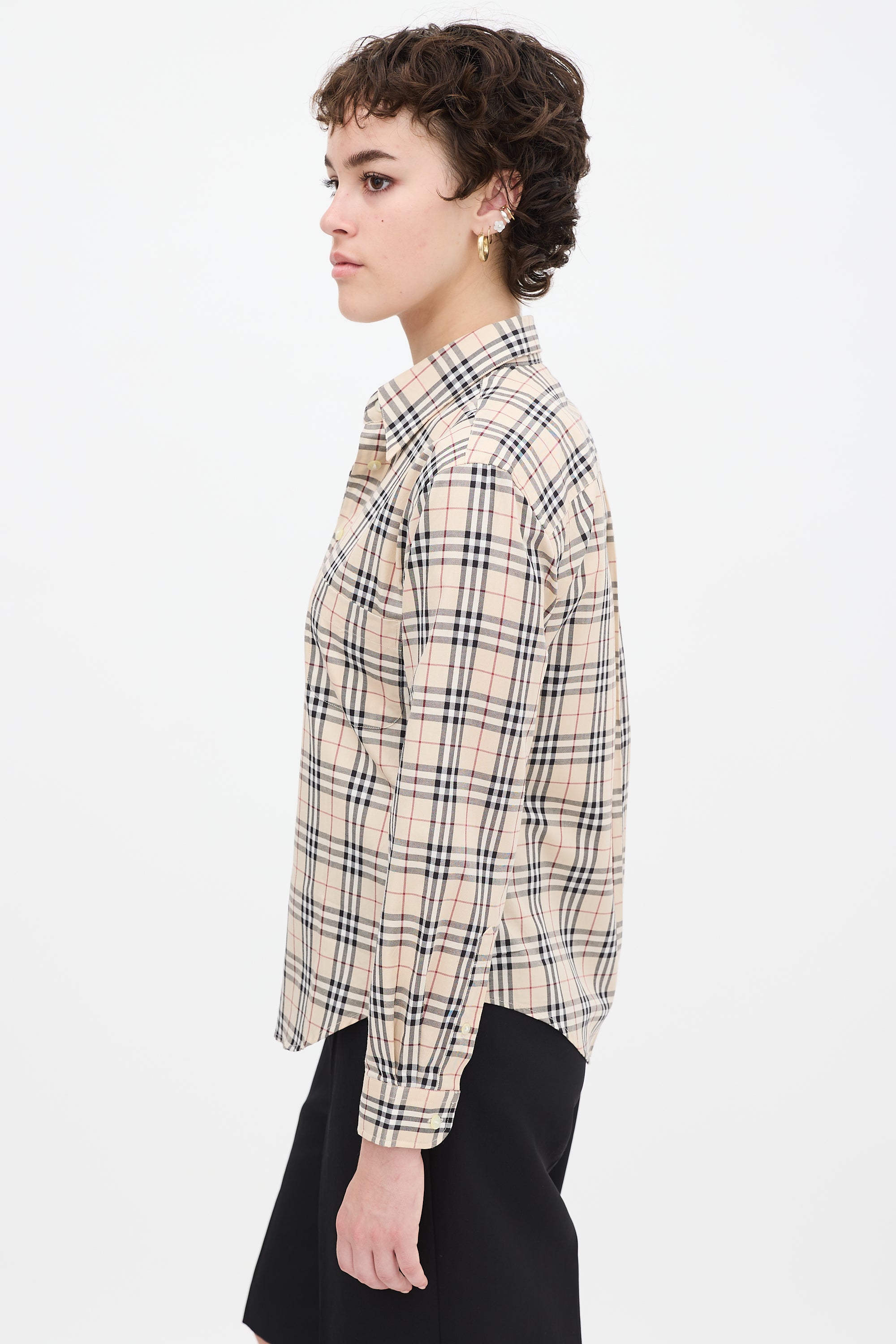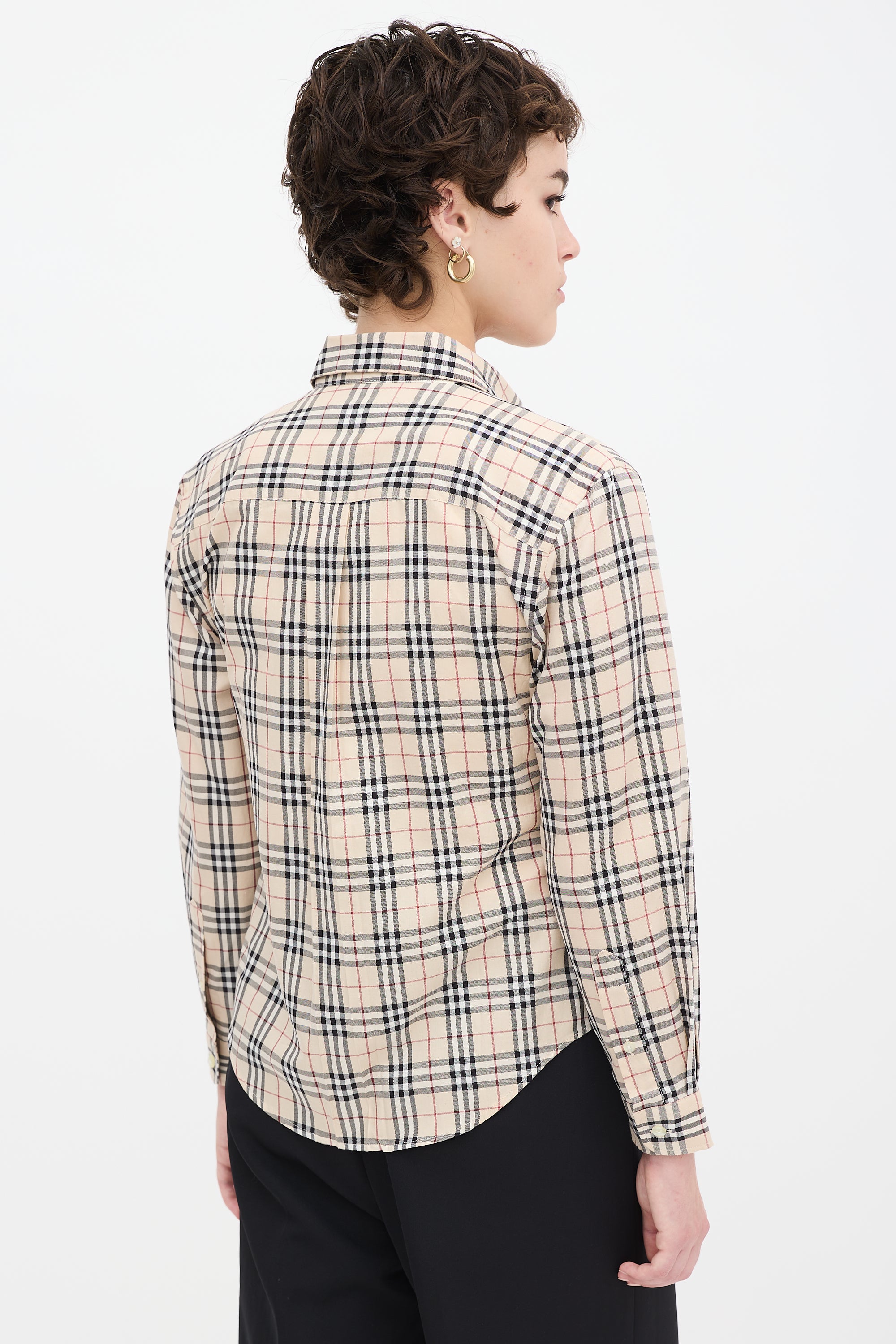 Pre-owned Burberry beige and multicolour shirt featuring a point collar, button up front, signature Nova check print throughout, single patch pocket at left chest, pleat at back yoke, curved hem, and long sleeves with buttoned cuffs.