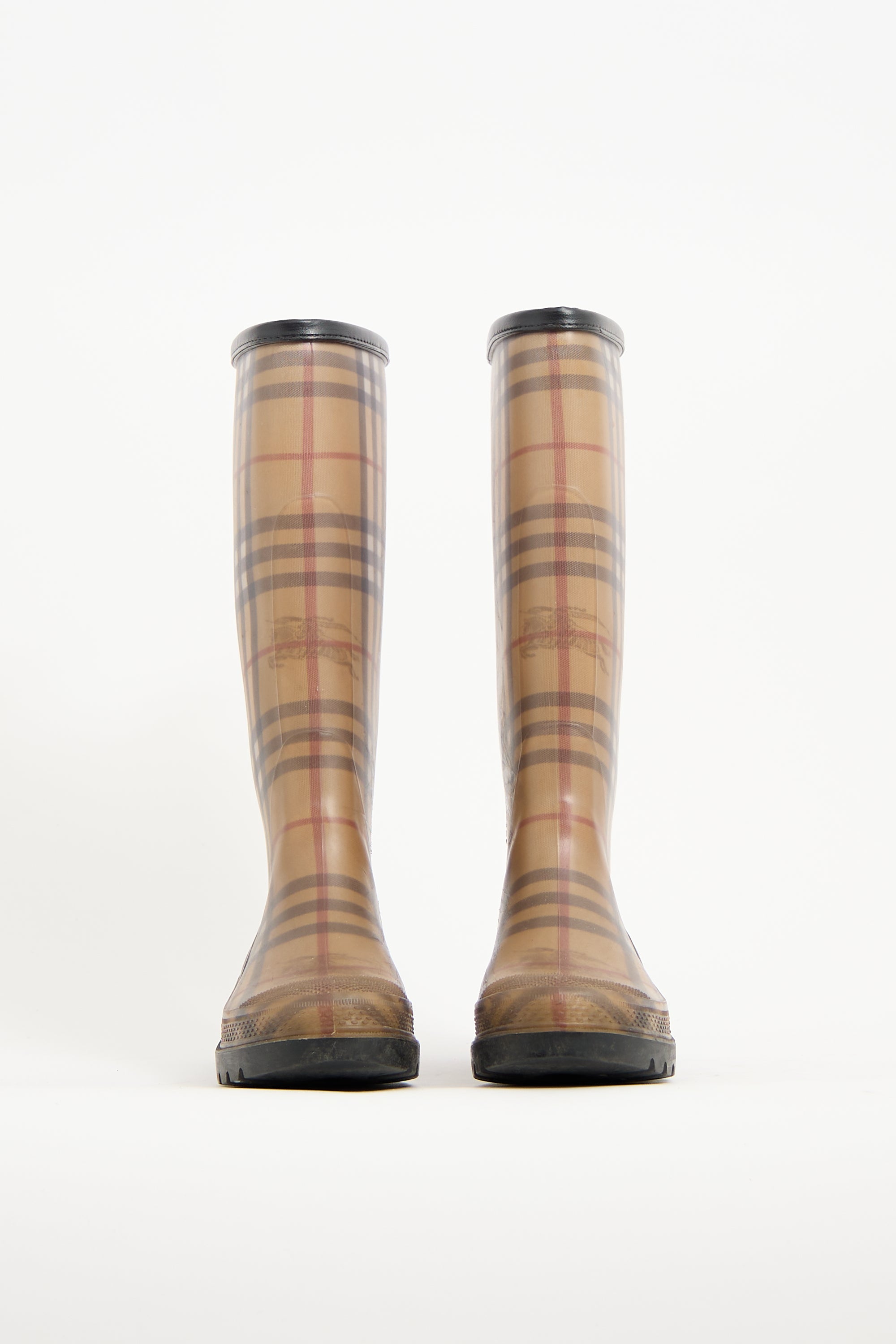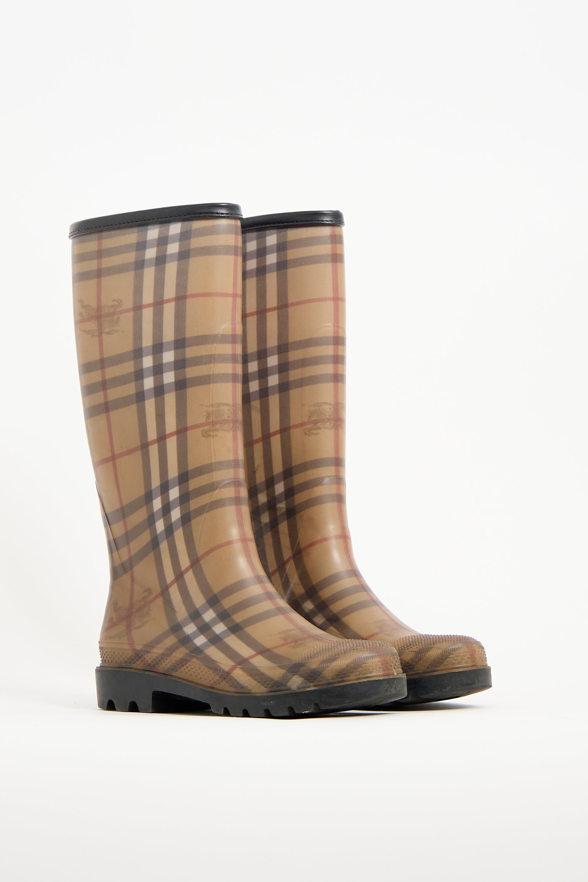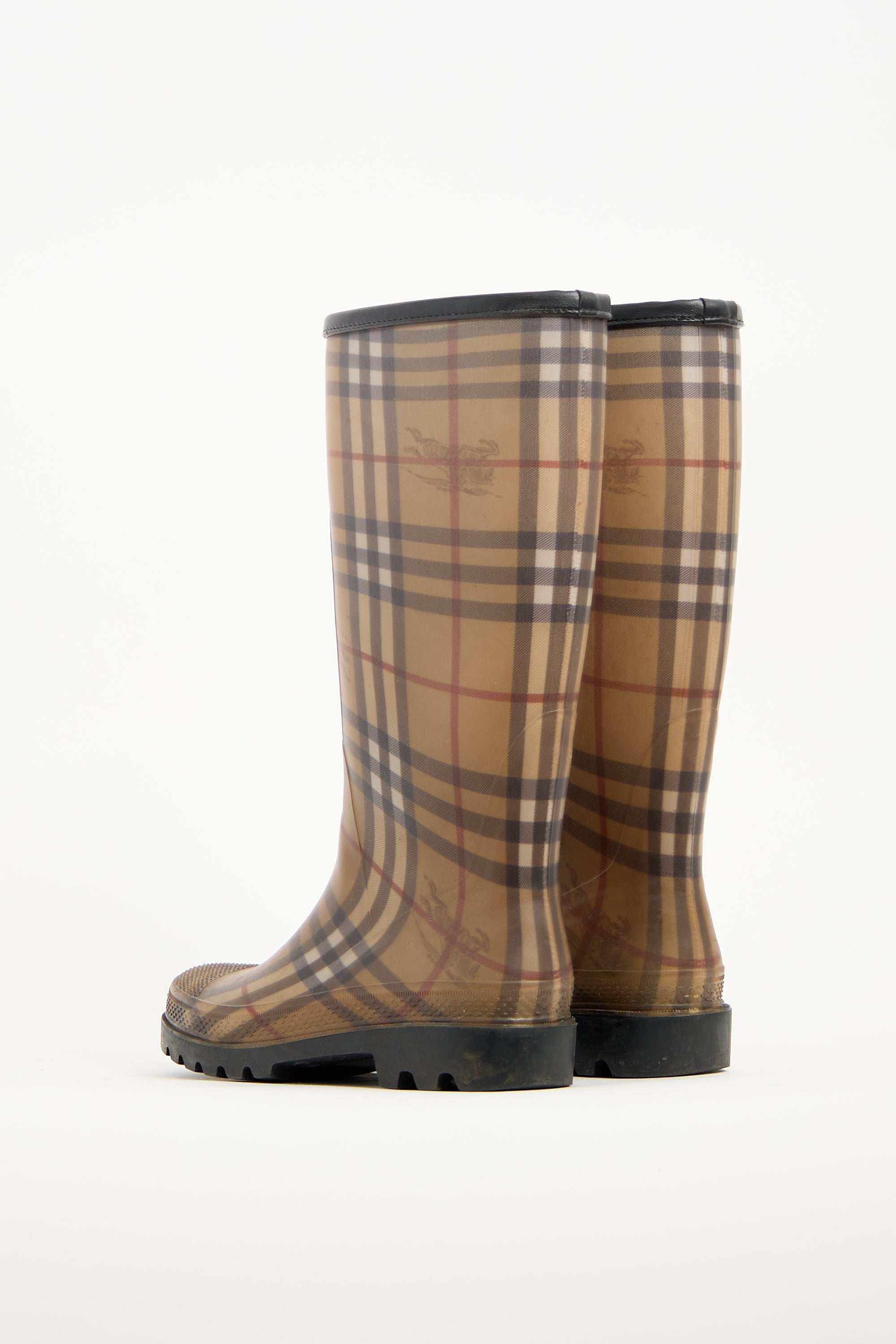 Pre-owned Burberry beige rubber Nova Check rain boots featuring rounded toe, treaded sole, and pull on entry.
