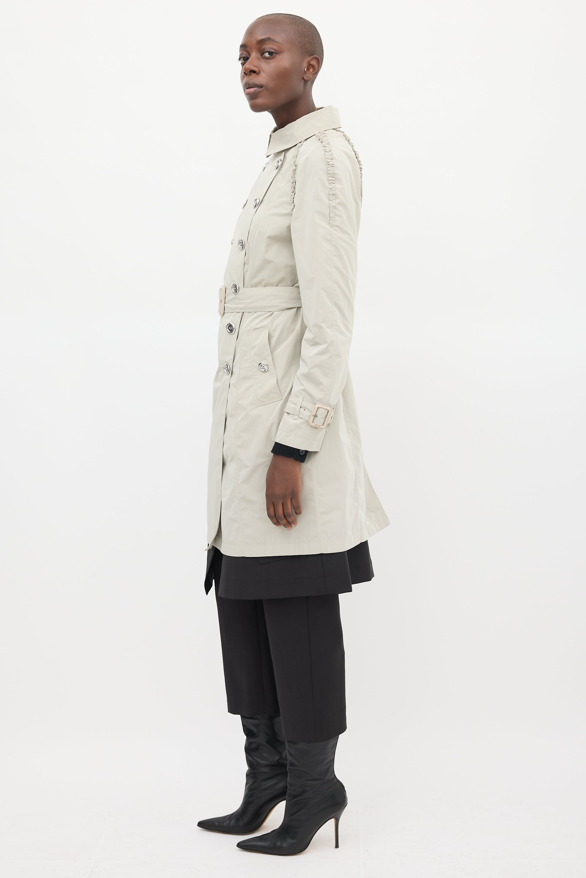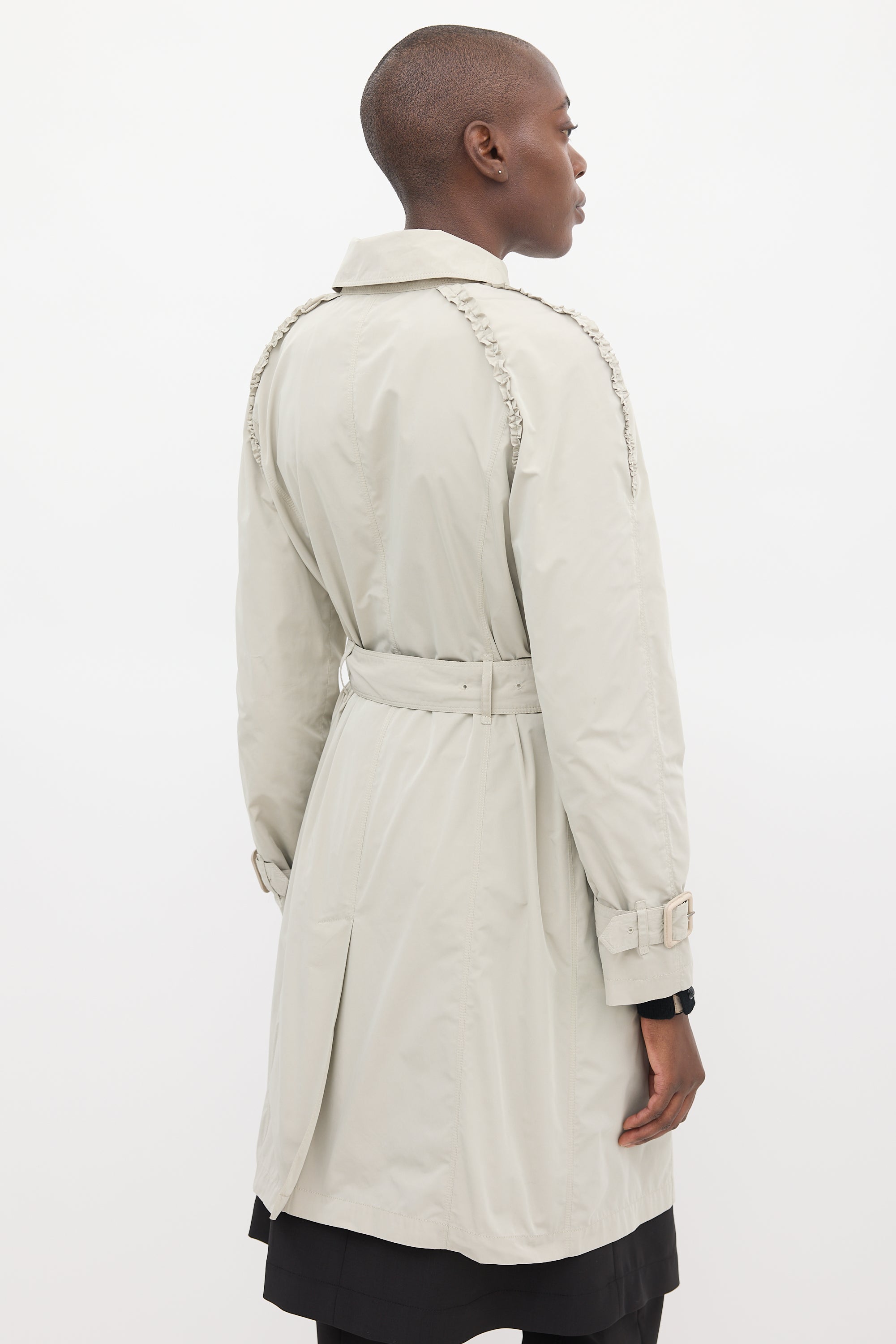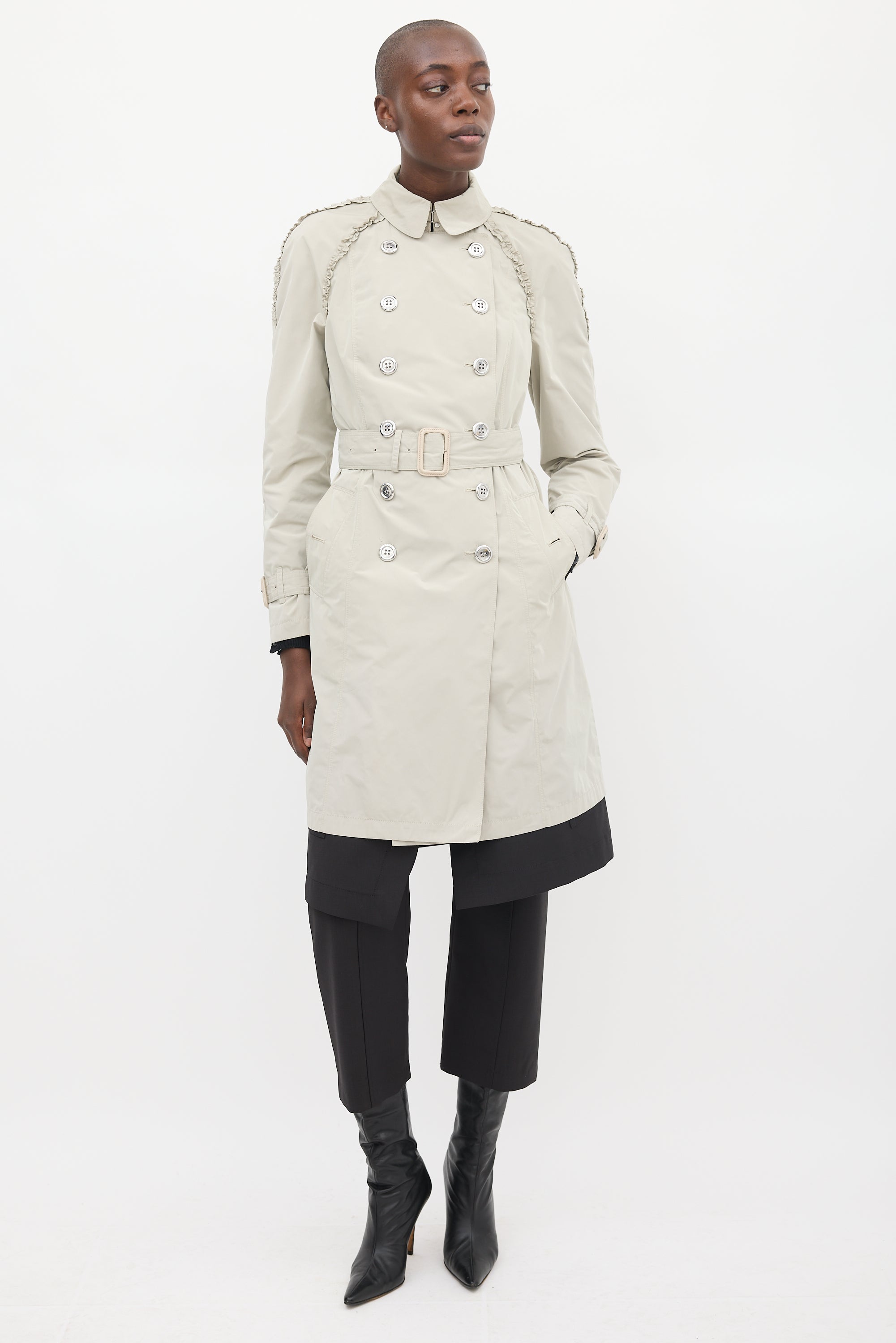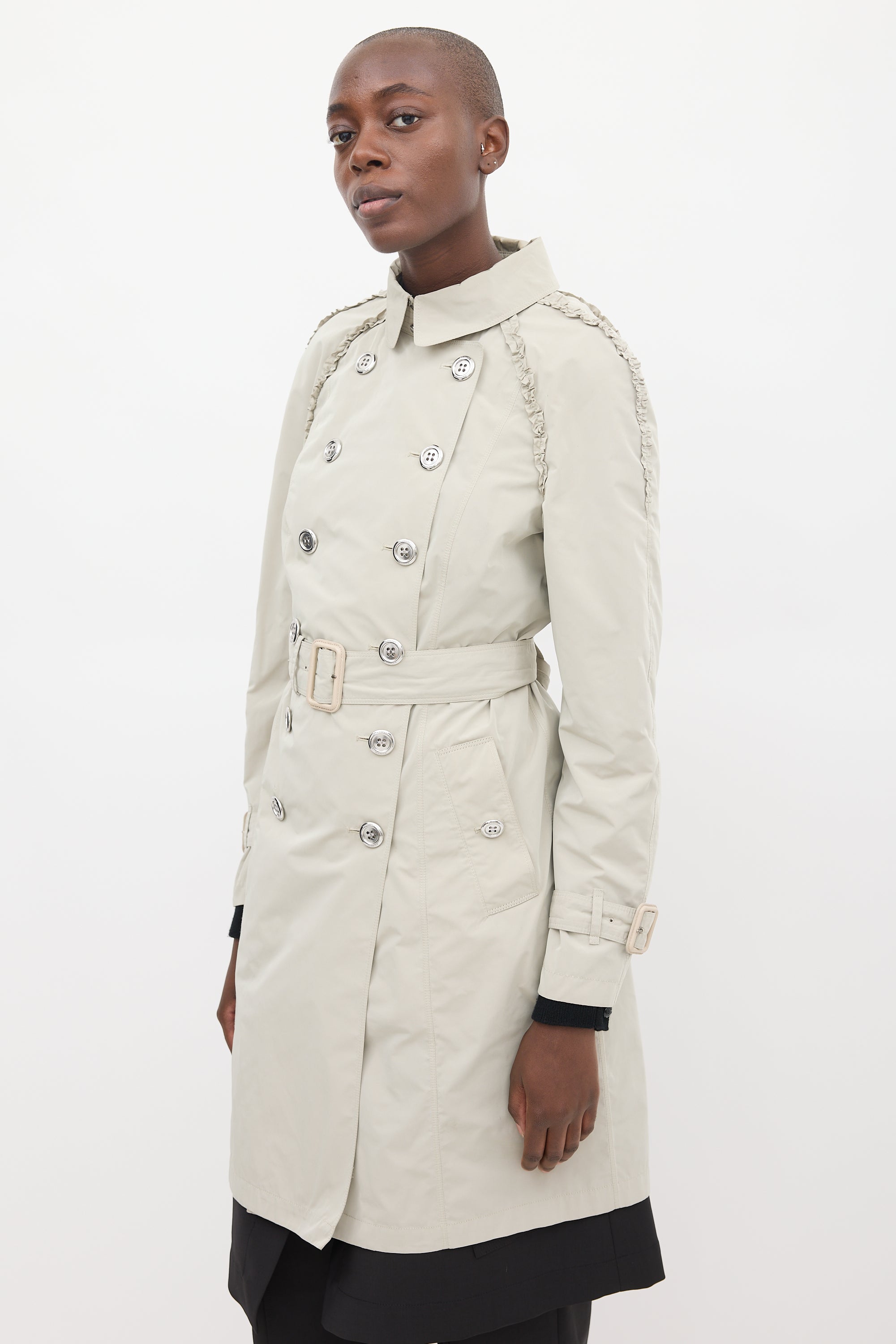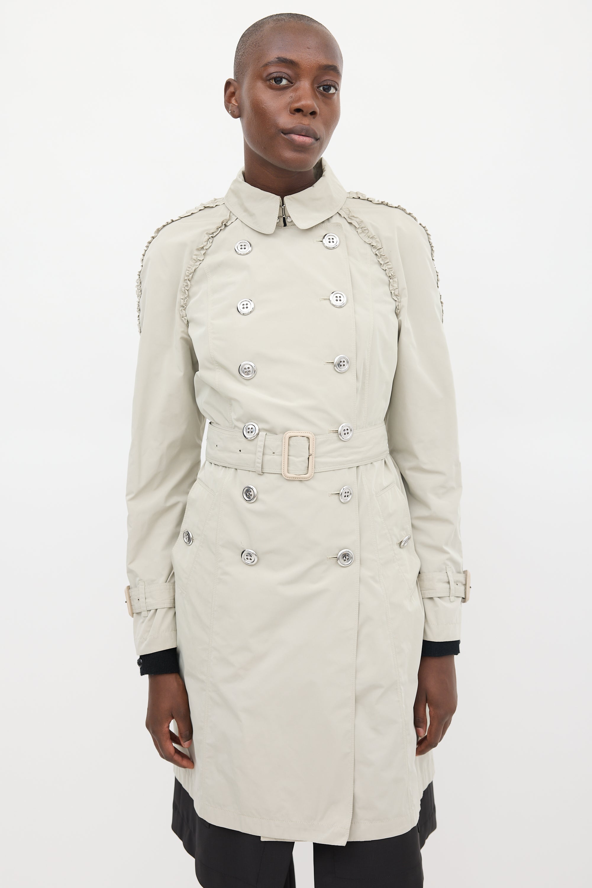 Pre-owned Burberry beige coat featuring a collared neck, double breasted silver tone button up front, two buttoned slip pockets at front hip, upper ruffle trim detail, back vent, belted waist, and long sleeves with buckled straps at cuffs. Partially lined.