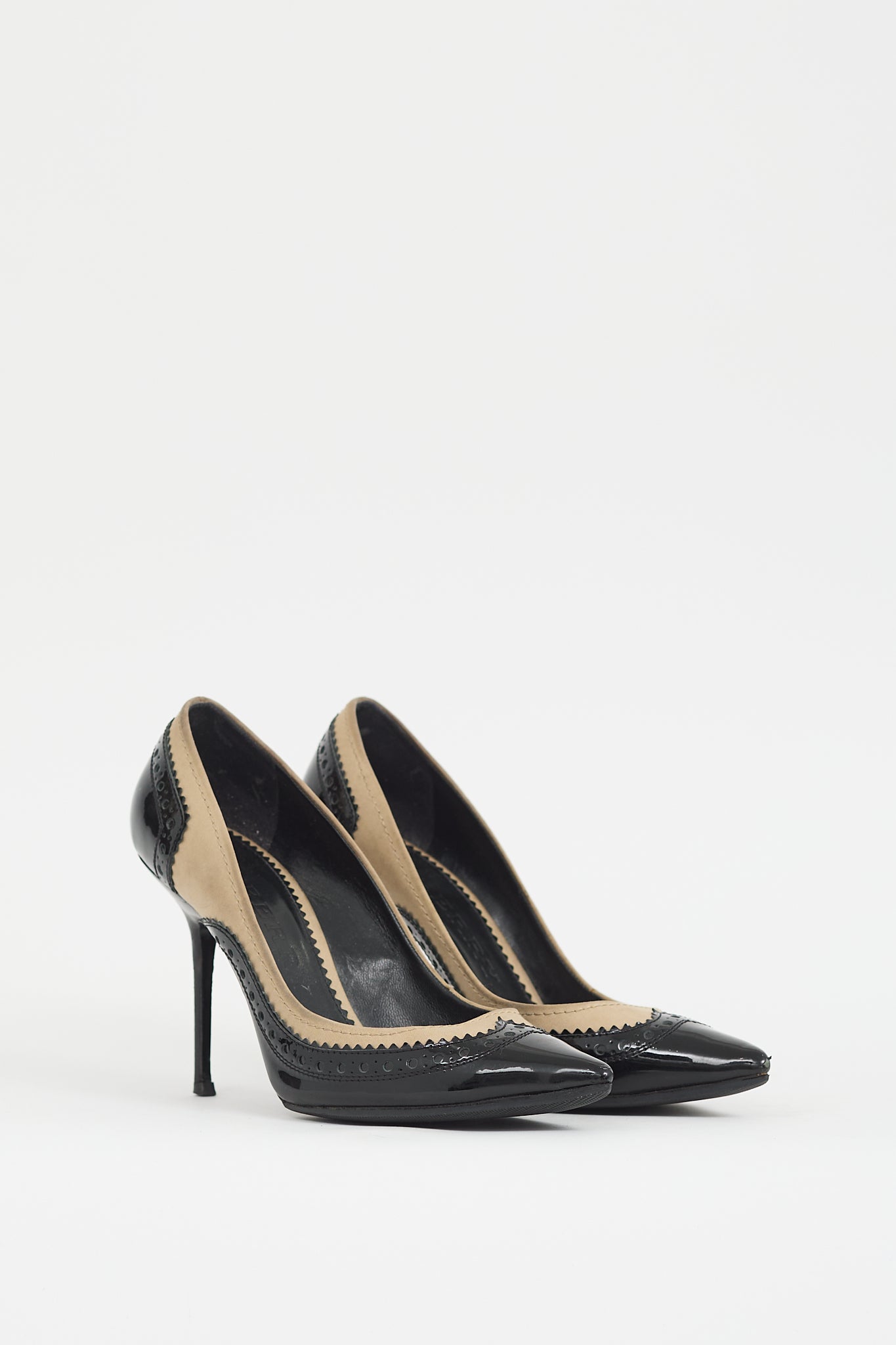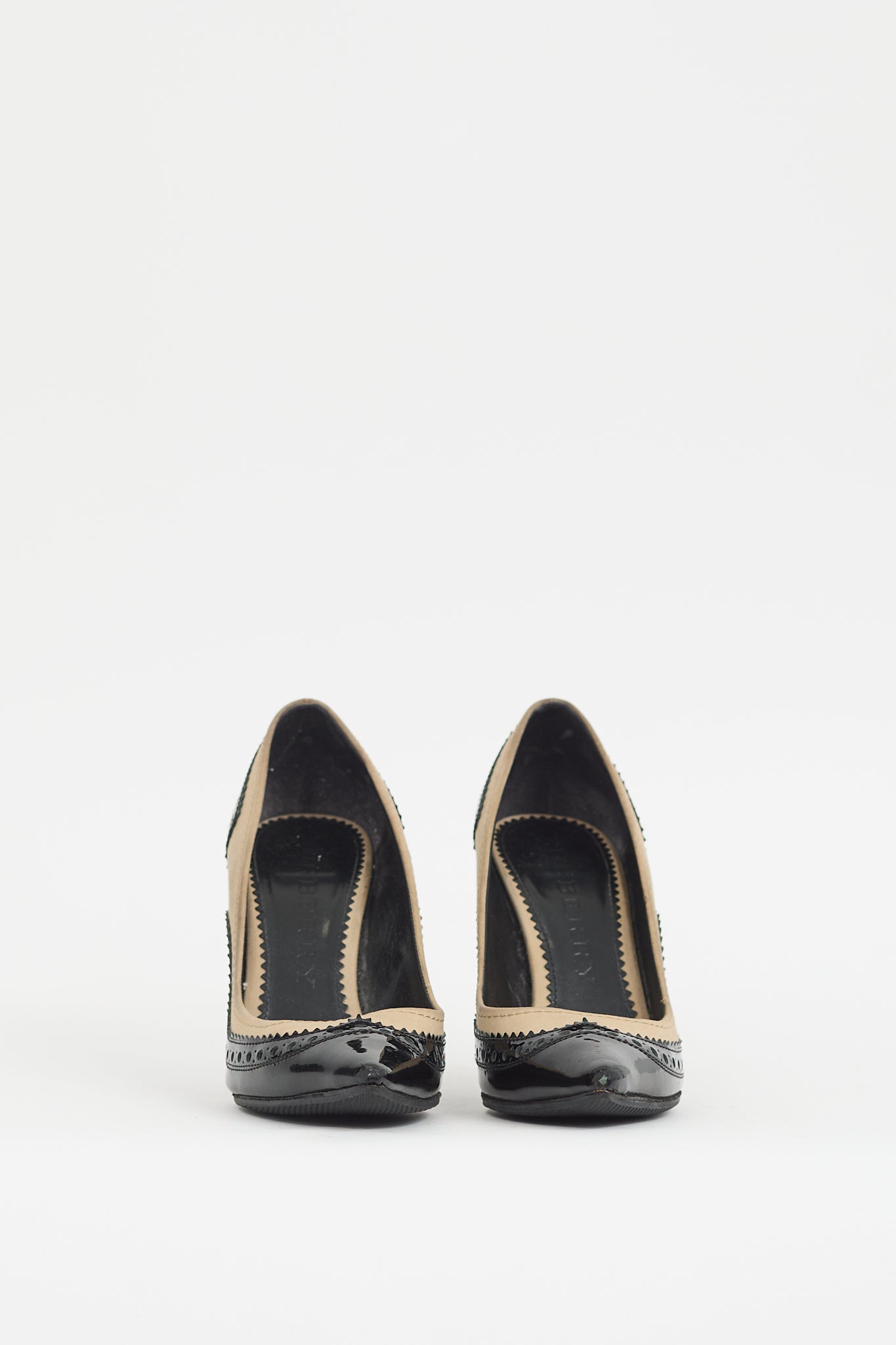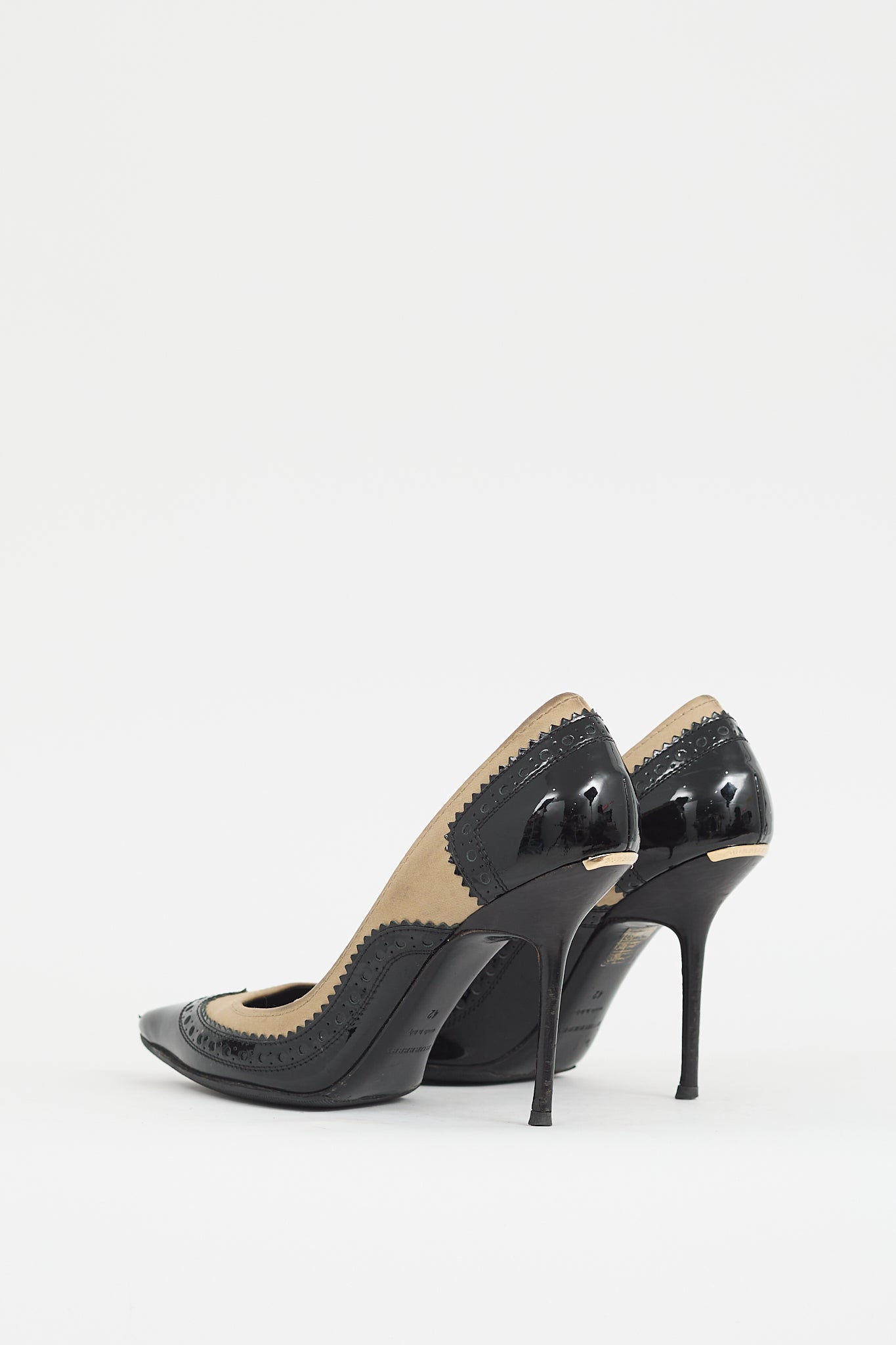 Pre-owned Burberry black and beige pumps featuring pointed toe, black patent leather upper with brogue detailing, beige canvas collar, gold tone logo bar with engraved logo at heel, and stiletto heel. Comes with original dust bag.