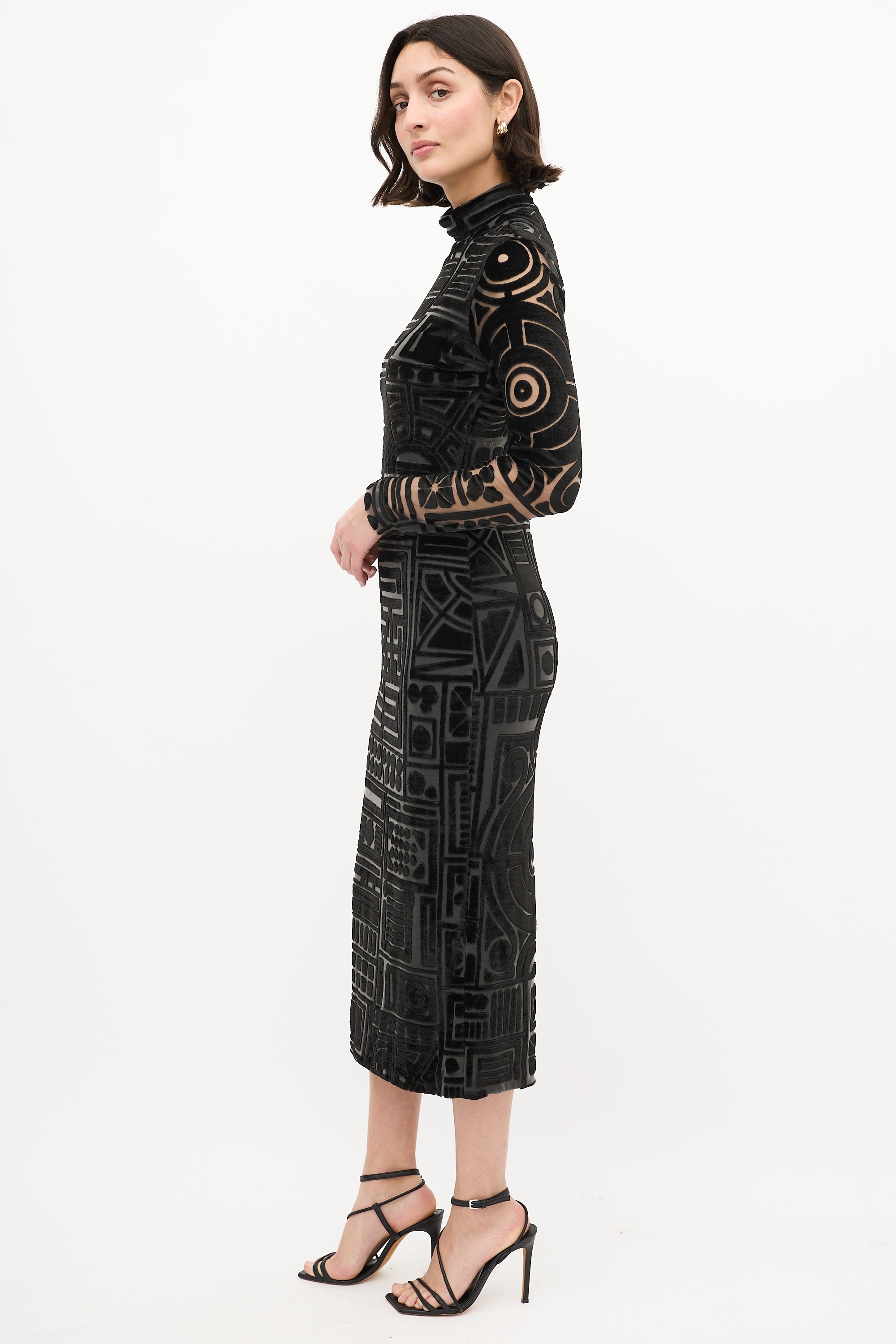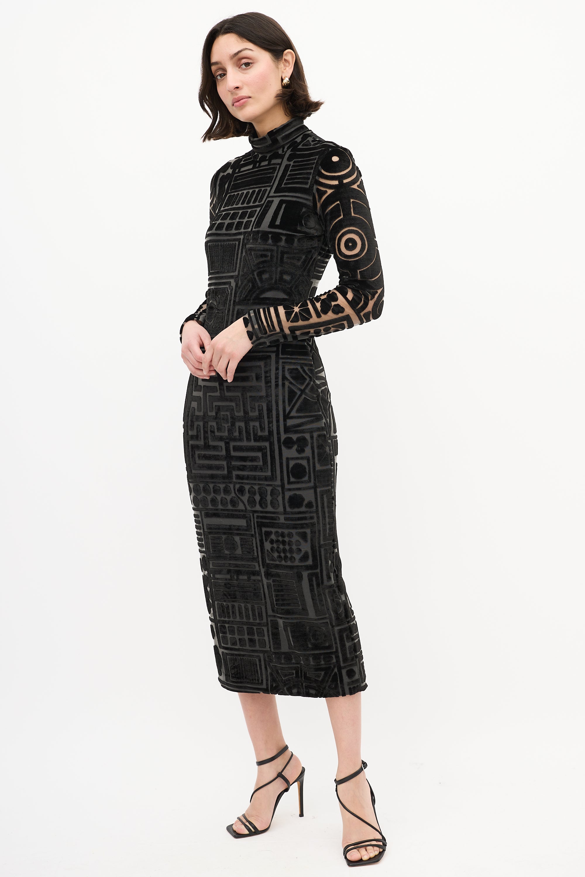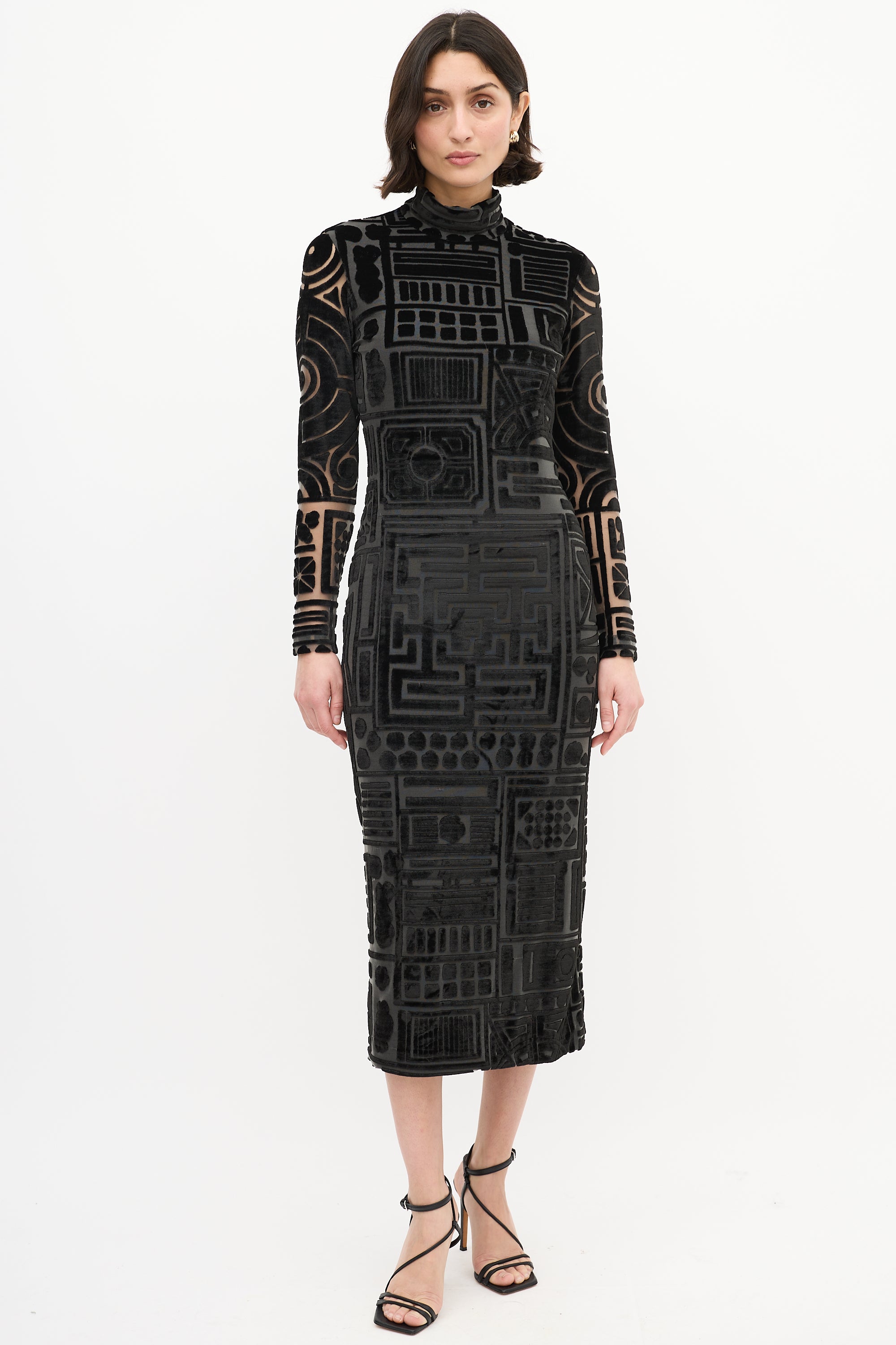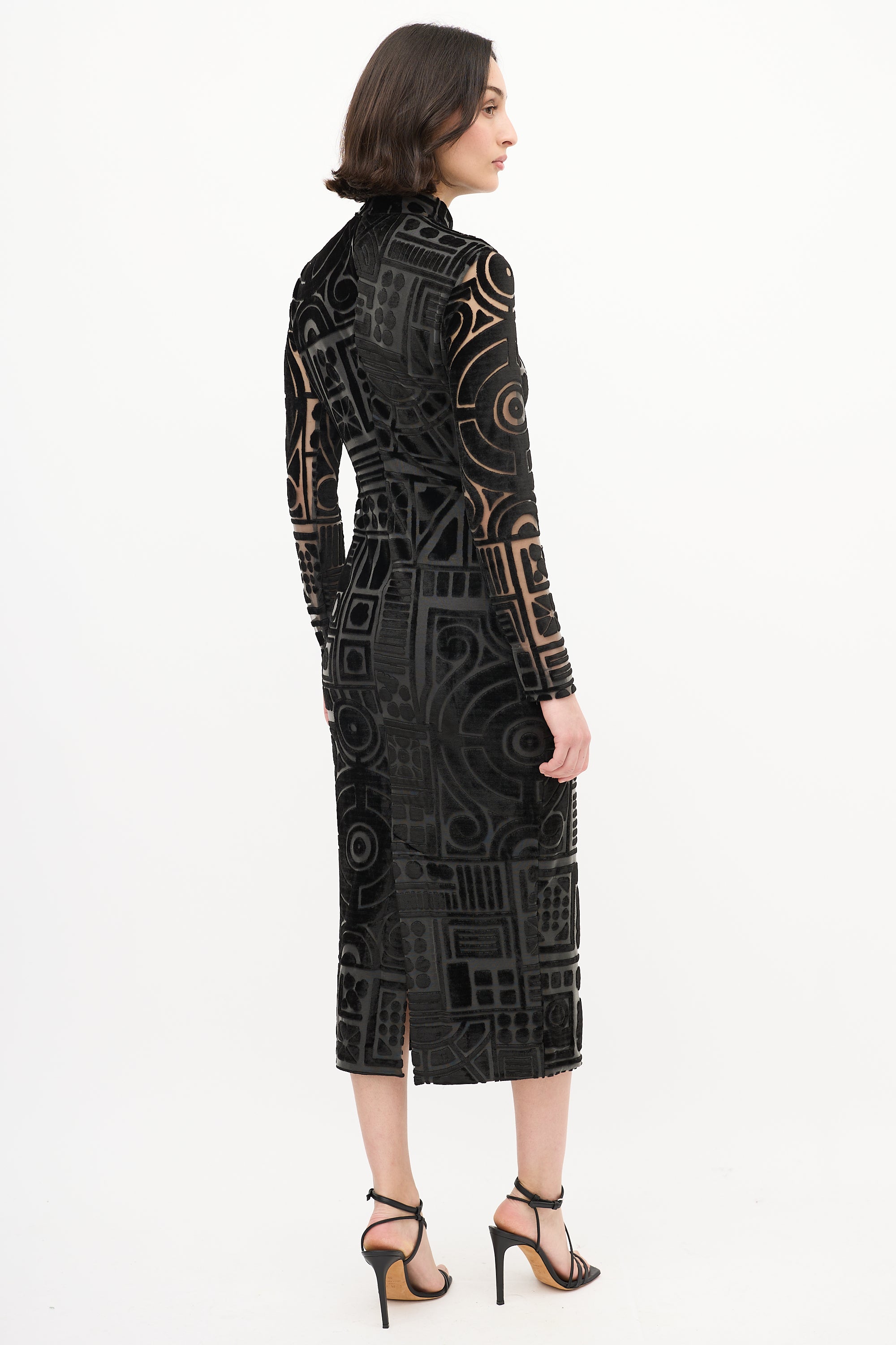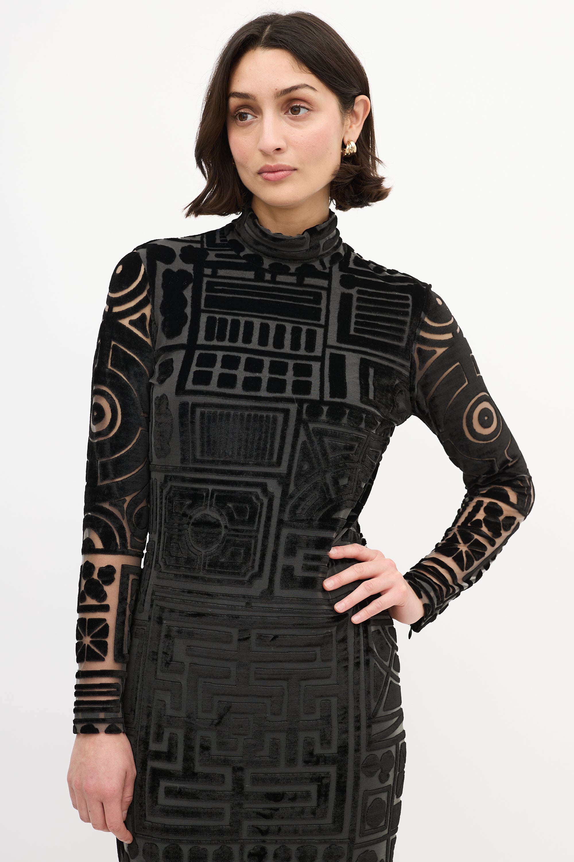 Pre-owned Burberry black burnout velvet Devore dress featuring geometric pattern, mock neckline, sheer long sleeves with zippered cuffs, back zip closure, and back vent. Lined.