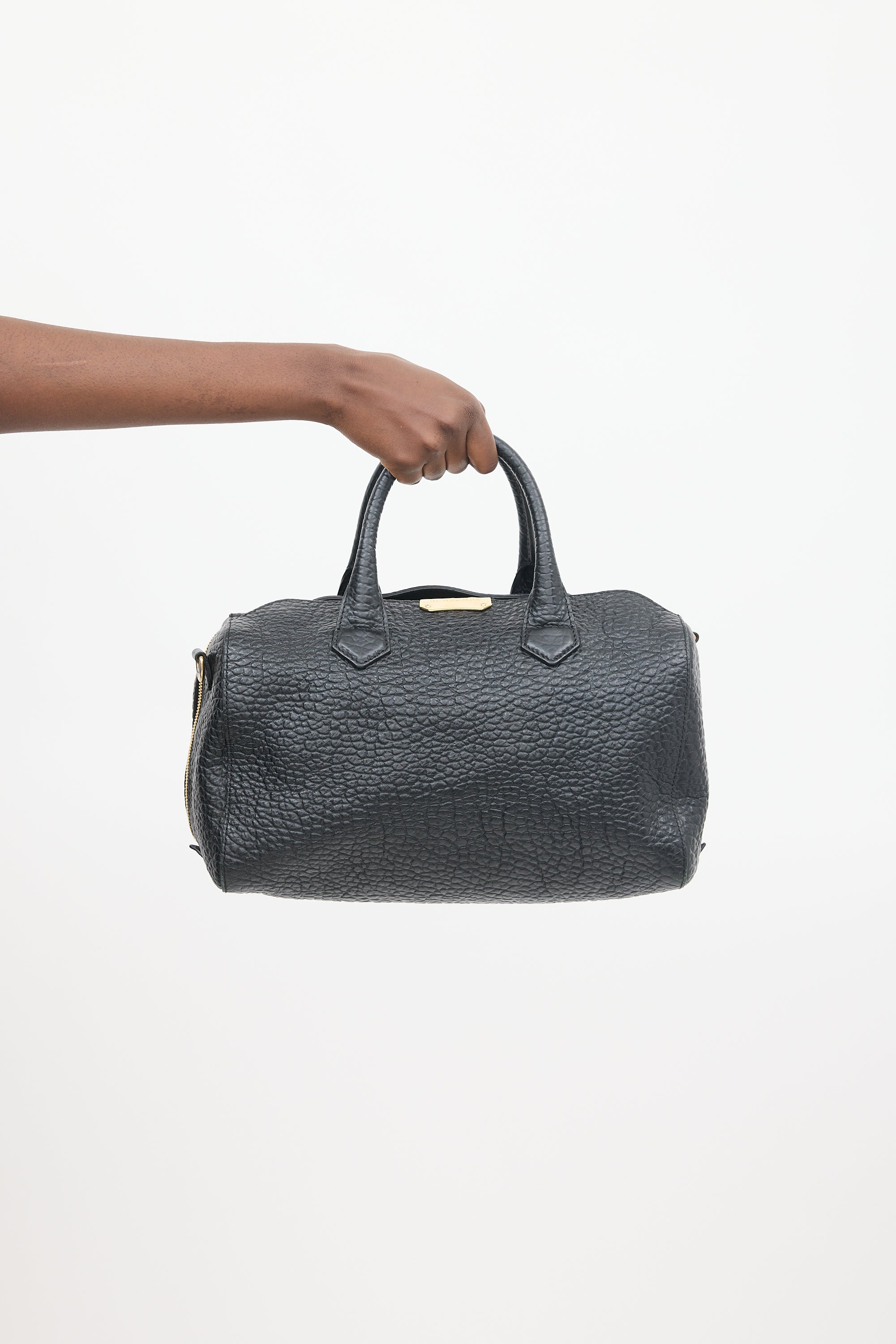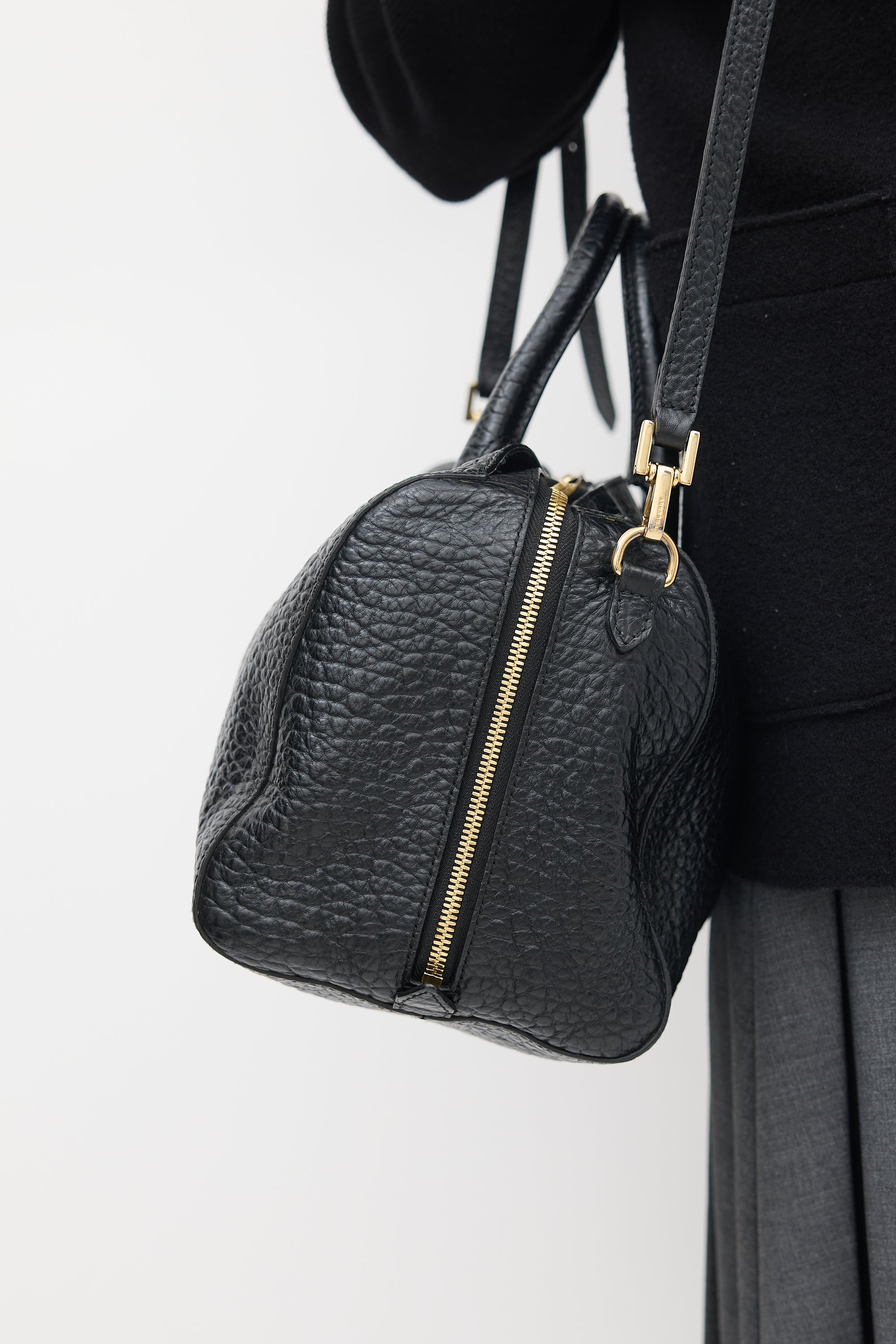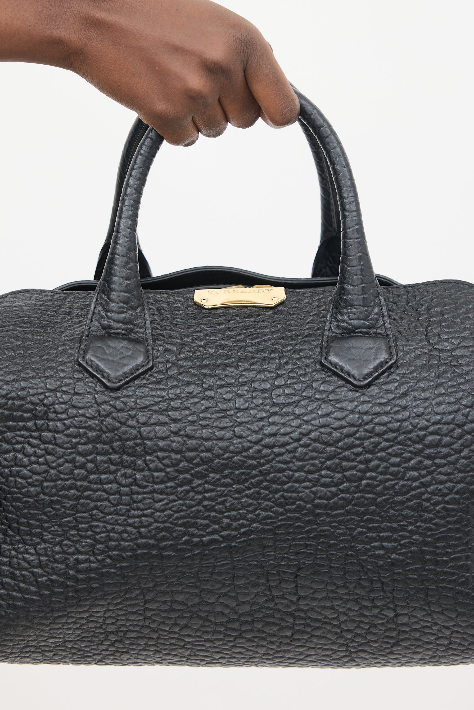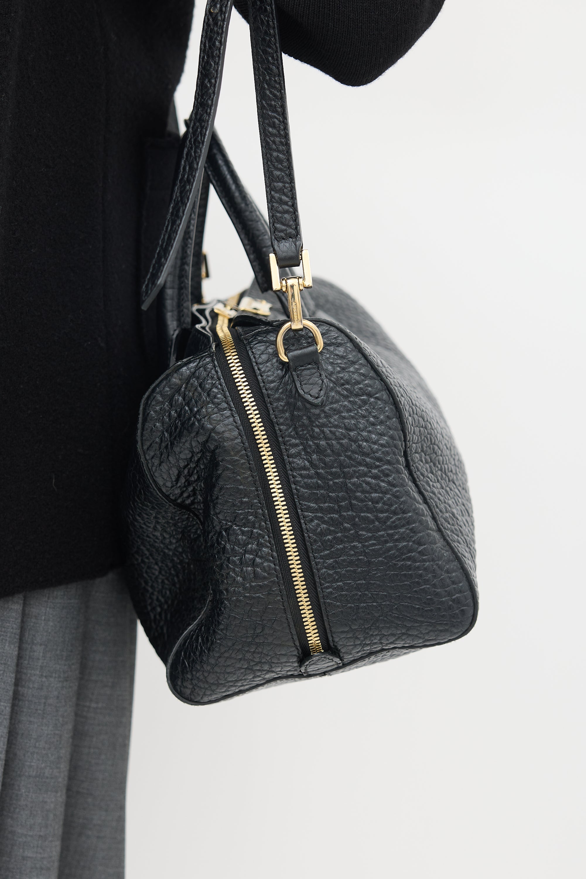 Pre-owned Burberry black grained leather Alchester bowling bag featuring tonal stitching, gold tone hardware, stamped logo hardware accent and exterior slip compartment at front, dual rolled top handles, detachable and adjustable shoulder strap, dual top zip closure, and one lined main compartment with one zip pocket and two slip pockets. Comes with original dust bag.